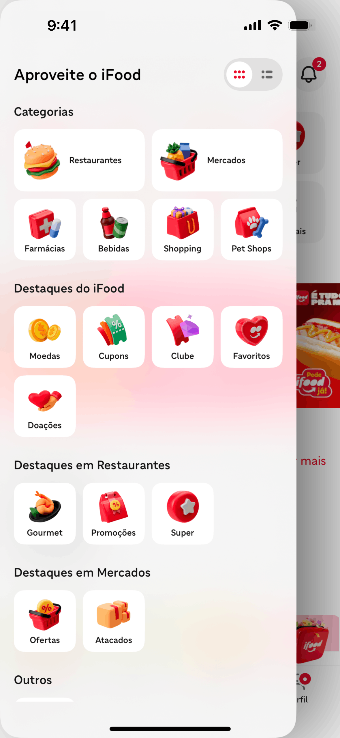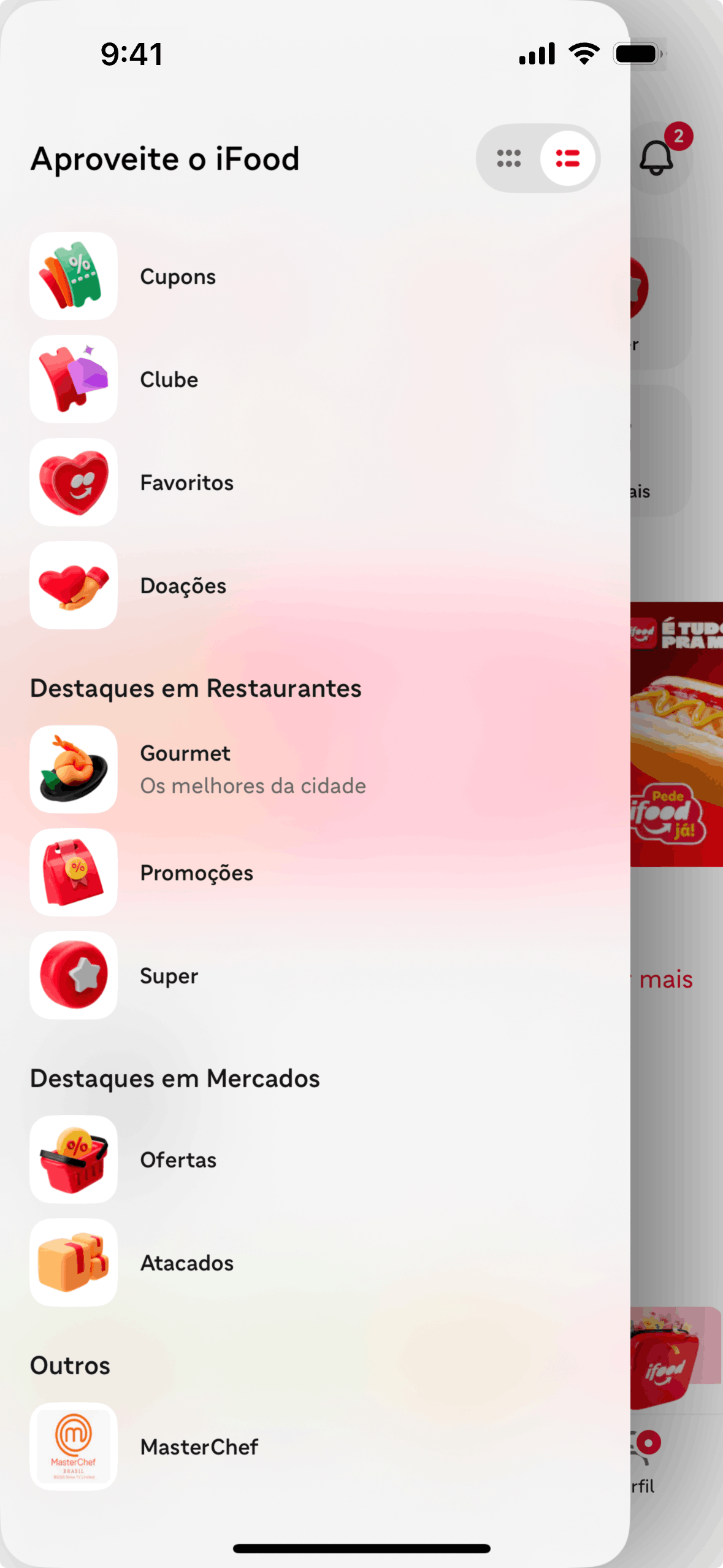 The user switches from the grid view to the list view by using the toggle button. This changes the way the categories are displayed.