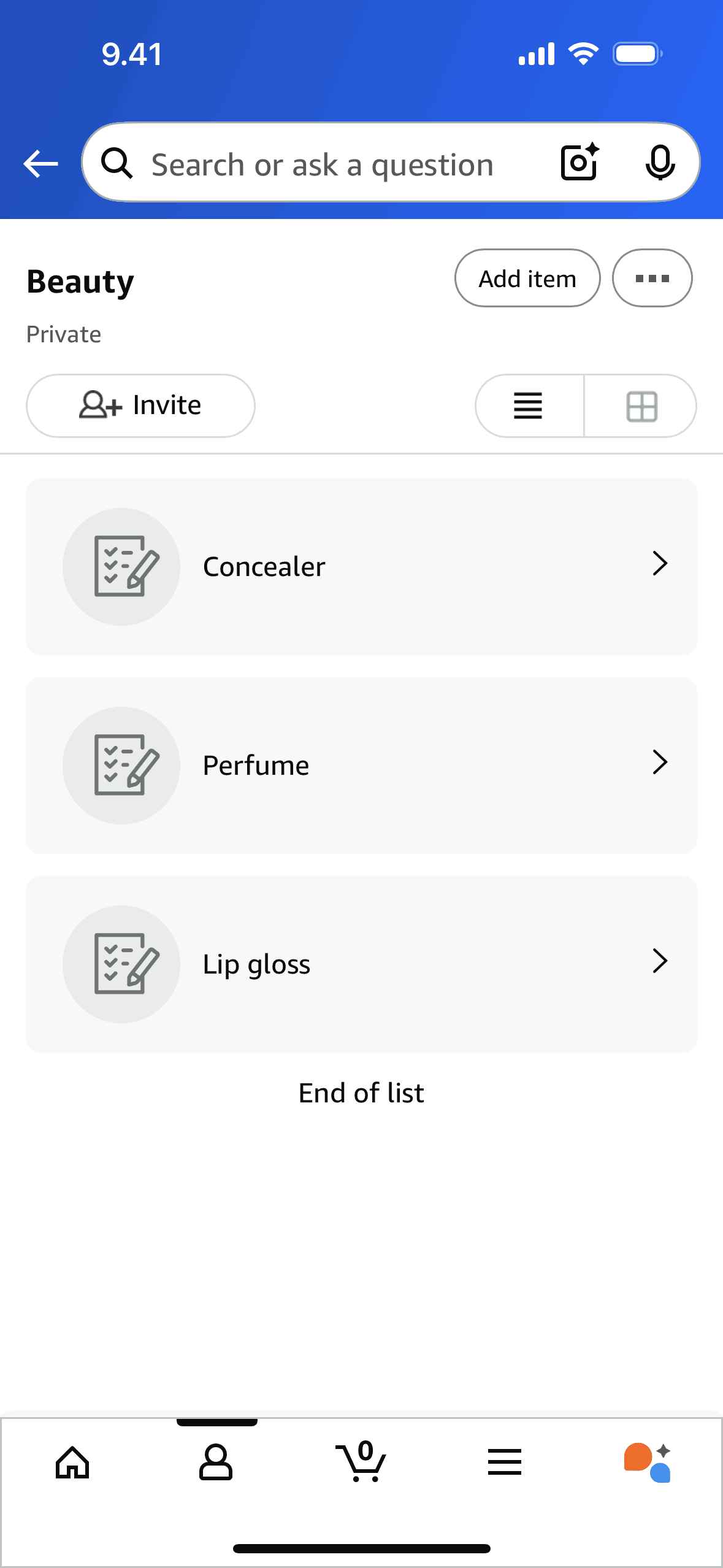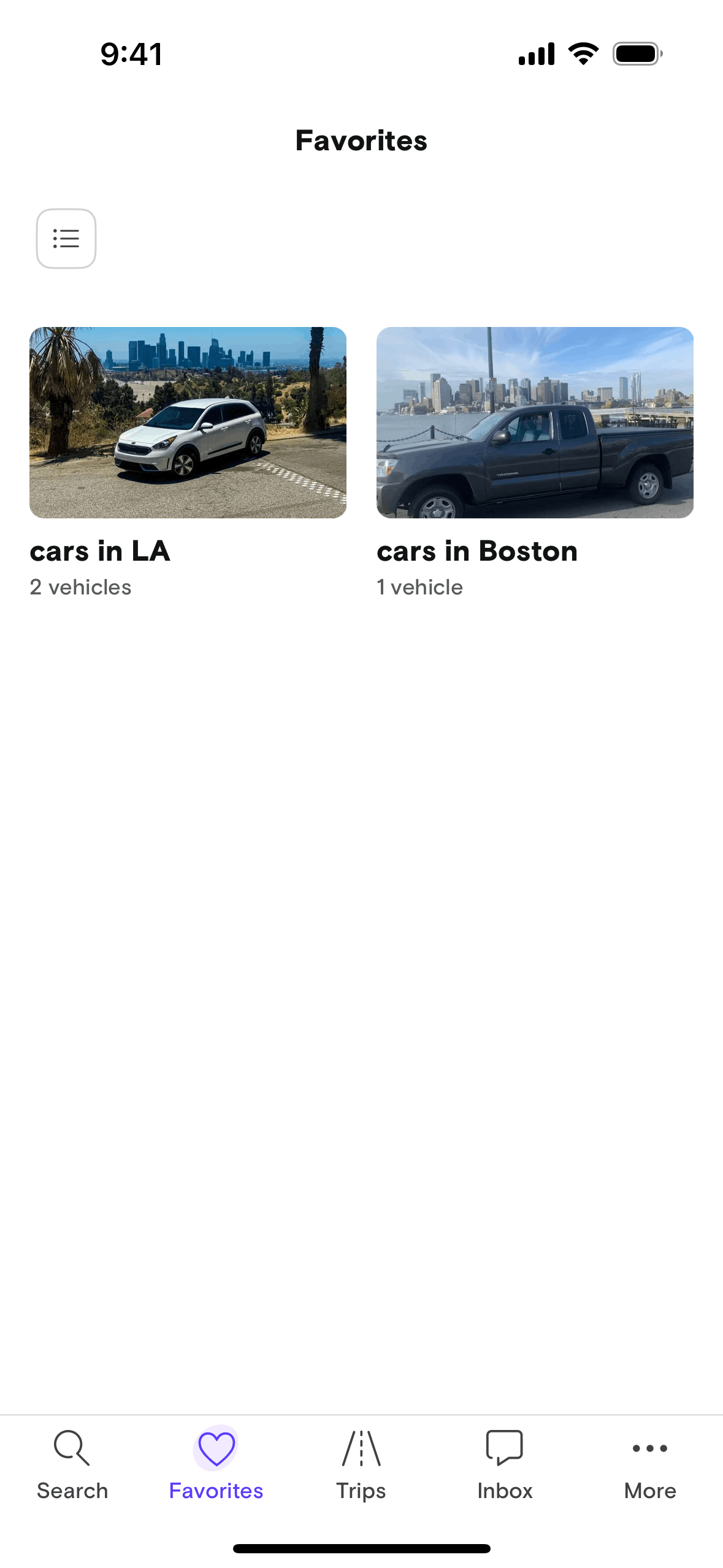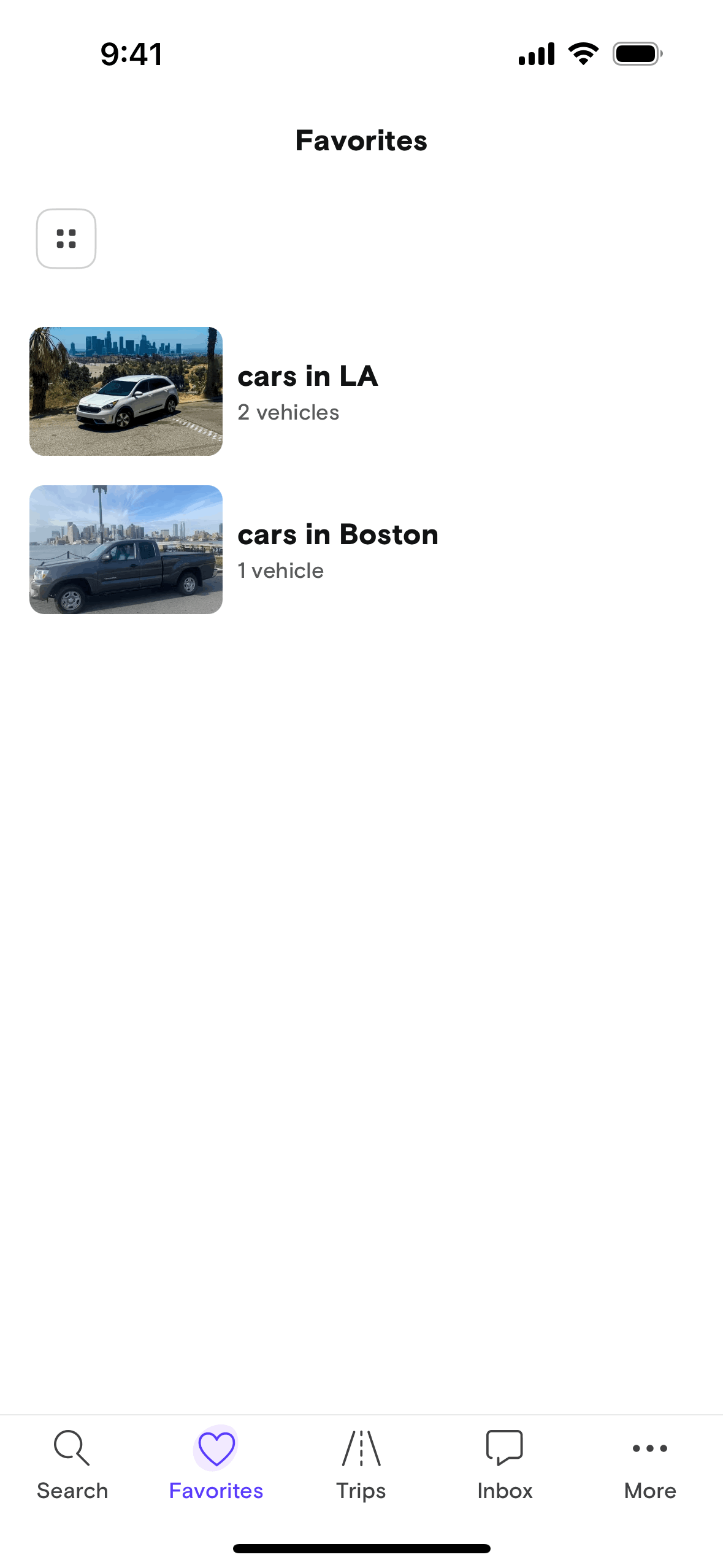 The user switches from list view to grid view on the Favorites screen by tapping the list icon.