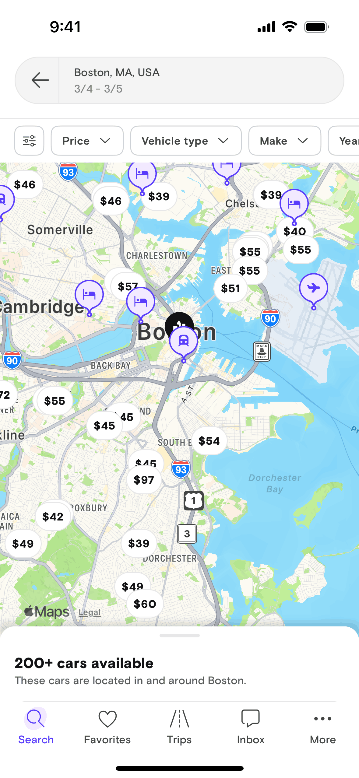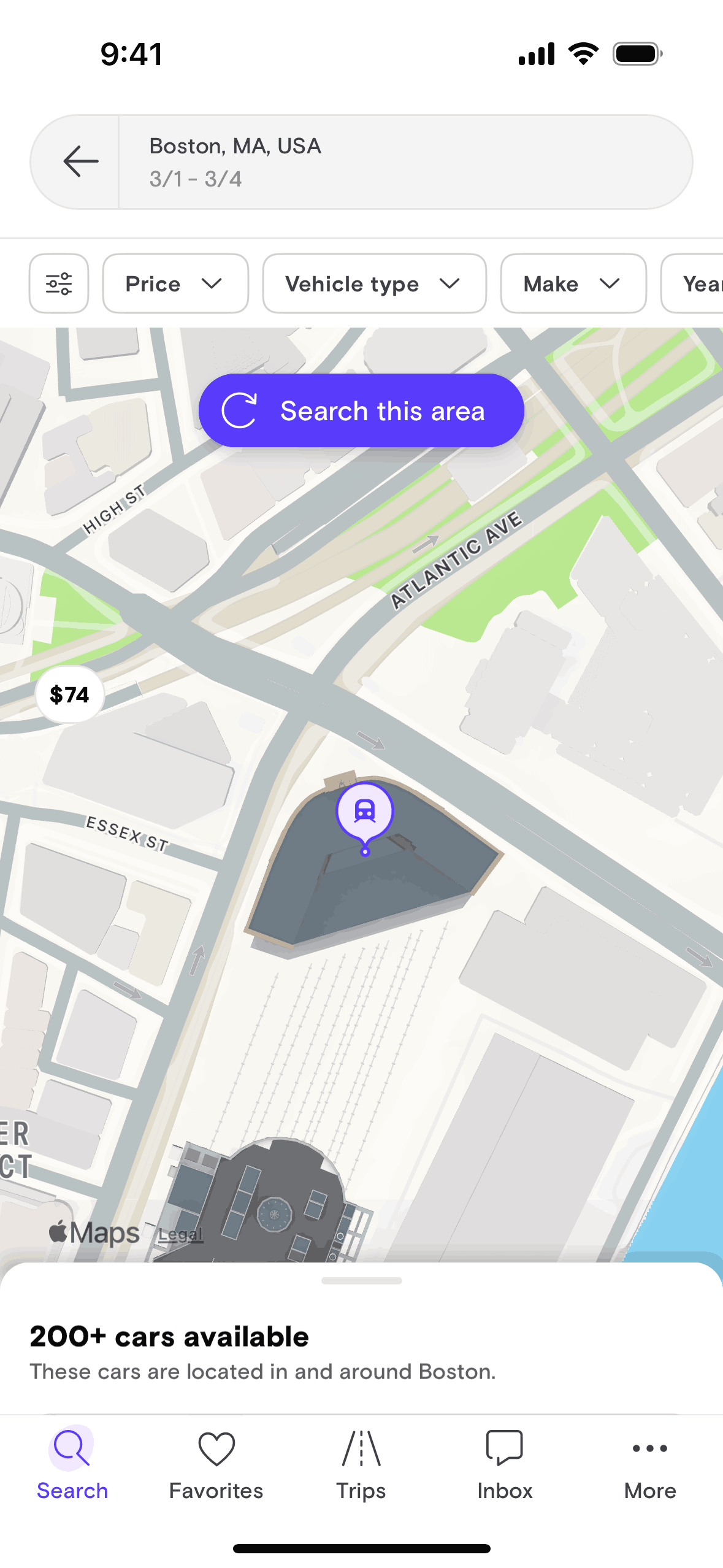 The user switches from a list view of available cars to a map view. They then zoom in and are prompted to search the visible area.