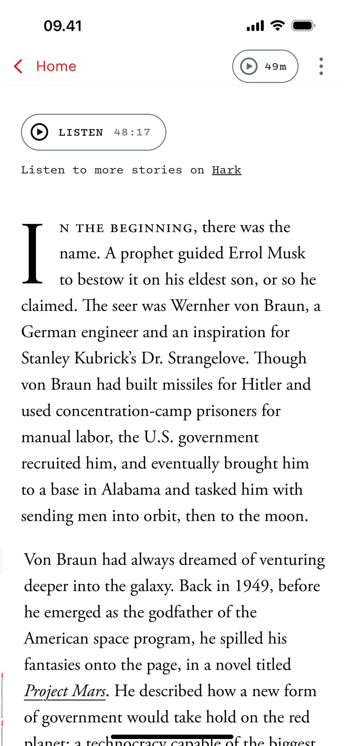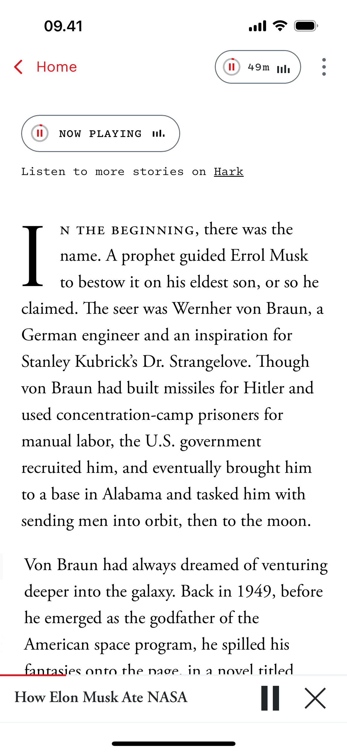 The user listens to an article by first pressing the 'Listen' button and then navigating to the audio player. The user can then control the playback.