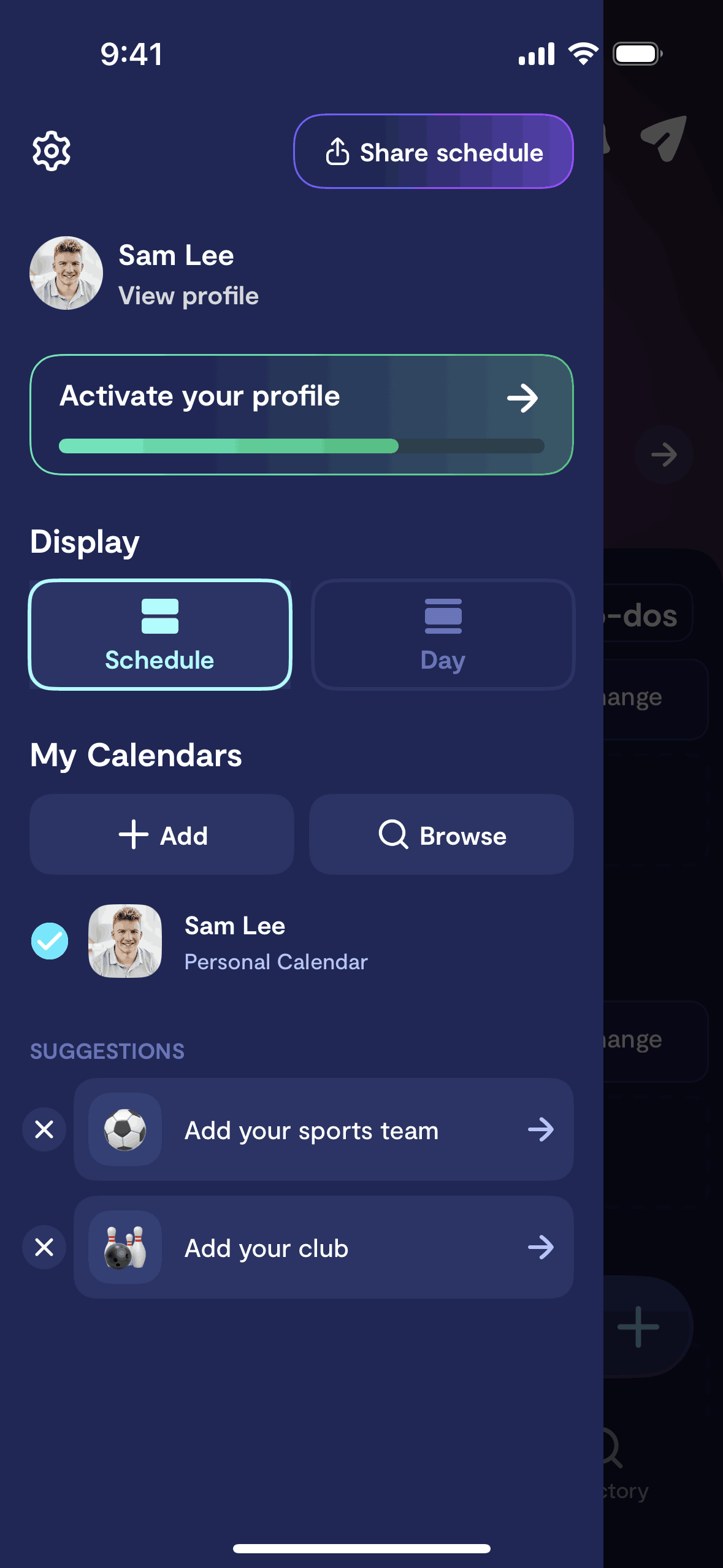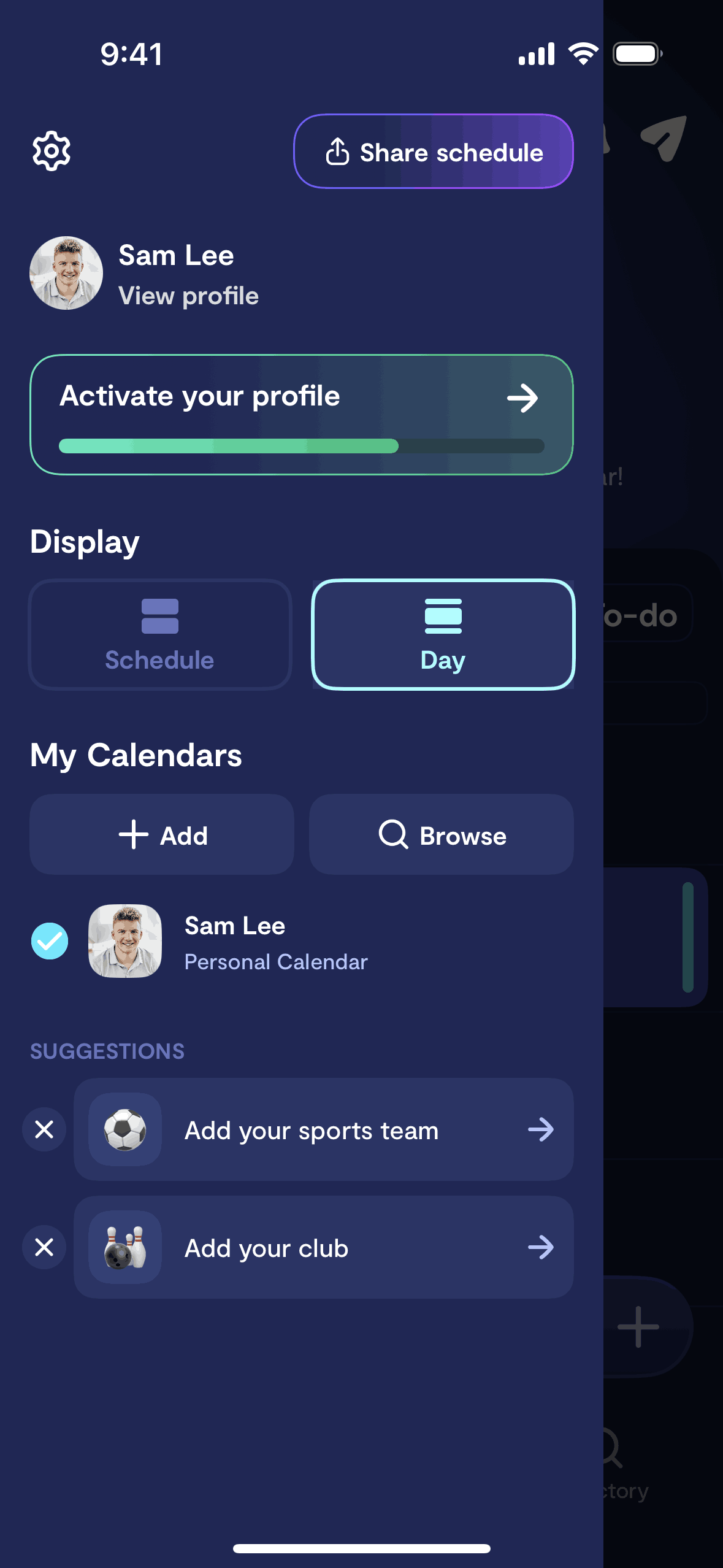 The user switches from the schedule view to the day view in the calendar. The calendar then displays the daily schedule.