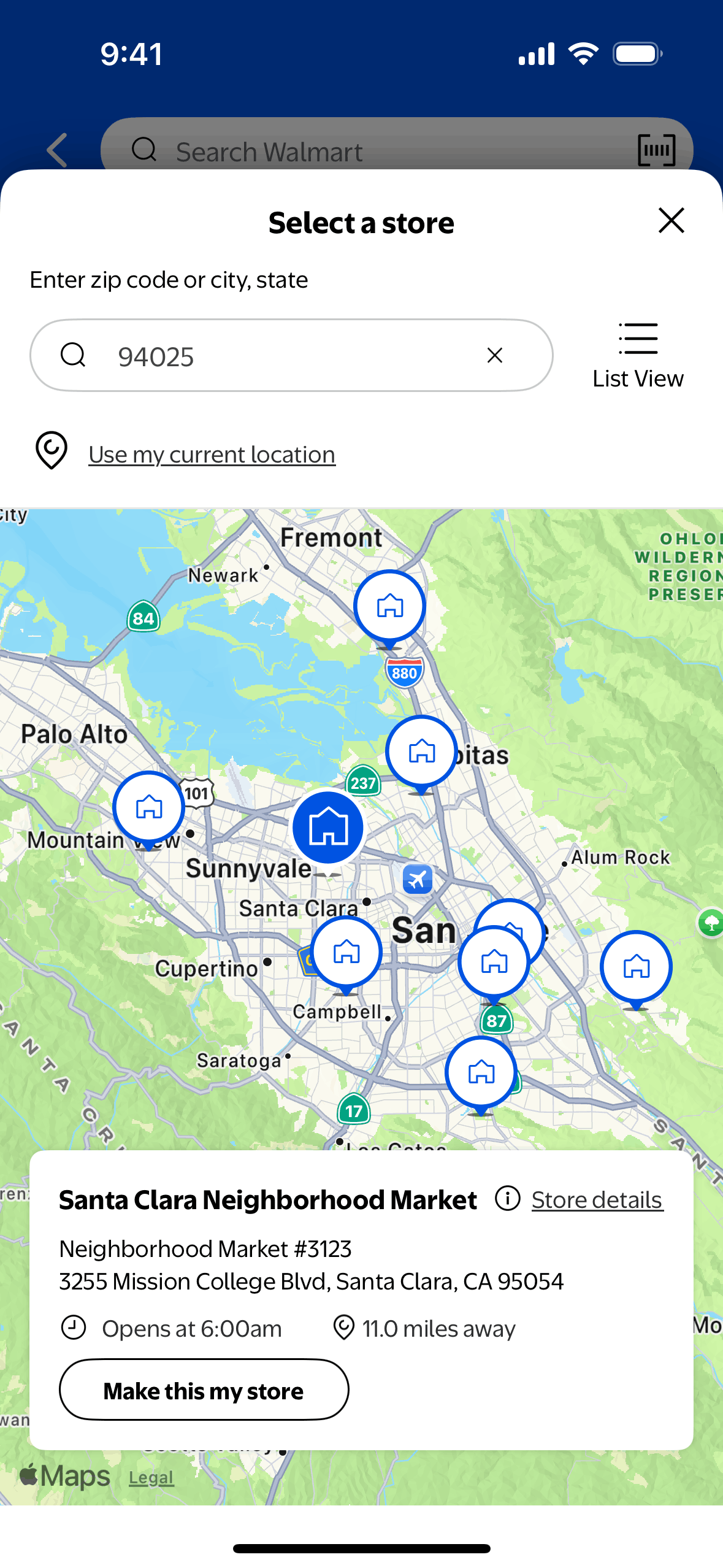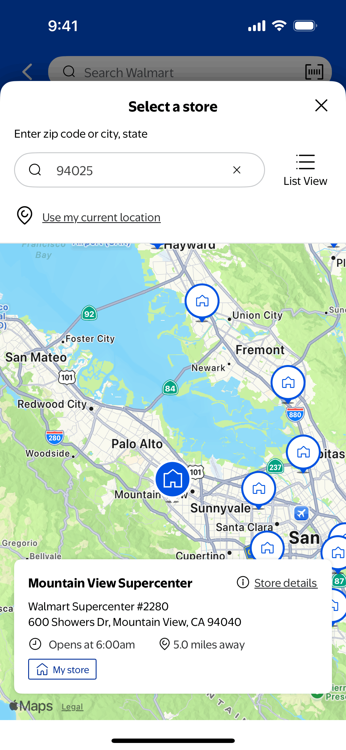 The user searches for stores and switches to map view to see store locations. They then select a store on the map to view its details.