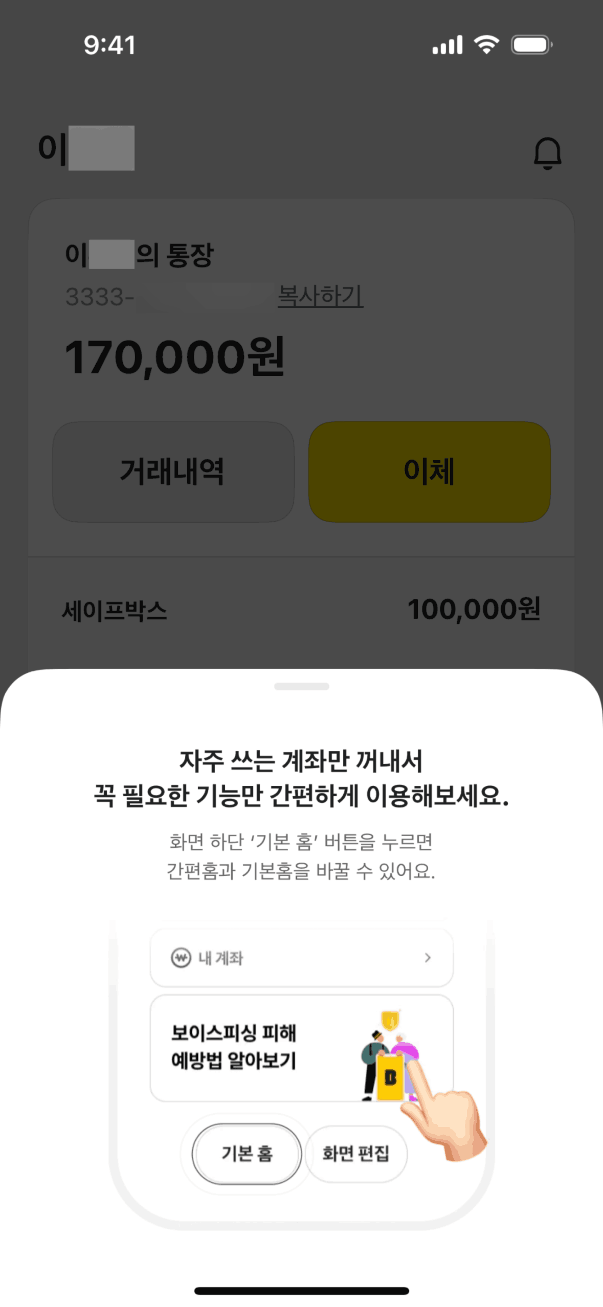 The user is prompted to switch to a simplified home screen, views account details, and sees options to switch between home screen modes.