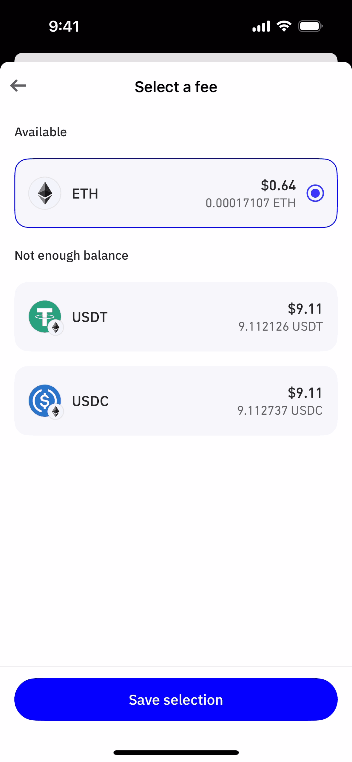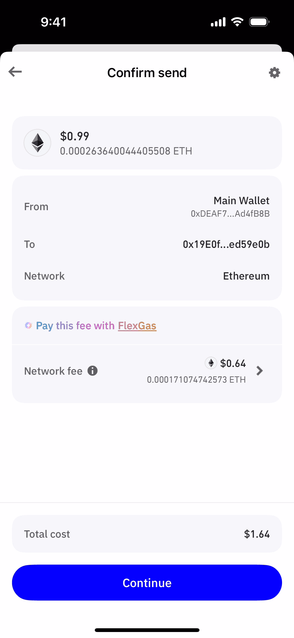 The user sends ETH by inputting details, confirming the transaction, and selecting a fee. A processing screen confirms the transaction is underway.