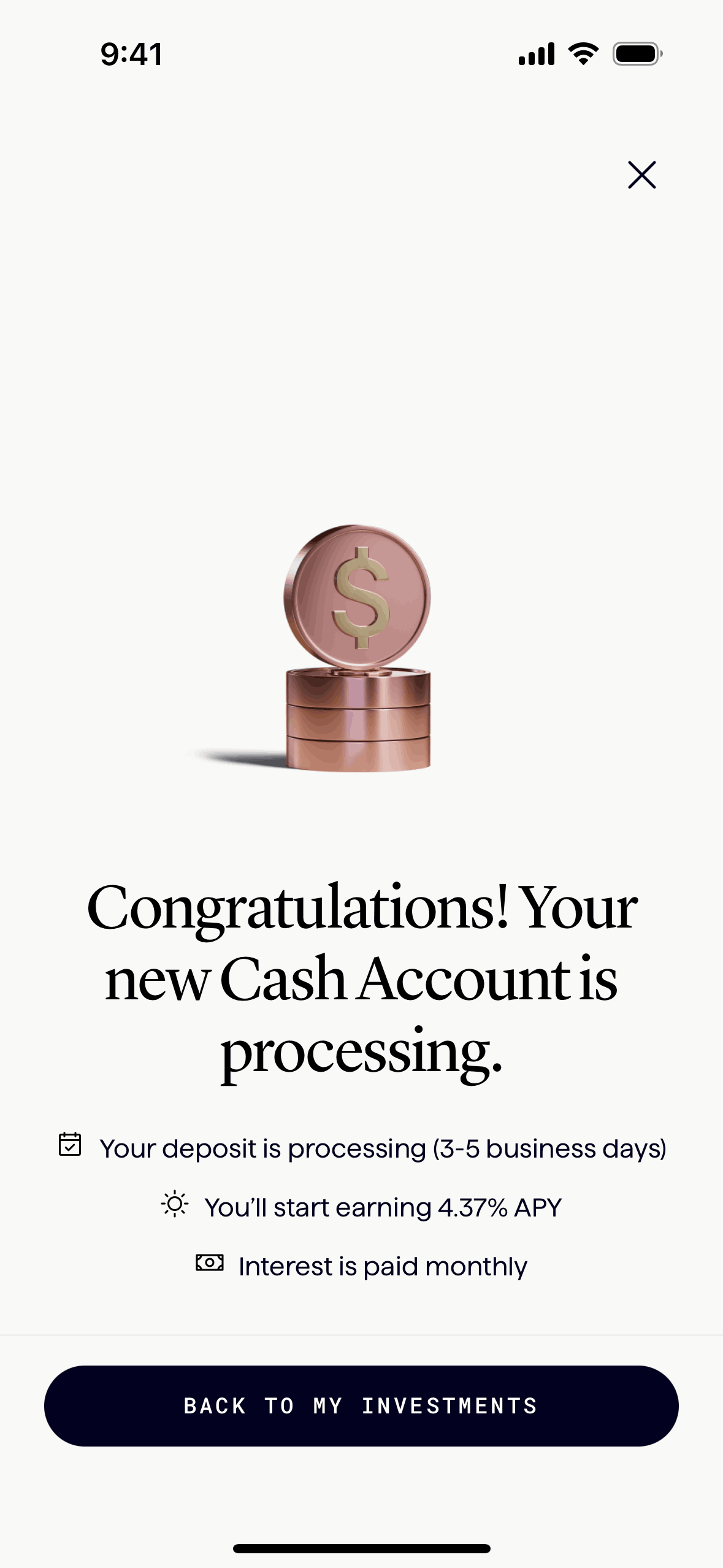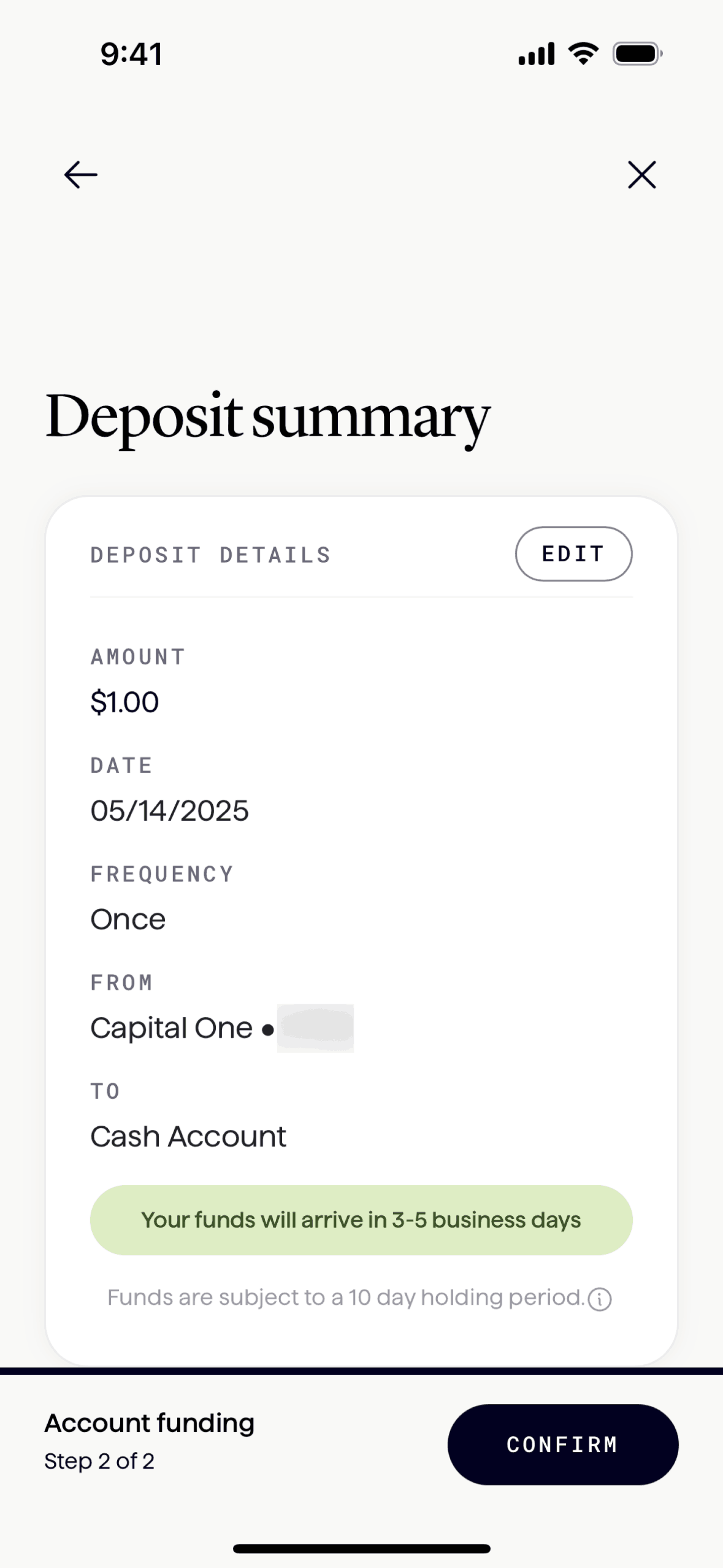 The user flow guides the user to add funds to their new account. It involves entering deposit details, confirming the transaction, and viewing the processing confirmation.