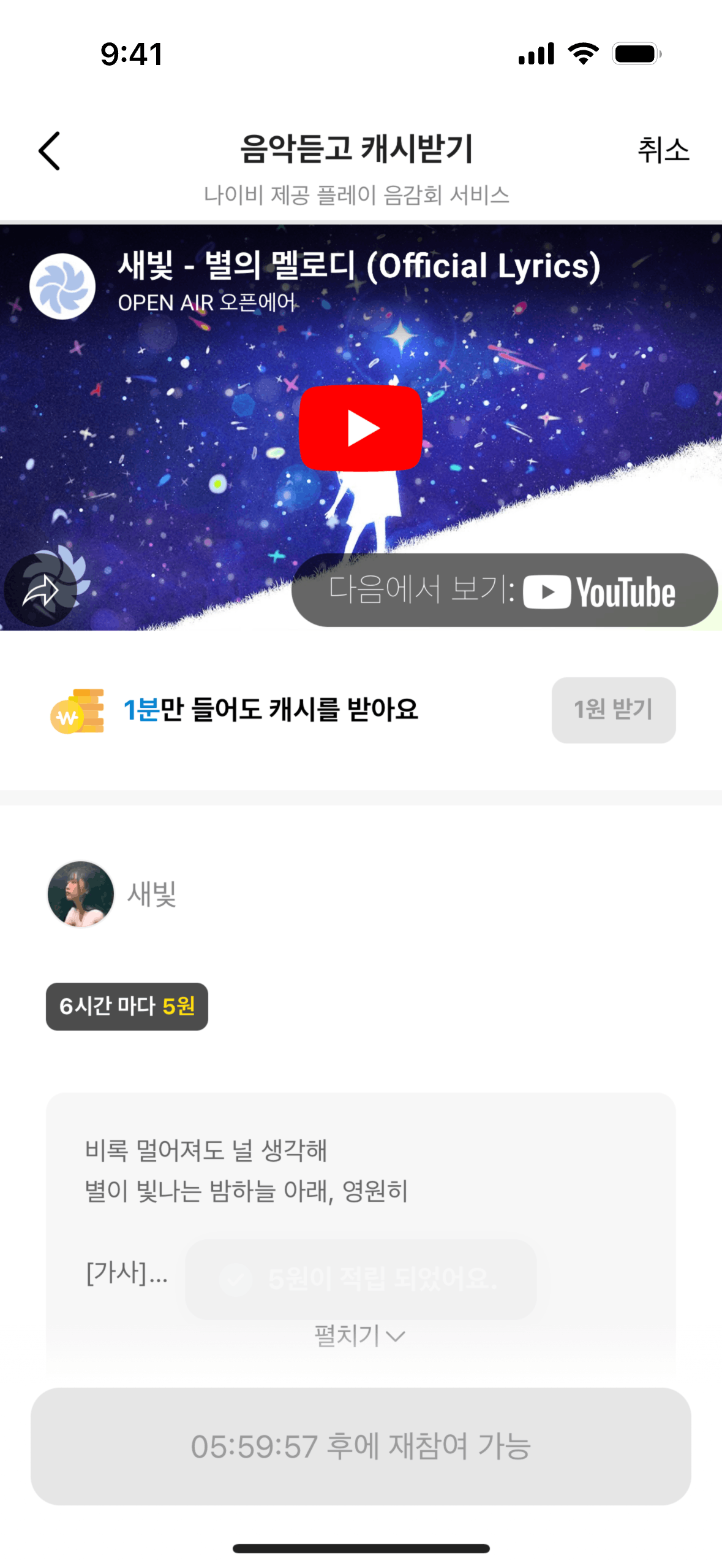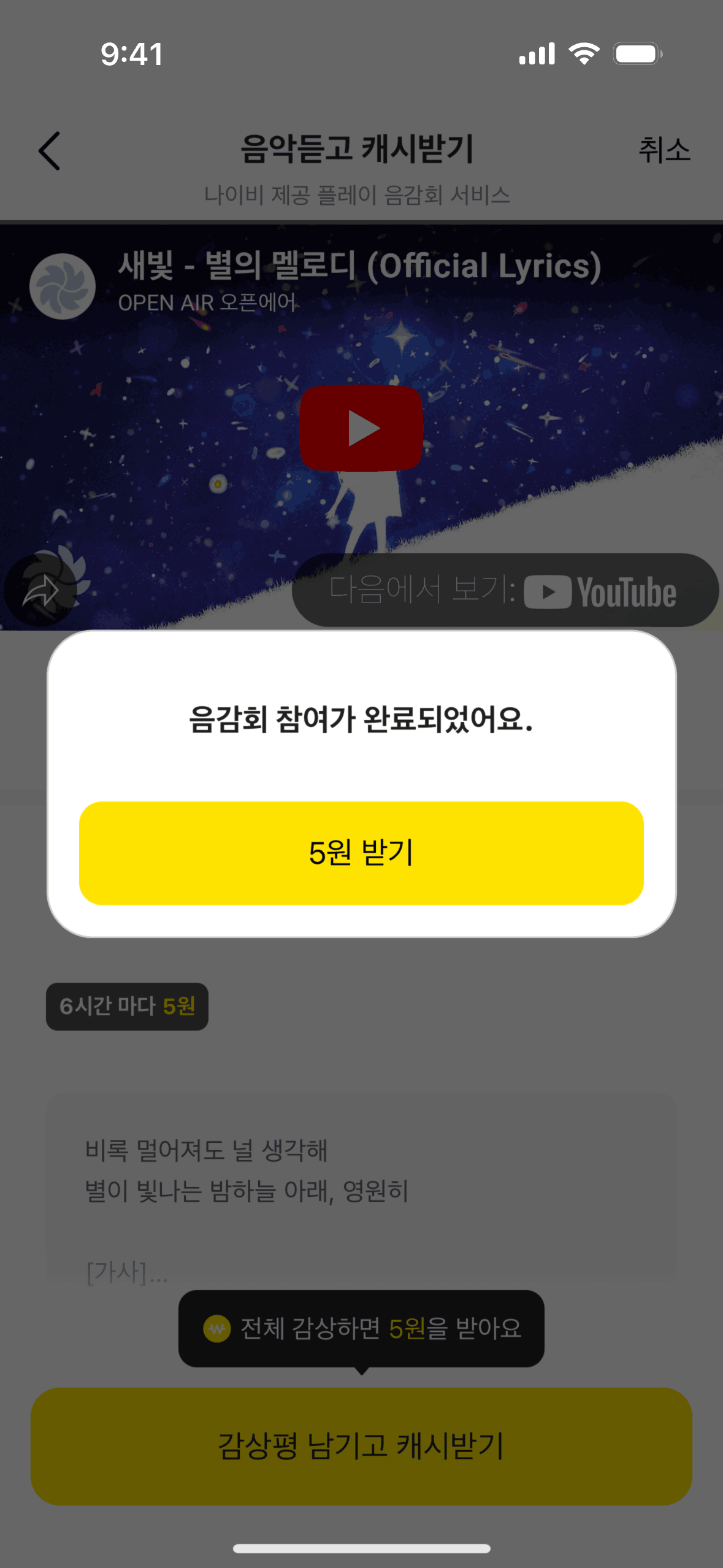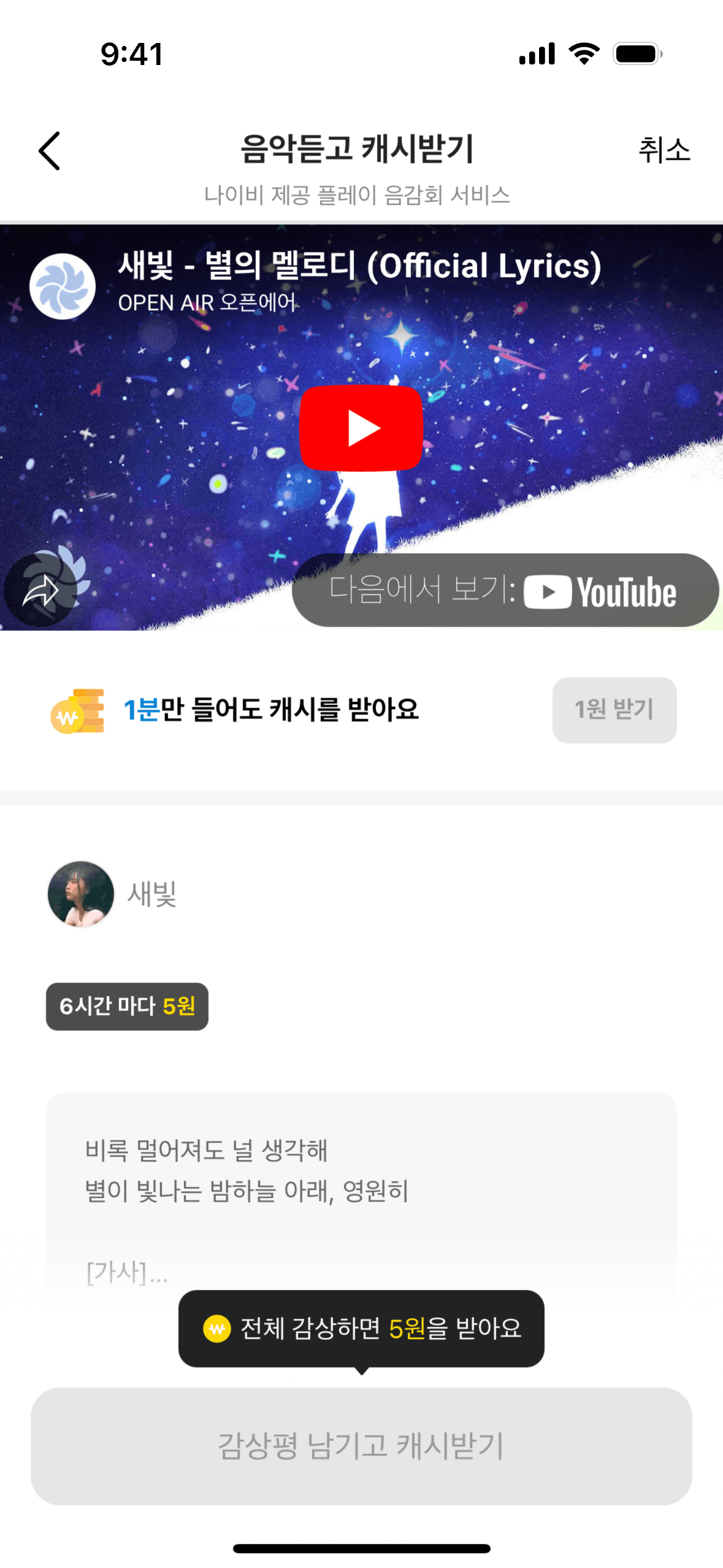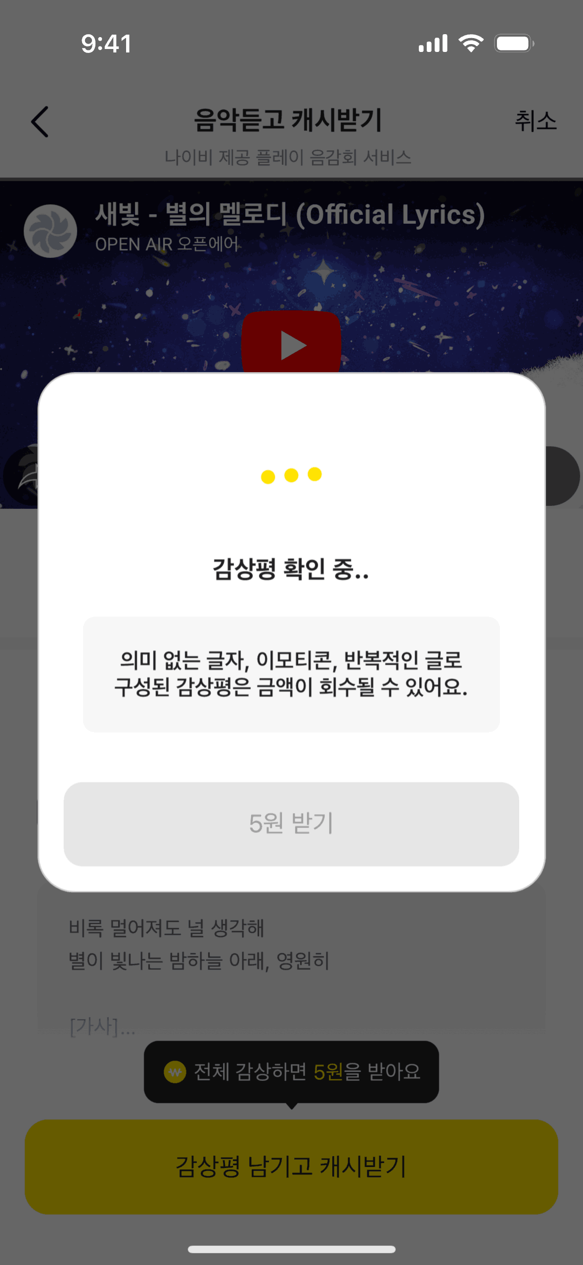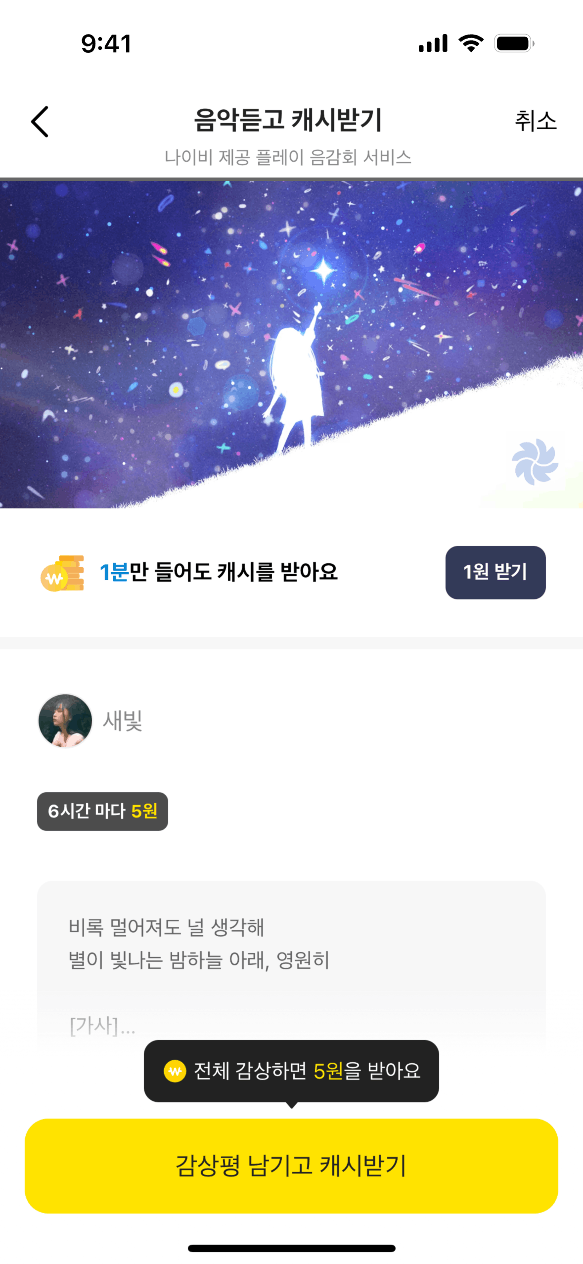 The user listens to music, submits a review, and receives a reward. The flow showcases the process of earning rewards through music engagement.