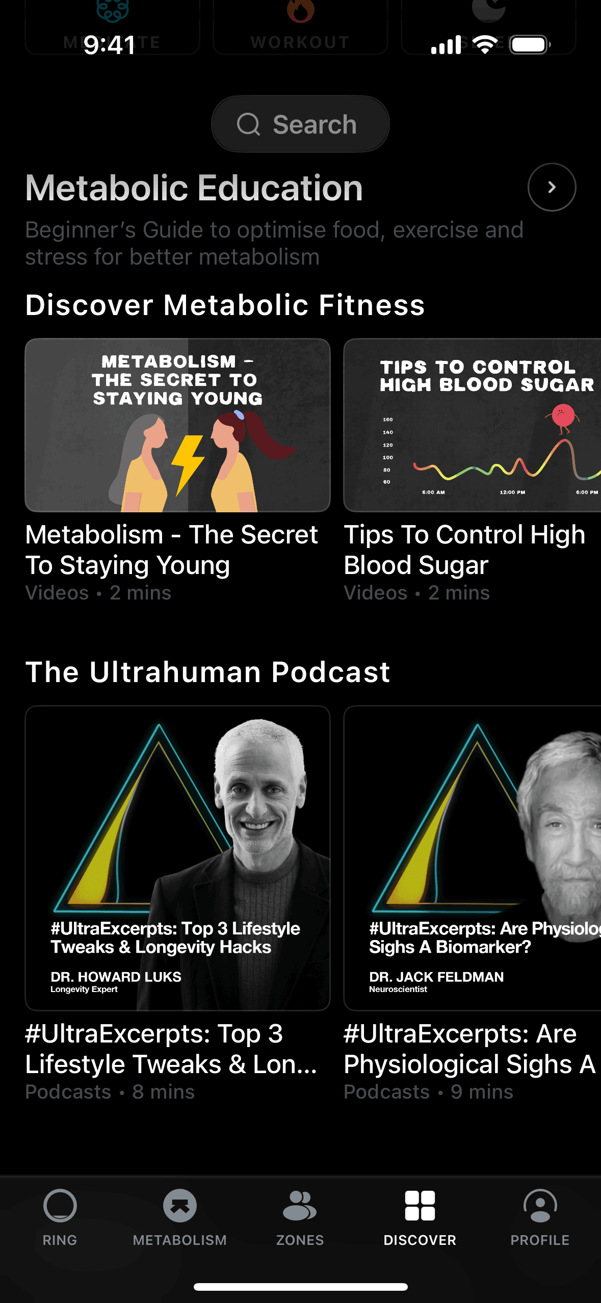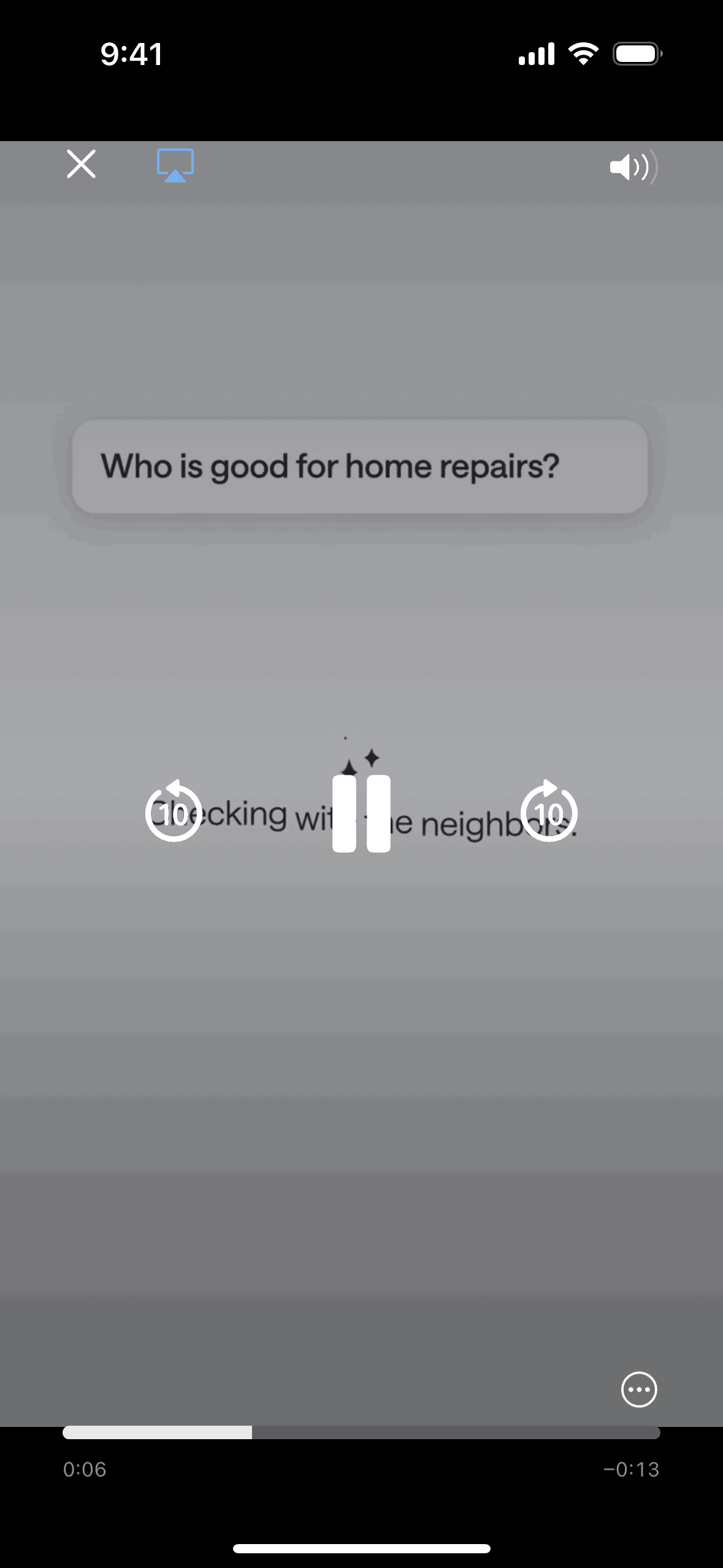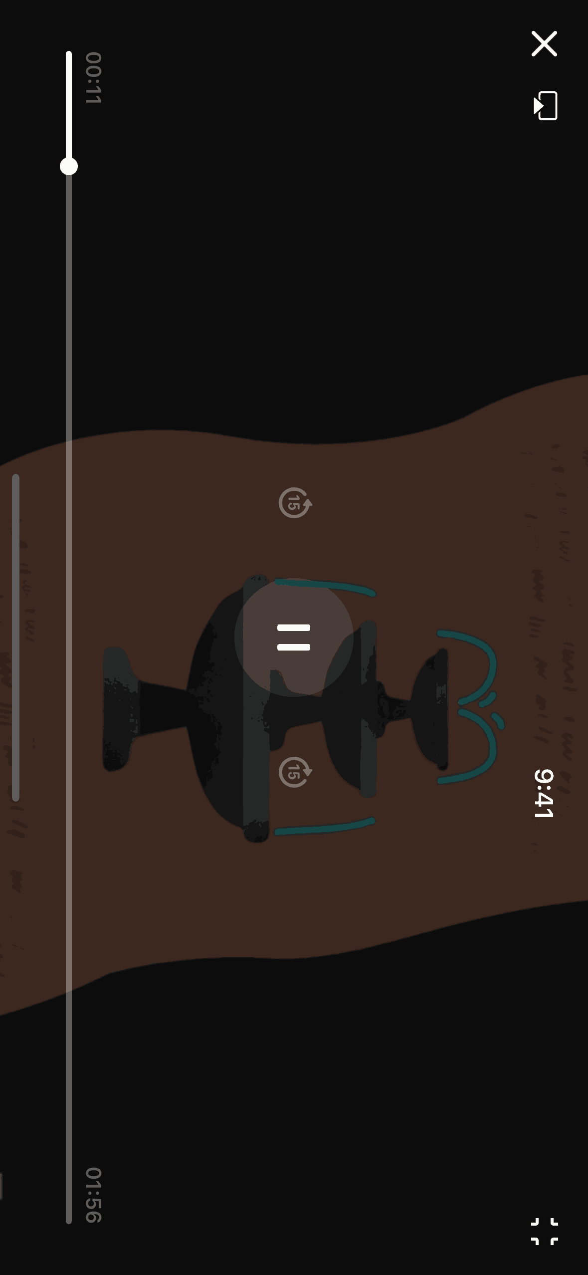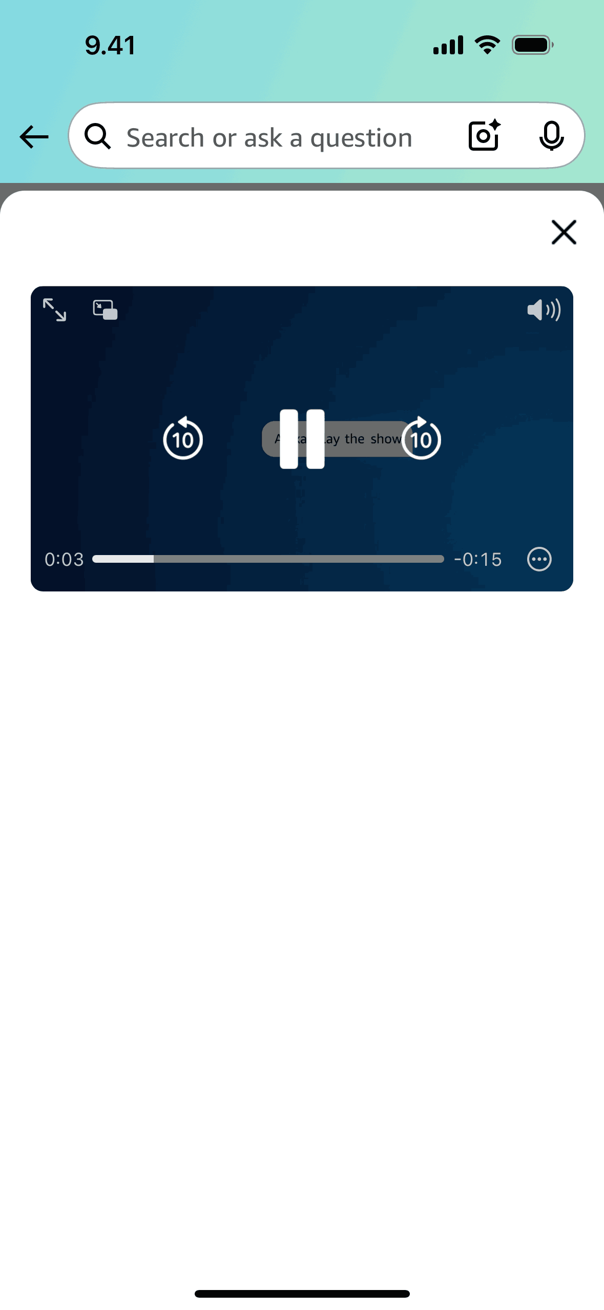The user browses the discovery page, selects a video, and watches it in fullscreen. Playback controls allow the user to pause and control the video.