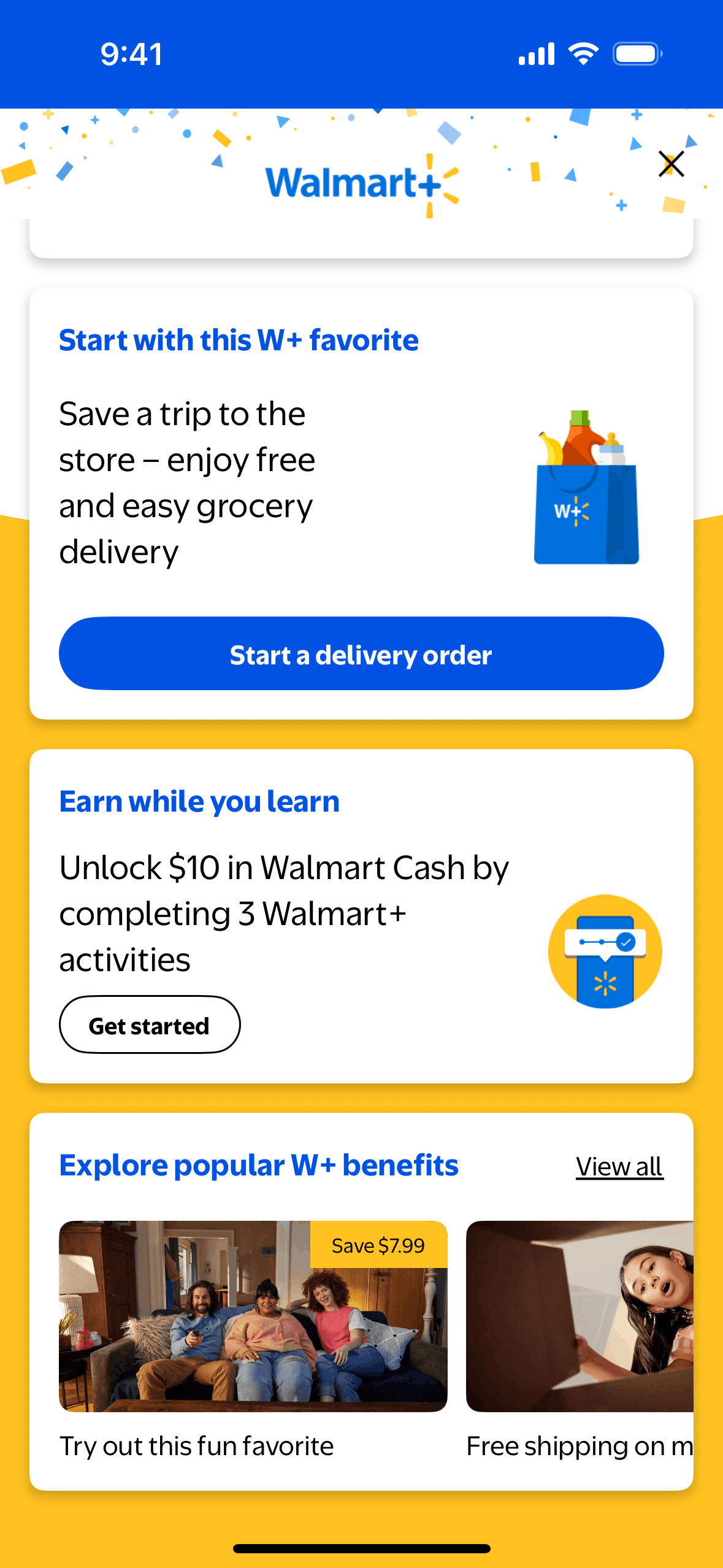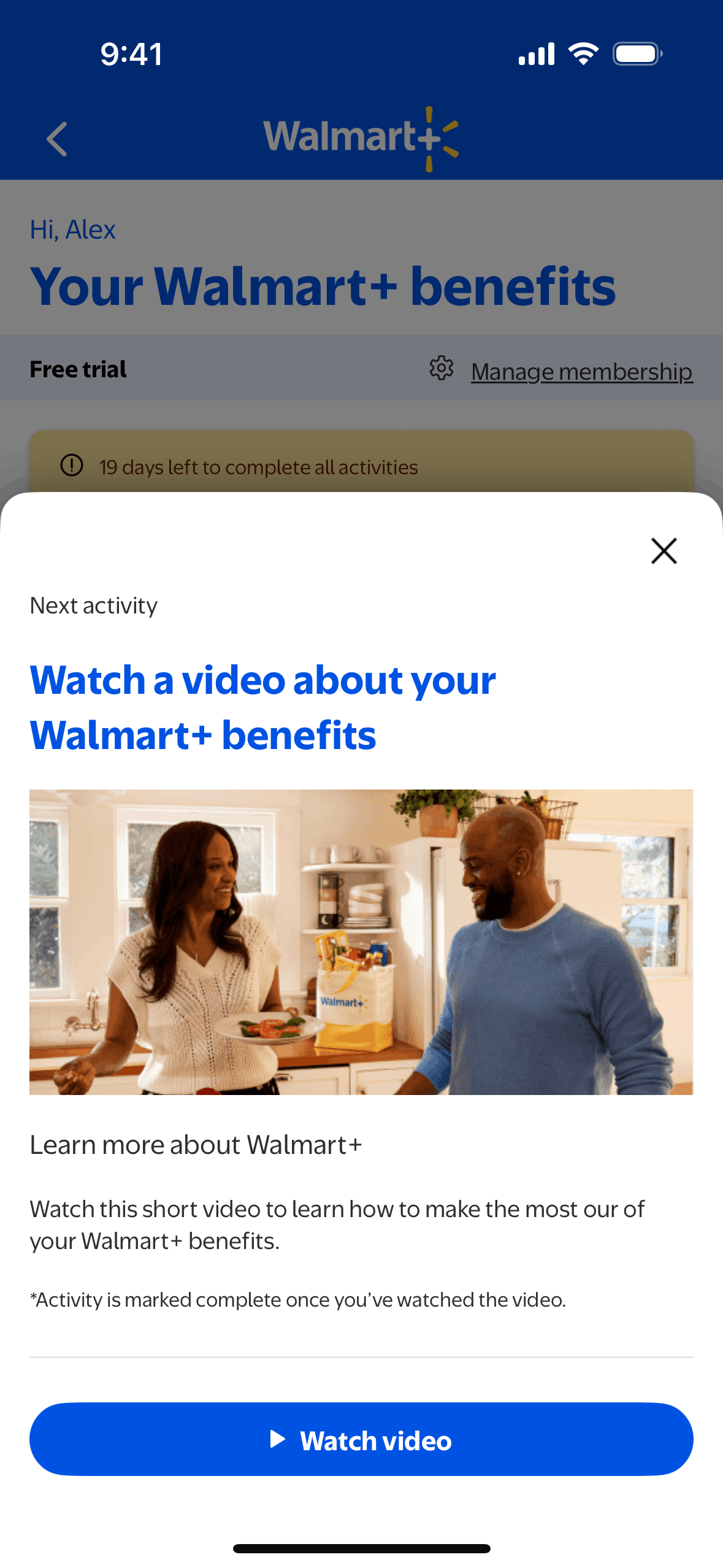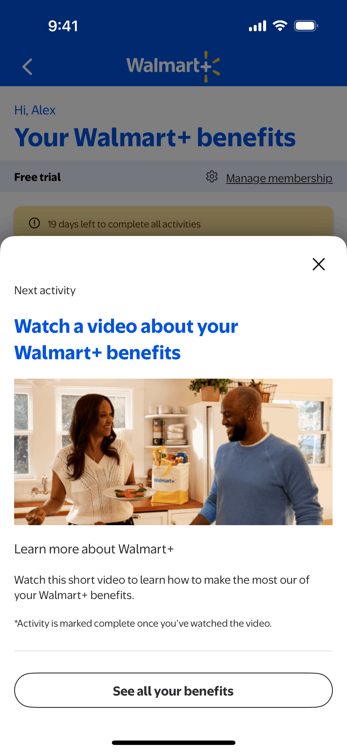 The user completes an activity by watching a video about Walmart+ benefits. The activity is then marked as complete on the benefits page.