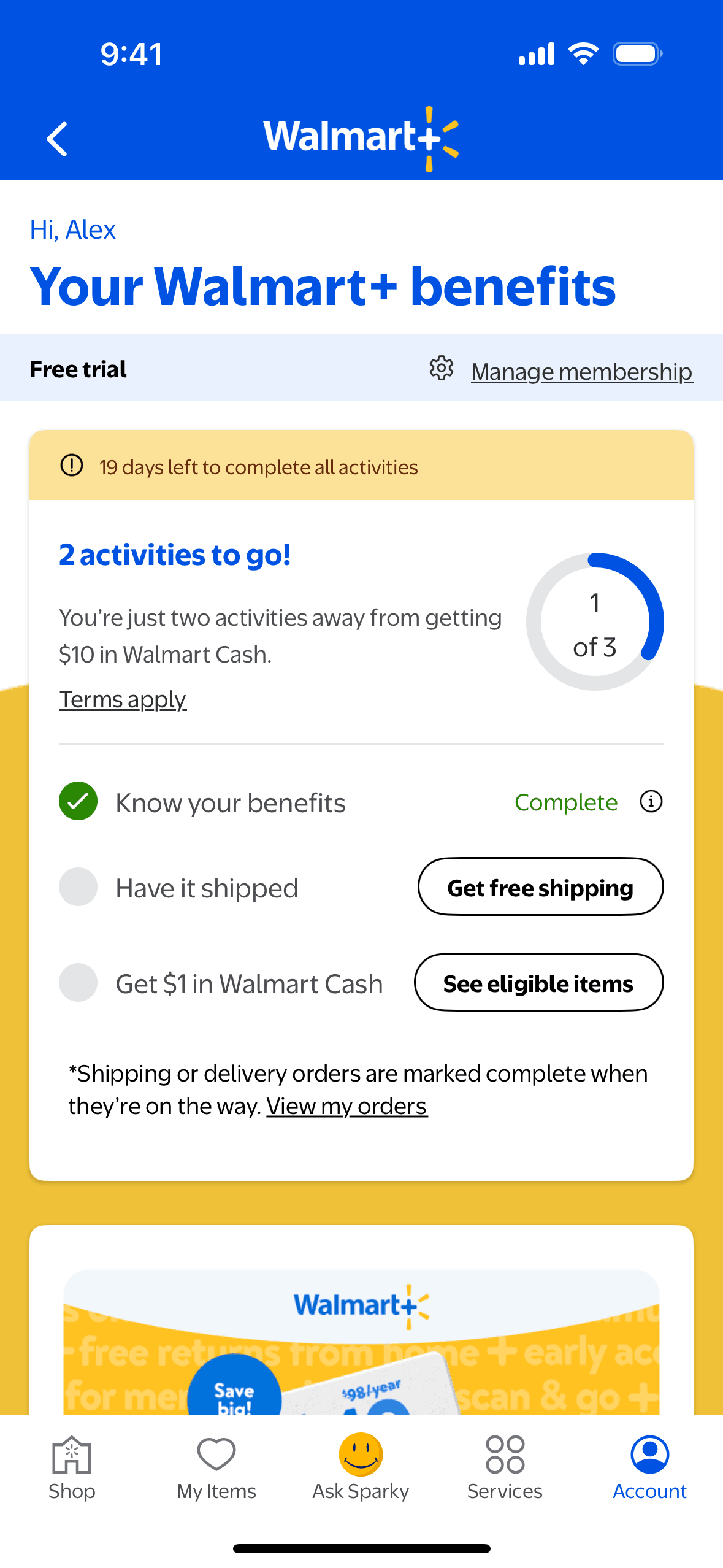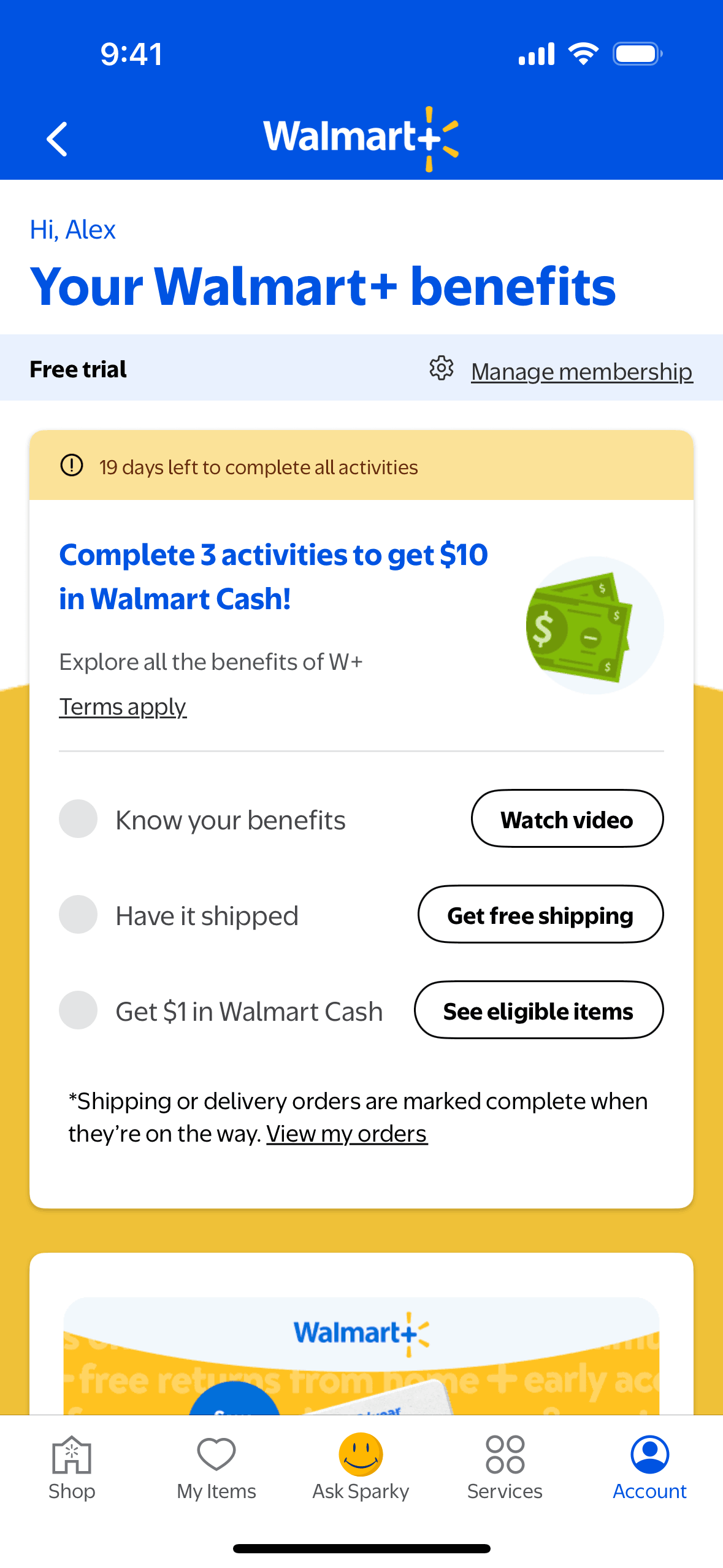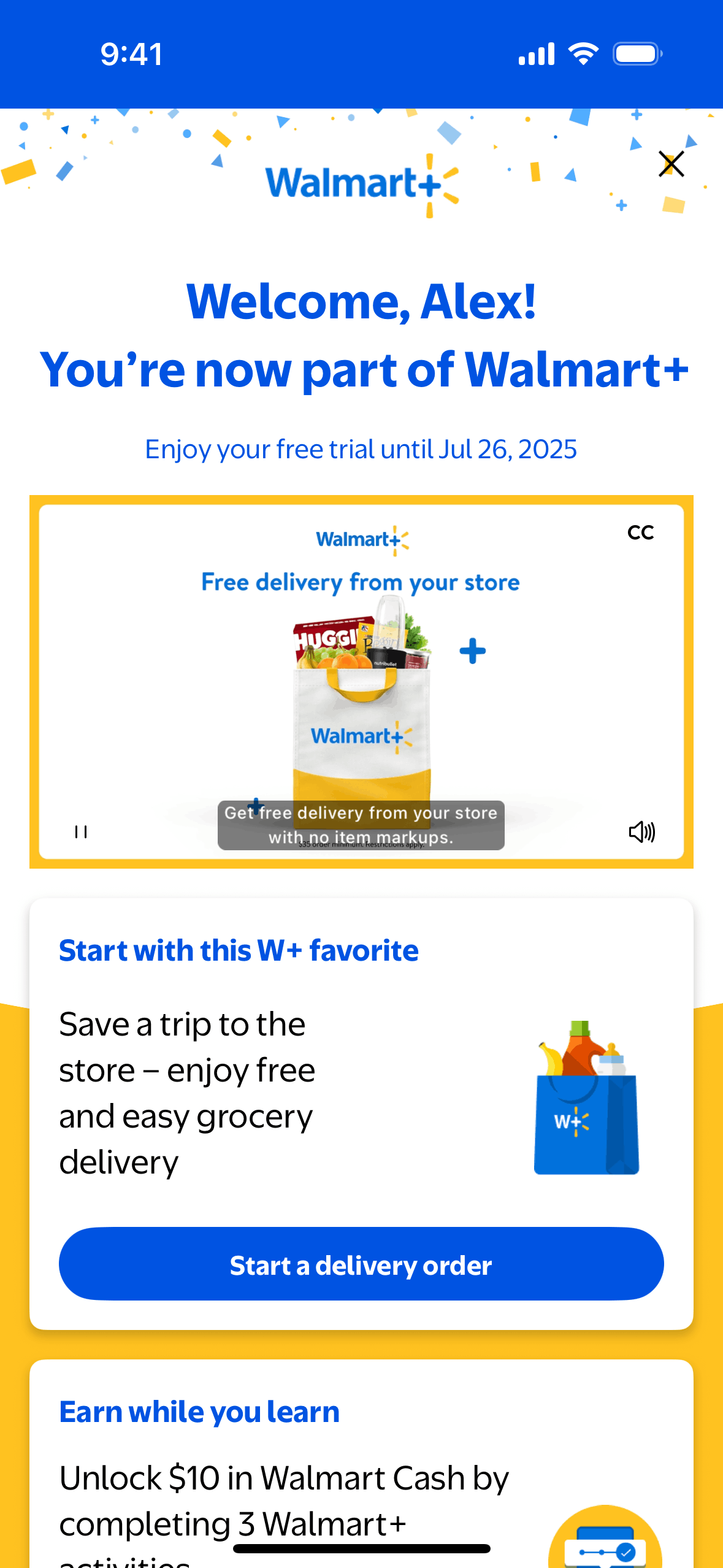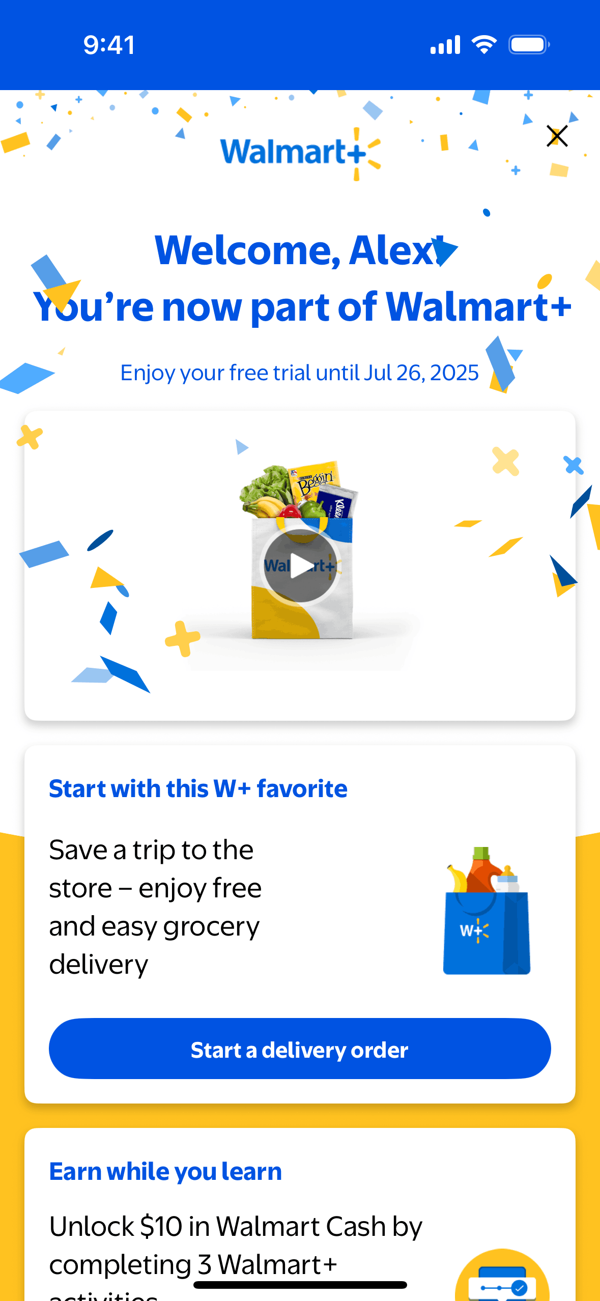 The user completes an activity by watching a video about Walmart+ benefits. The activity is then marked as complete on the benefits page.