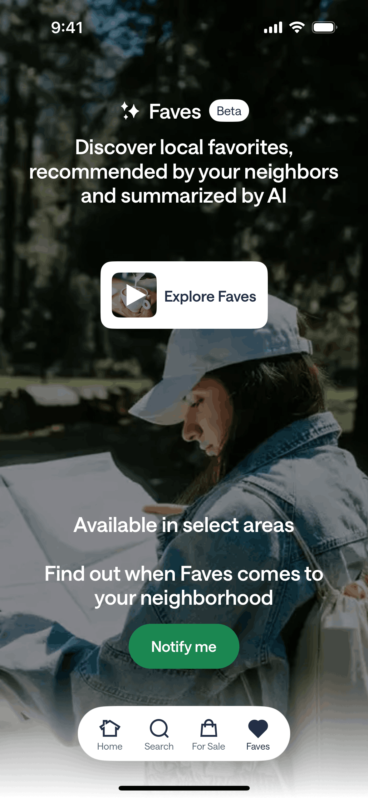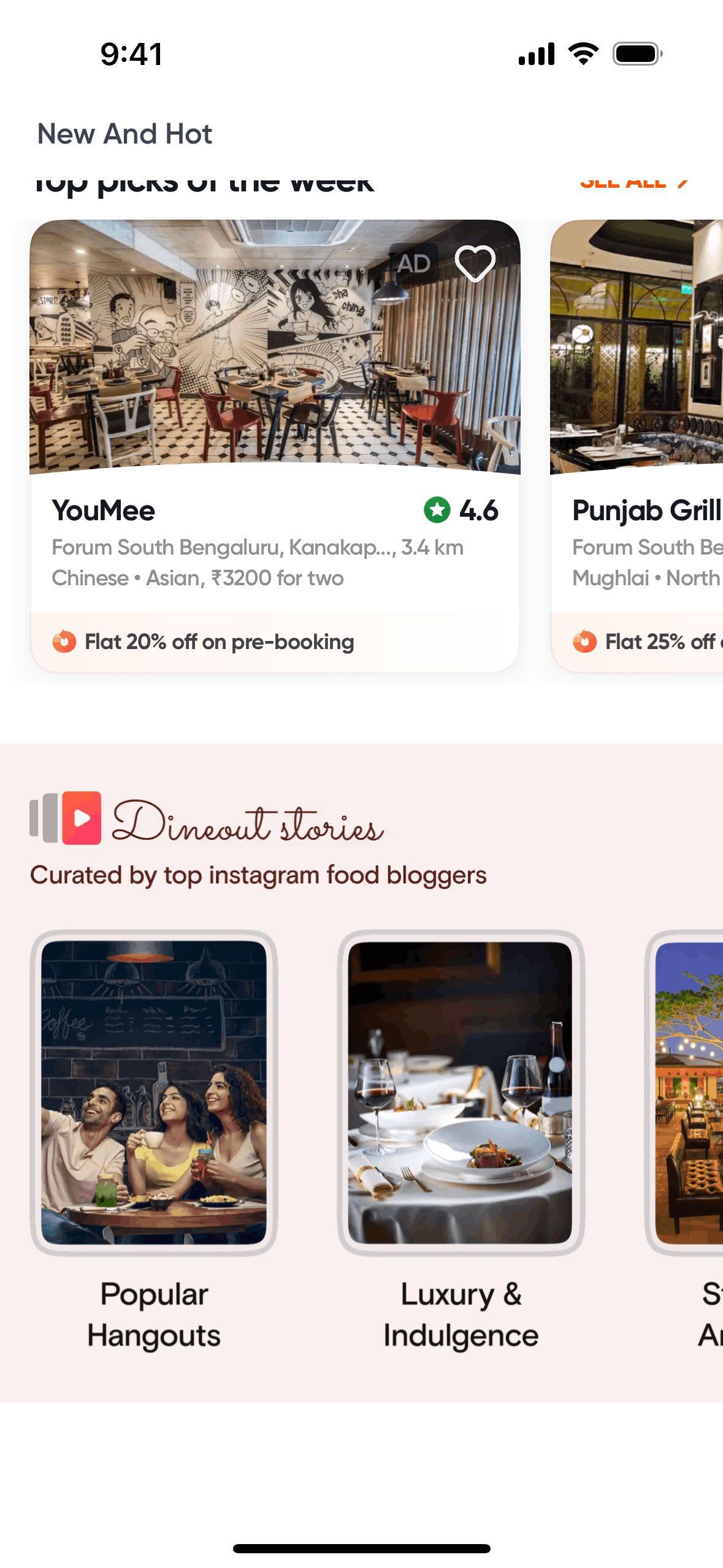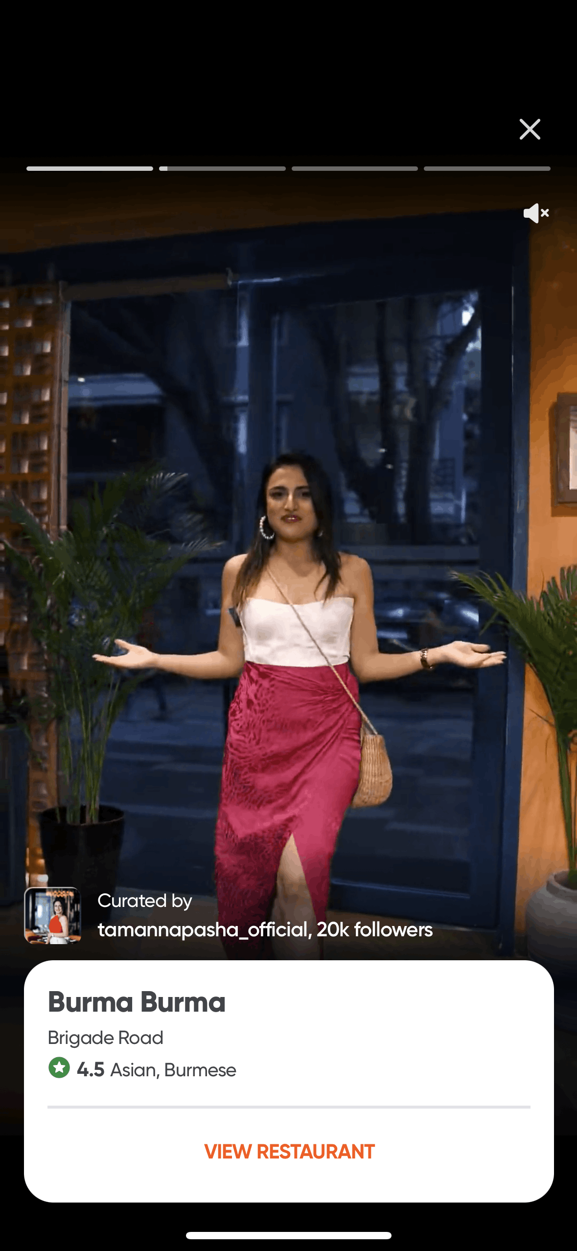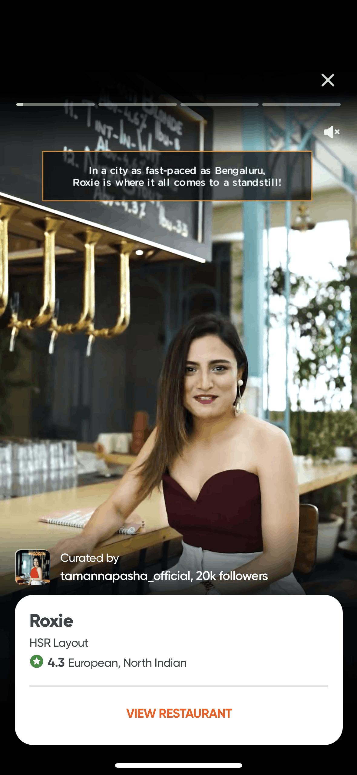 The user explores restaurants through curated stories. Each story features a restaurant with a call to action to view the restaurant.