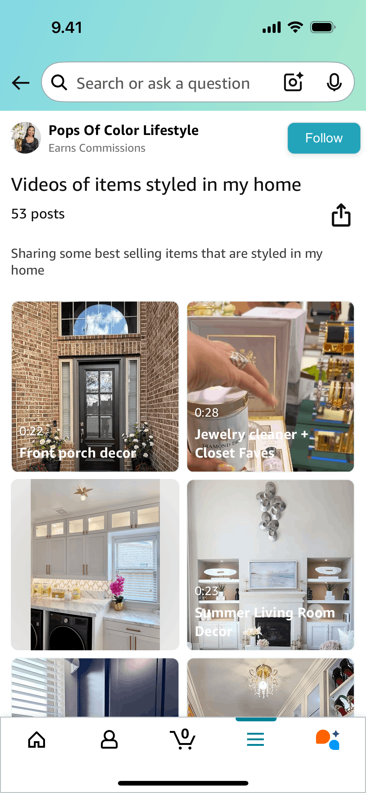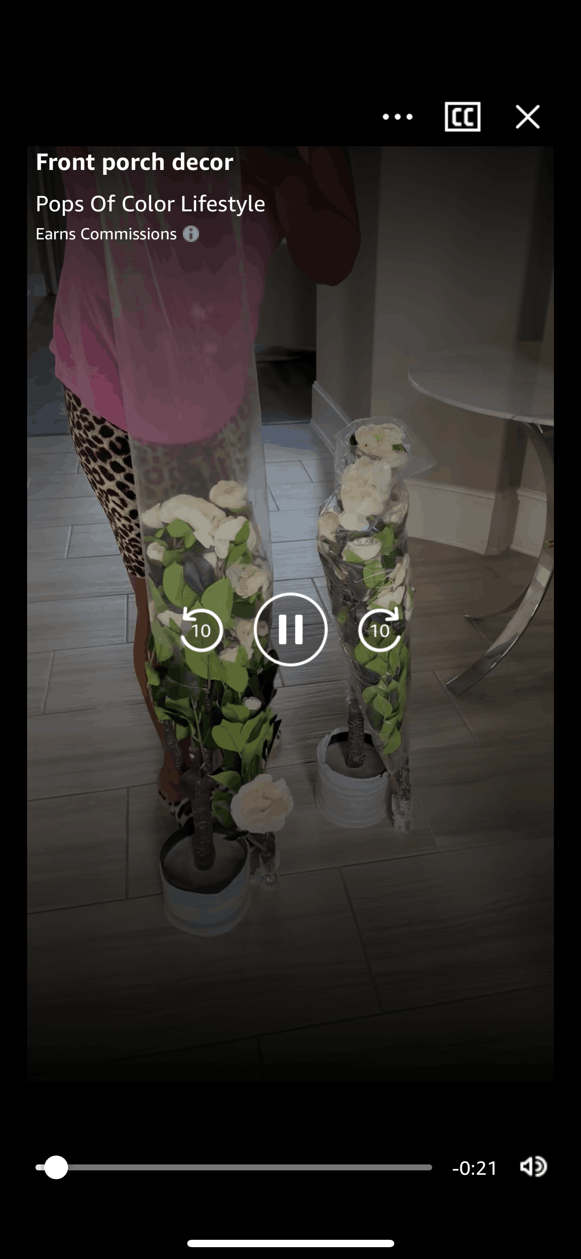 The user browses a collection of videos, selects one to watch, and views it in full screen. They are then given options to shop or share.