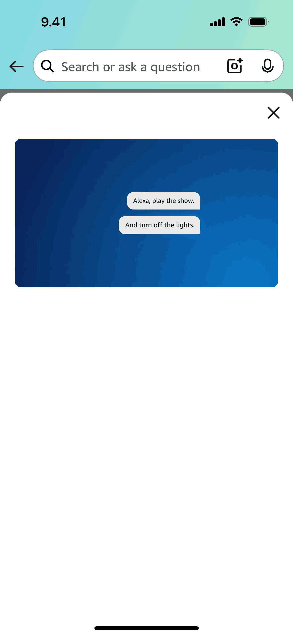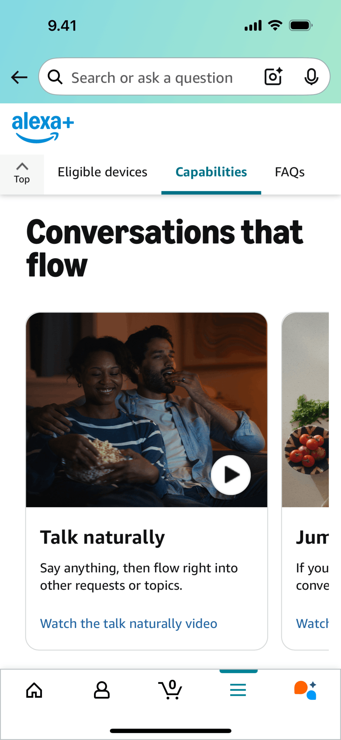 The user flow shows a user watching a video about Alexa+ features. The video ends with a screen displaying example Alexa commands.