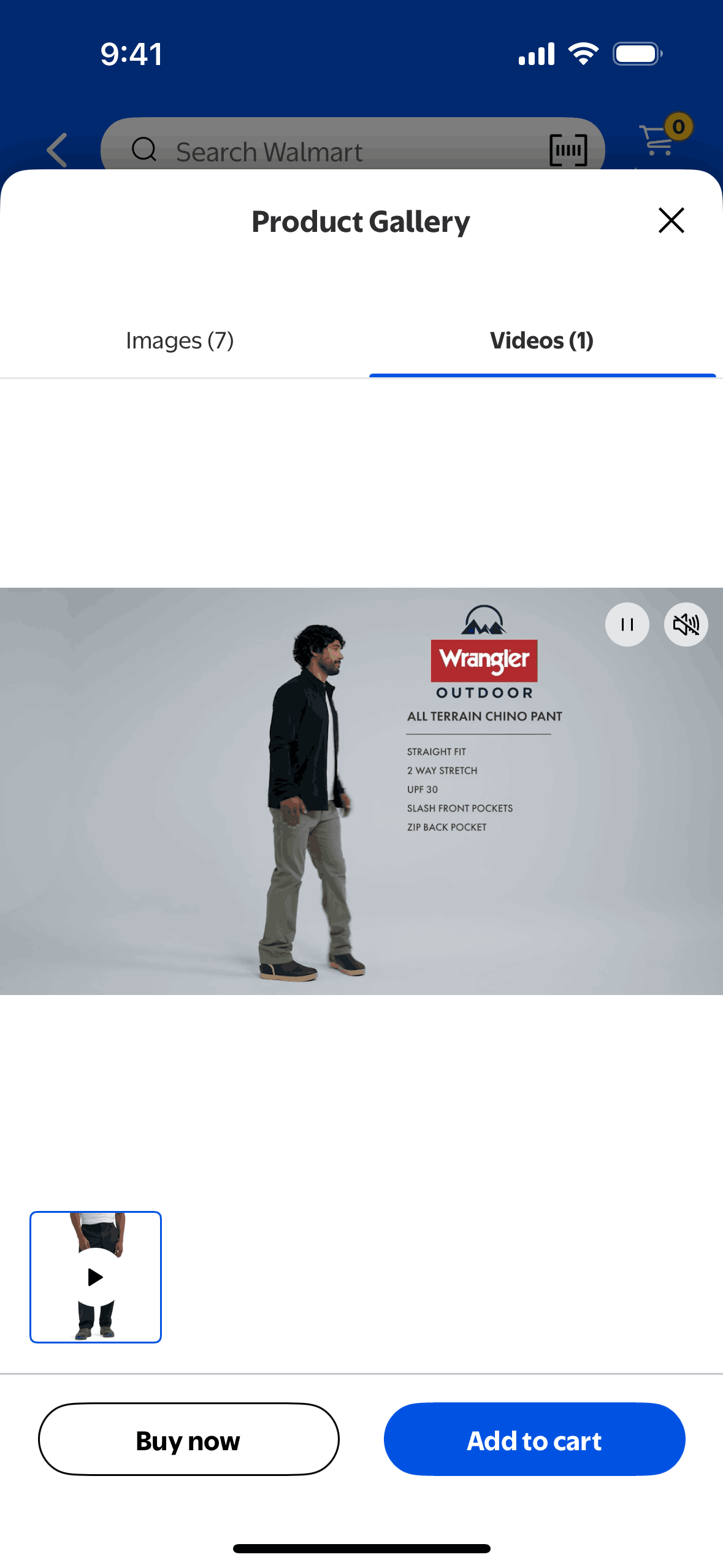The user views a product detail page and then opens the product gallery to watch a video of the product. The user is evaluating the product for purchase.