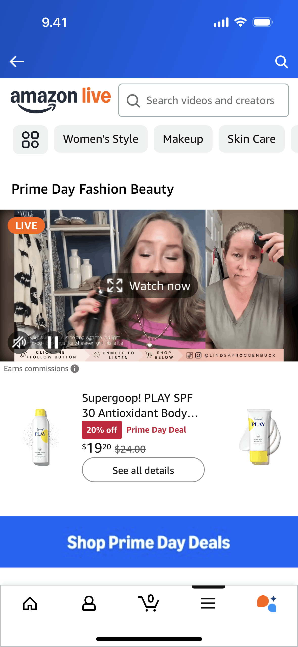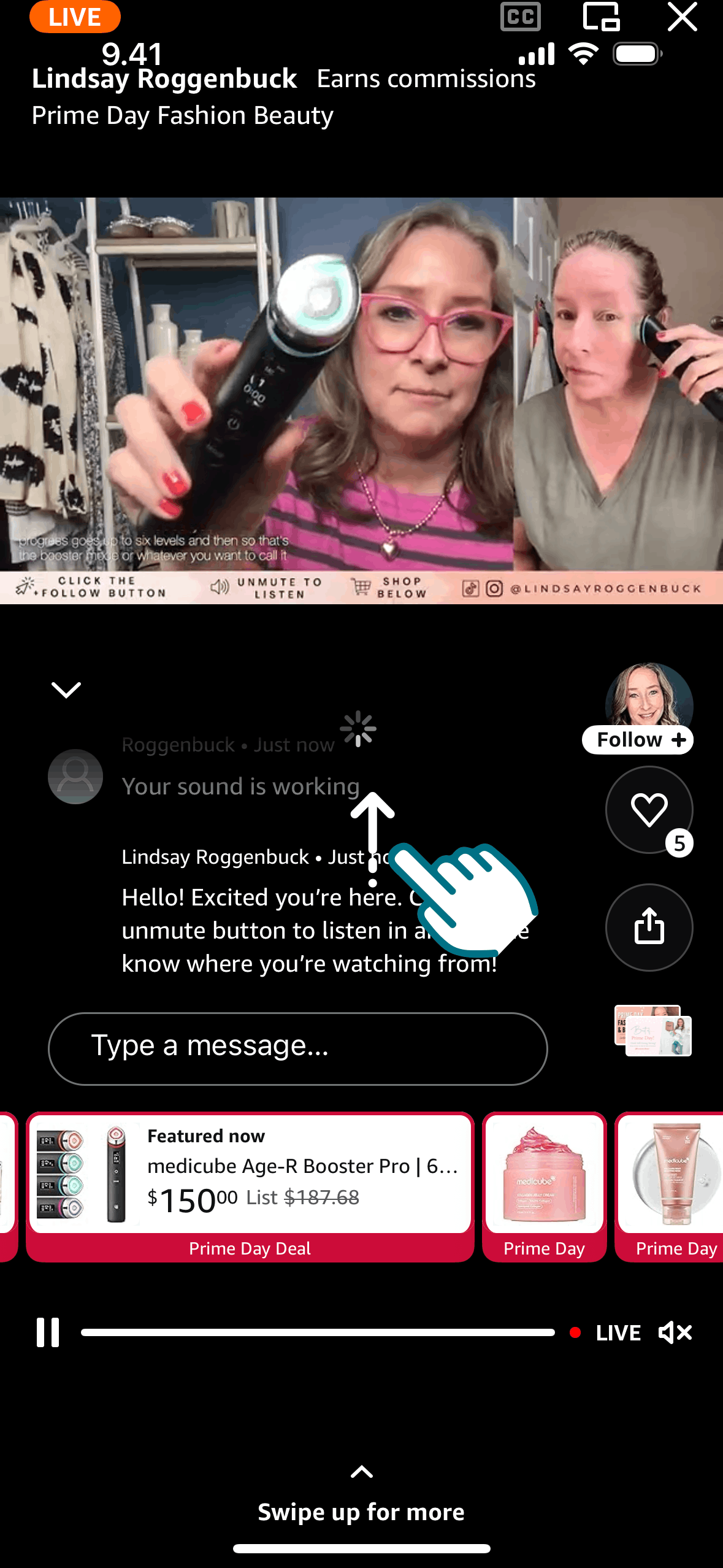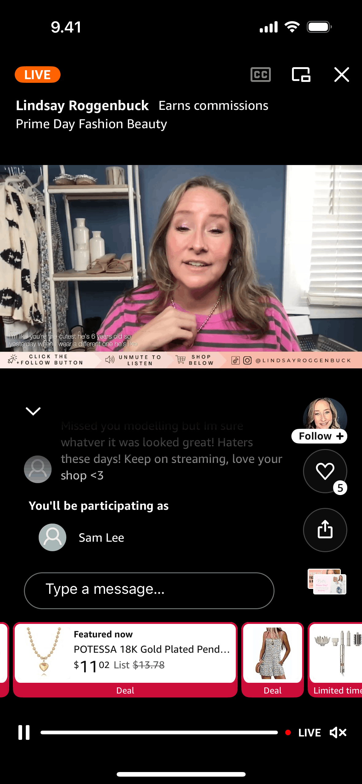 The user browses Amazon Live, watches a live video in full screen, and participates in the chat. They can also view product thumbnails.