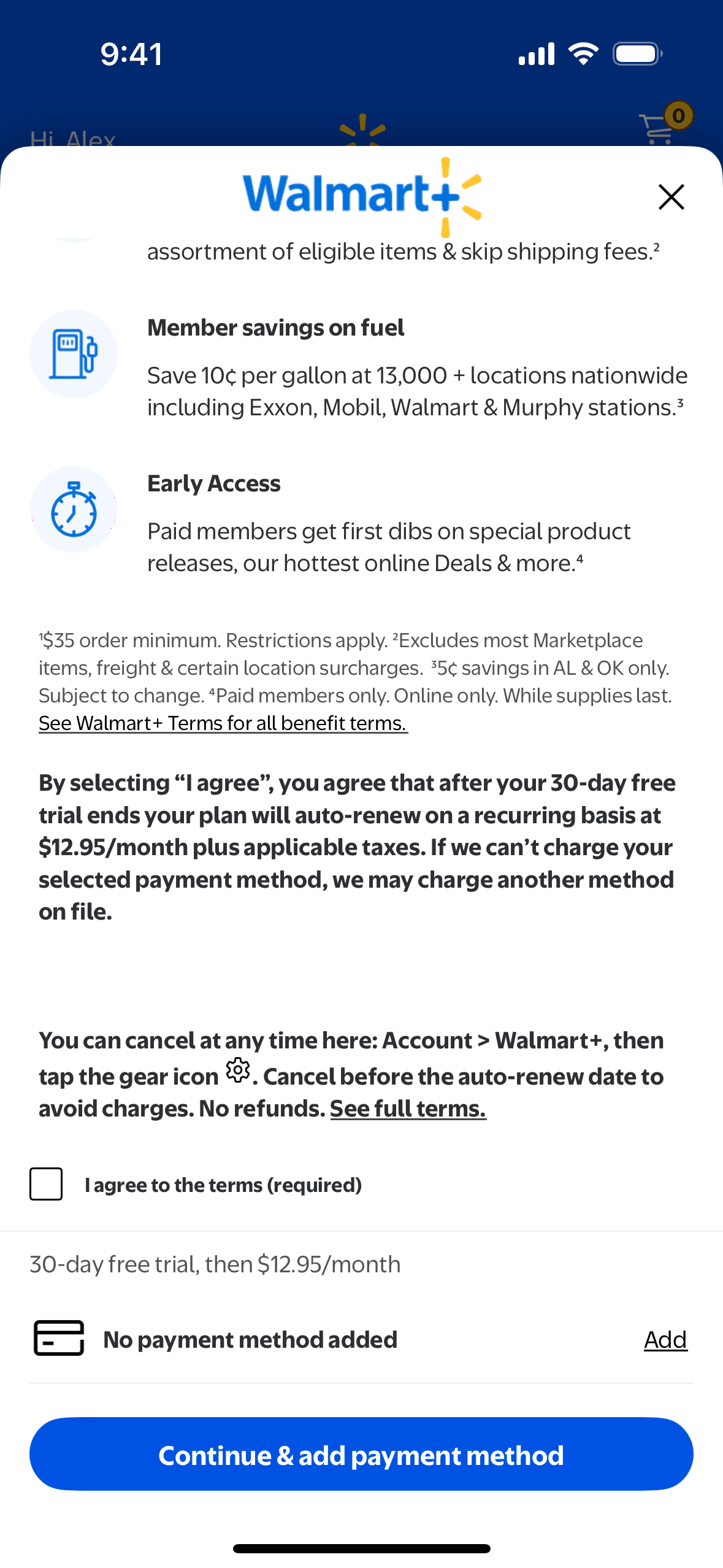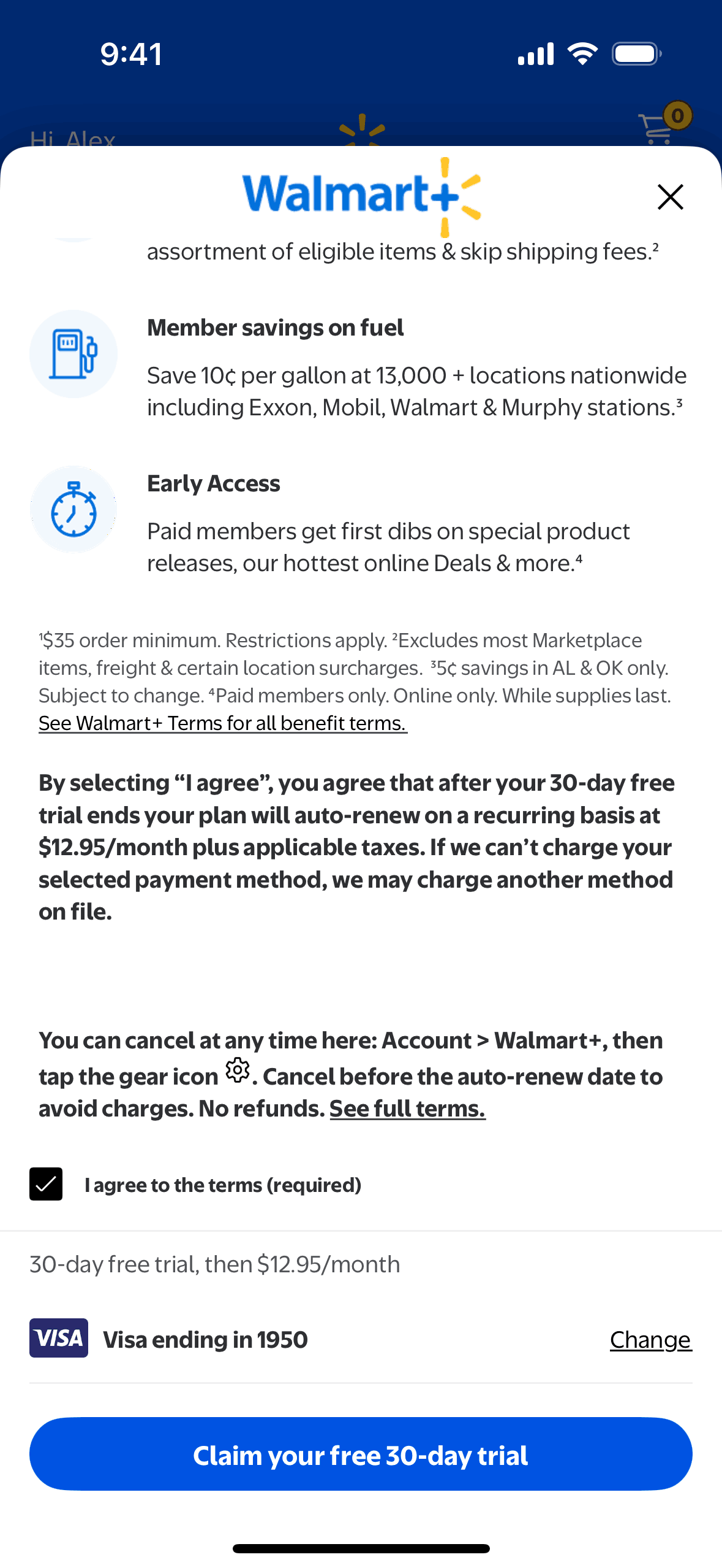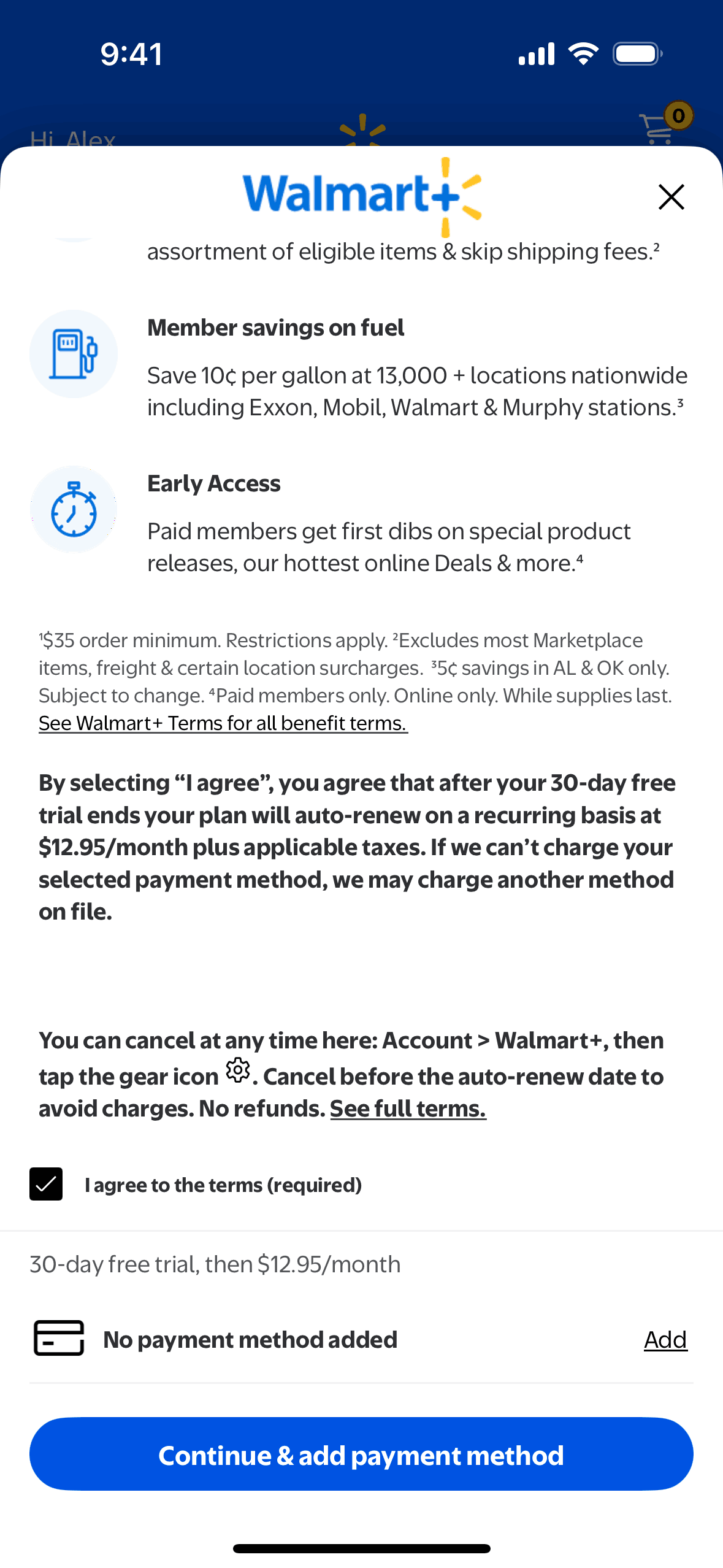 The user subscribes to Walmart+ by agreeing to the terms, adding a payment method, and confirming their subscription. They are then directed to the main Walmart shopping interface.