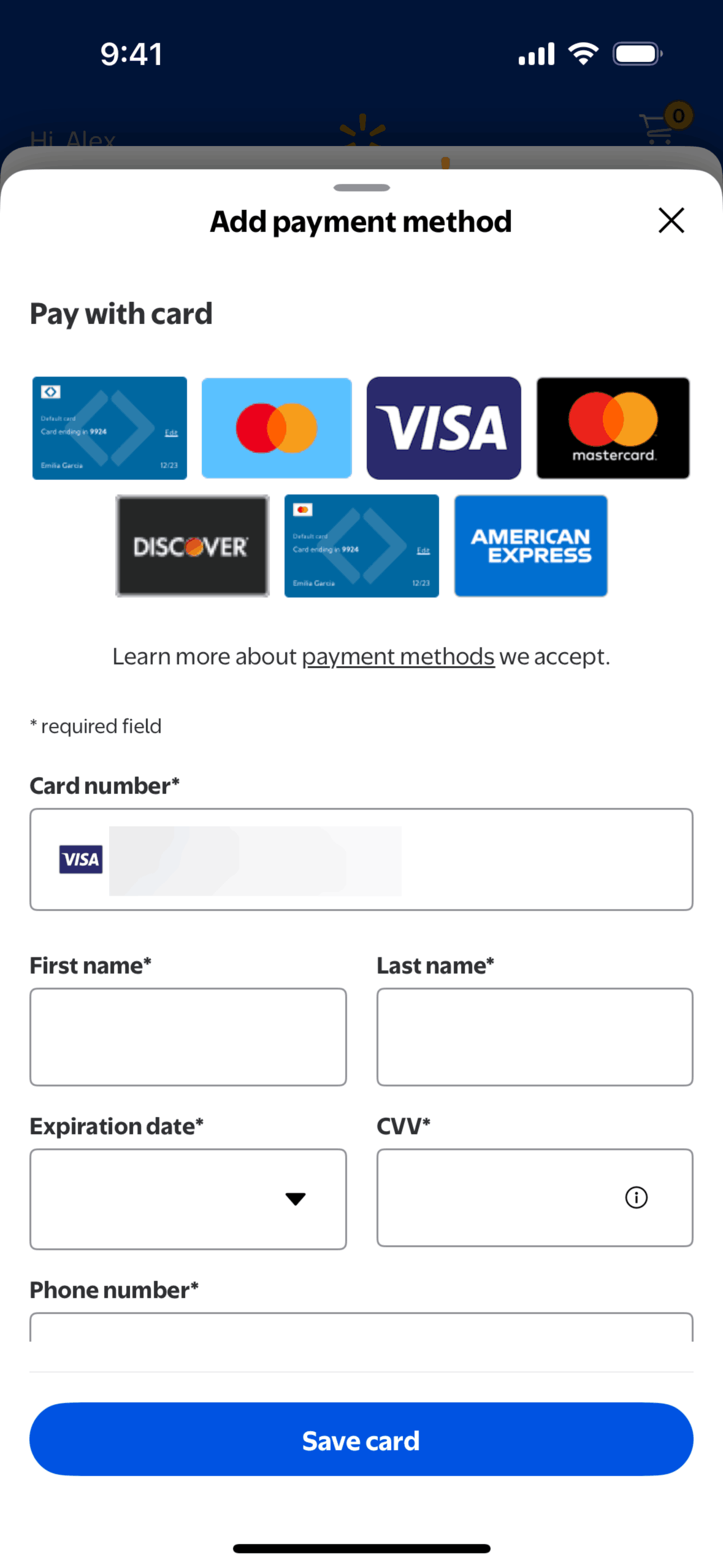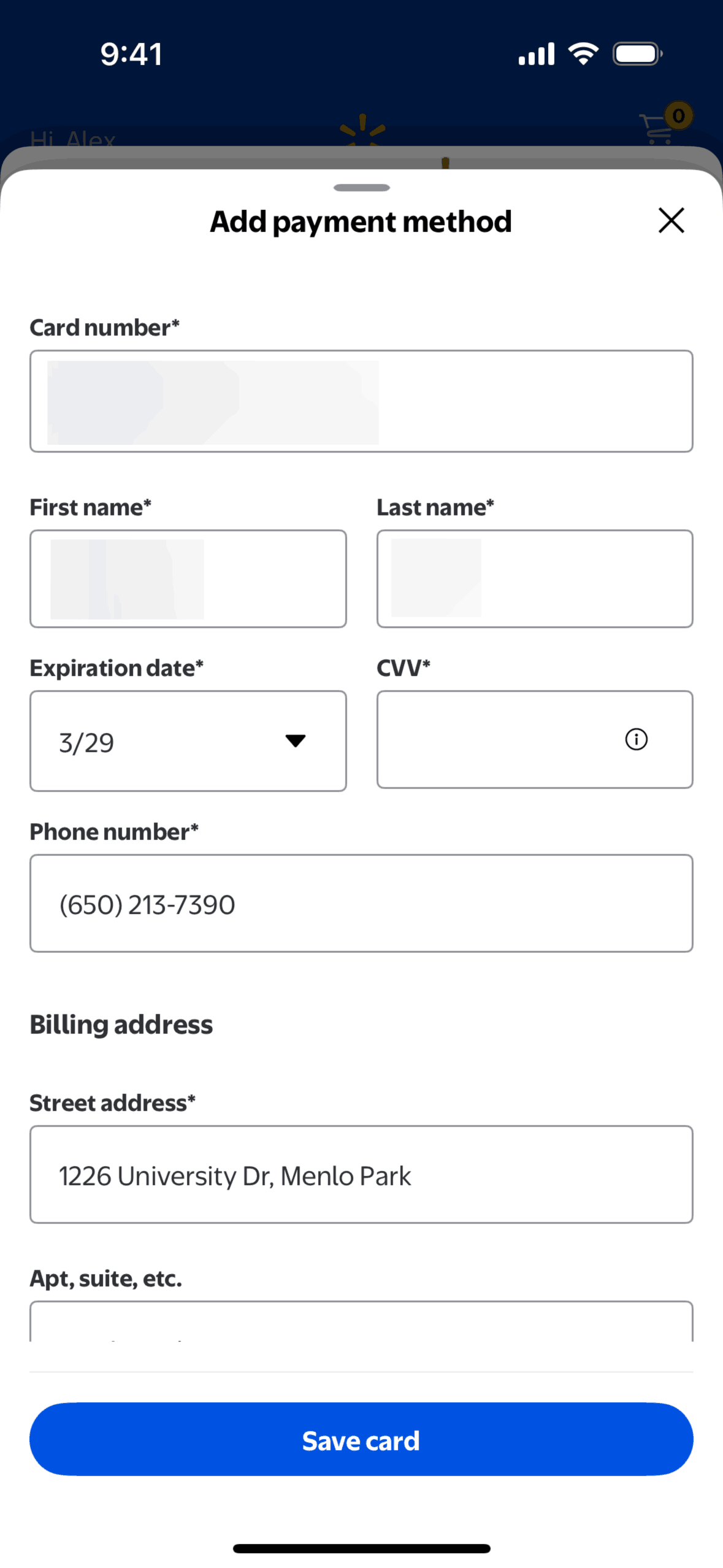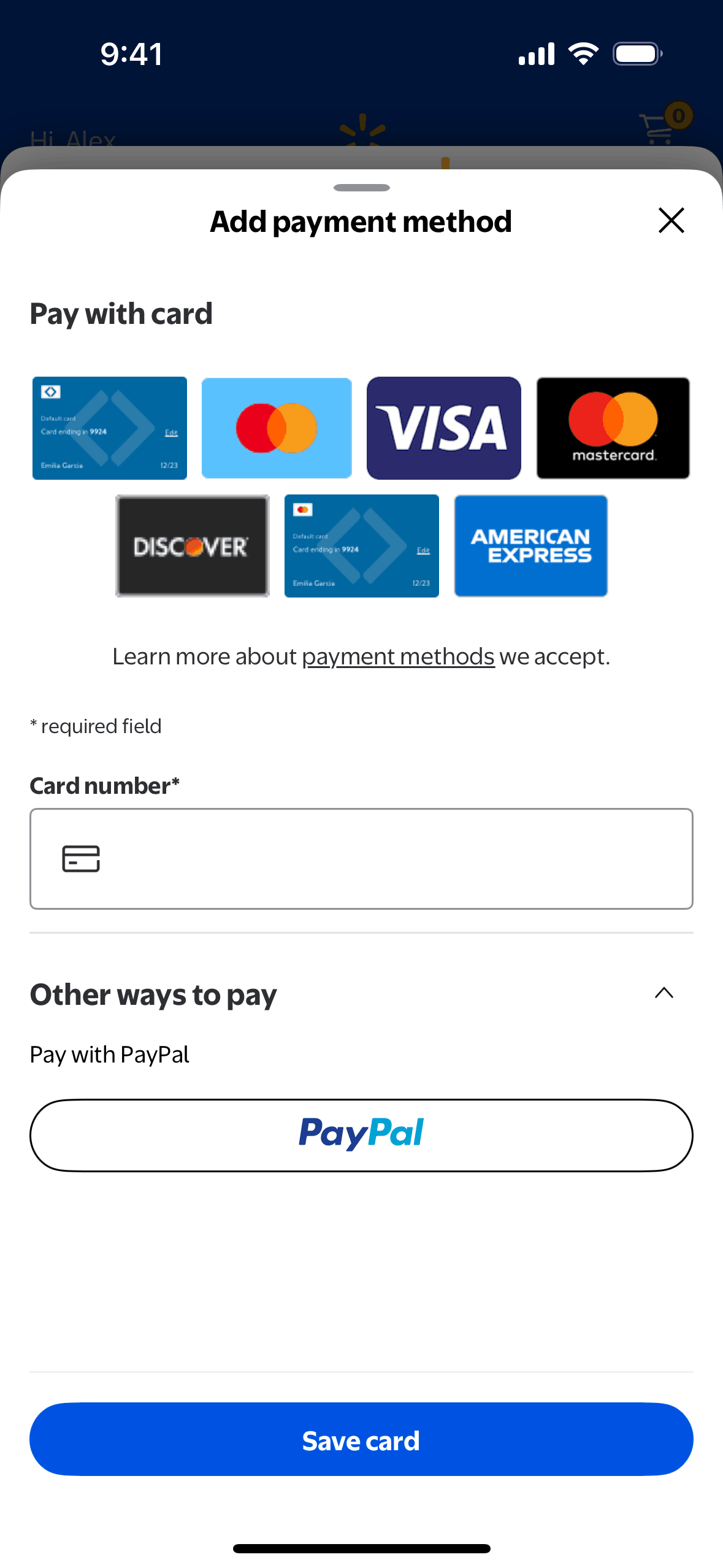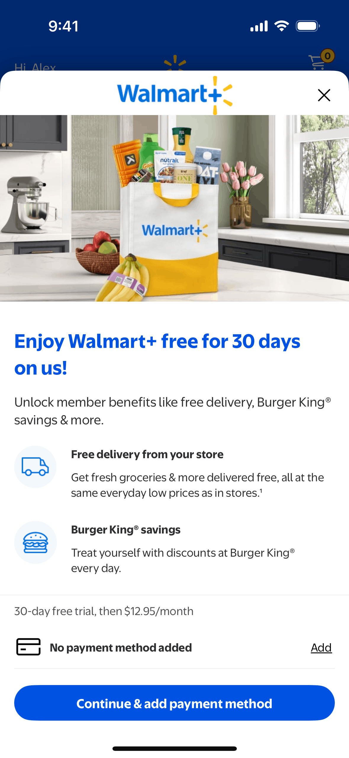 The user subscribes to Walmart+ by agreeing to the terms, adding a payment method, and confirming their subscription. They are then directed to the main Walmart shopping interface.