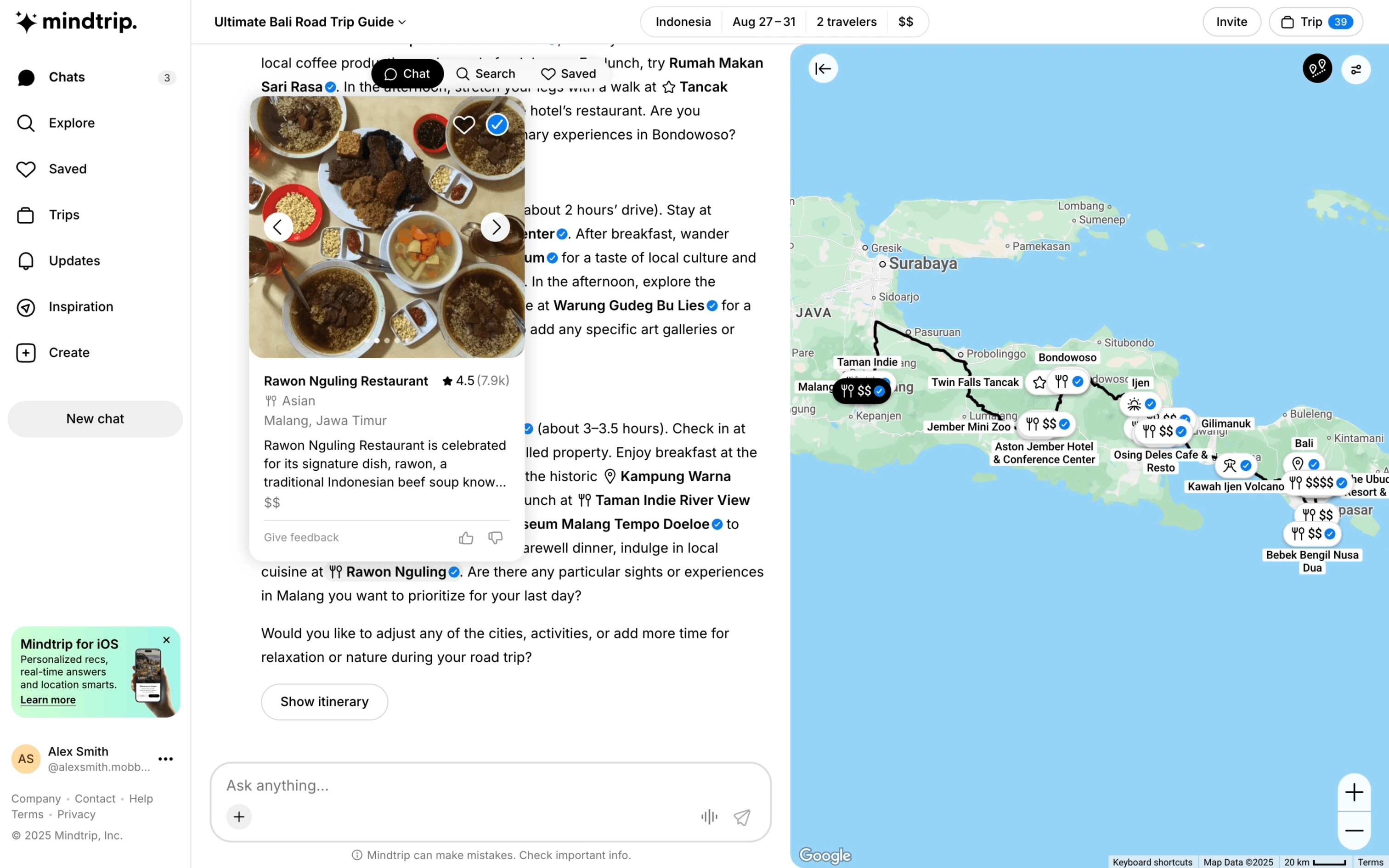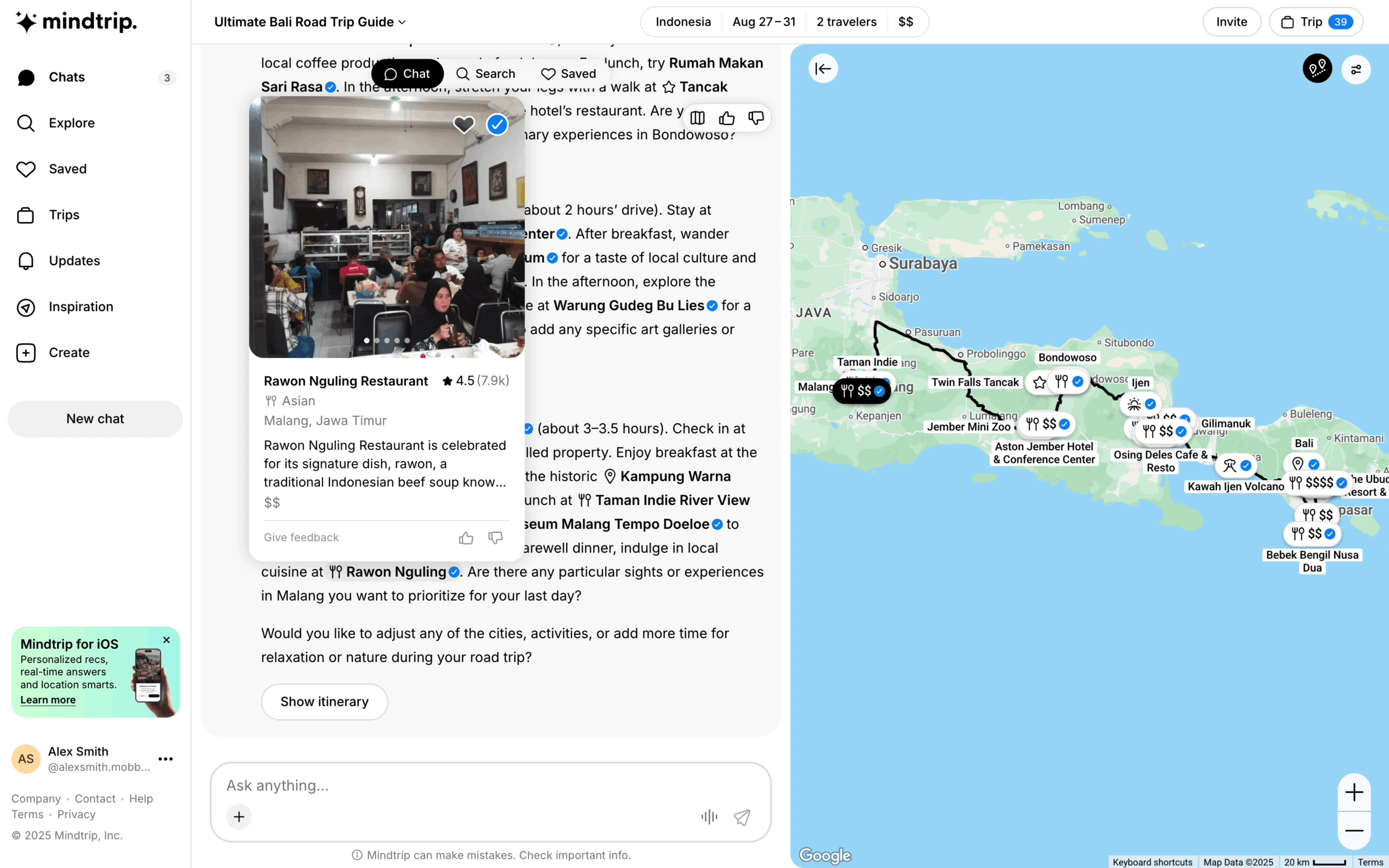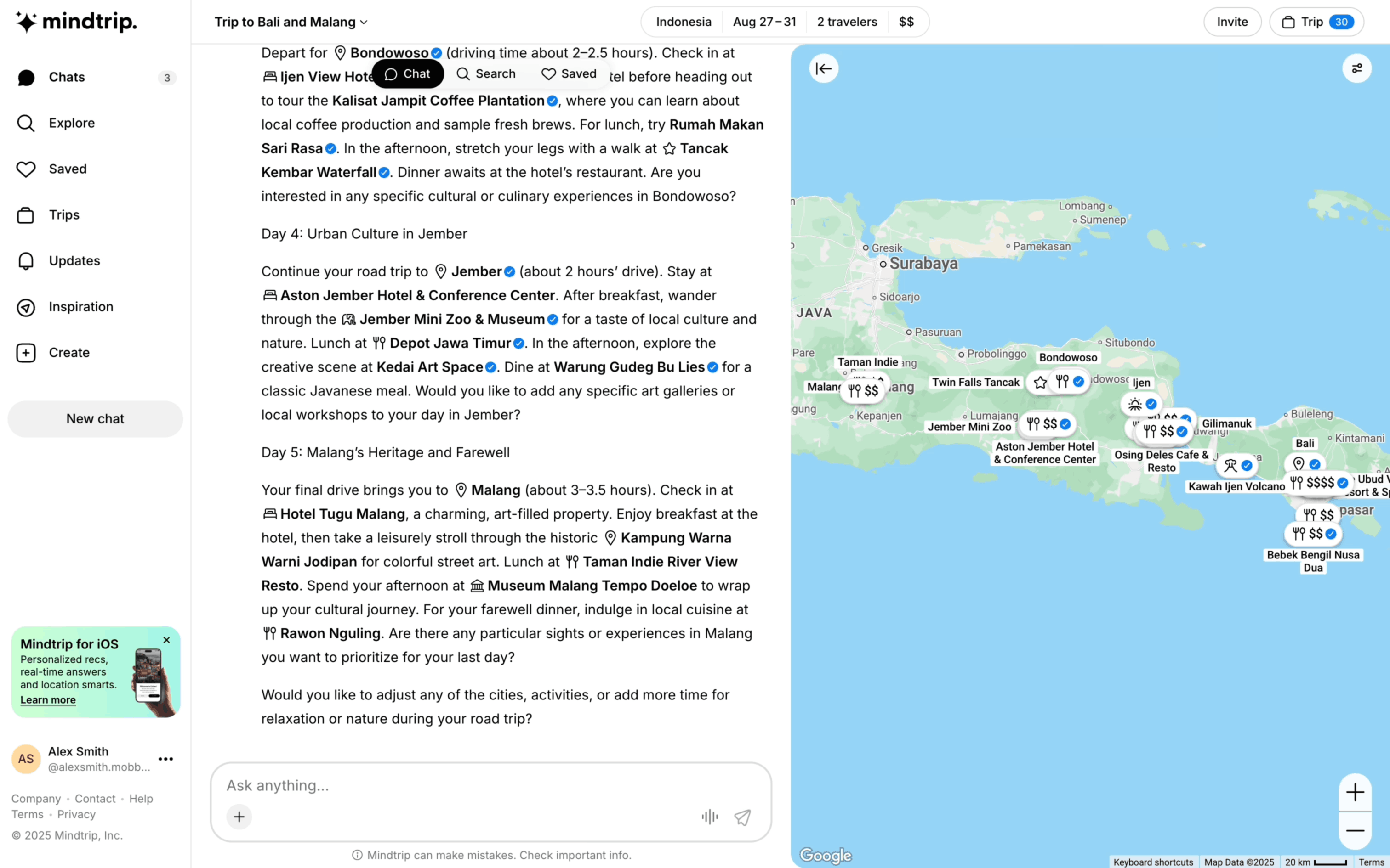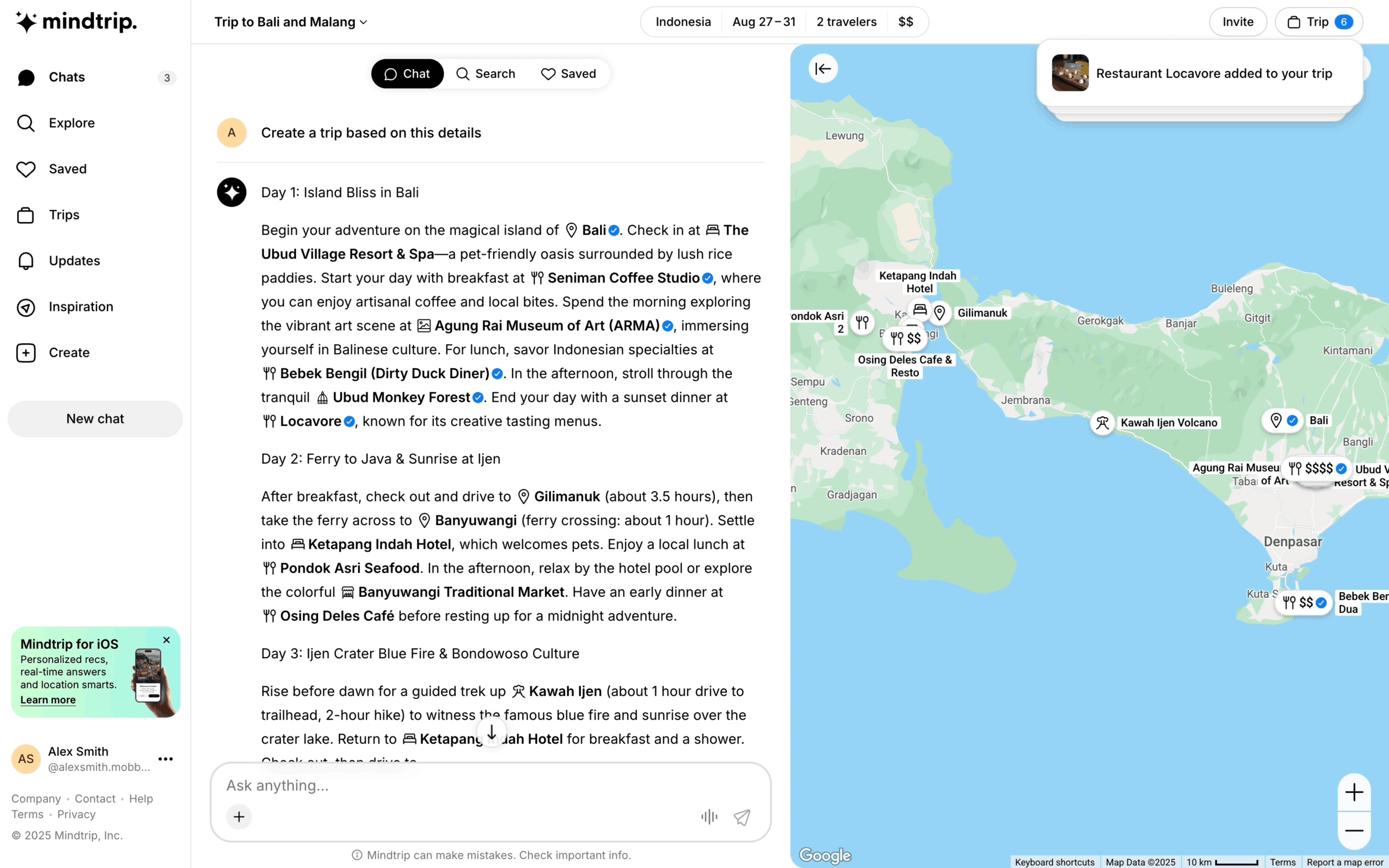The user plans a trip to Bali and Malang, viewing a detailed itinerary with map integration and restaurant details. The user then views the complete itinerary.