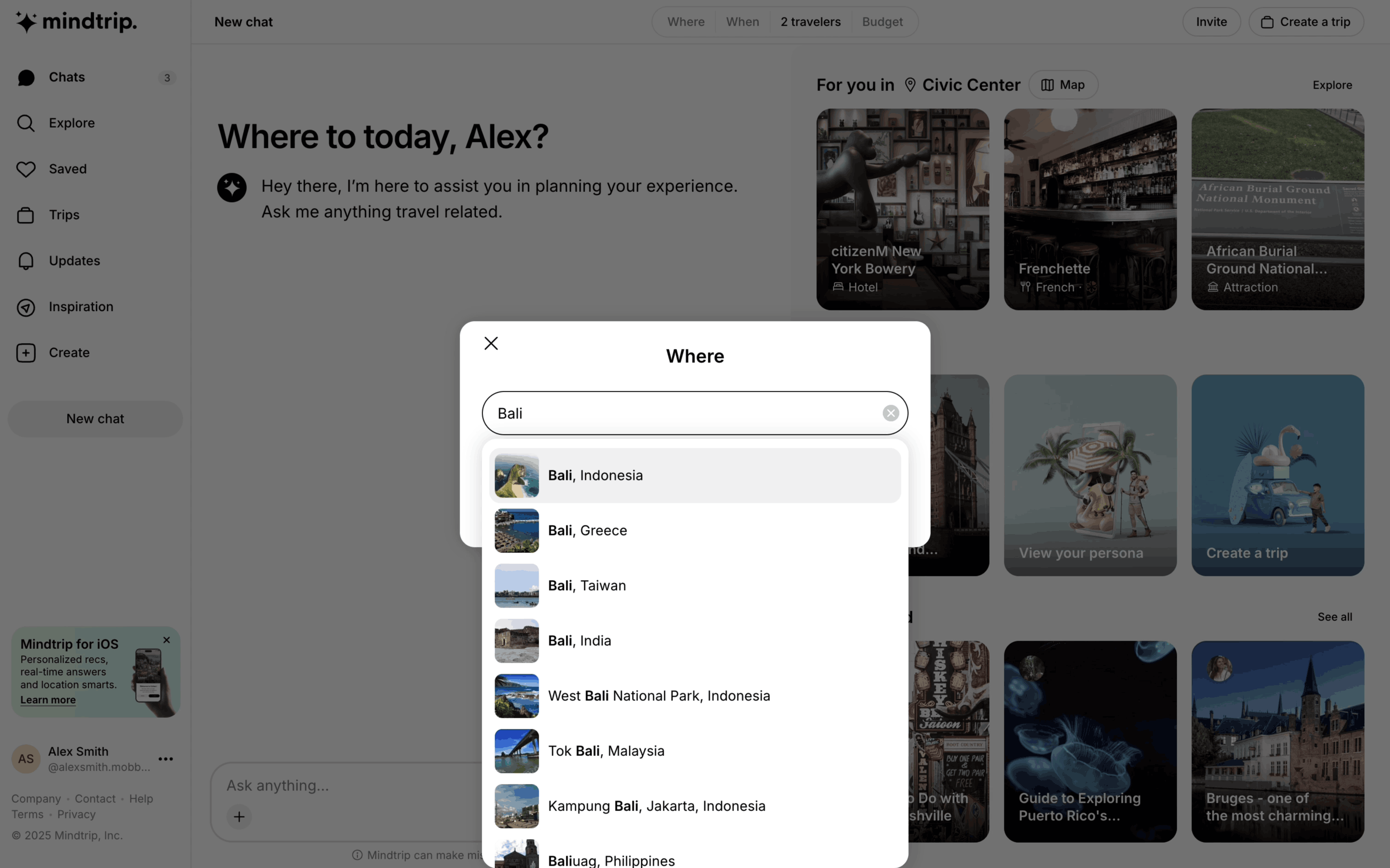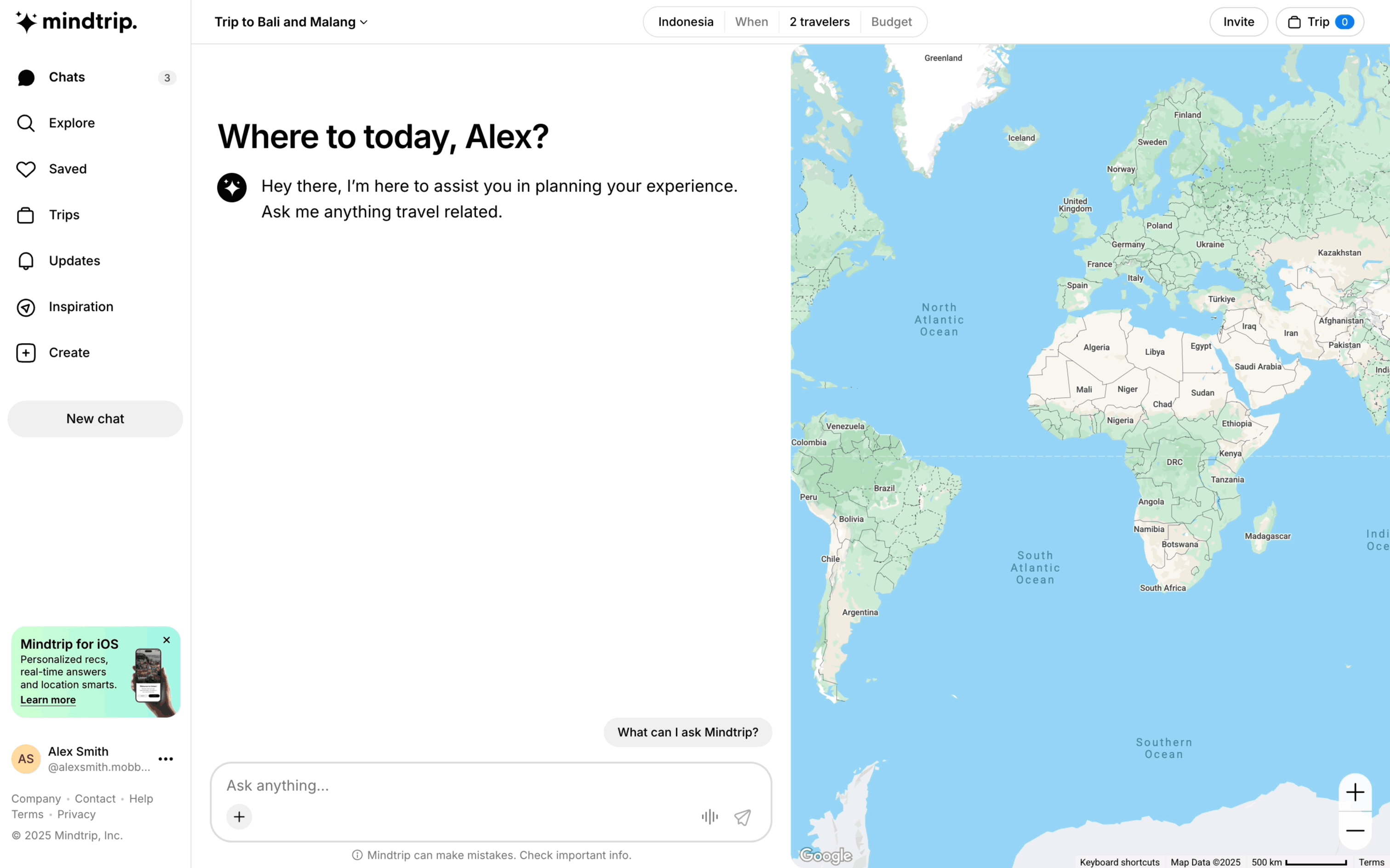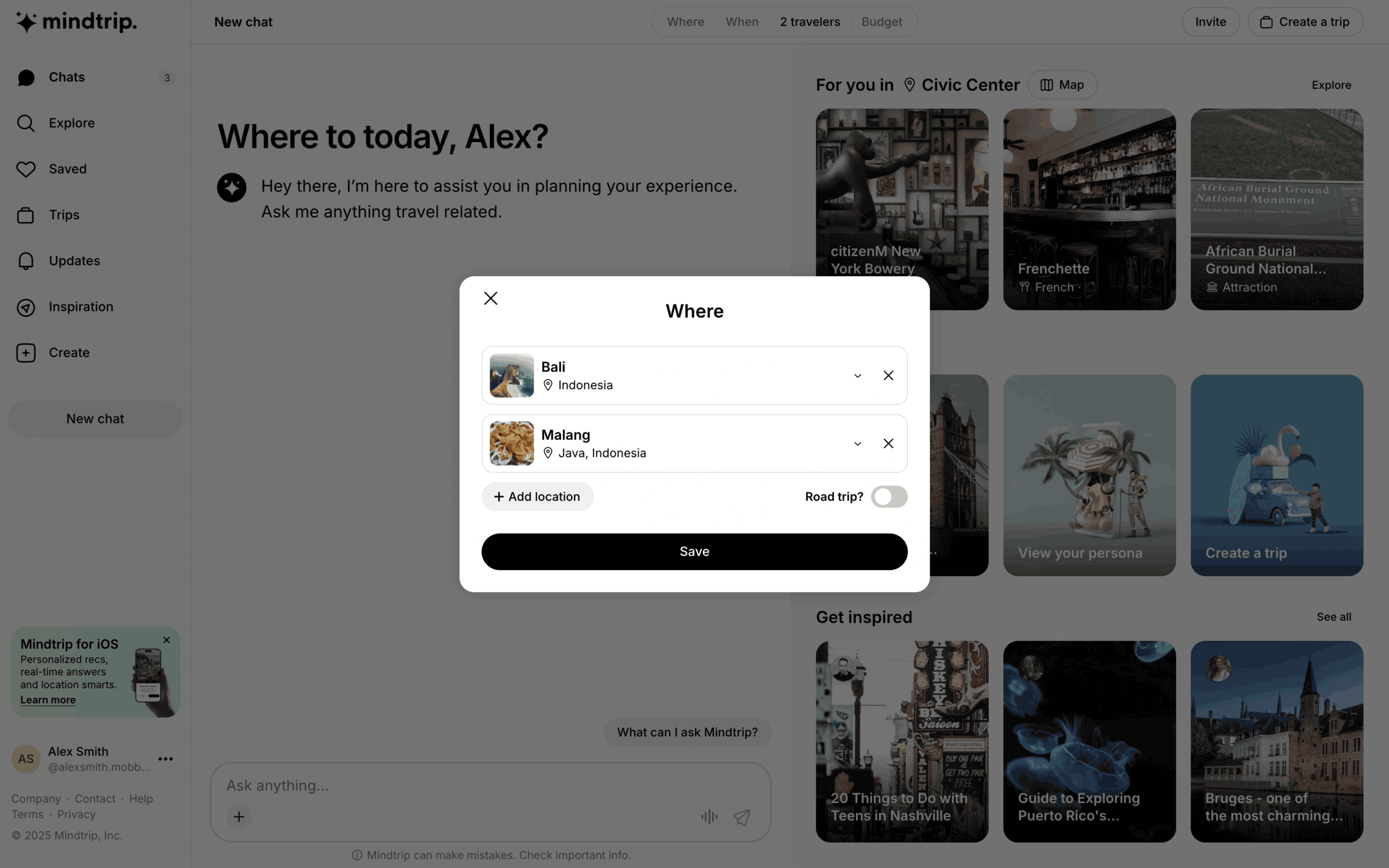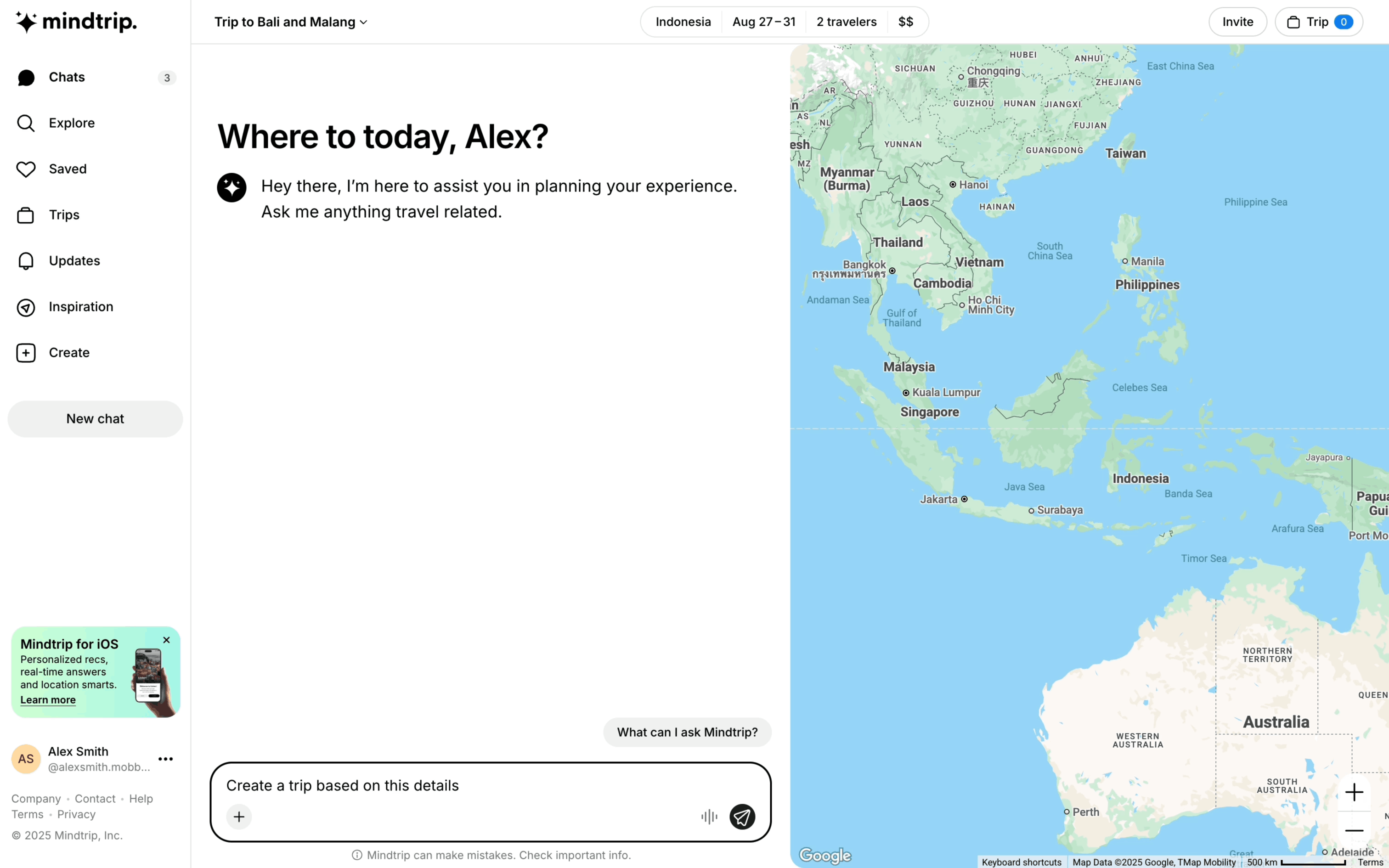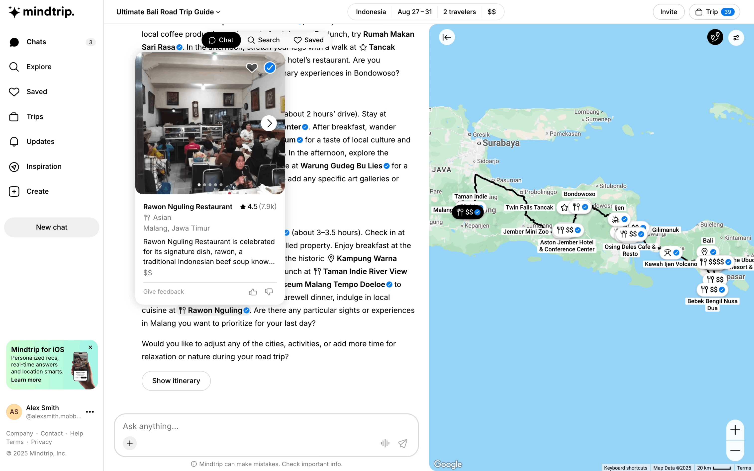 The user plans a trip to Bali and Malang, viewing a detailed itinerary with map integration and restaurant details. The user then views the complete itinerary.