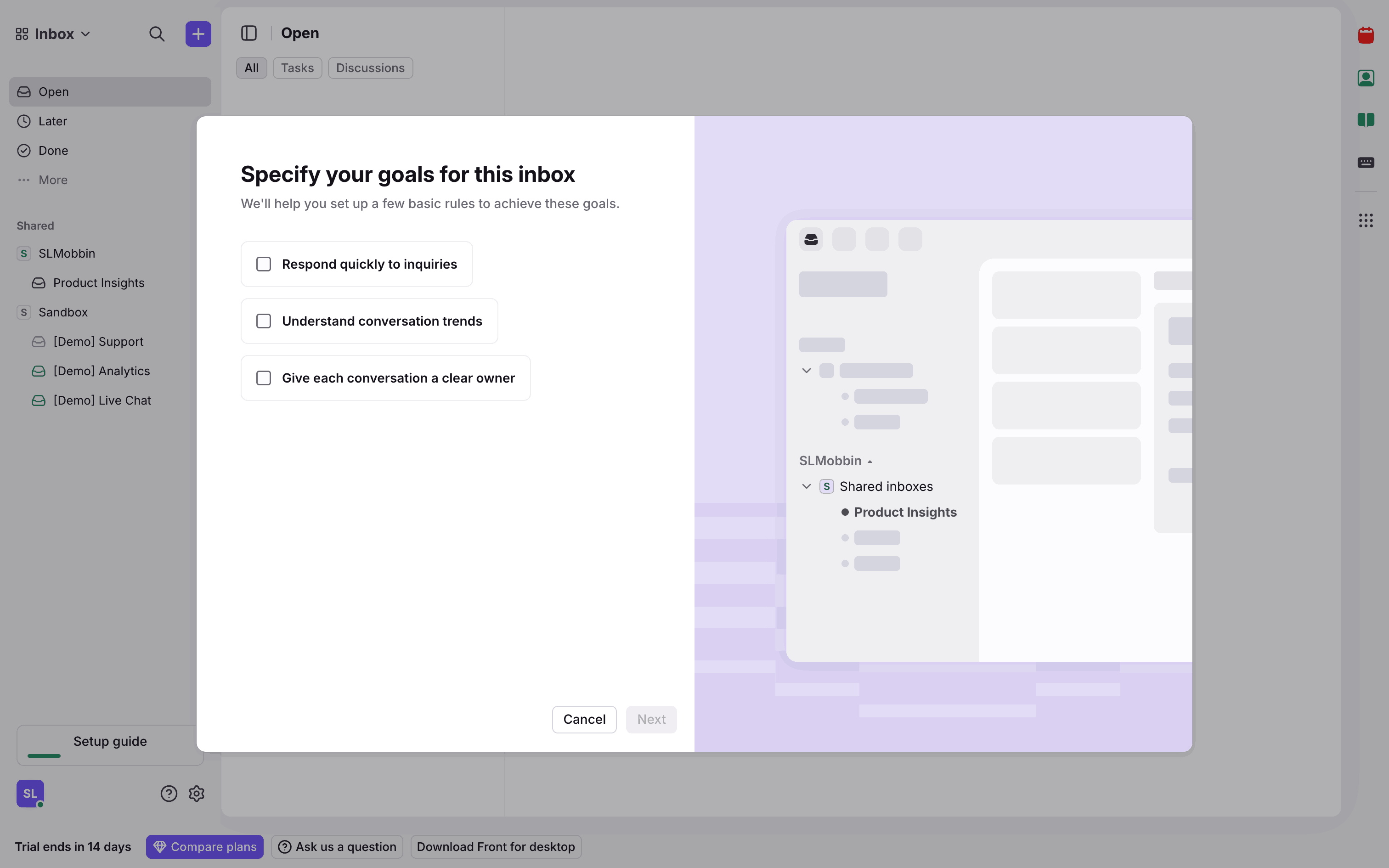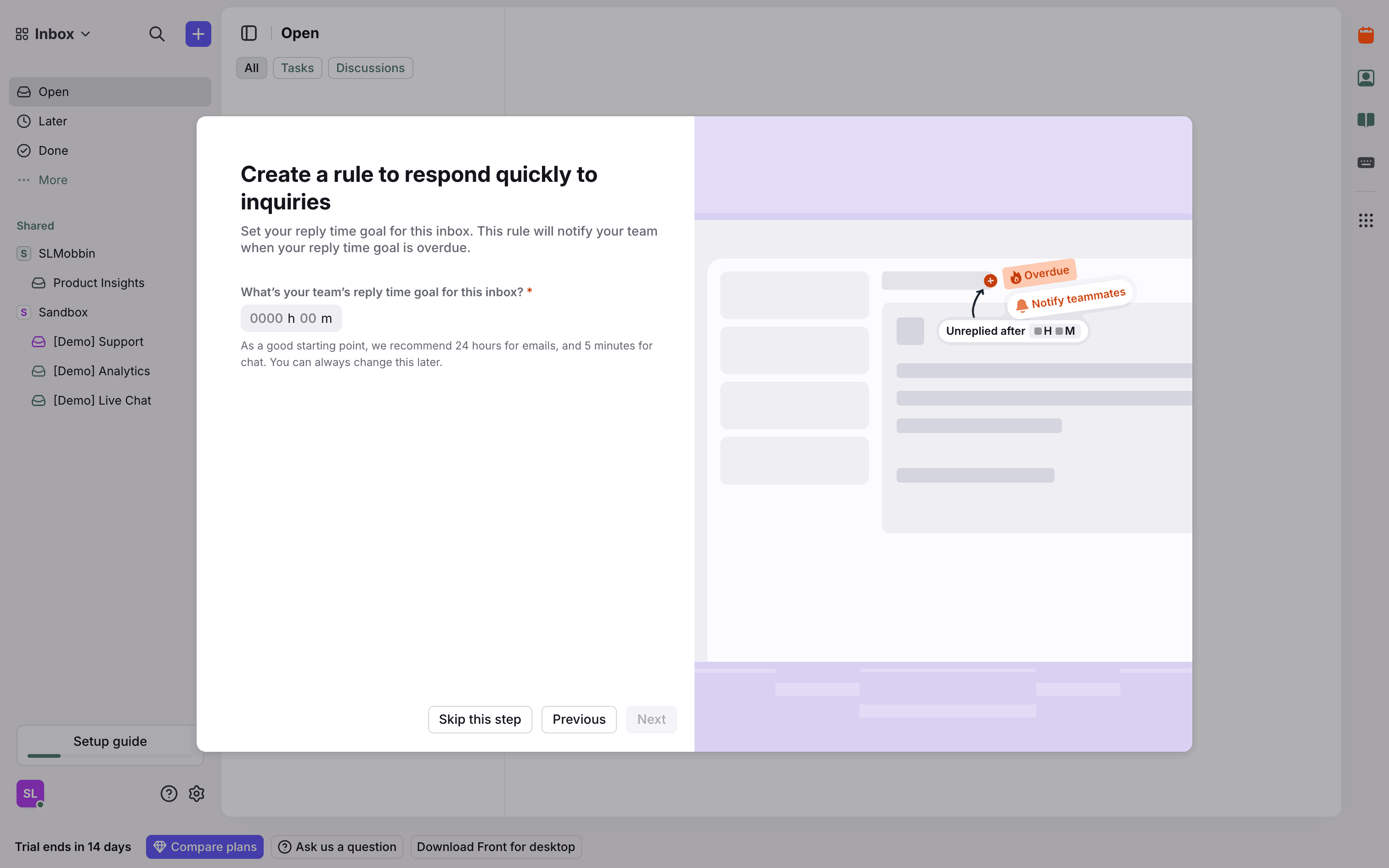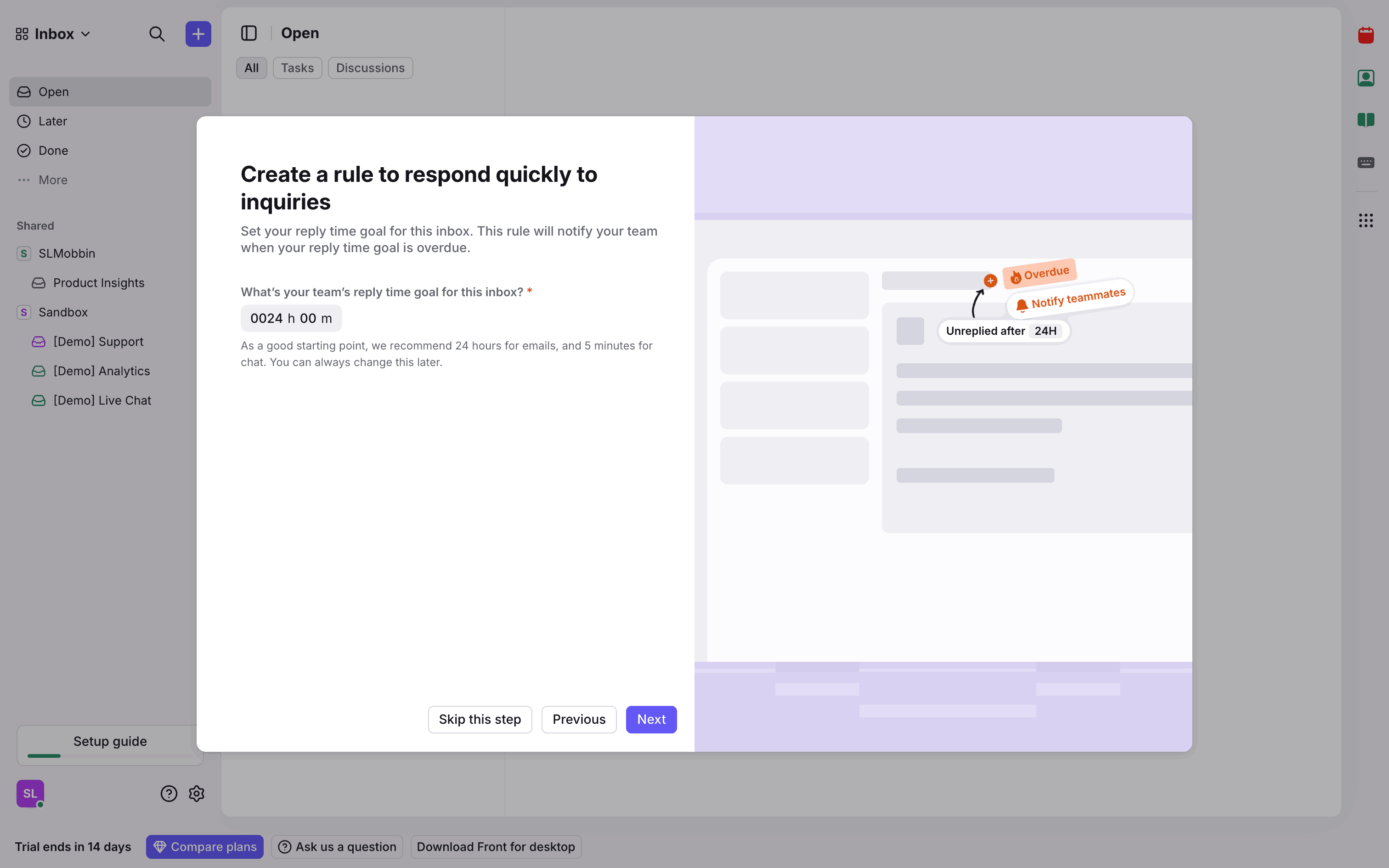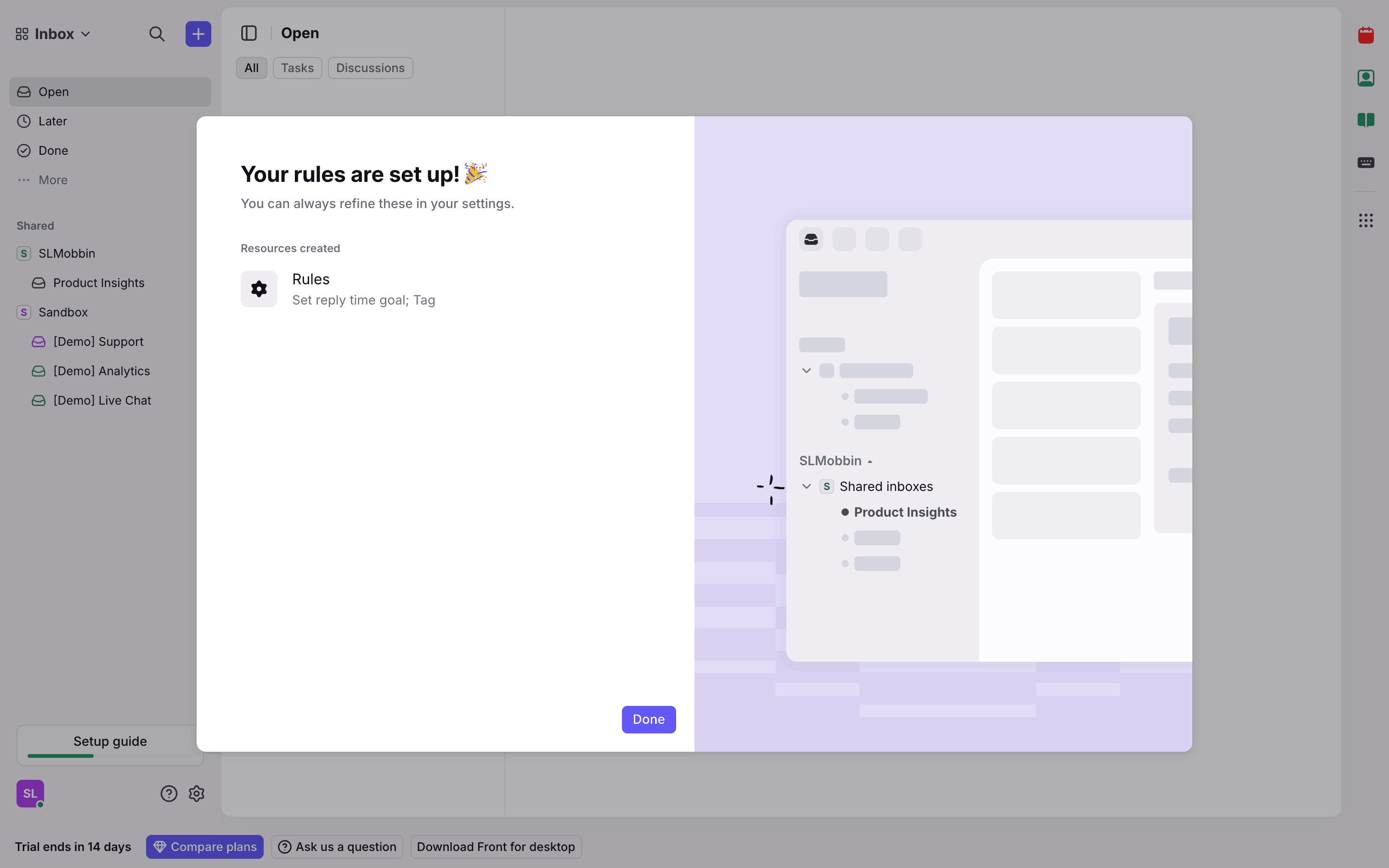 The user sets up inbox rules by specifying goals, setting a reply time, and selecting tags. The setup guide modal is updated to reflect the progress.