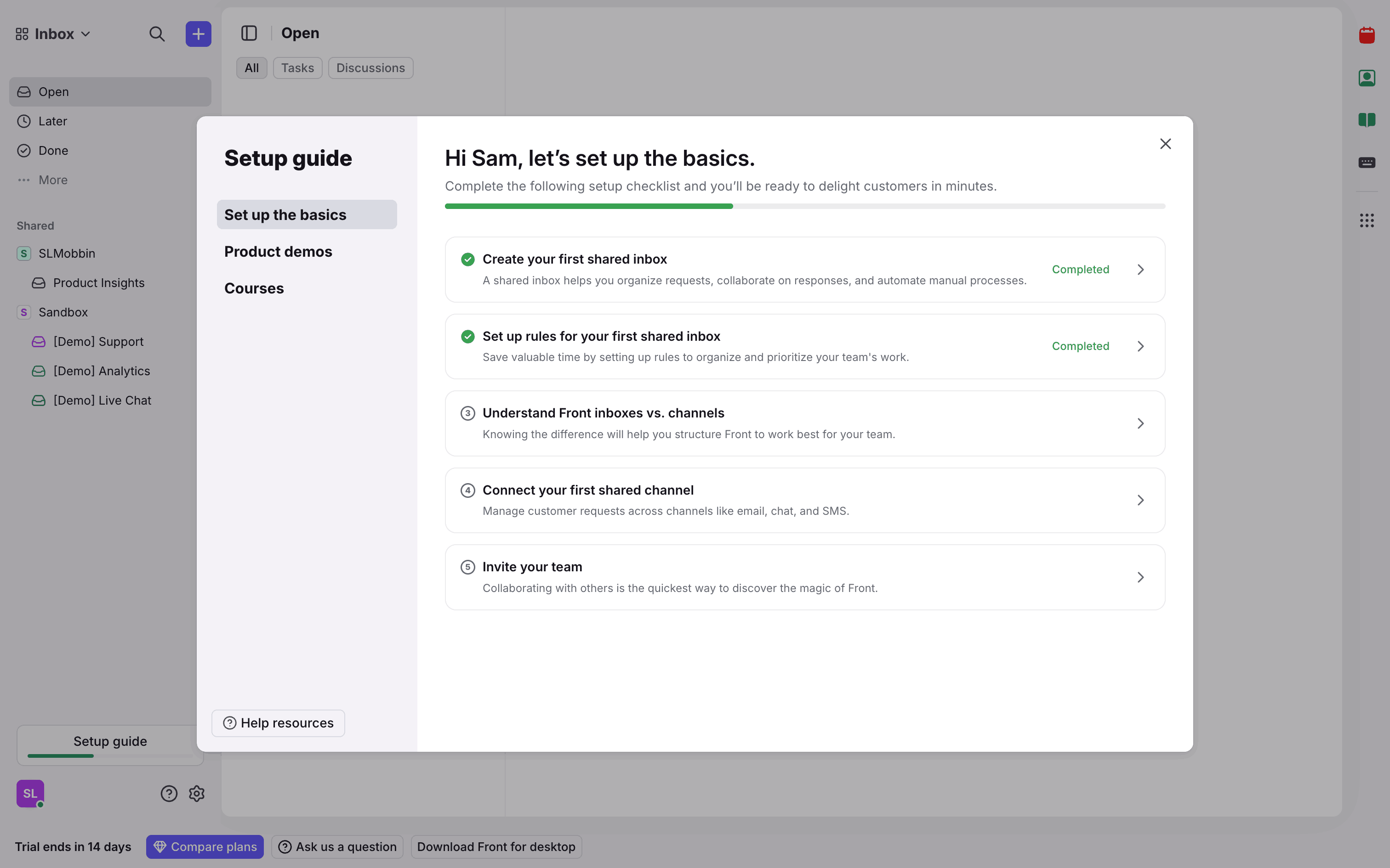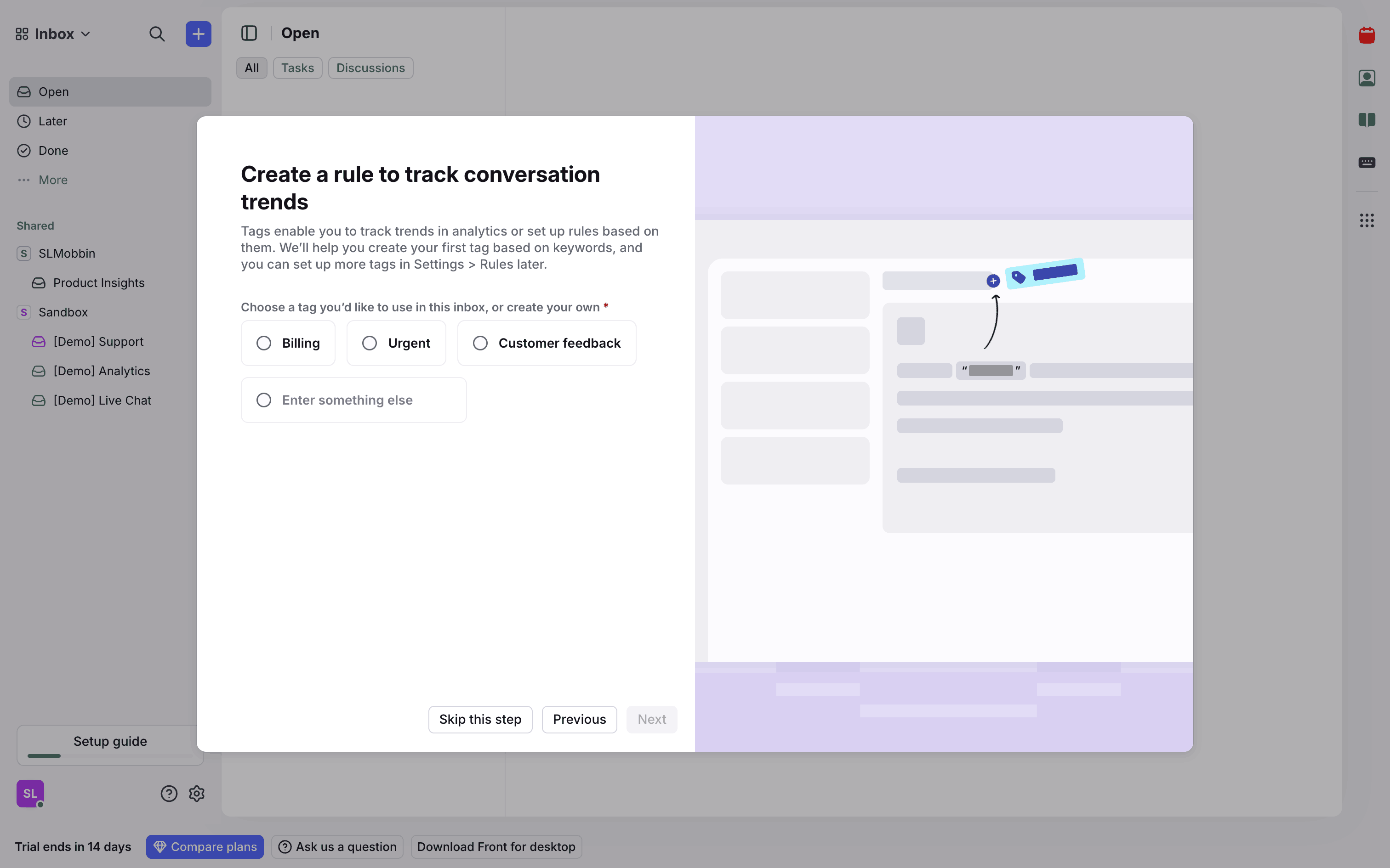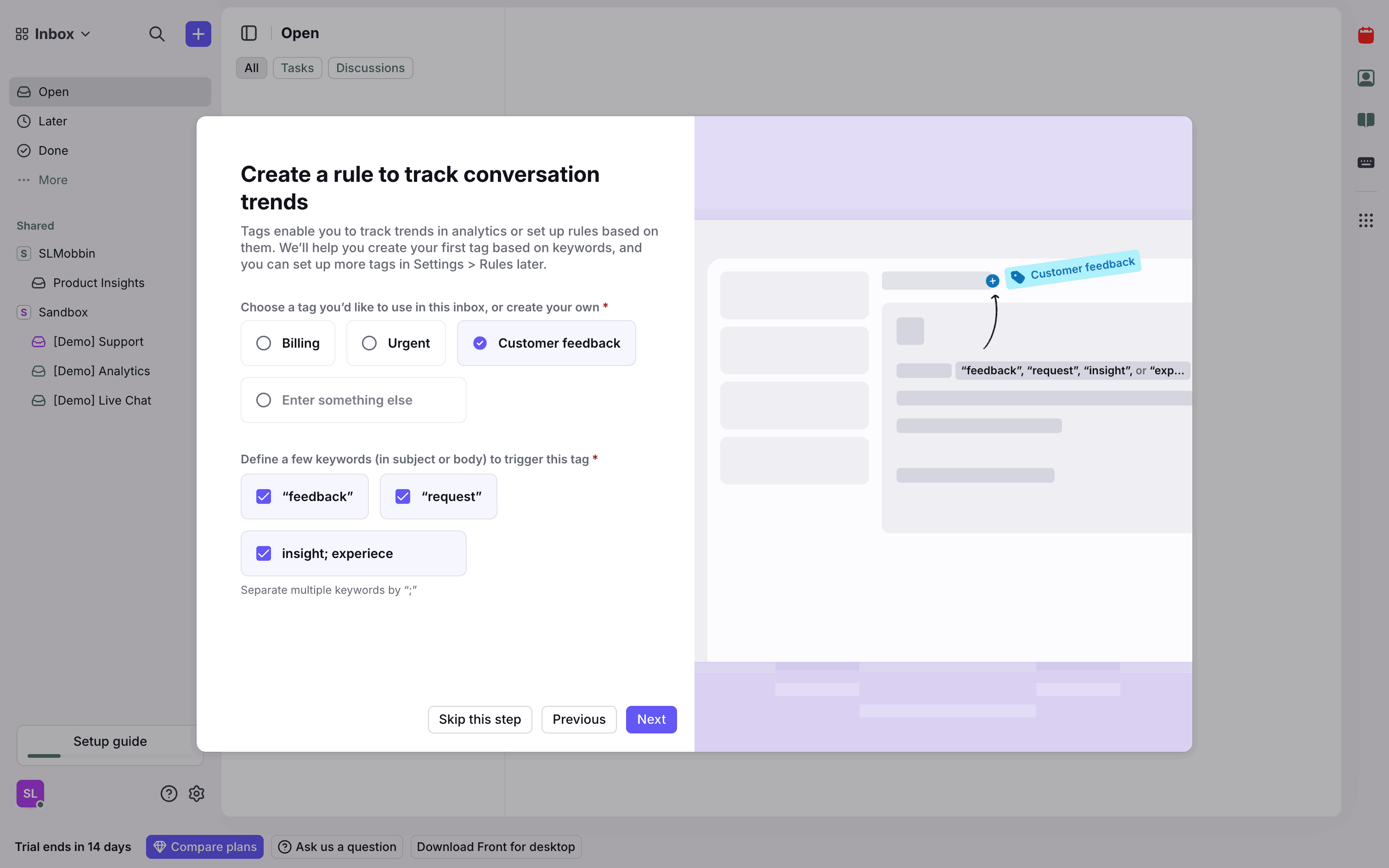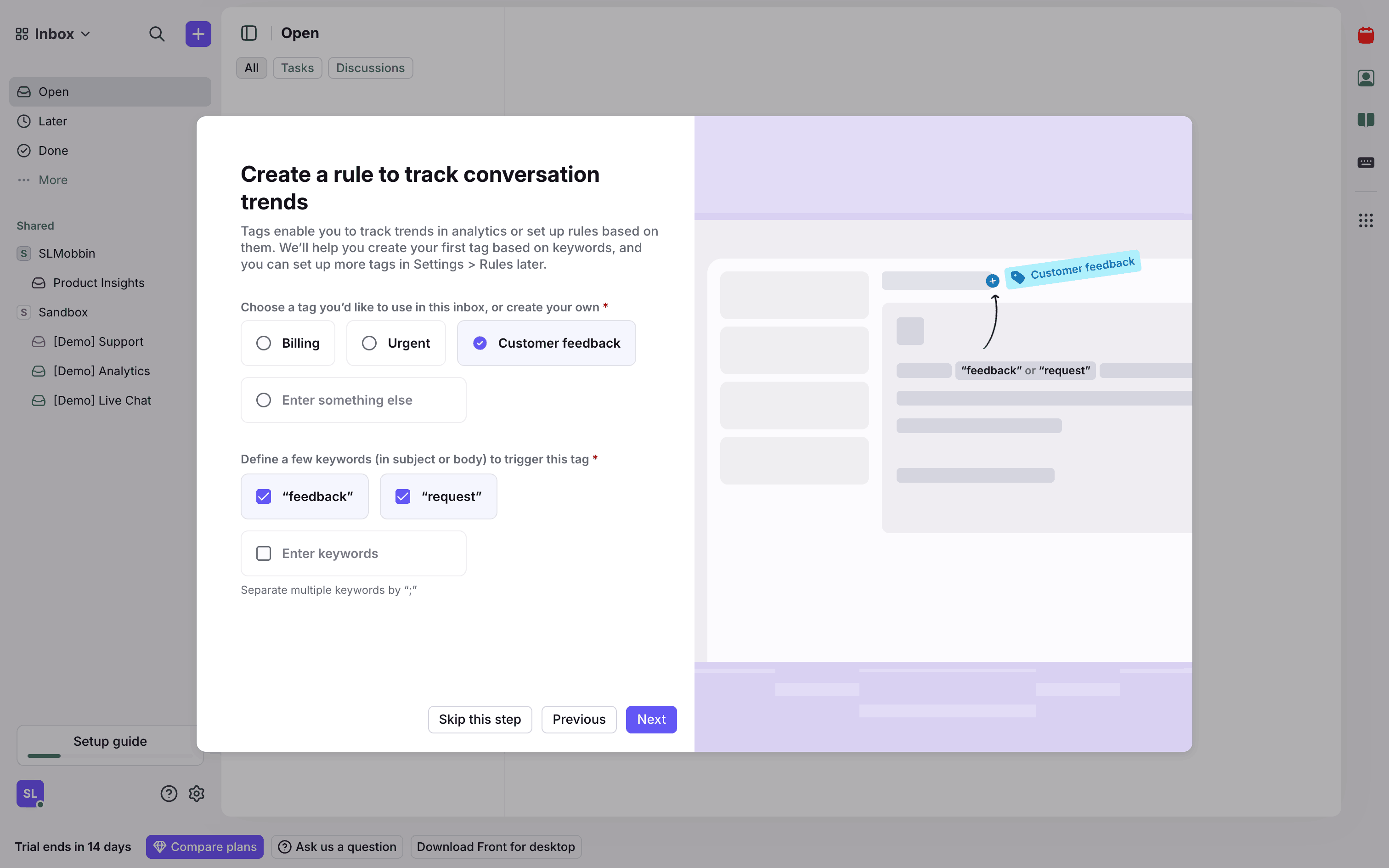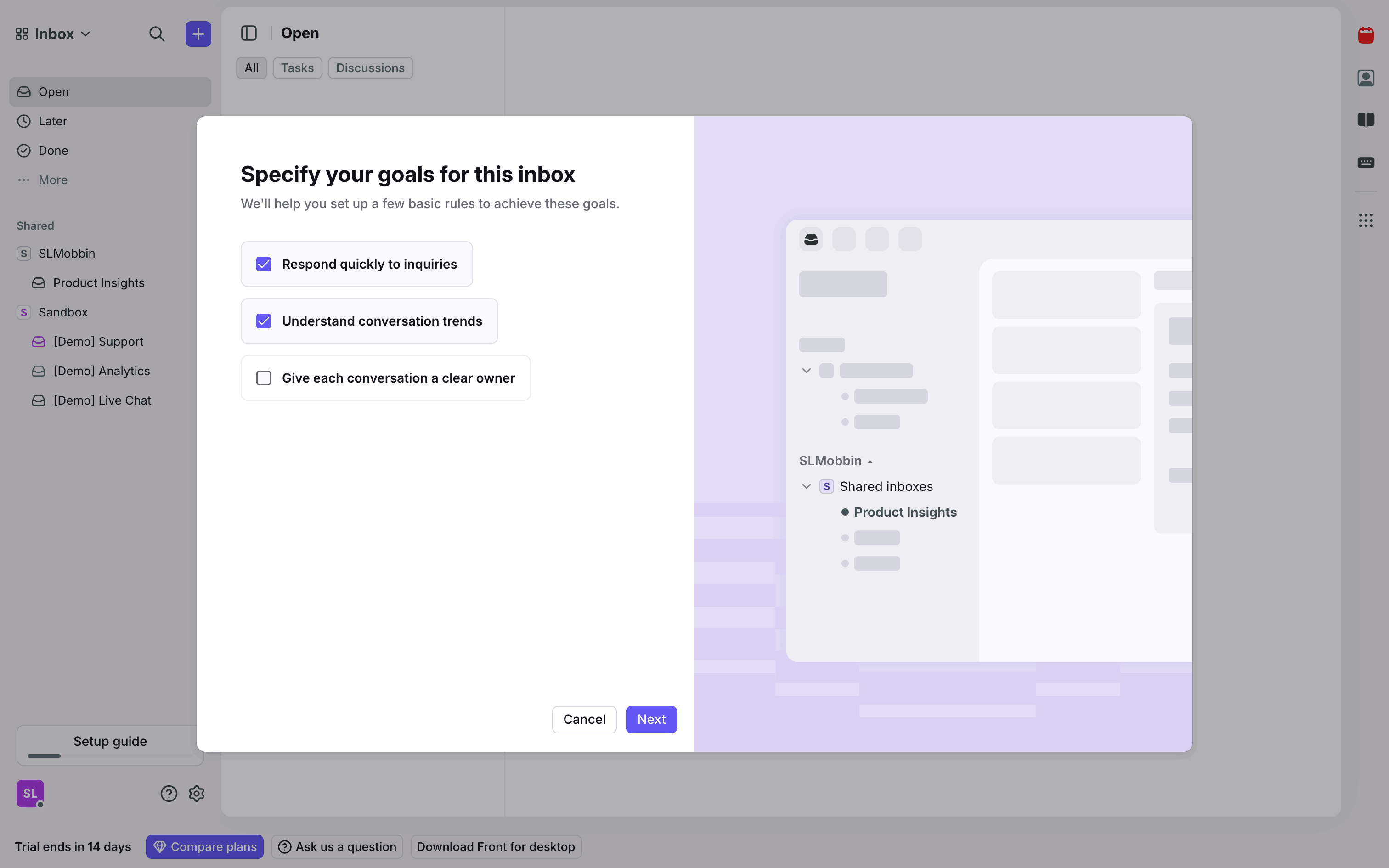 The user sets up inbox rules by specifying goals, setting a reply time, and selecting tags. The setup guide modal is updated to reflect the progress.