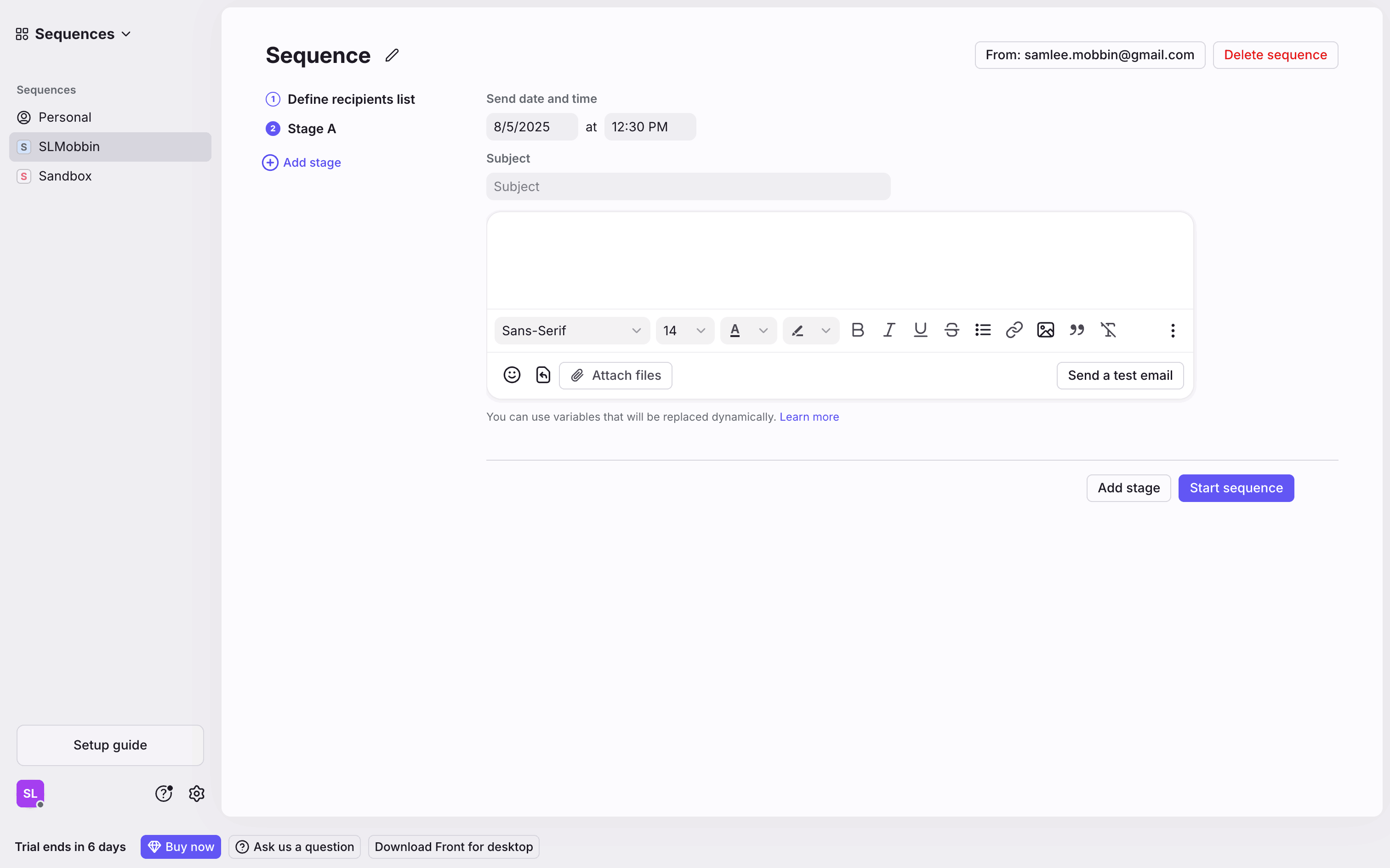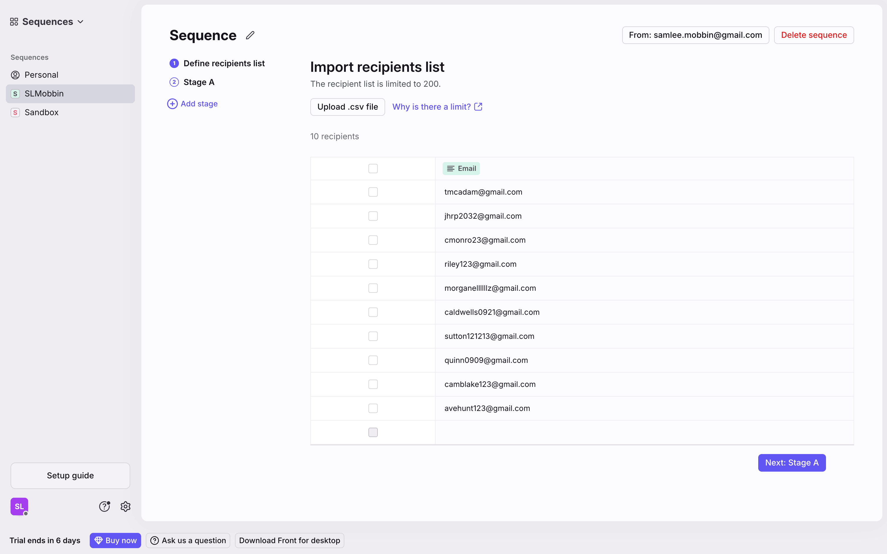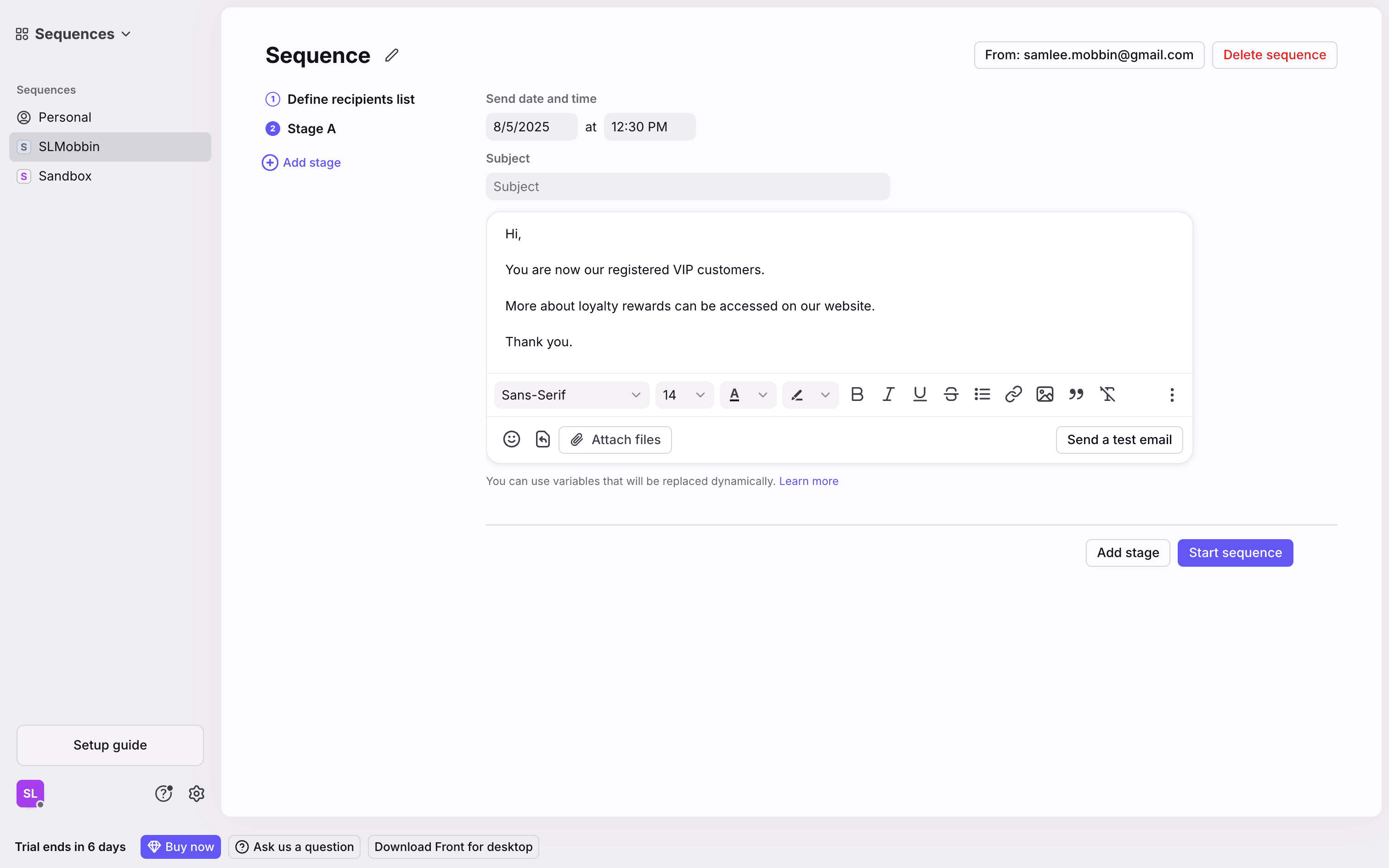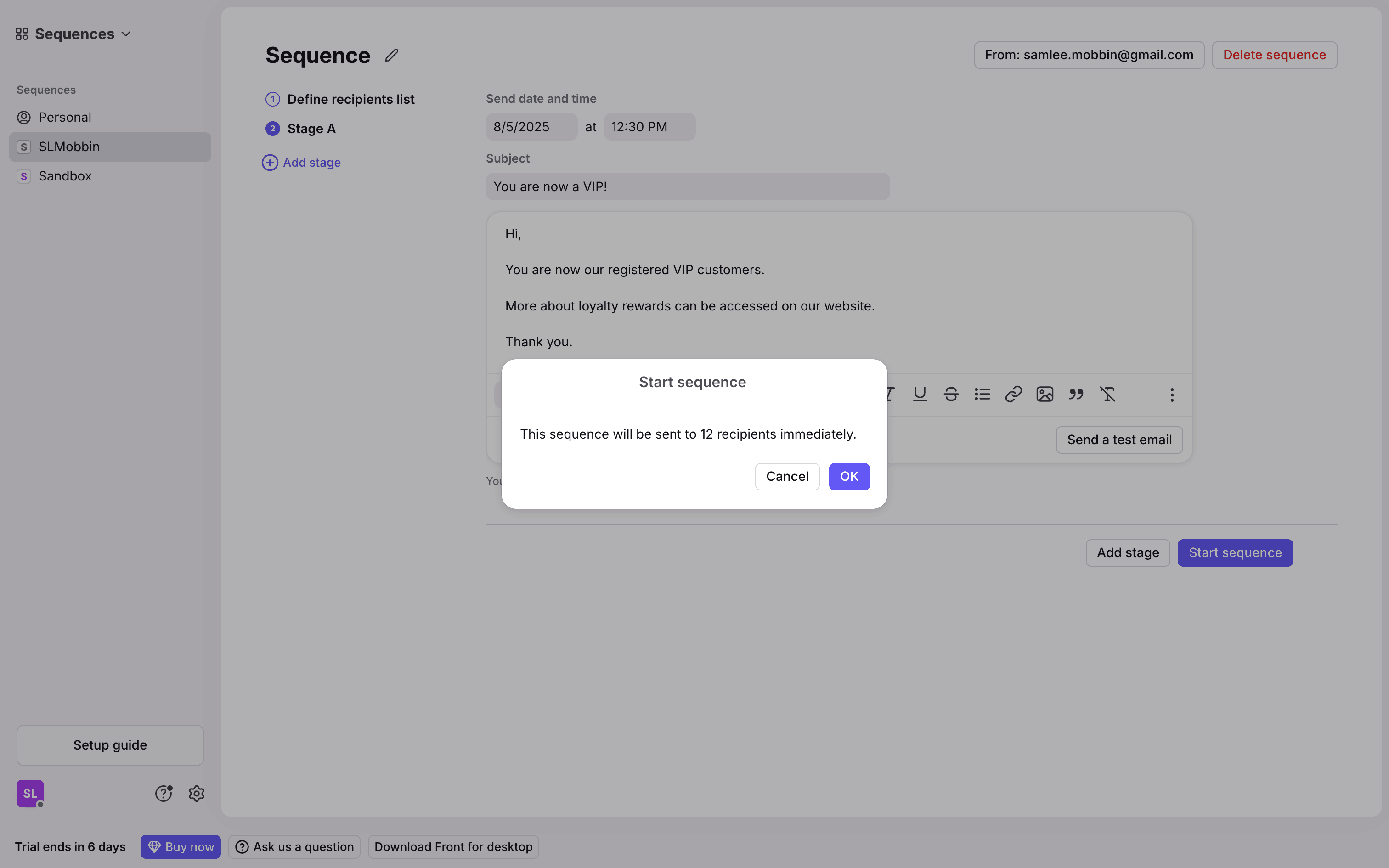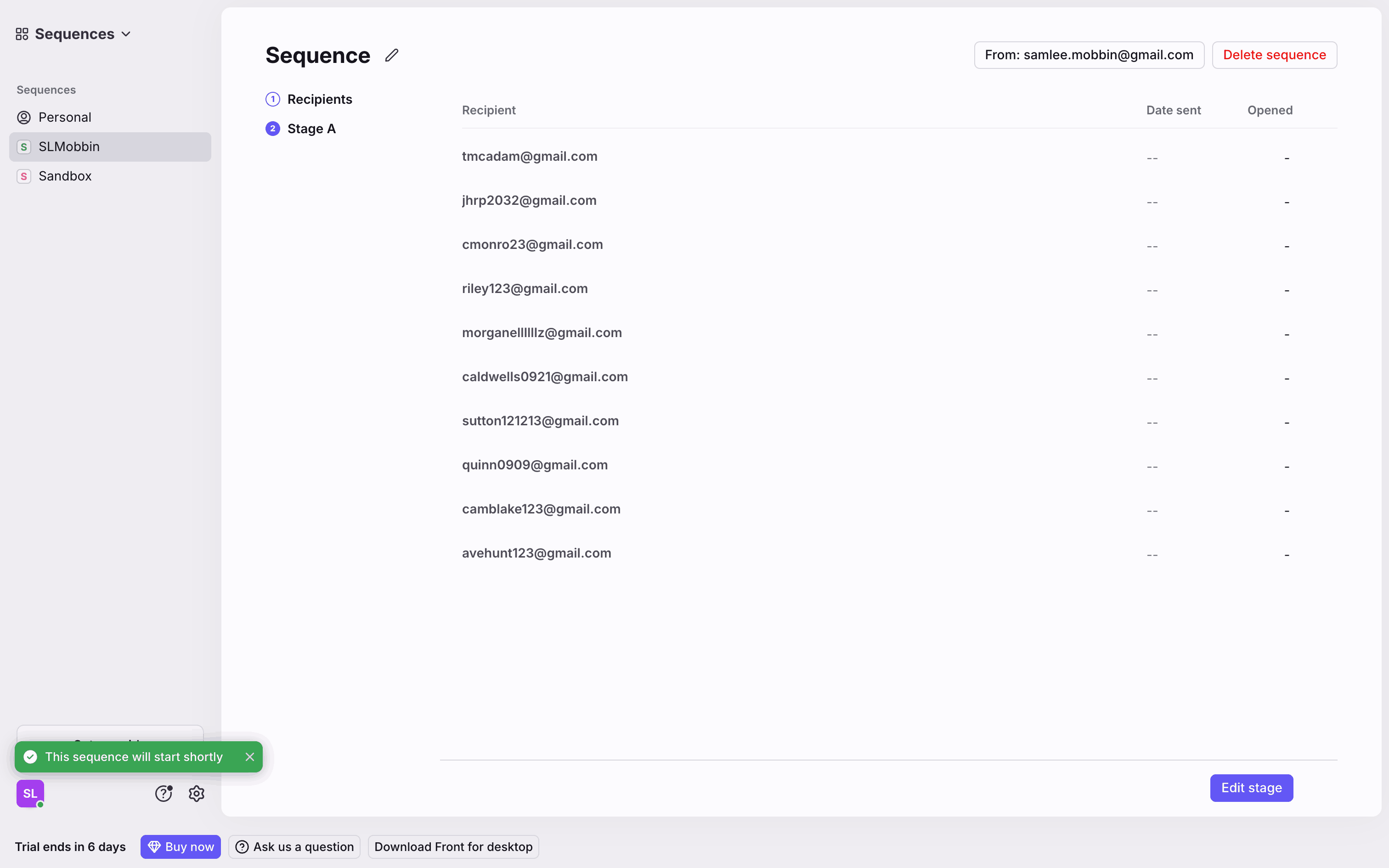 The user creates a sequence by defining recipients and email content. They then start the sequence, which sends emails to the recipients.