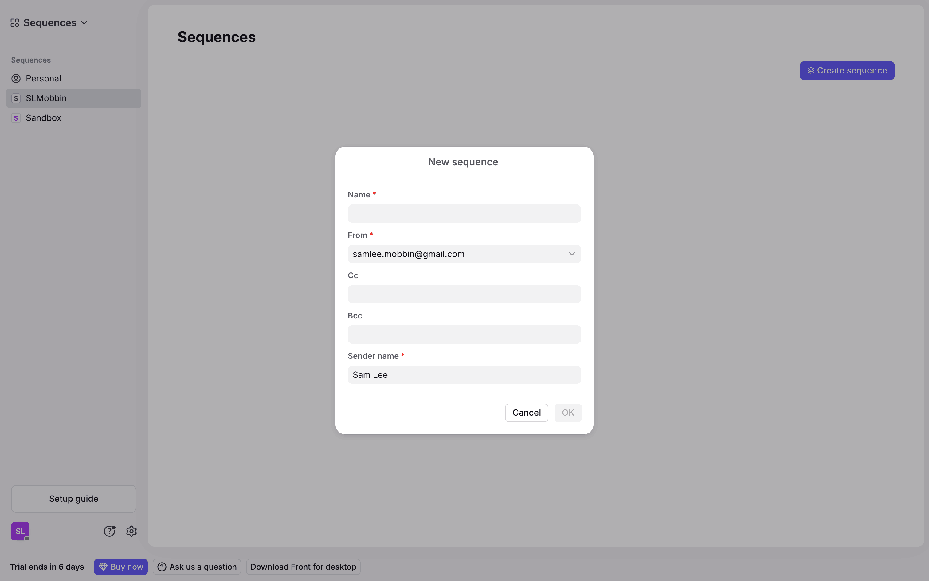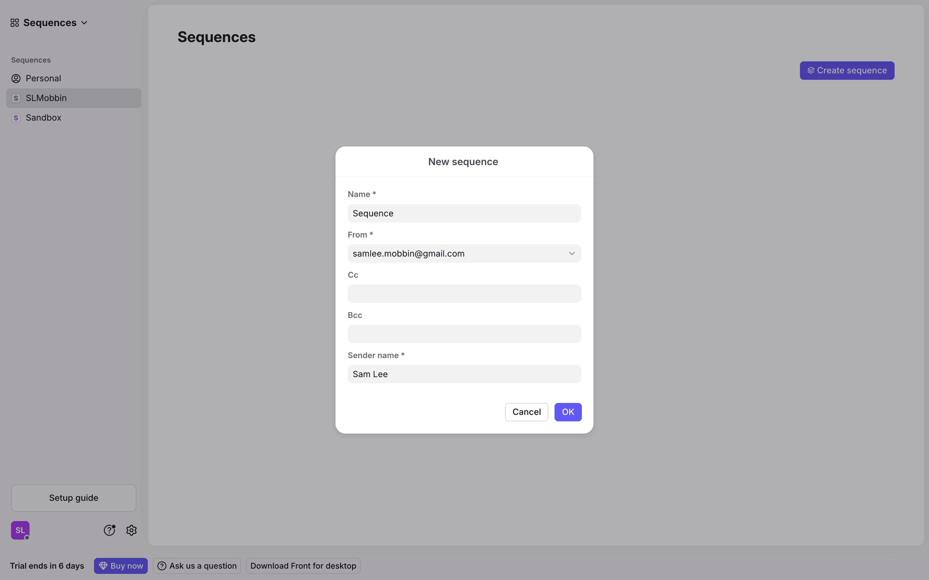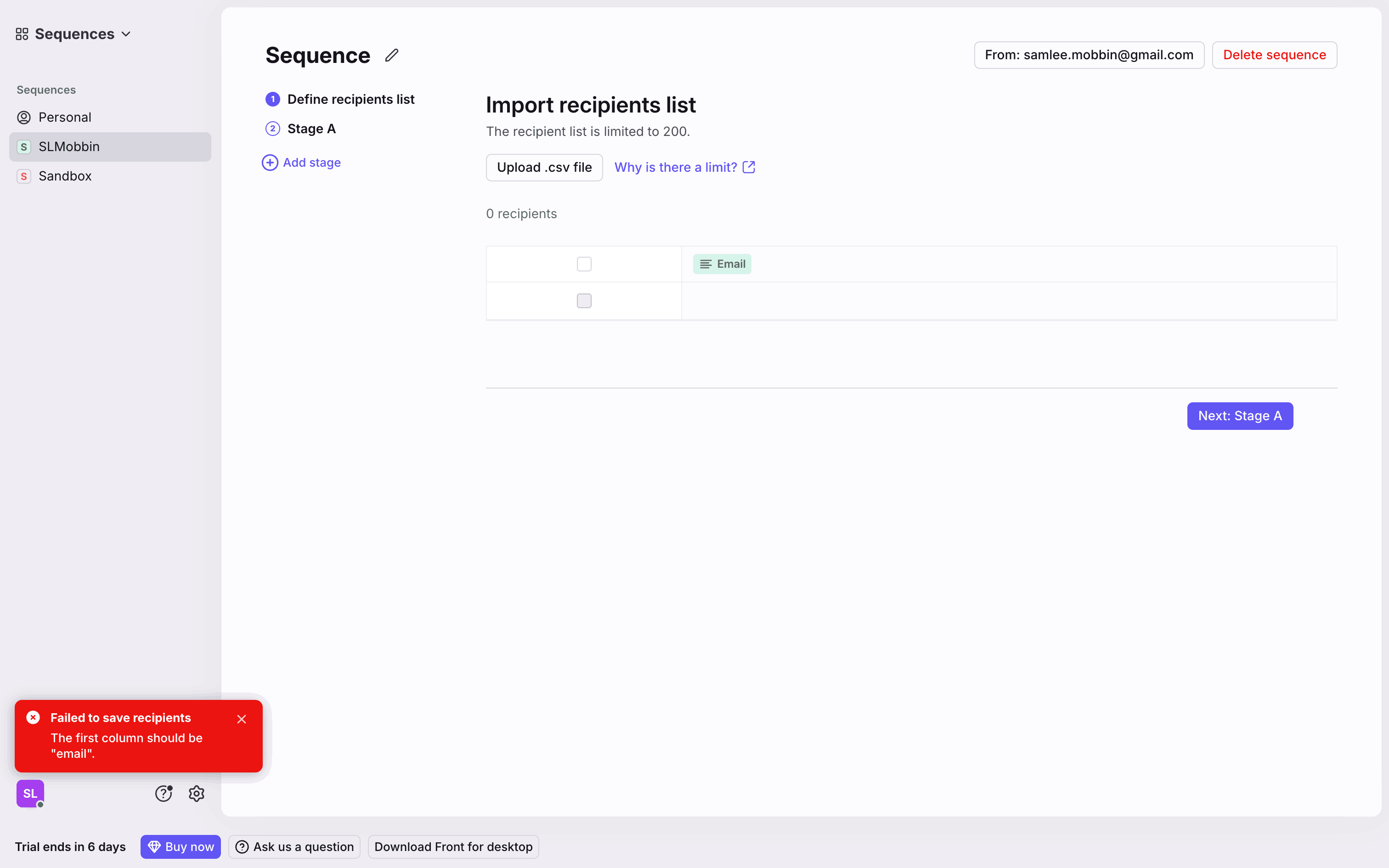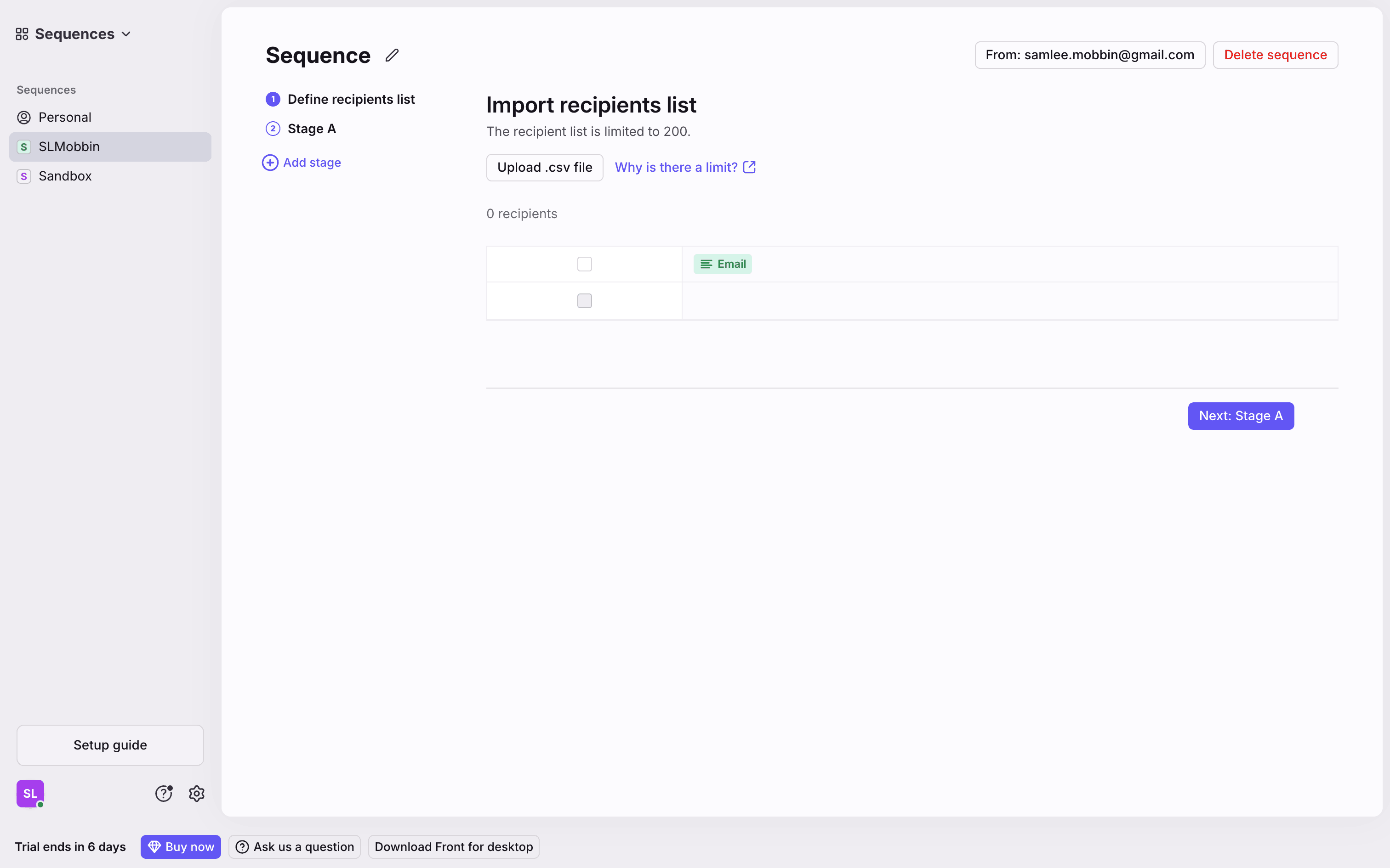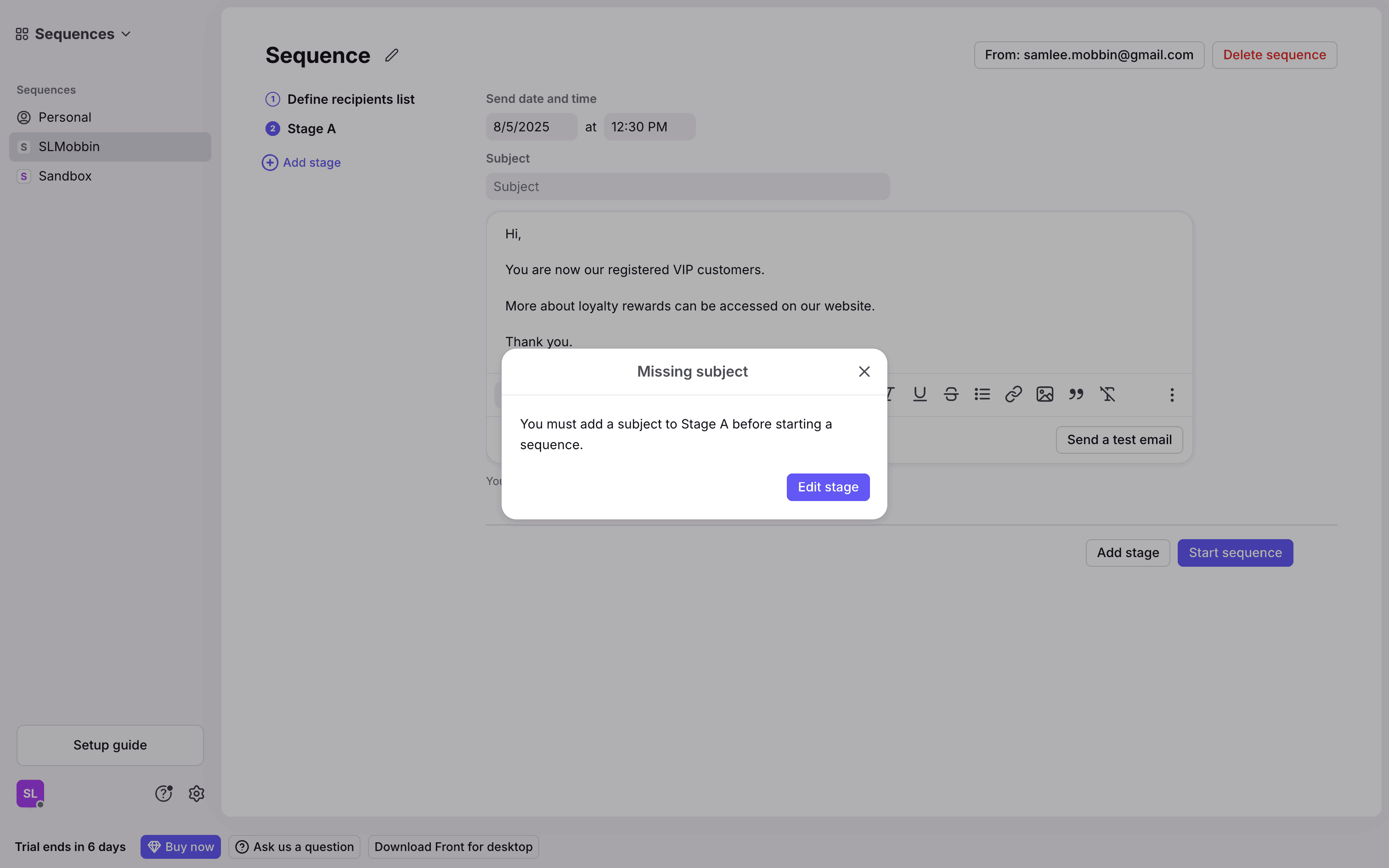 The user creates a sequence by defining recipients and email content. They then start the sequence, which sends emails to the recipients.