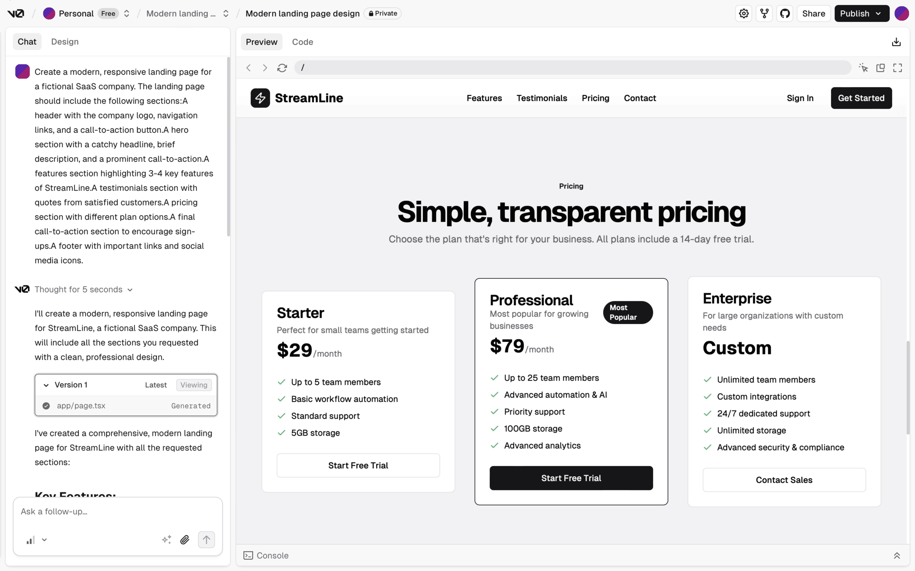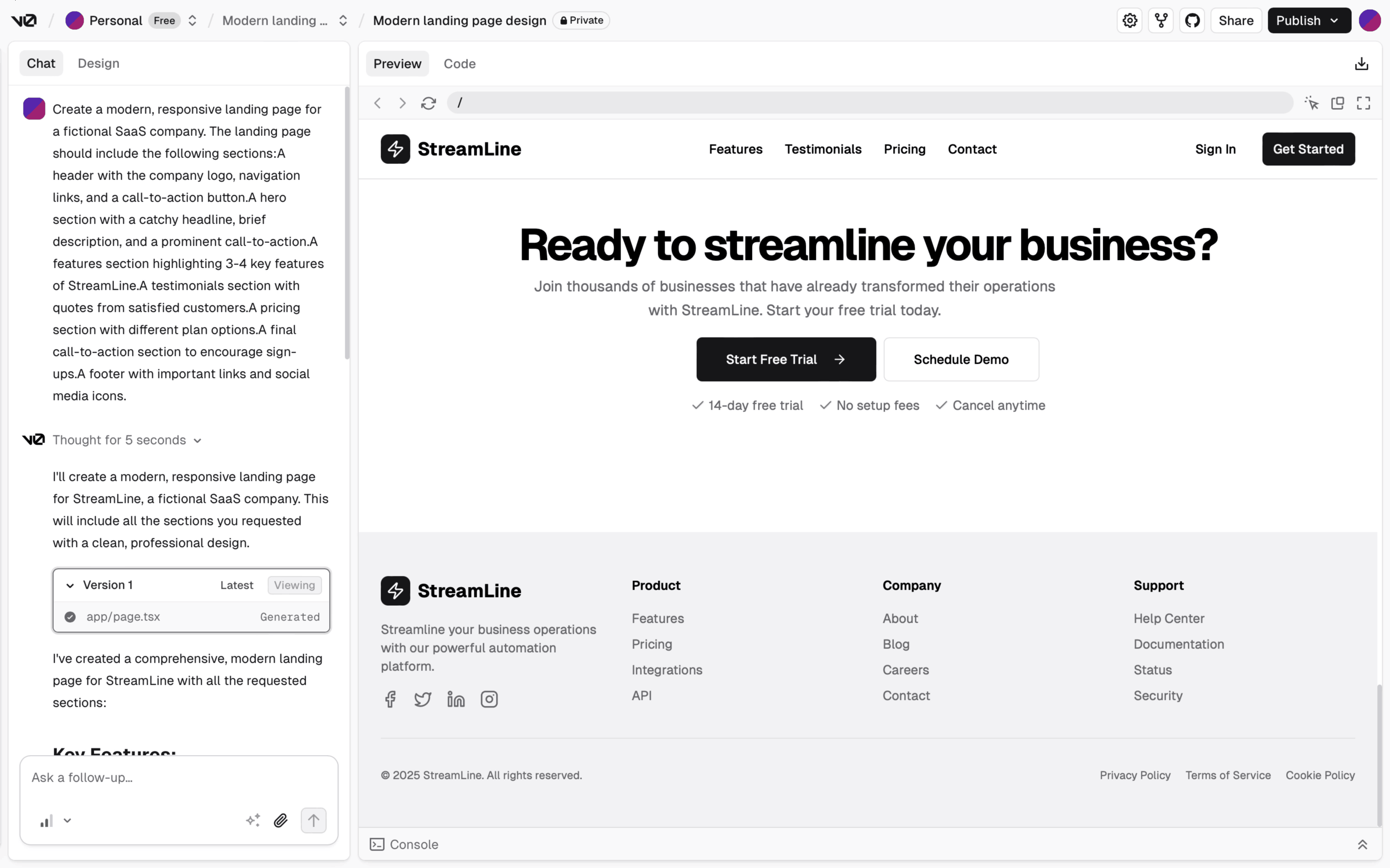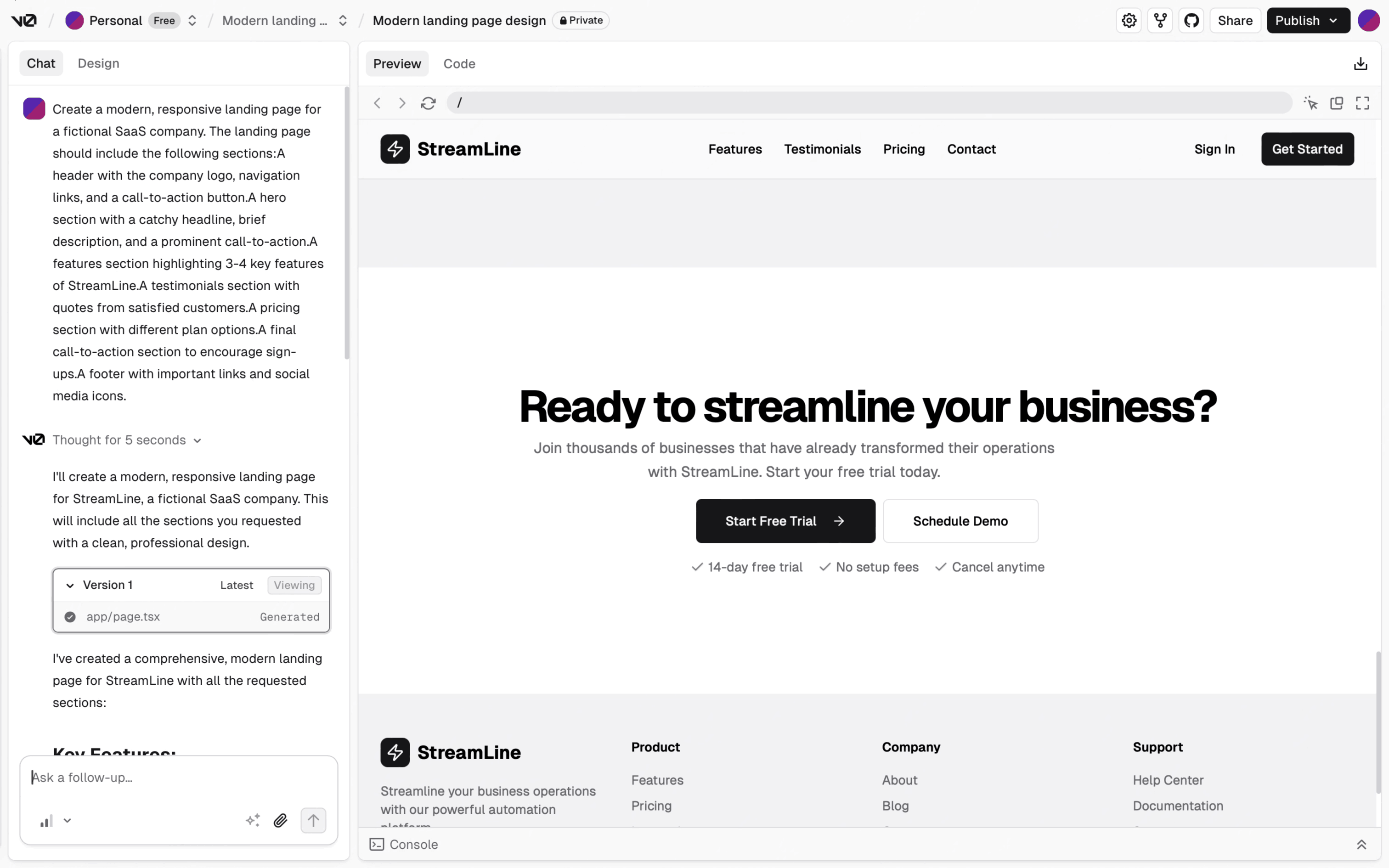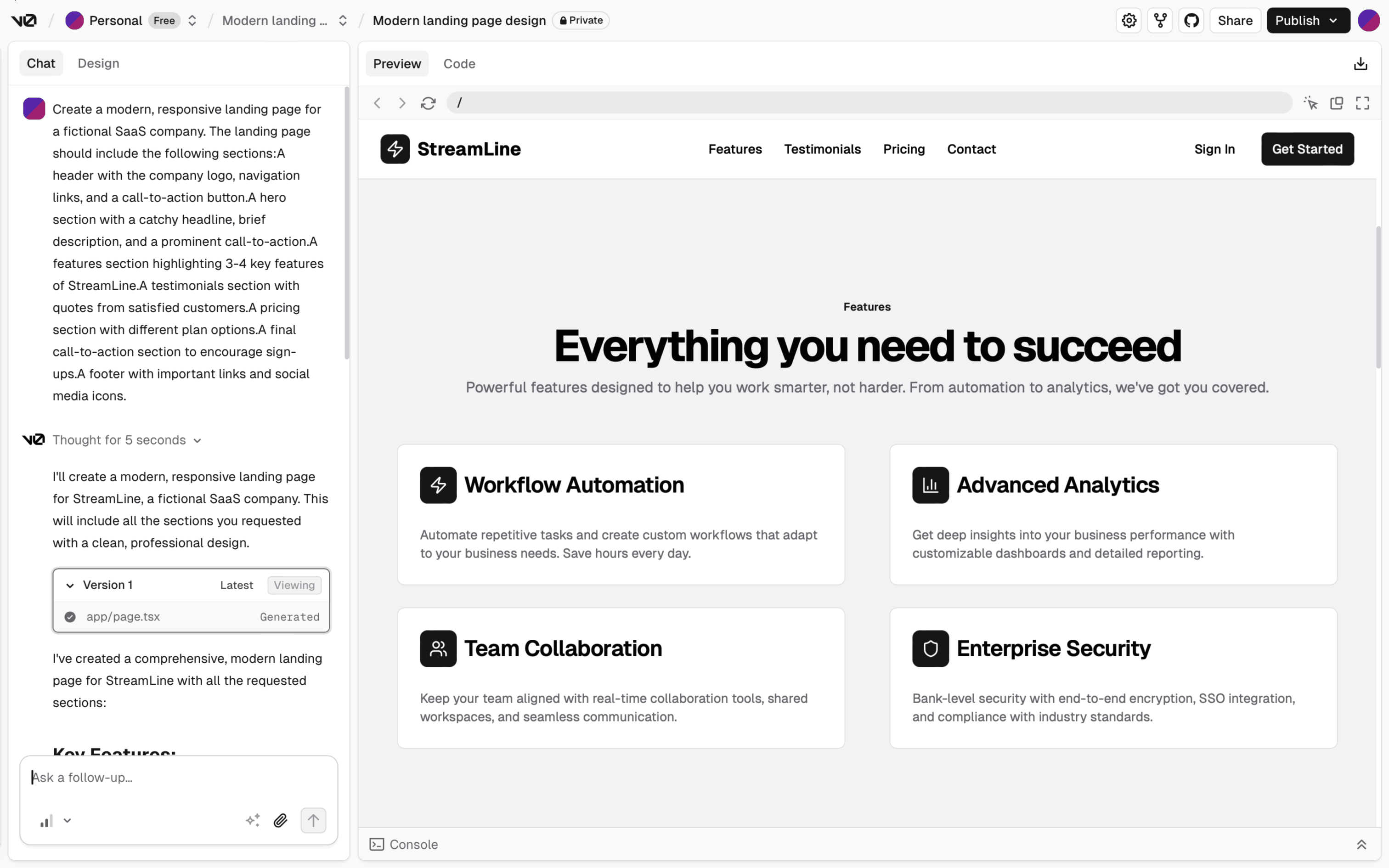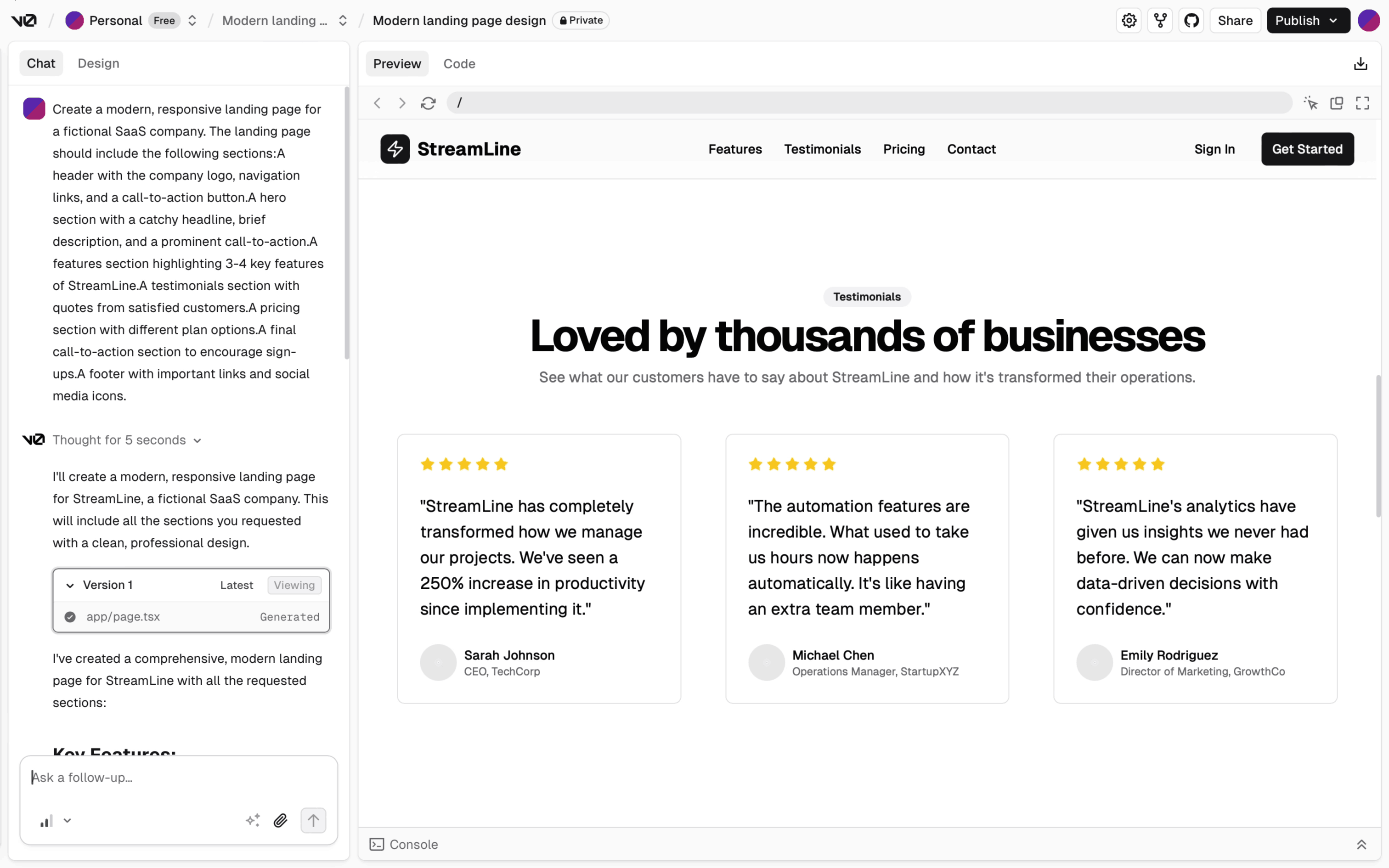 The user provides a prompt to generate a landing page, then previews the generated landing page, reviewing its various sections. The goal is to generate a satisfactory landing page.