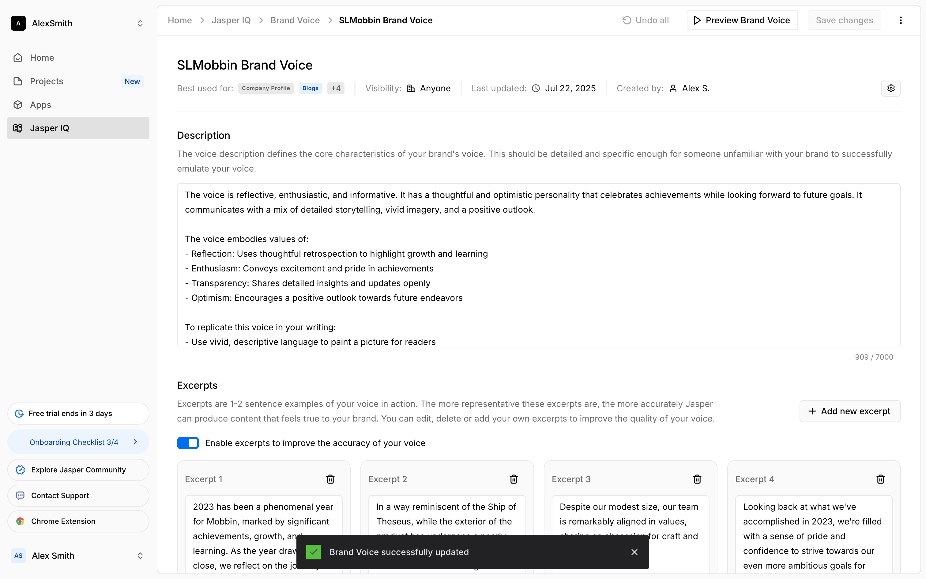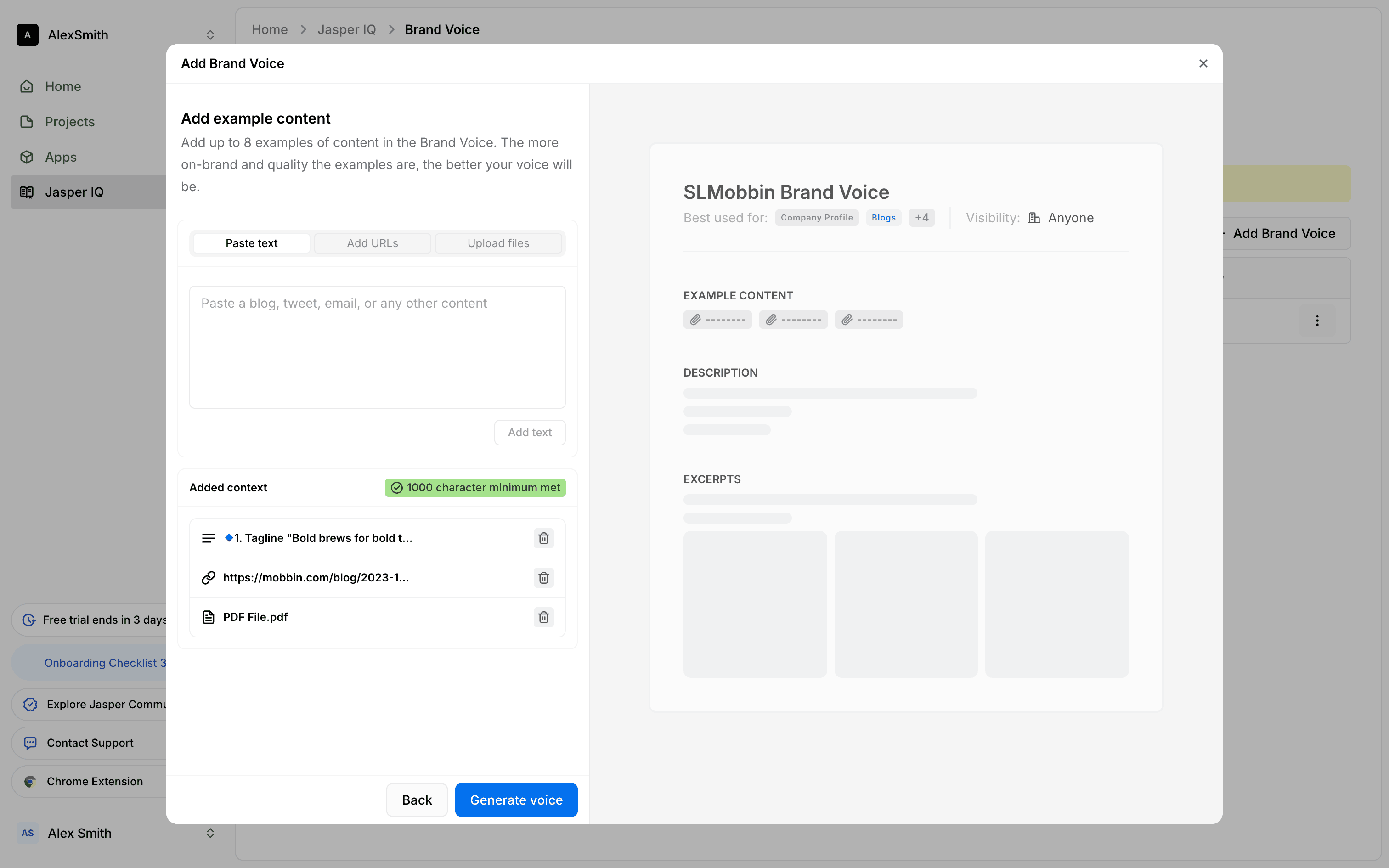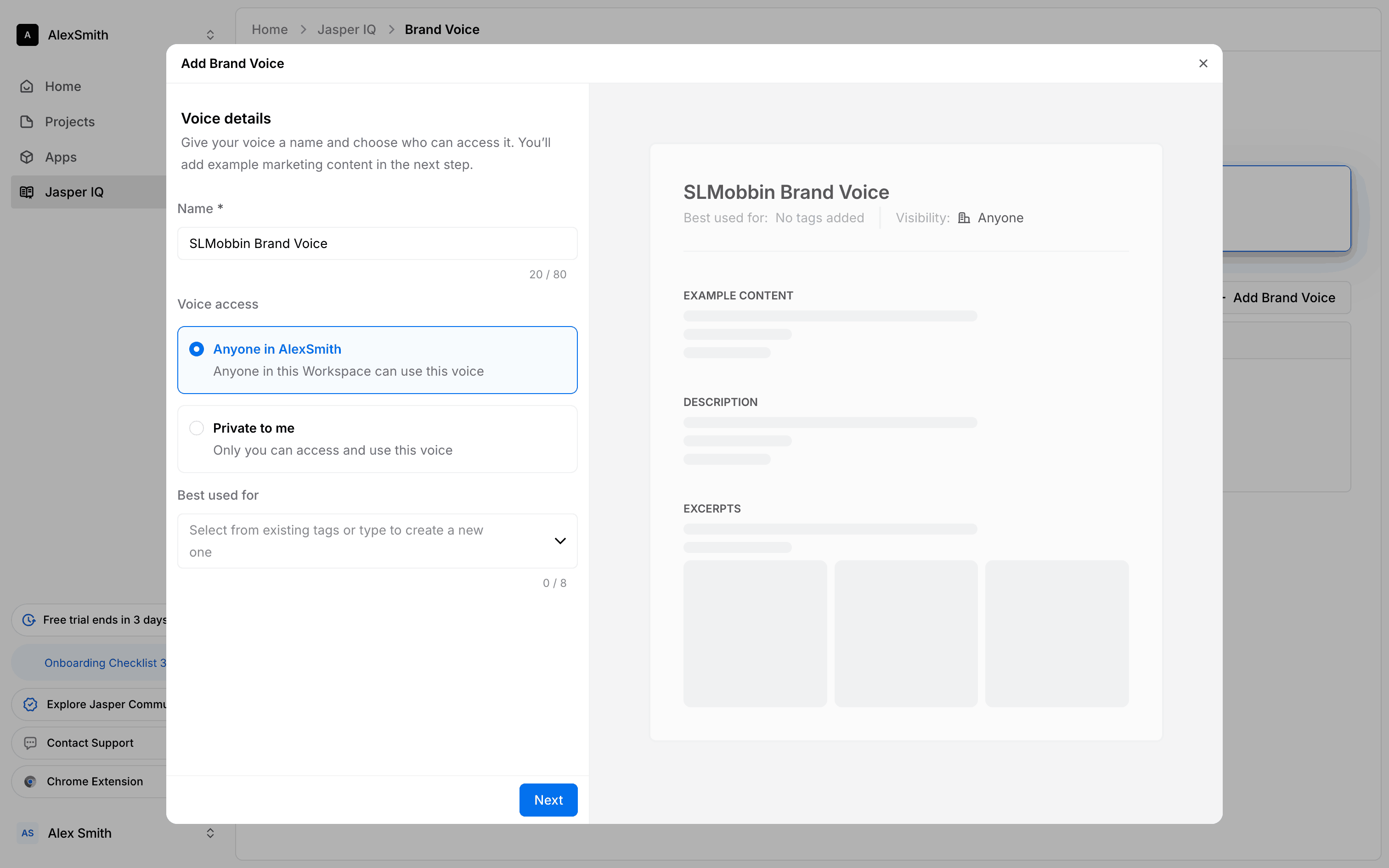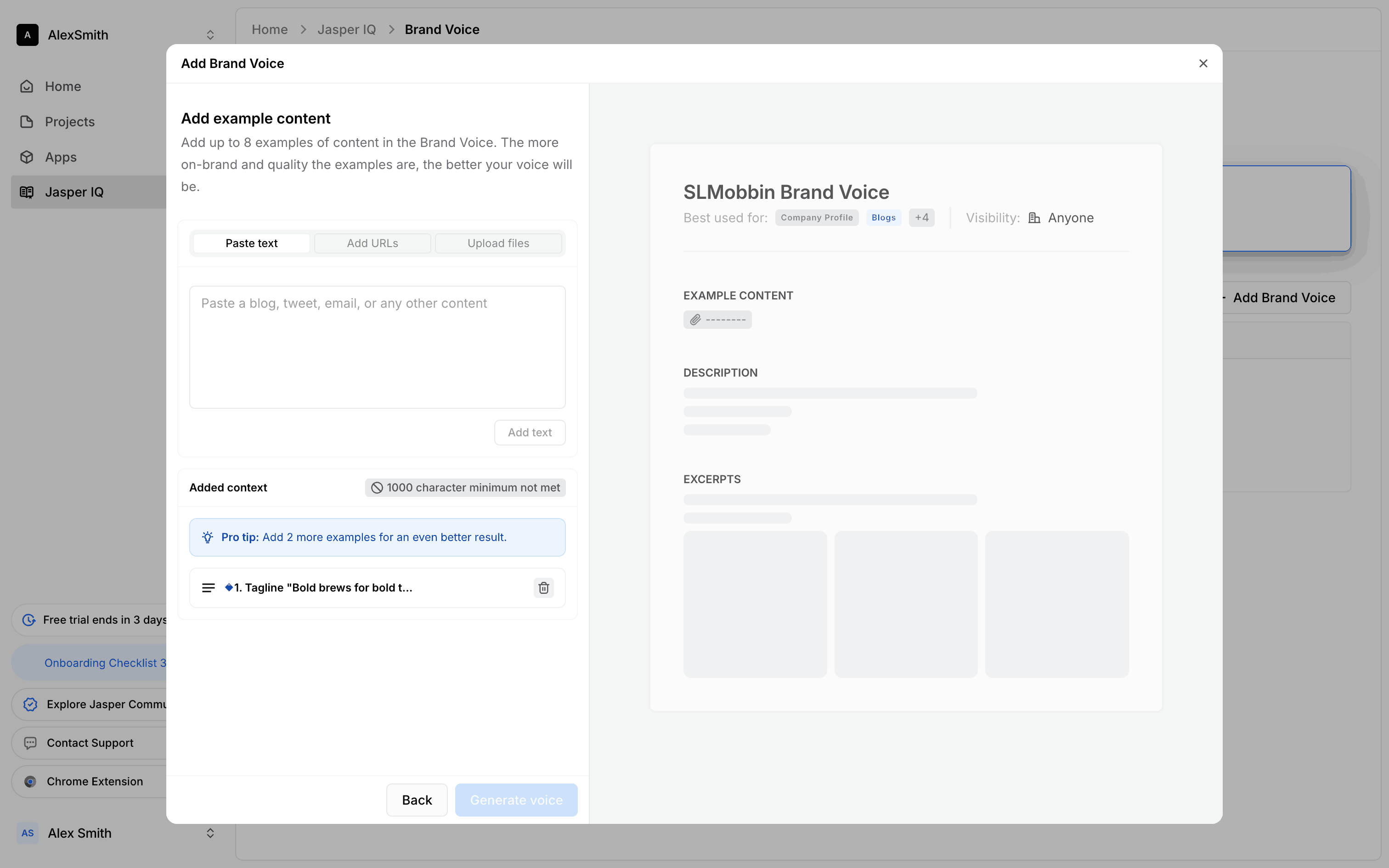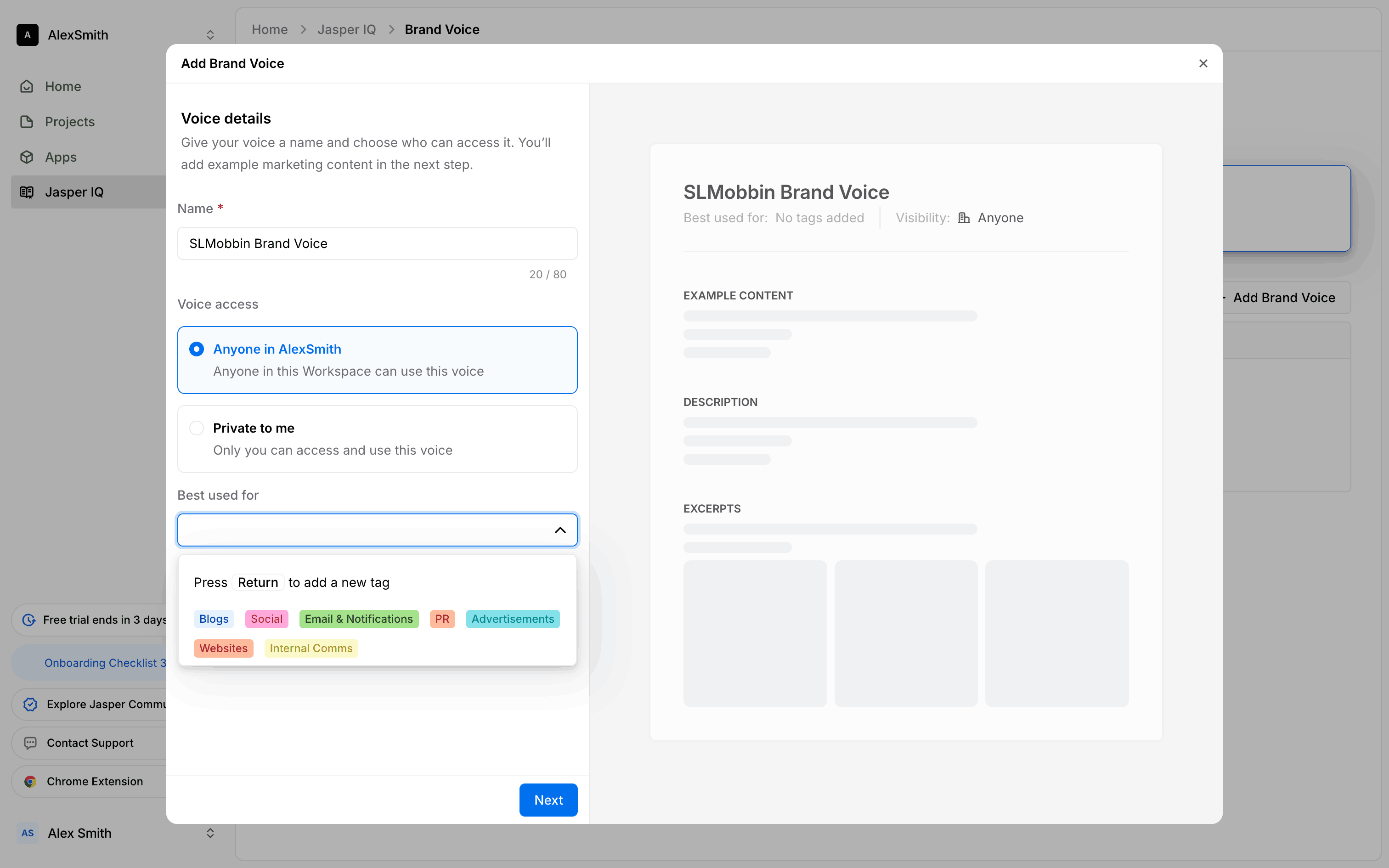 The user adds a new brand voice by providing a name, setting access, selecting tags, and adding example content. The application generates the voice, and the user edits it.