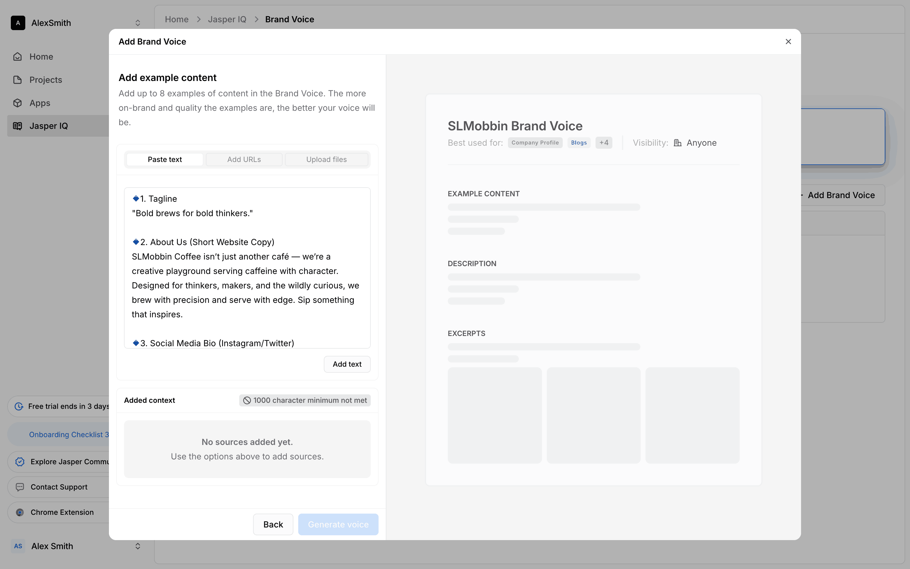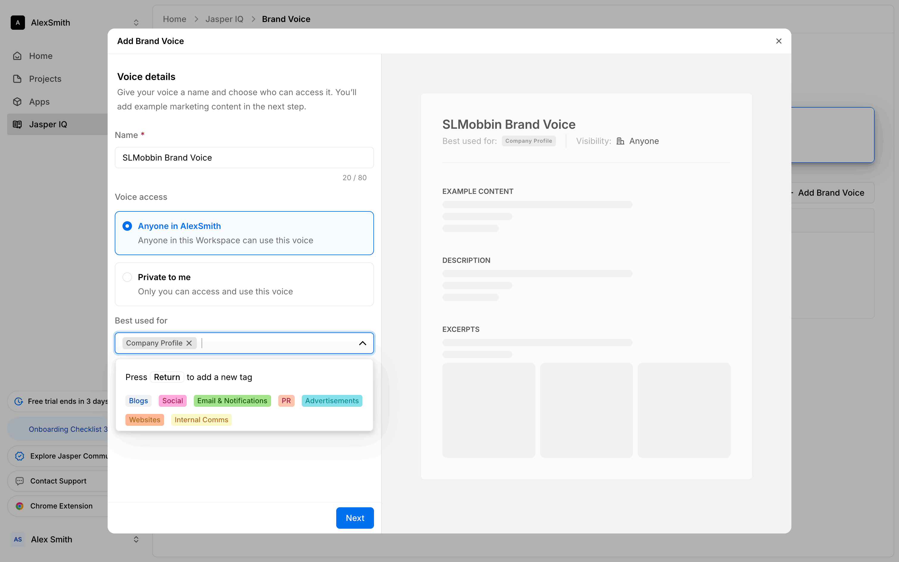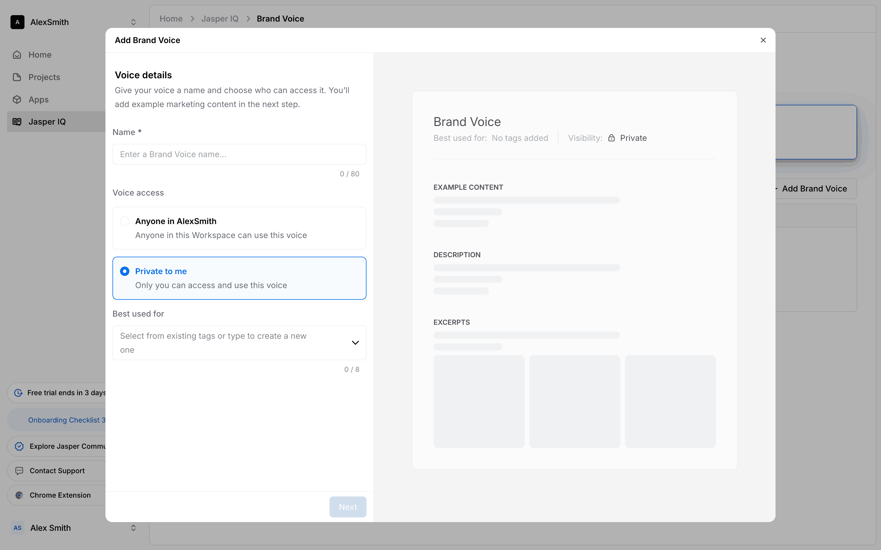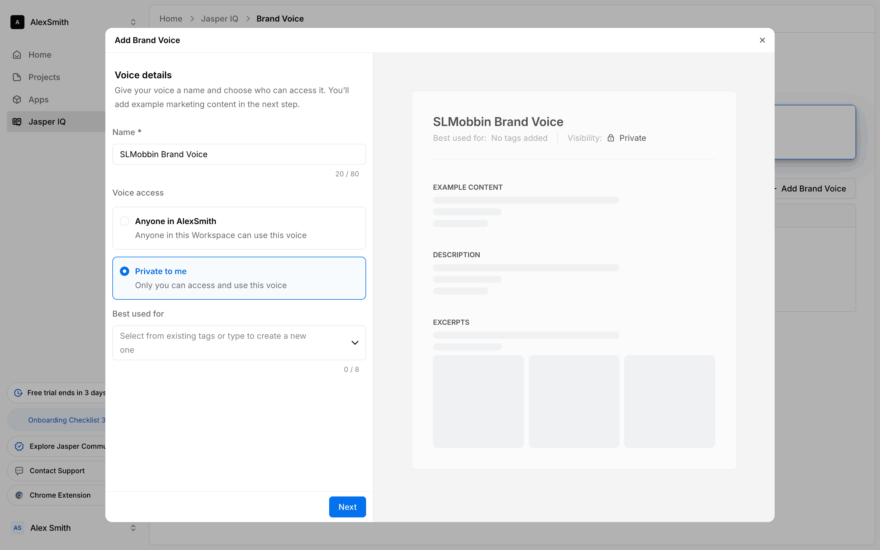The user adds a new brand voice by providing a name, setting access, selecting tags, and adding example content. The application generates the voice, and the user edits it.