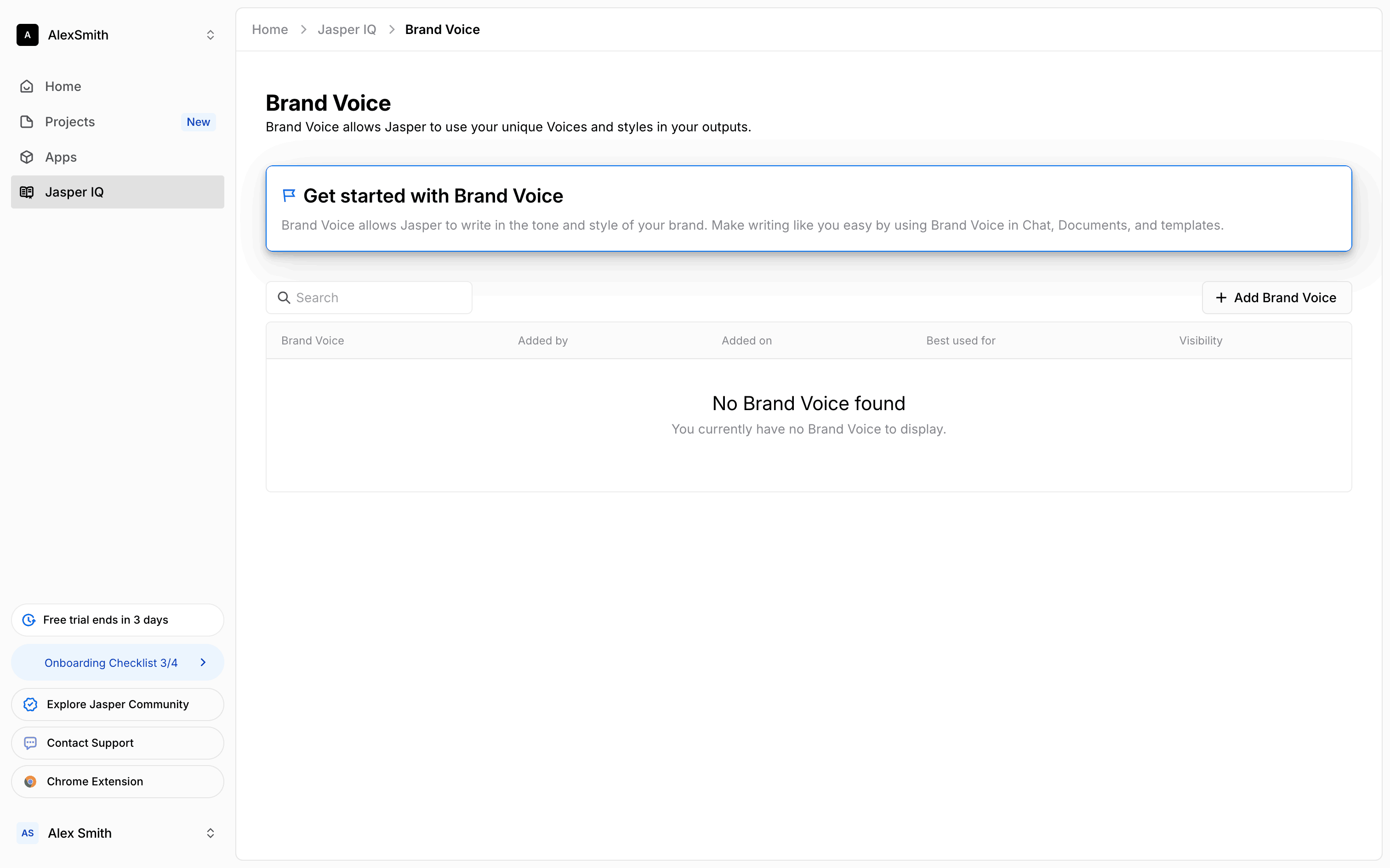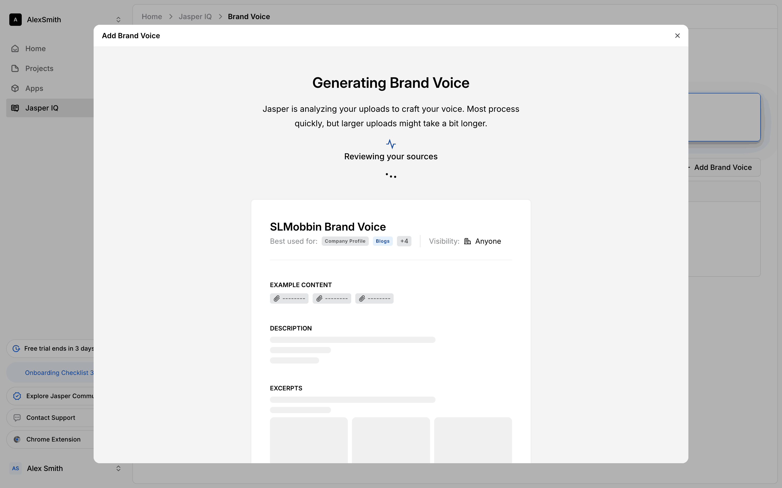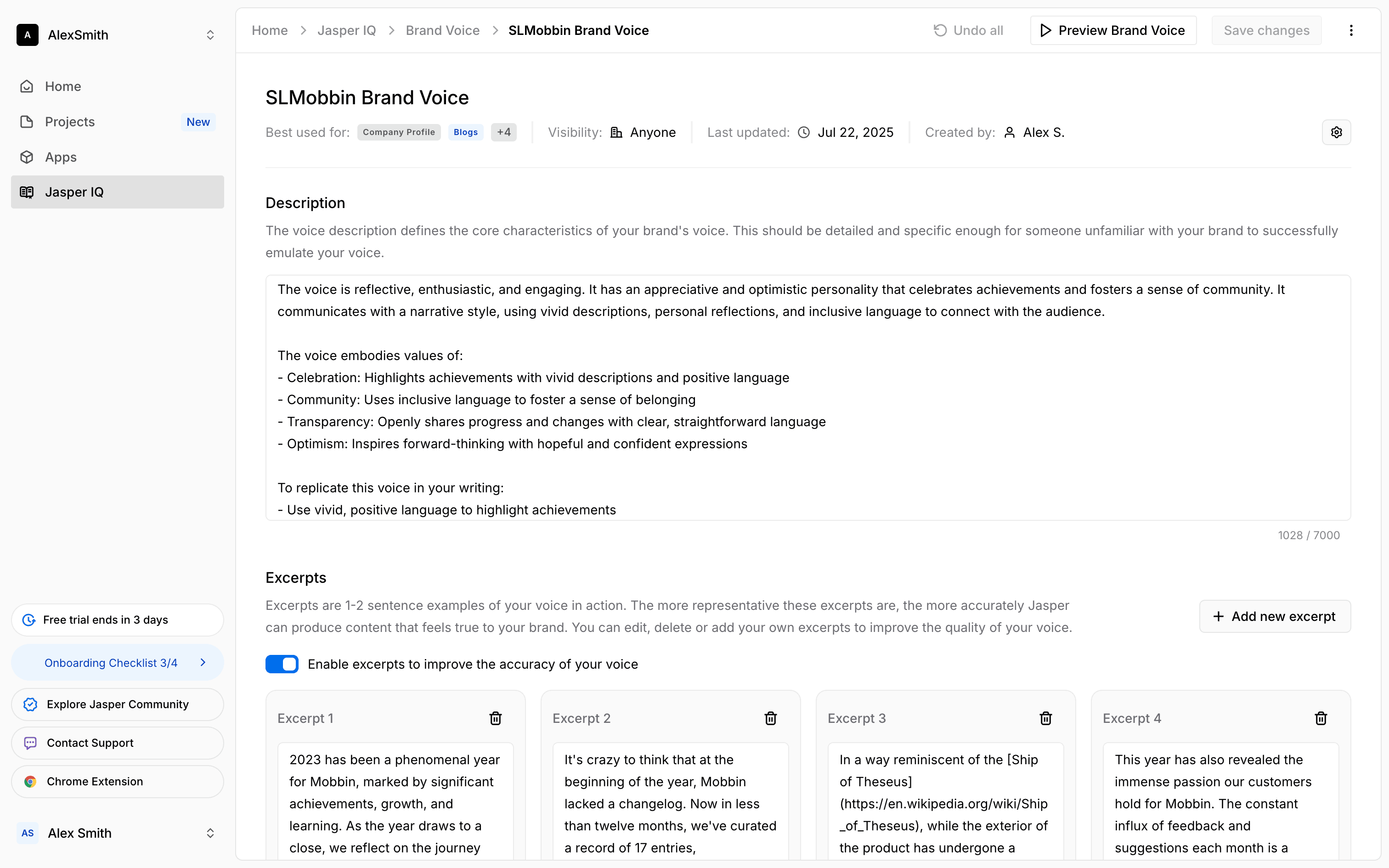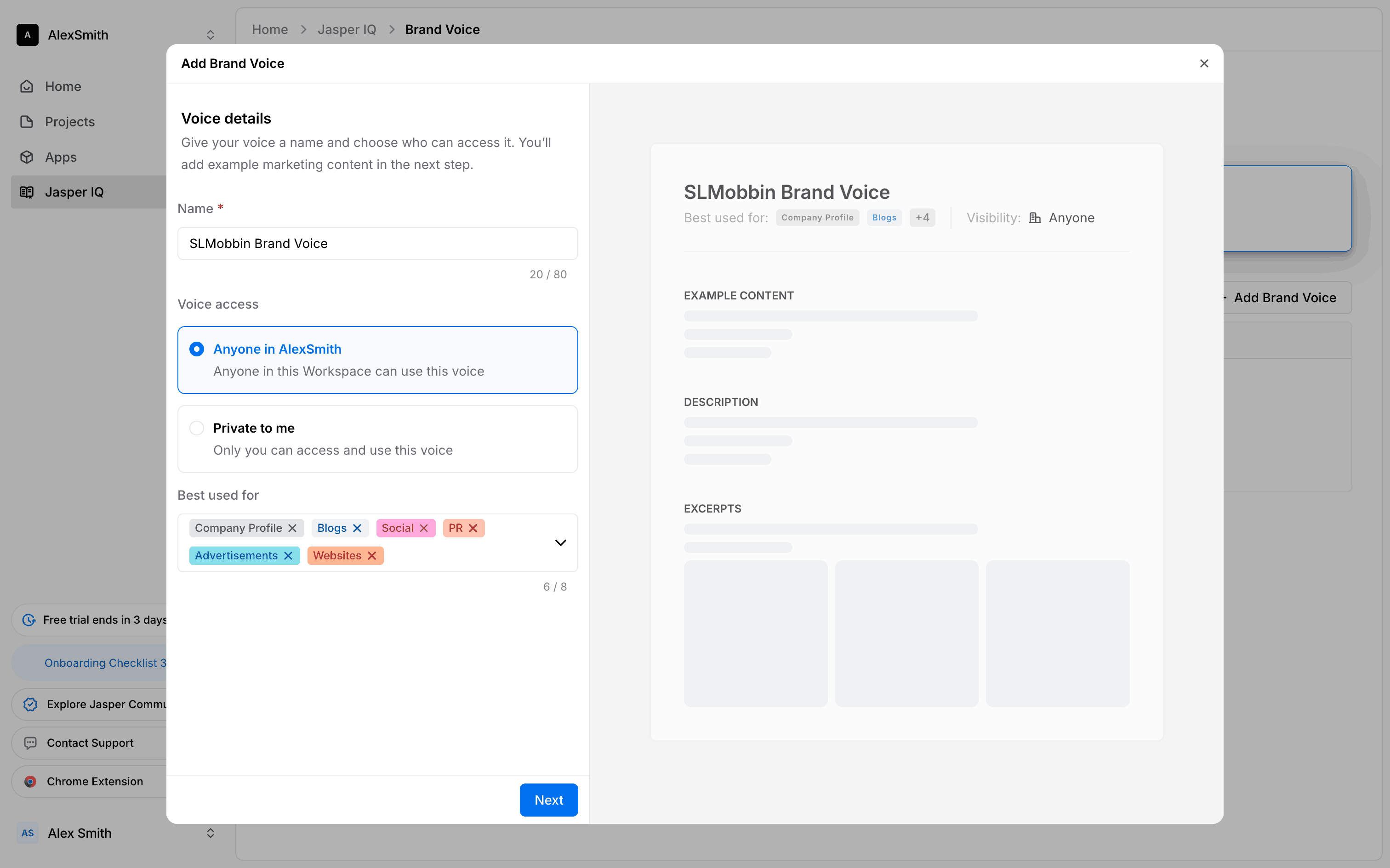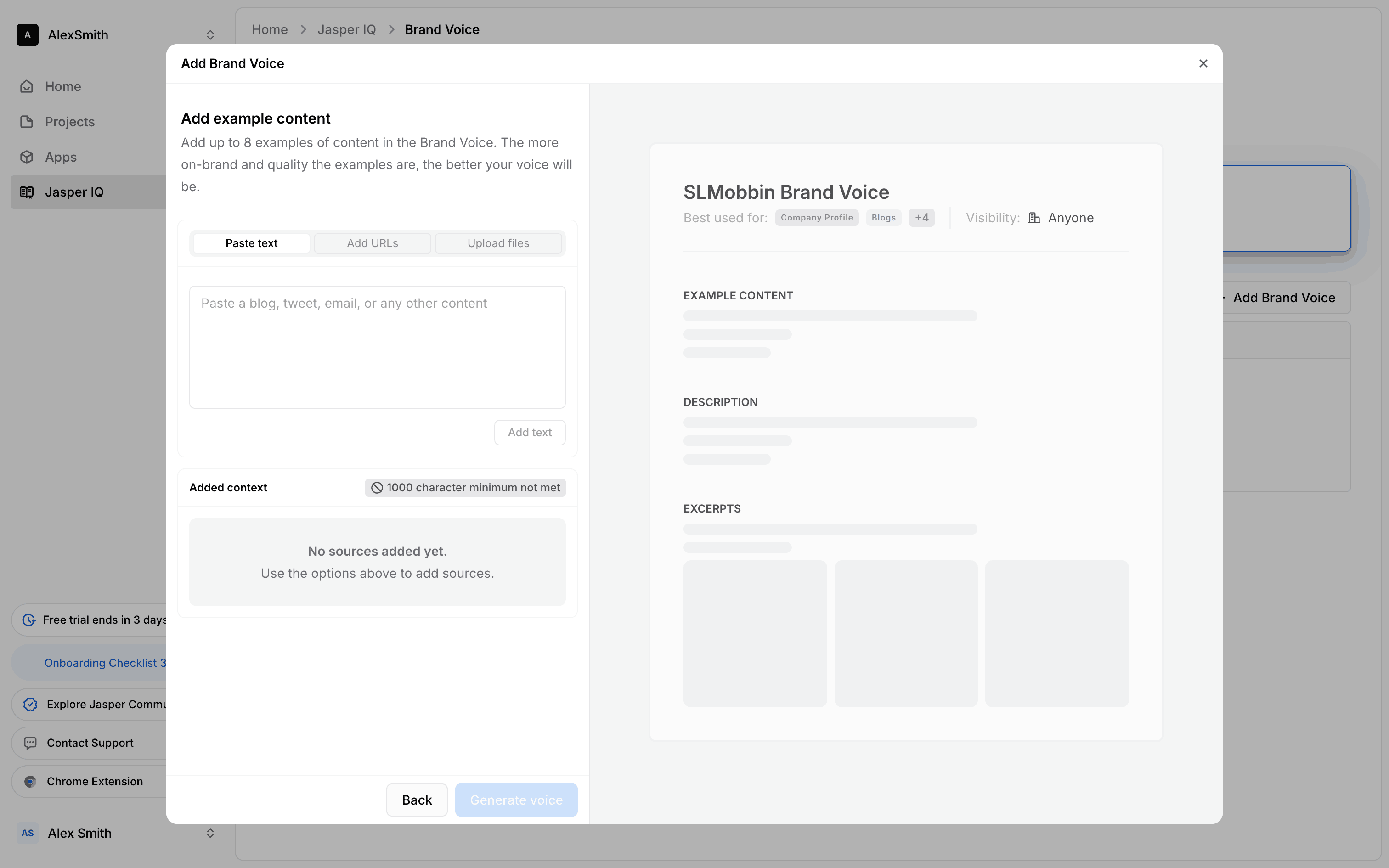 The user adds a new brand voice by providing a name, setting access, selecting tags, and adding example content. The application generates the voice, and the user edits it.