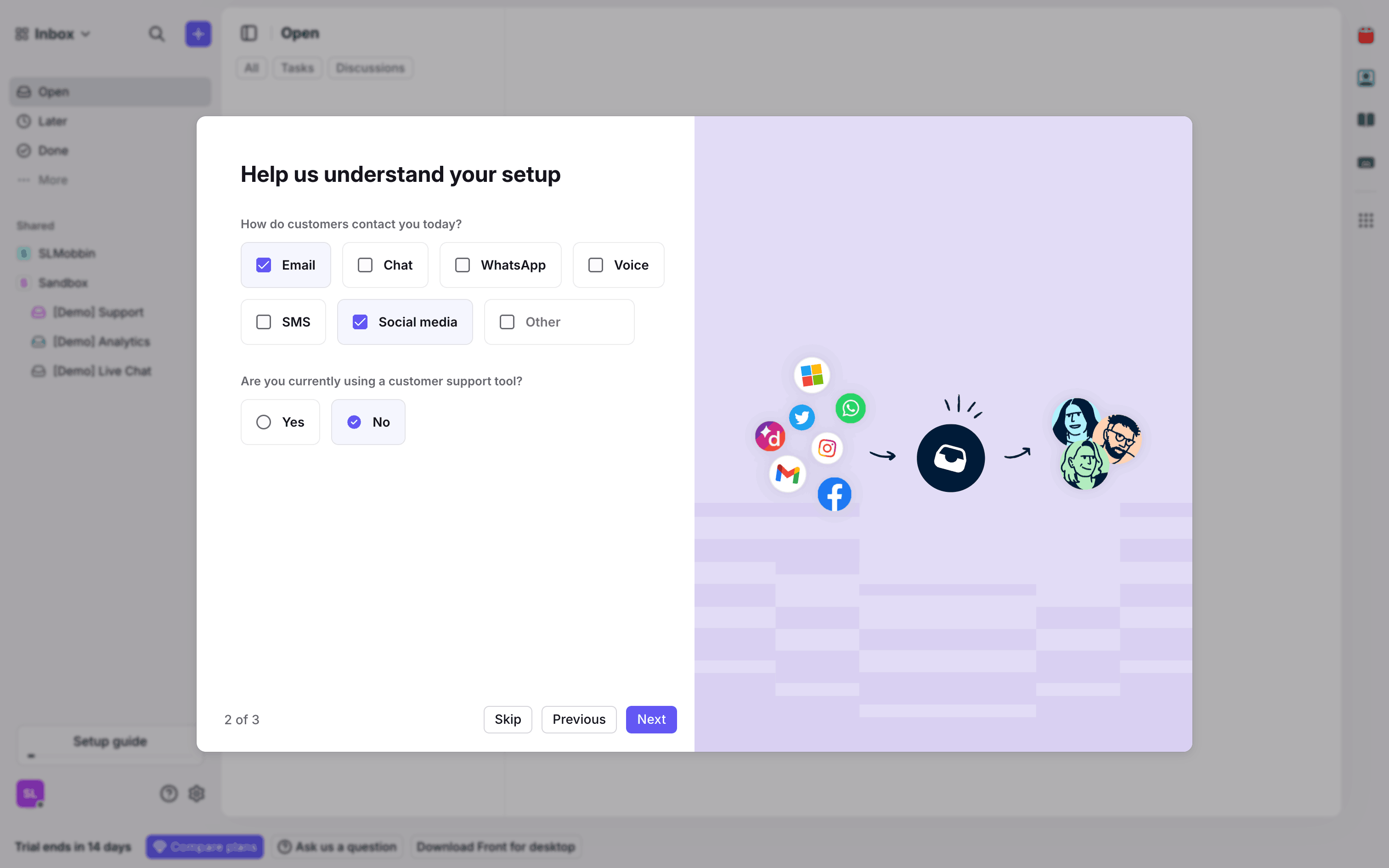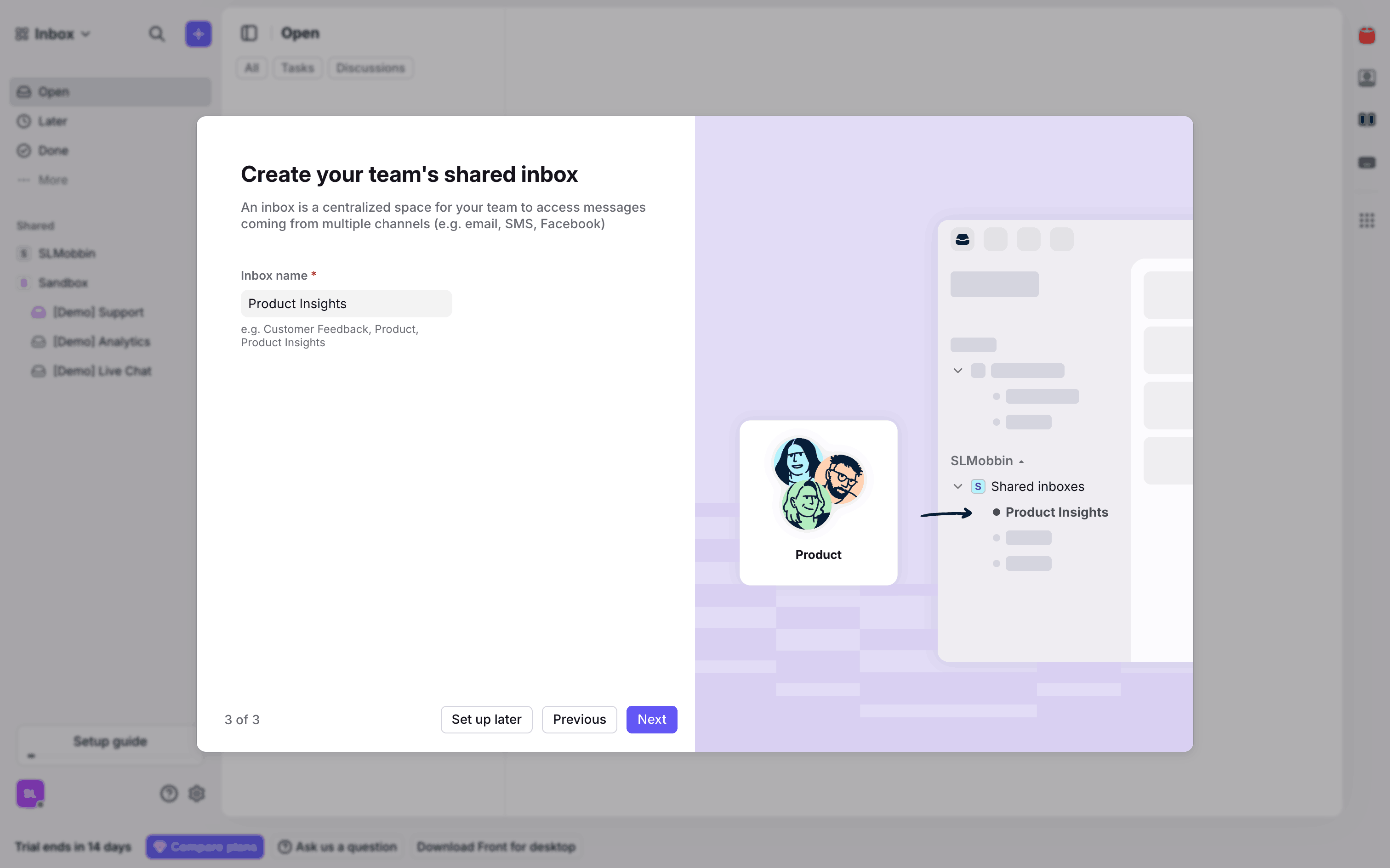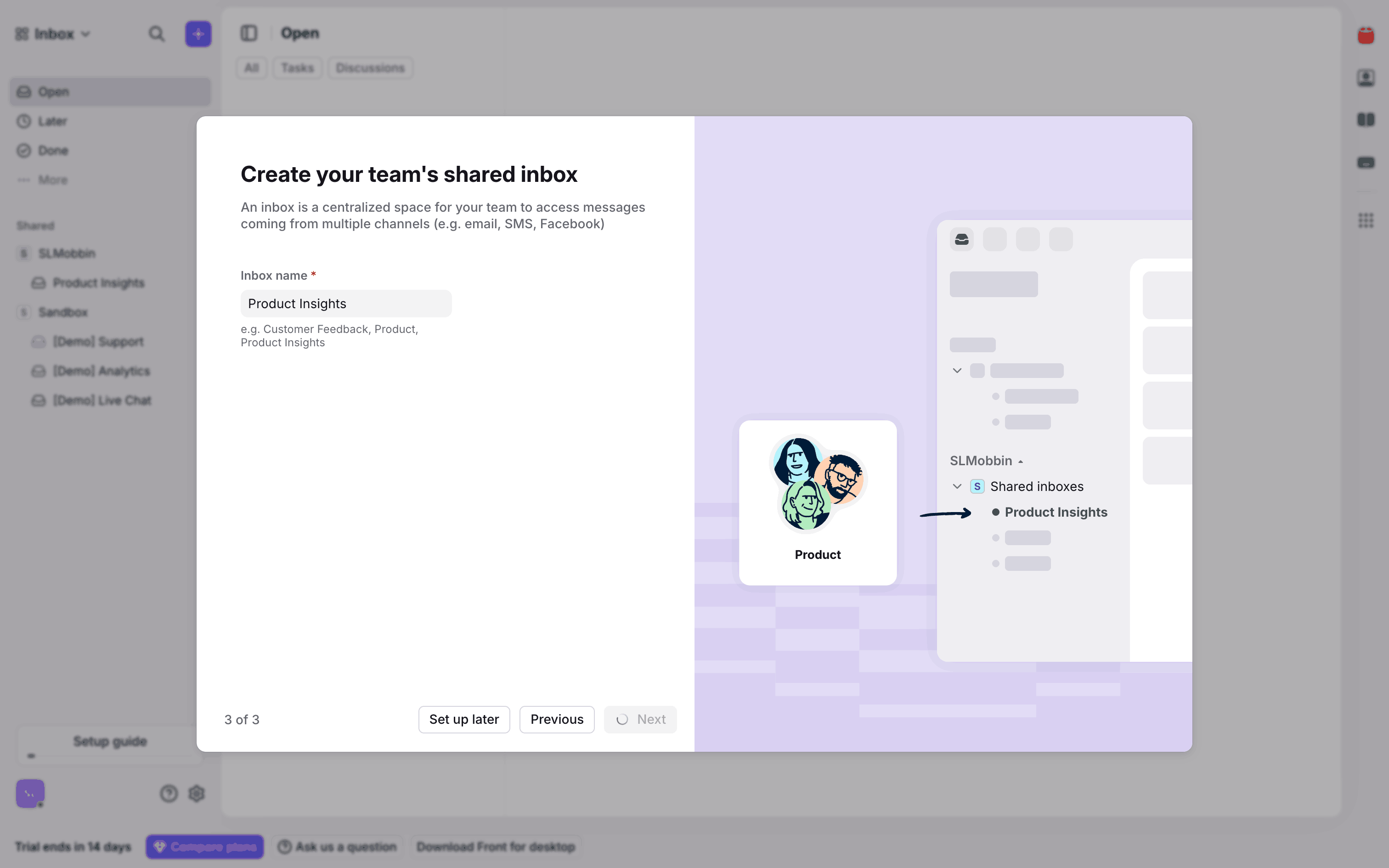 The user flow guides the user through setting up their account by asking questions and creating a shared inbox. Finally, the user is presented with the main inbox view.