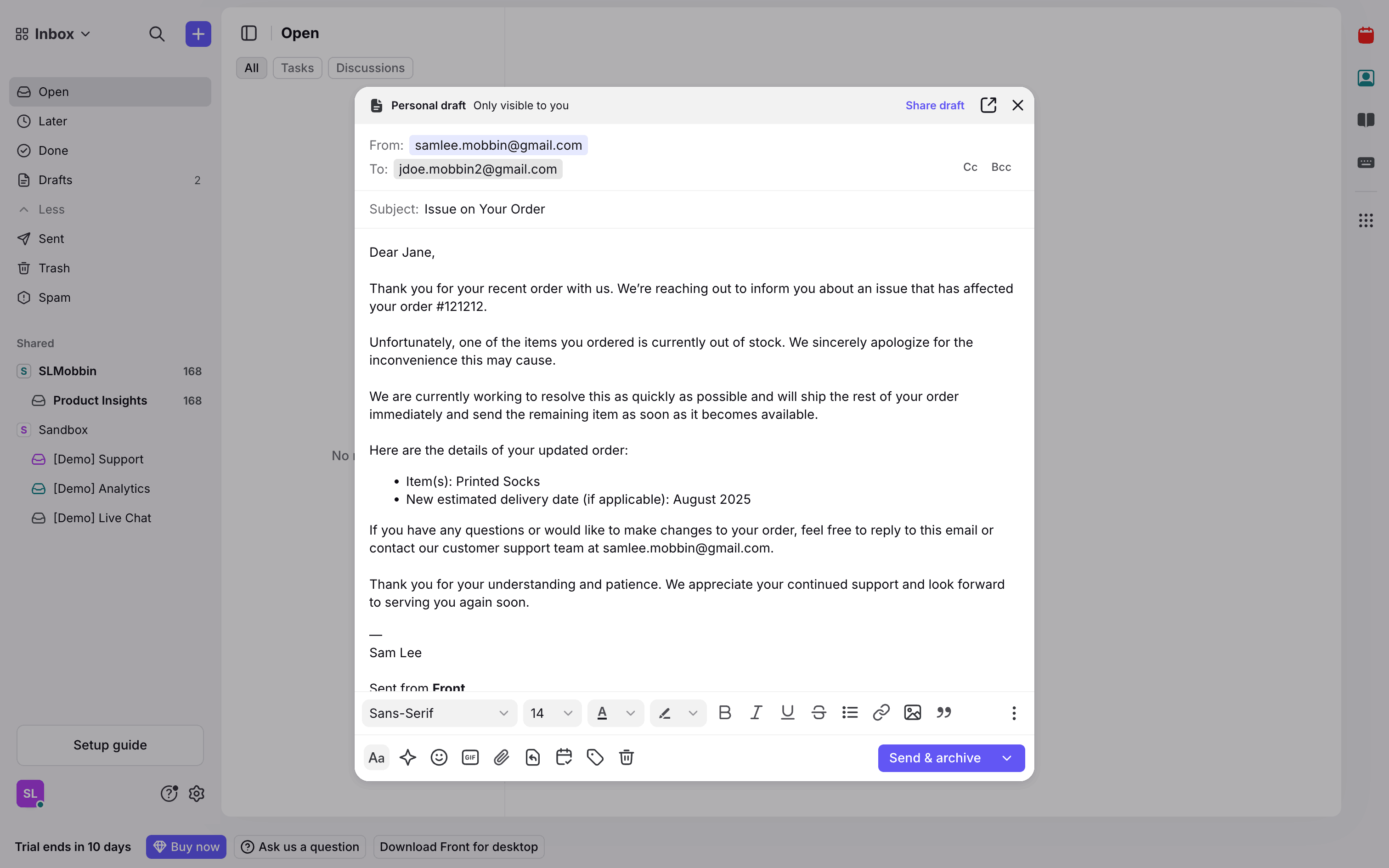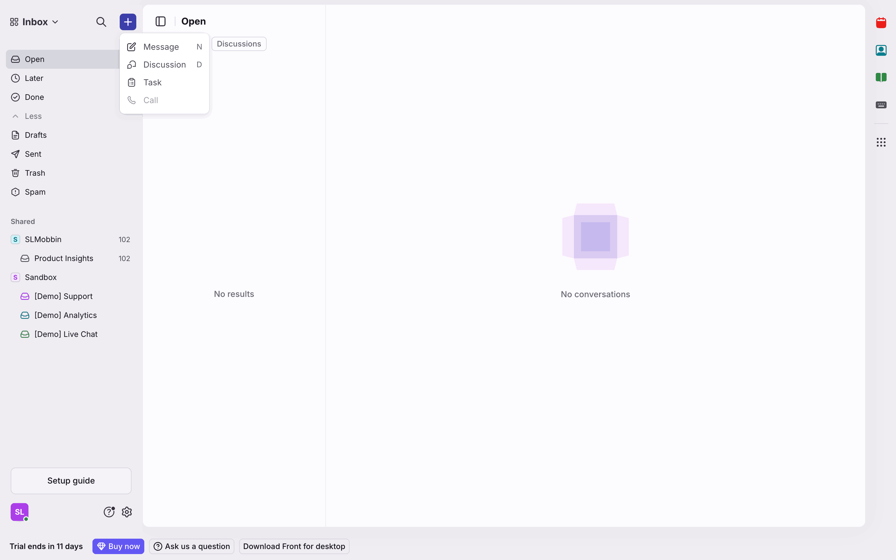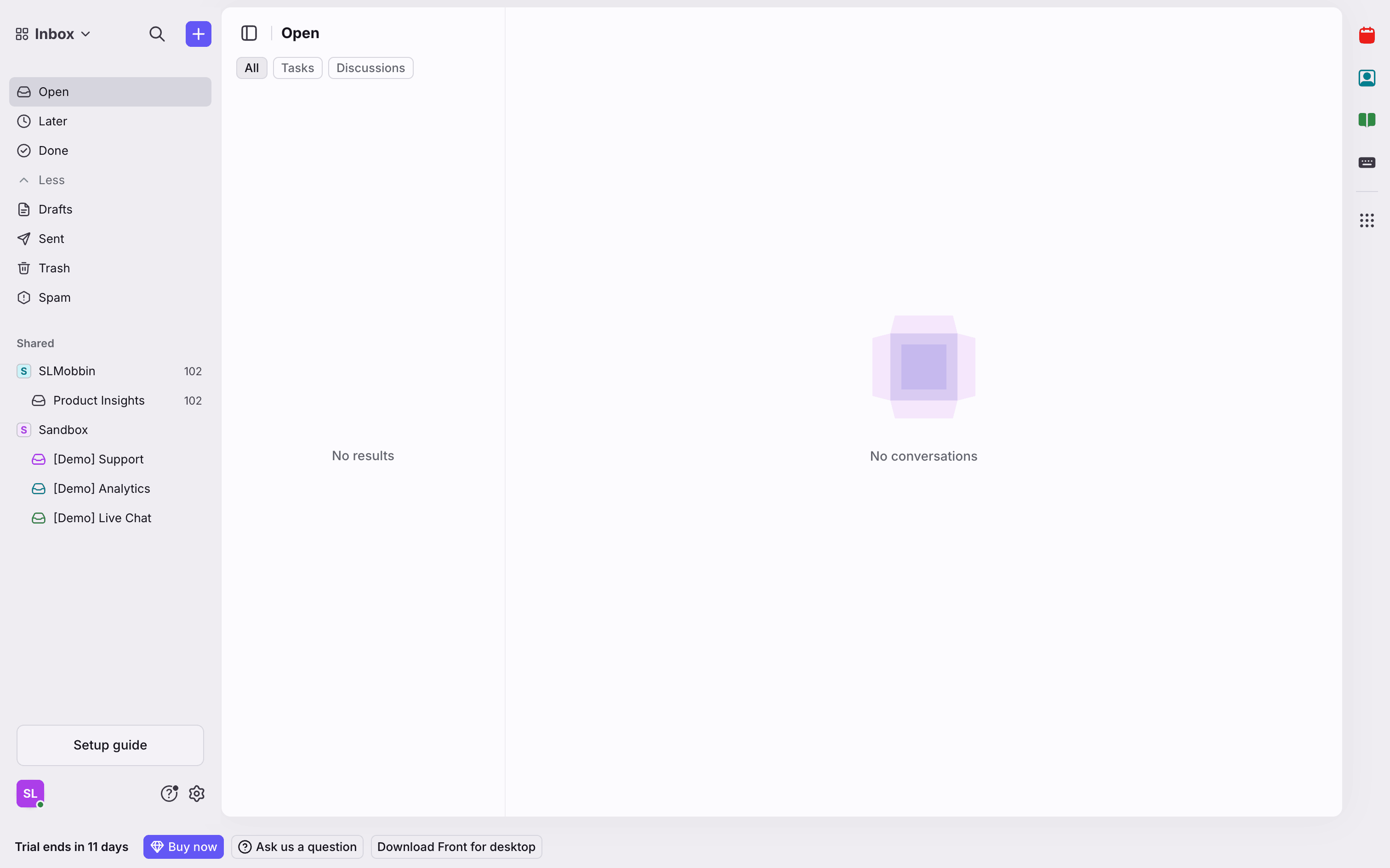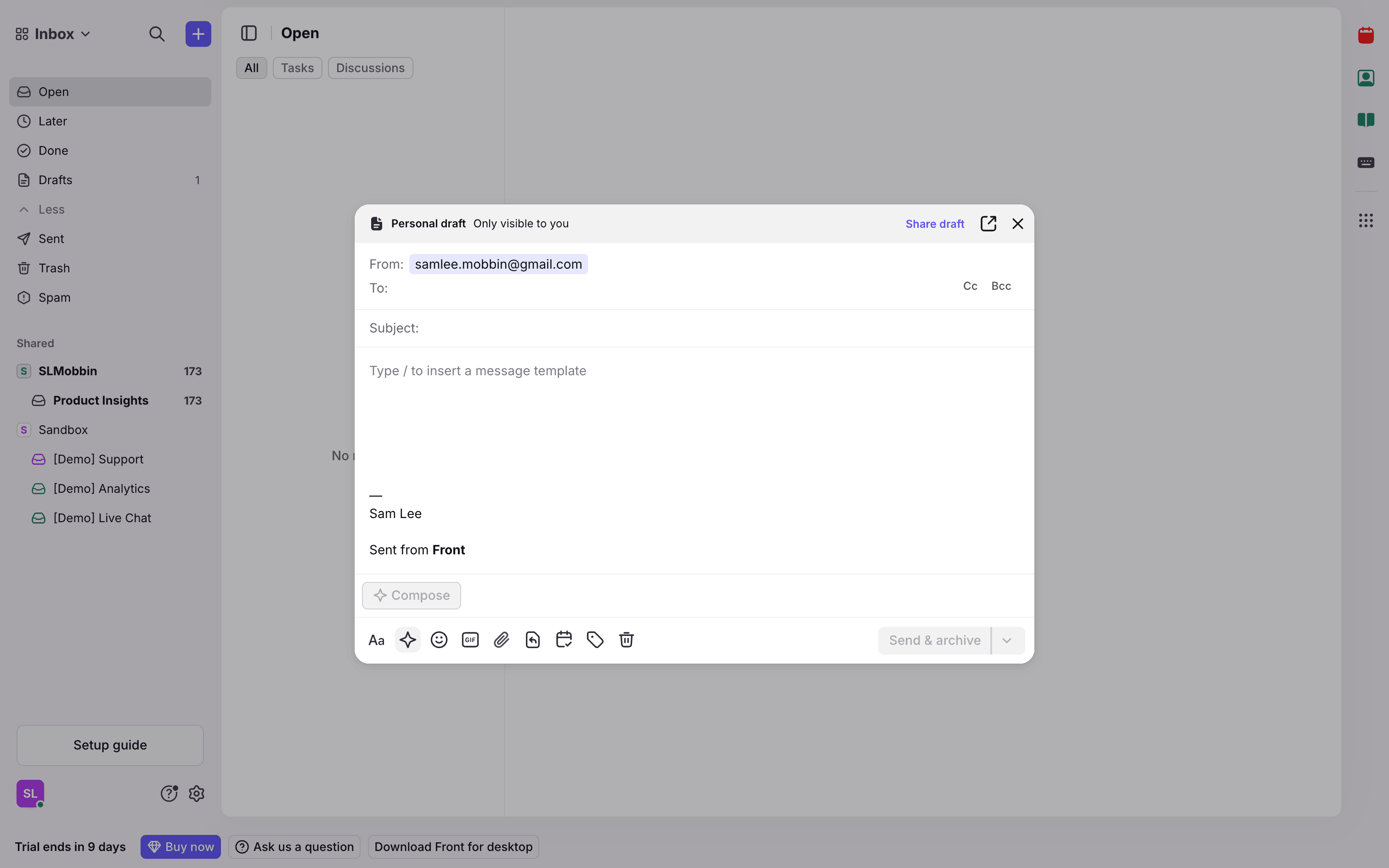 The user flow guides the user through setting up their account by asking questions and creating a shared inbox. Finally, the user is presented with the main inbox view.
