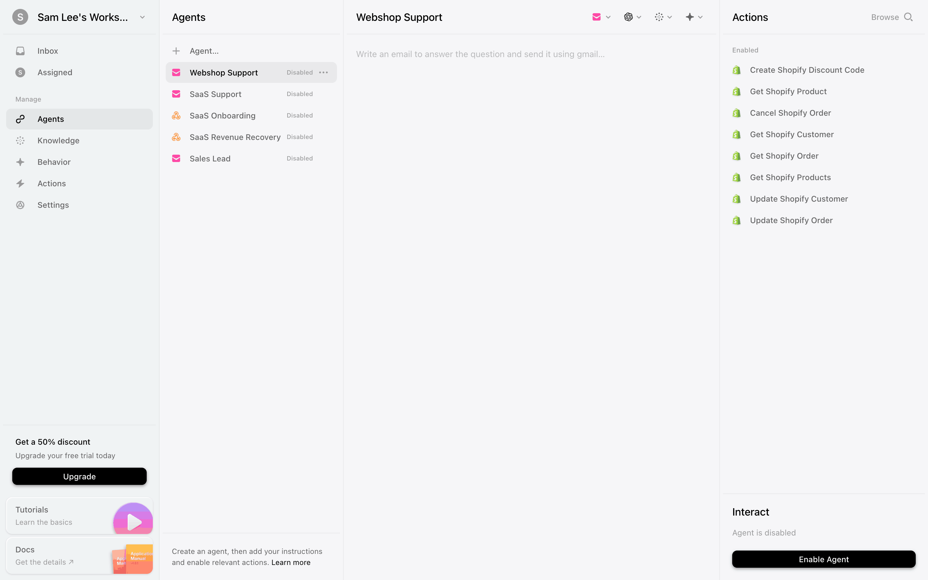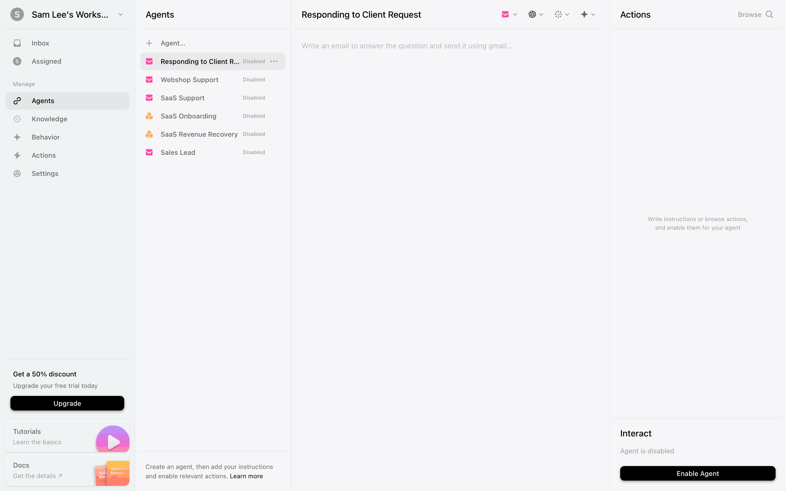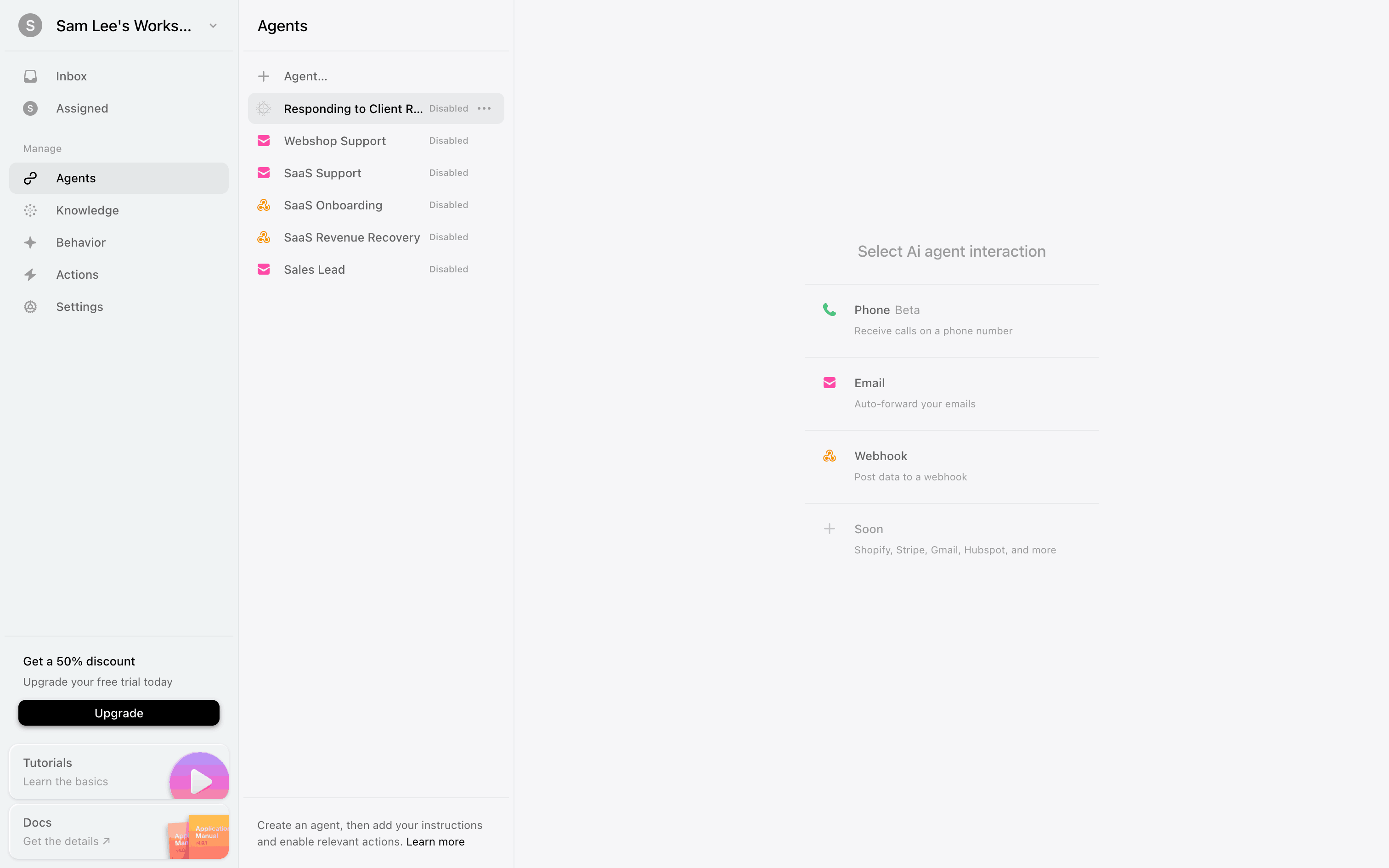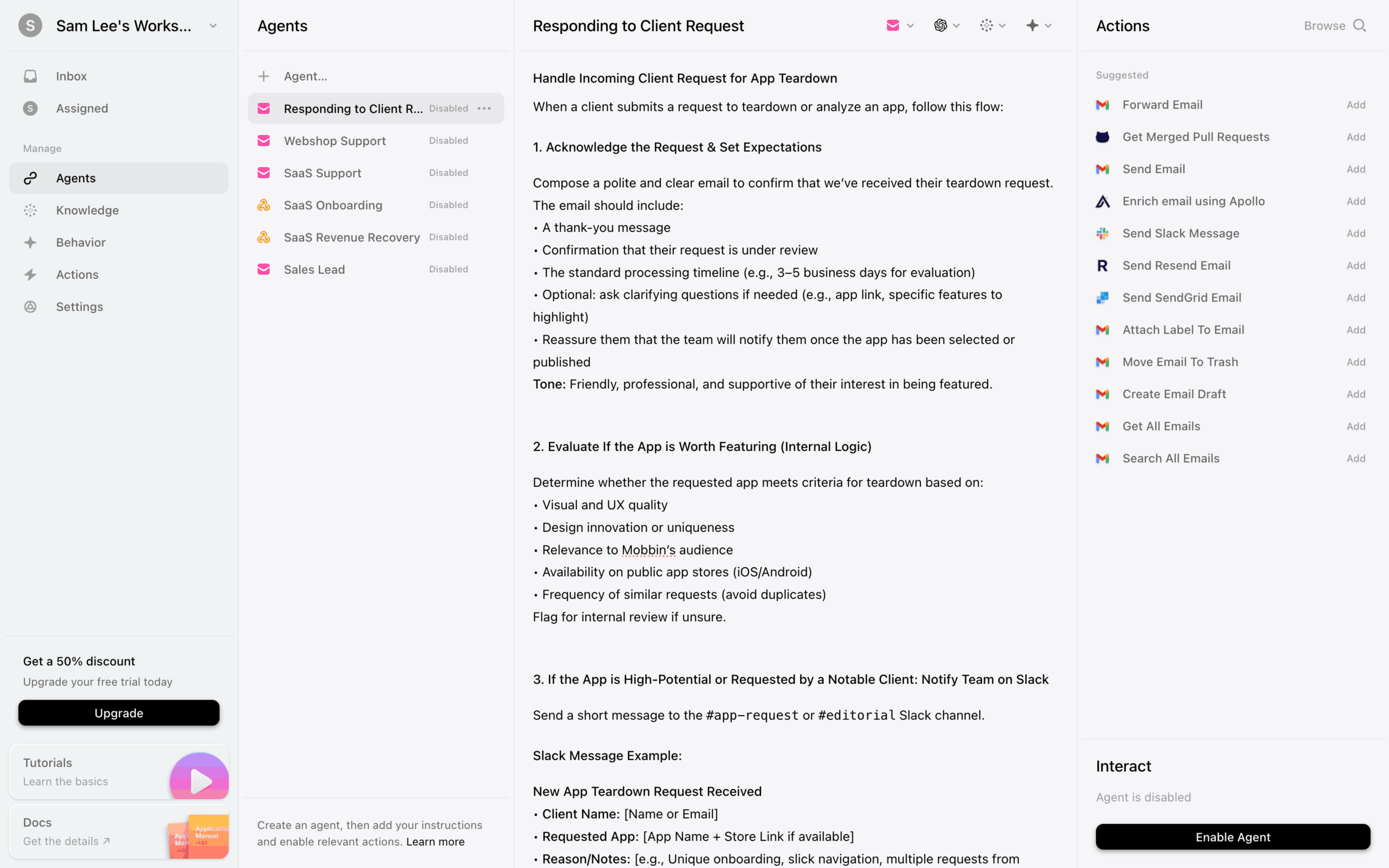 The user flow demonstrates creating an AI agent, configuring its interaction method and setting up its workflow. The process involves naming the agent and defining its email responses.