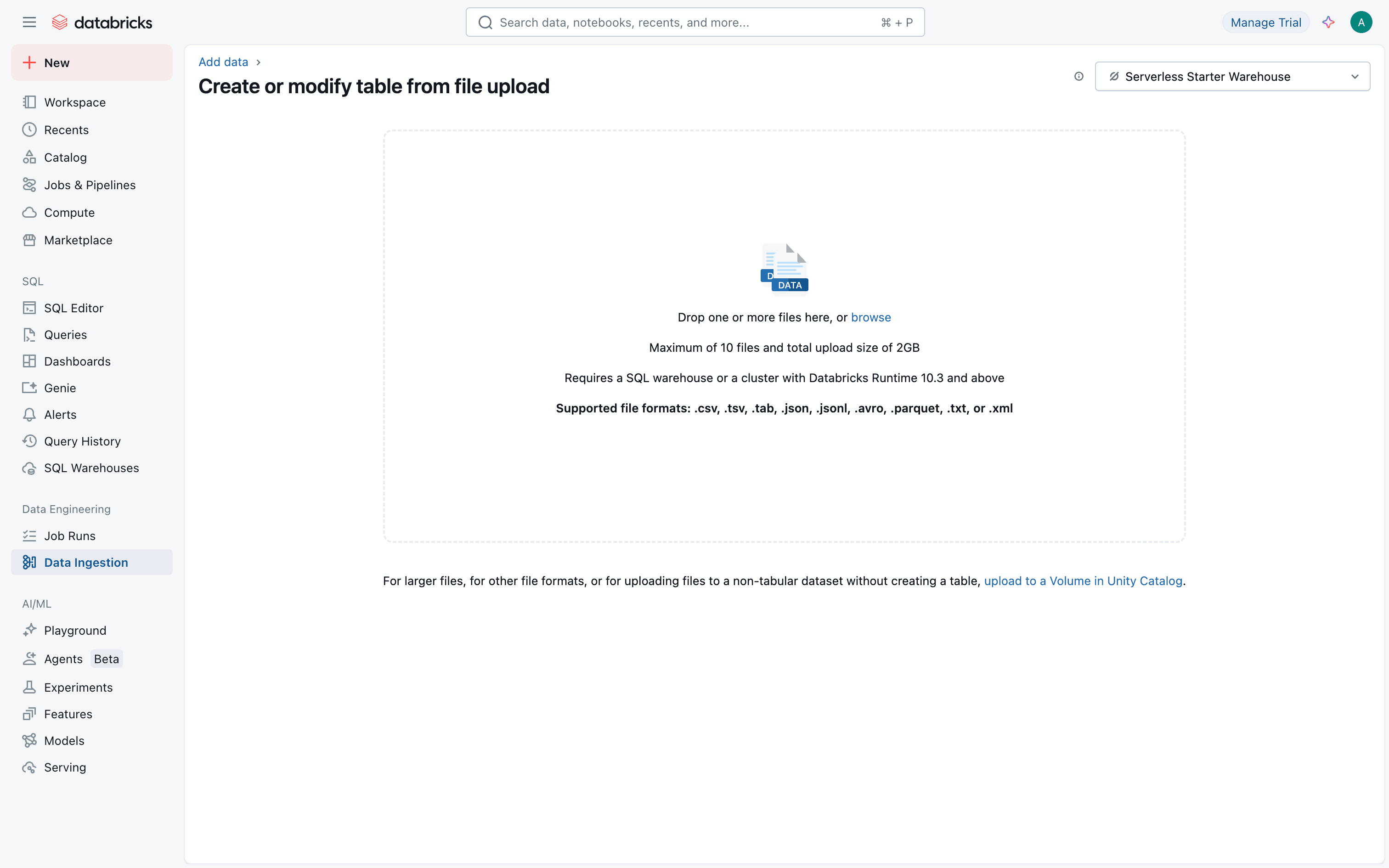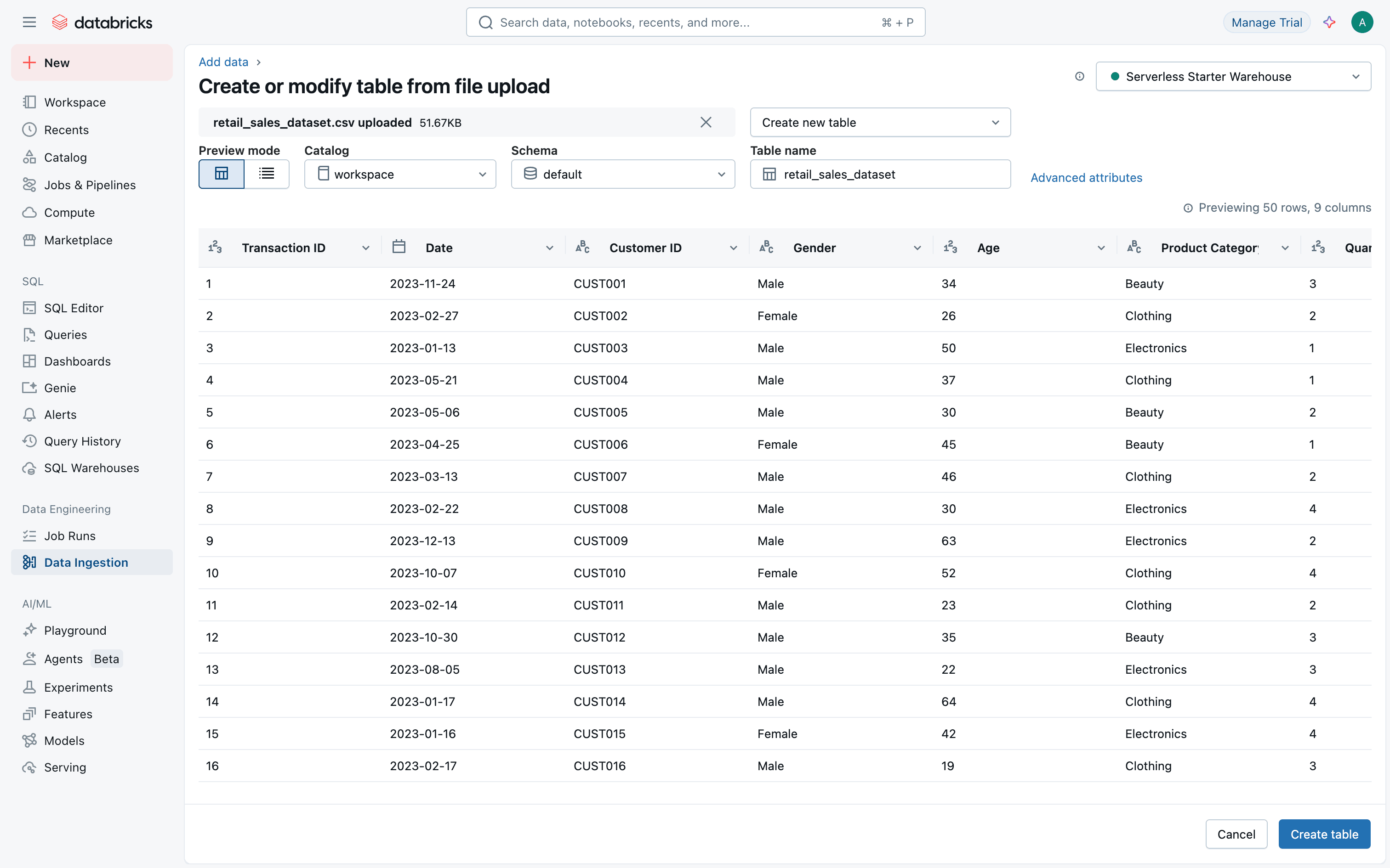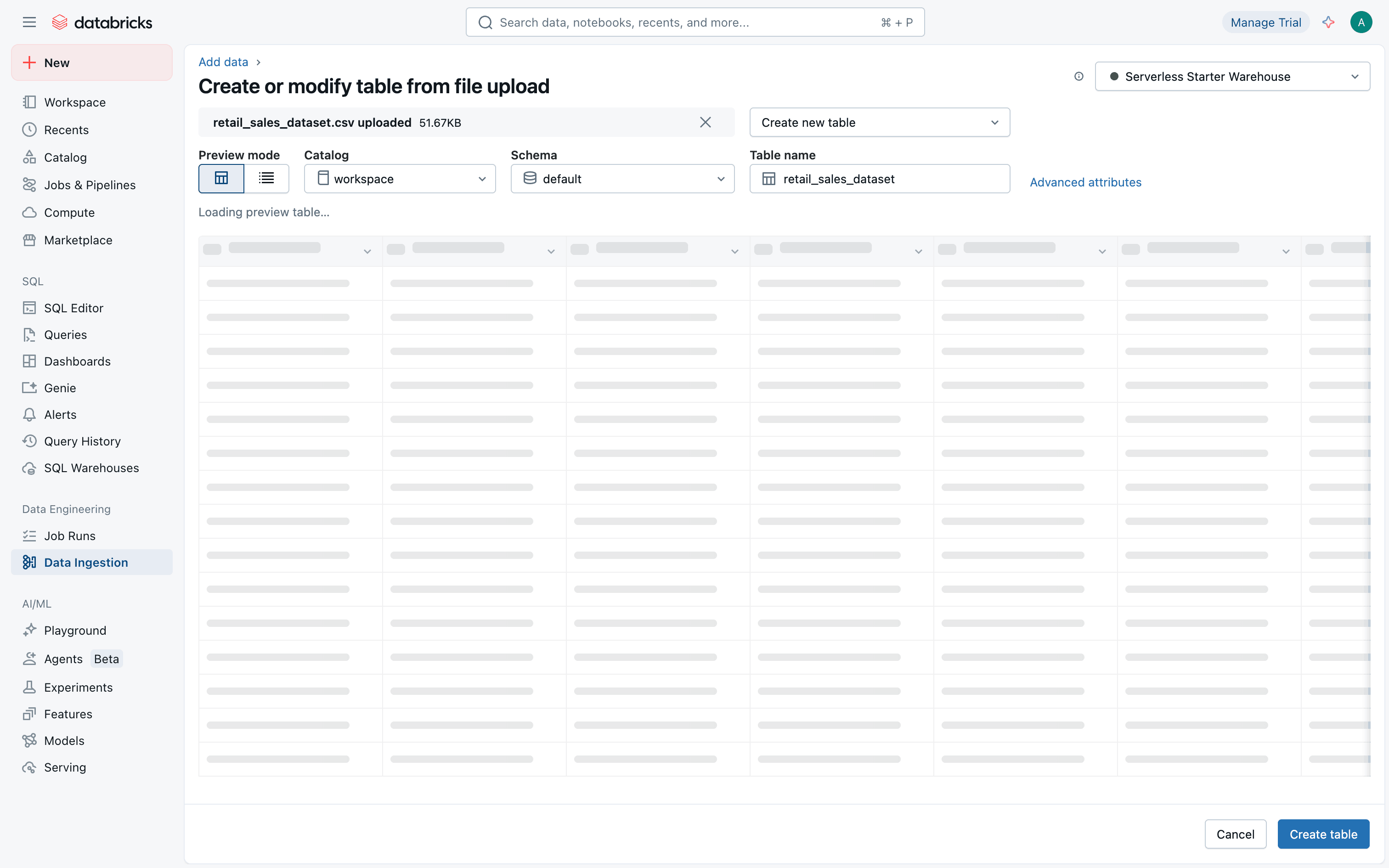 The user uploads a file, configures it, and creates a table. The user then views the created table in the catalog.