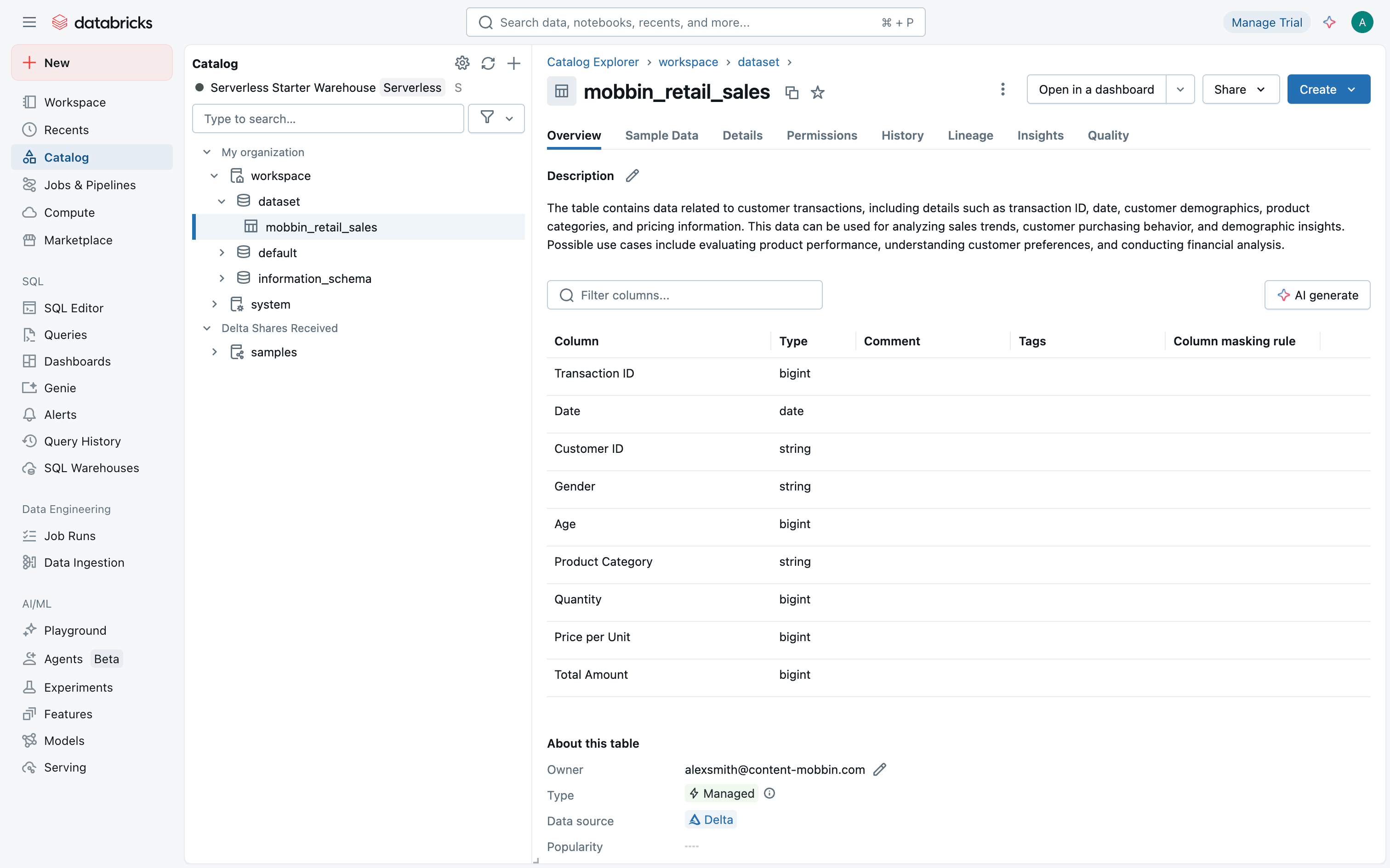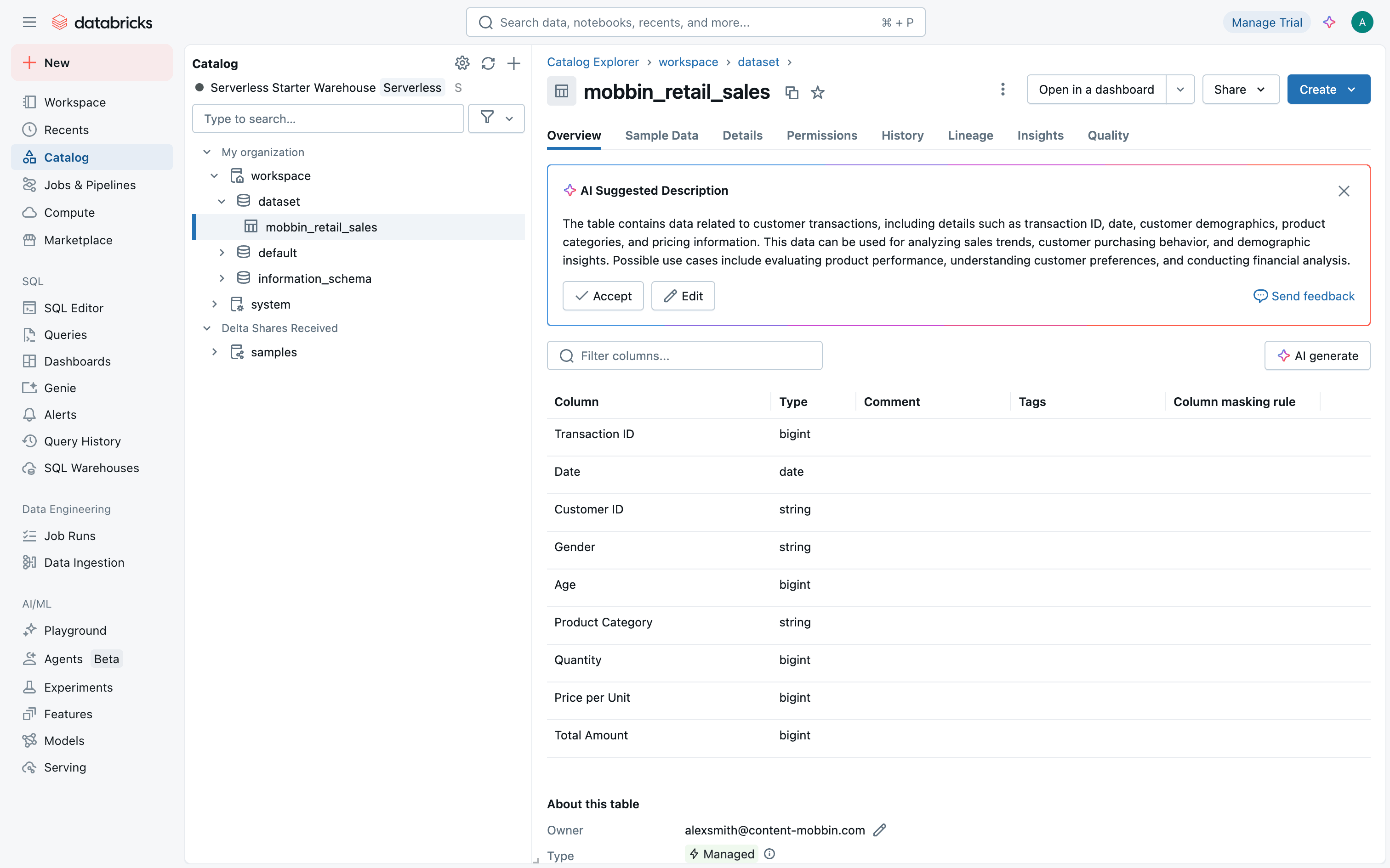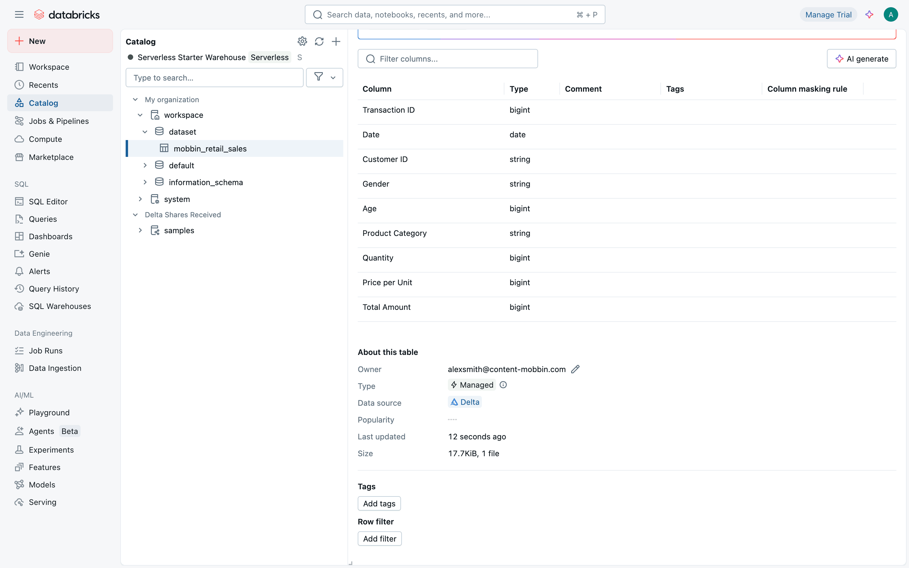 The user uploads a file, configures it, and creates a table. The user then views the created table in the catalog.