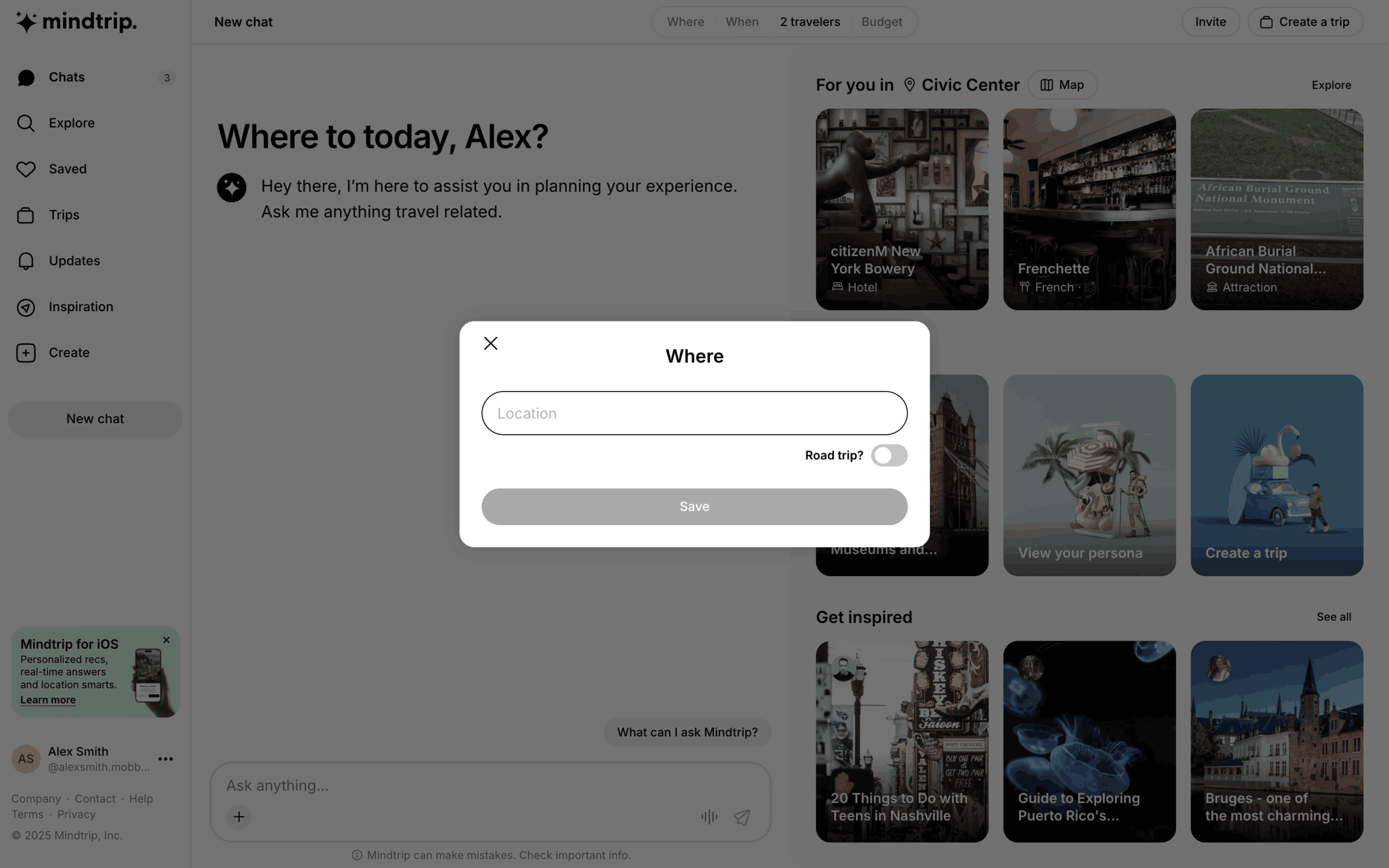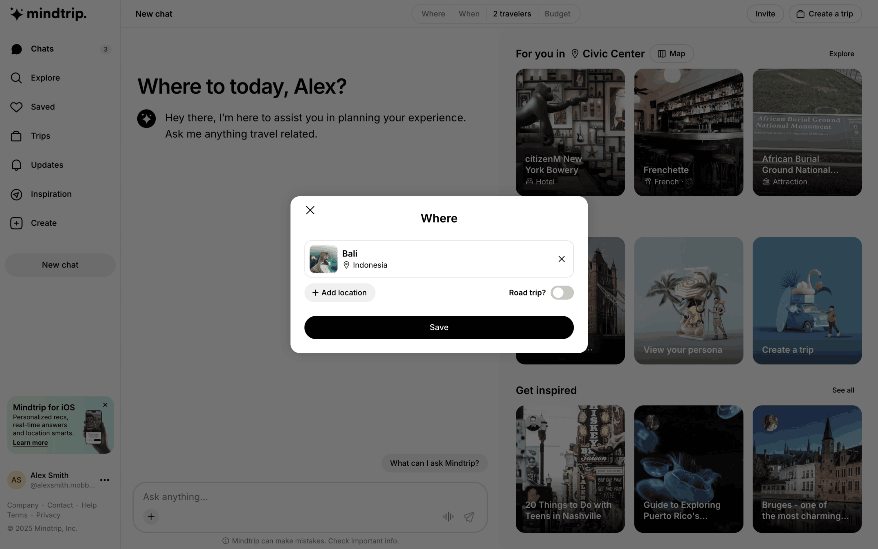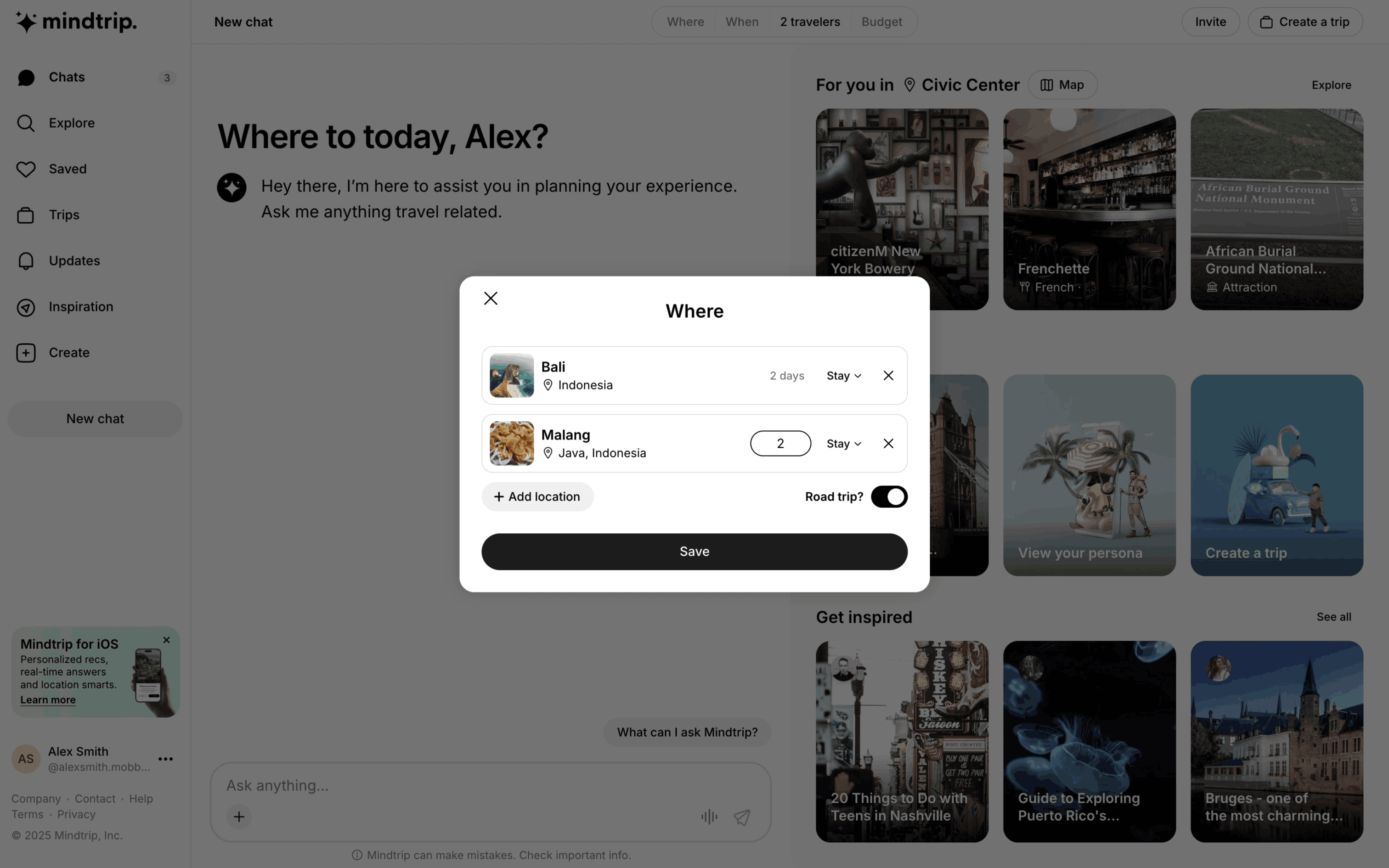 The user adds multiple locations to a trip, specifies the duration of stay, and views them on a map. The user indicates if the trip is a road trip.