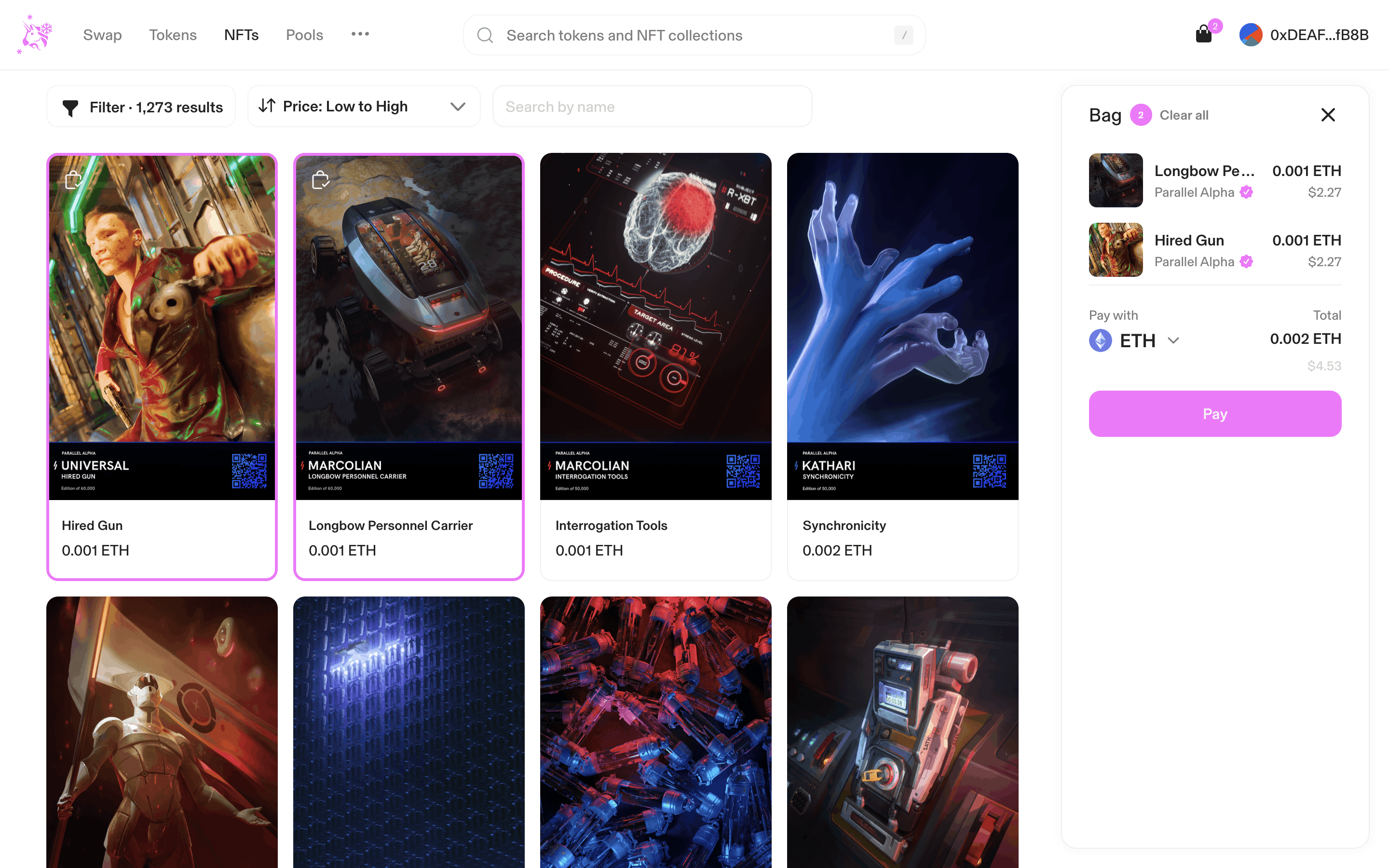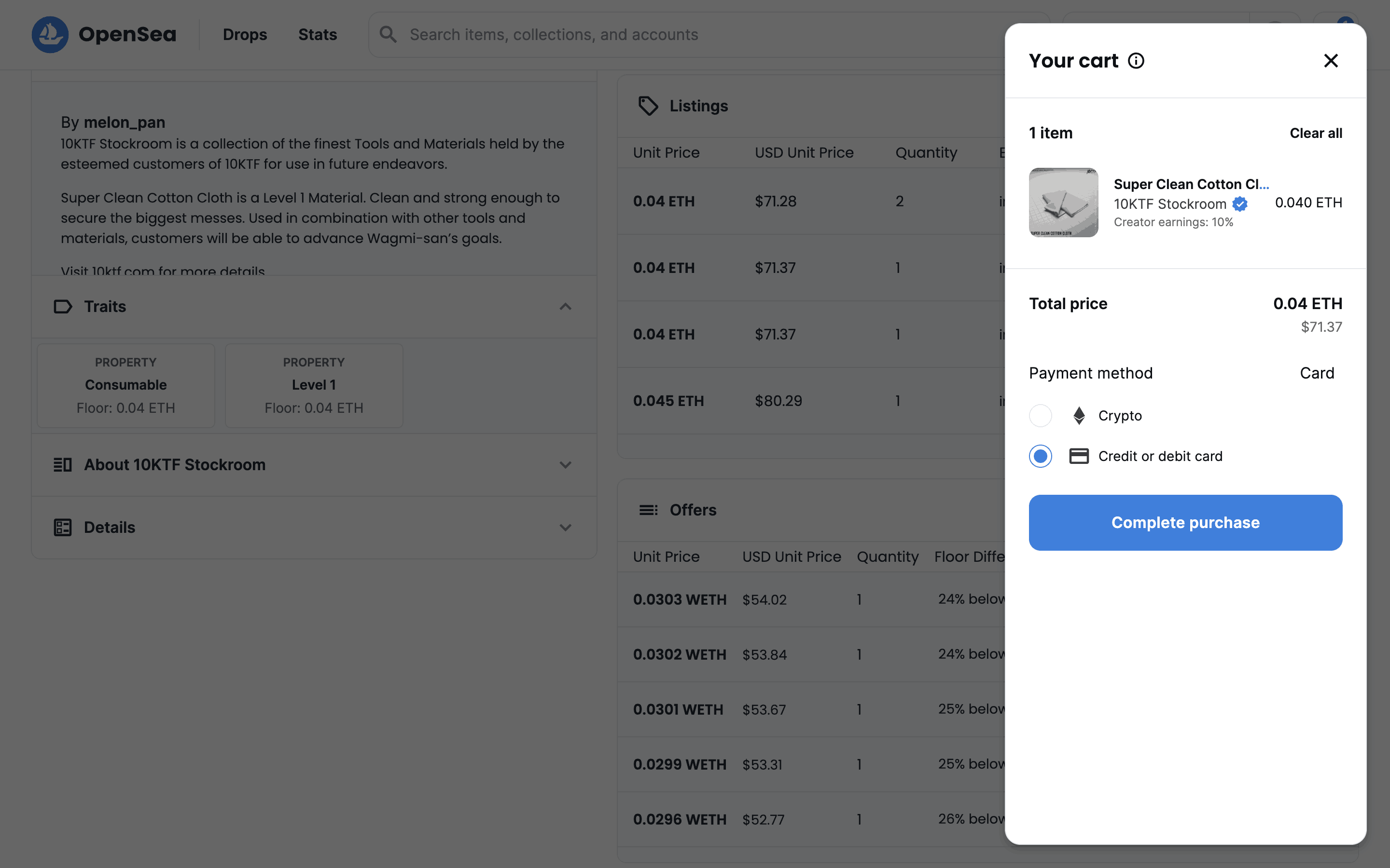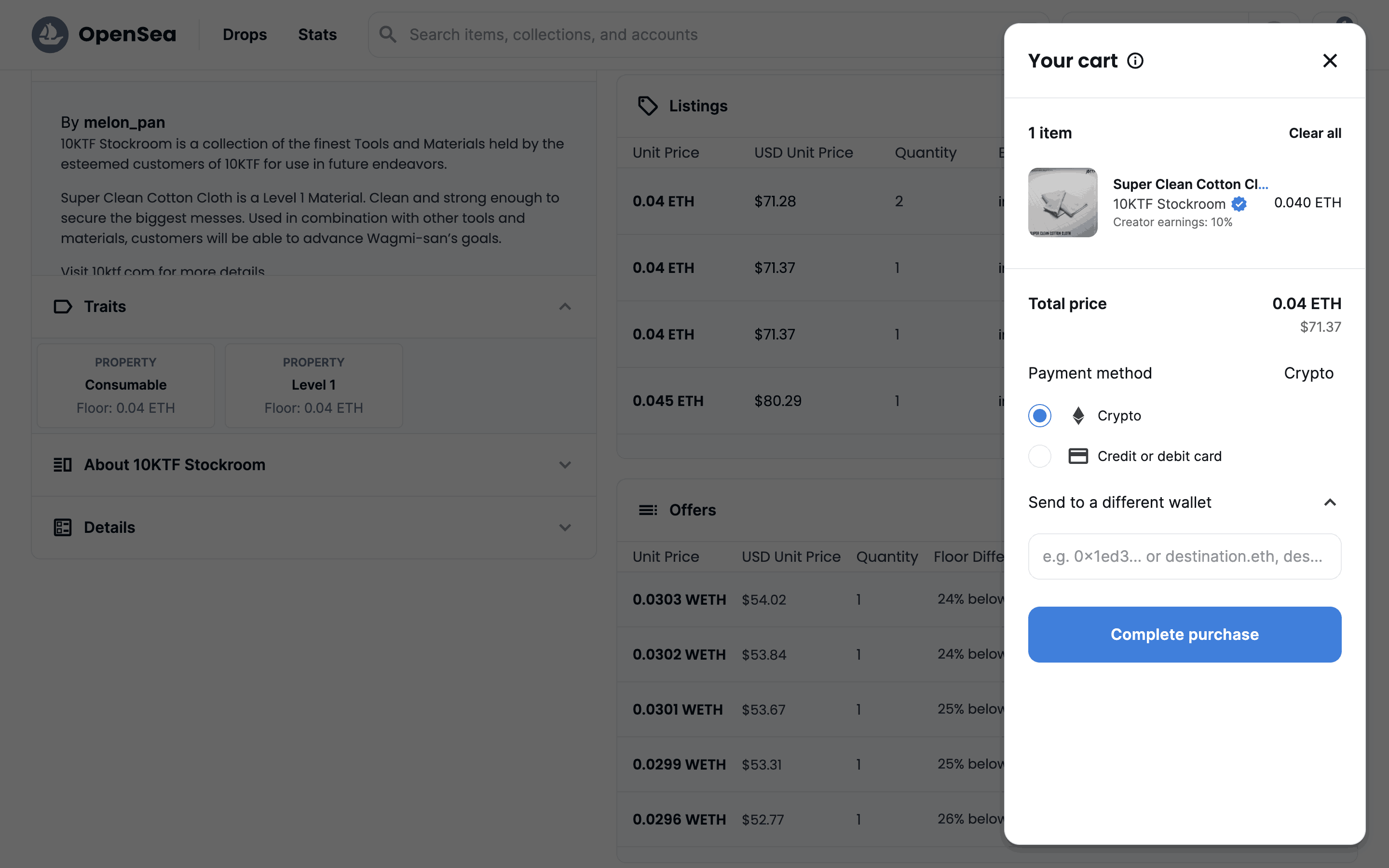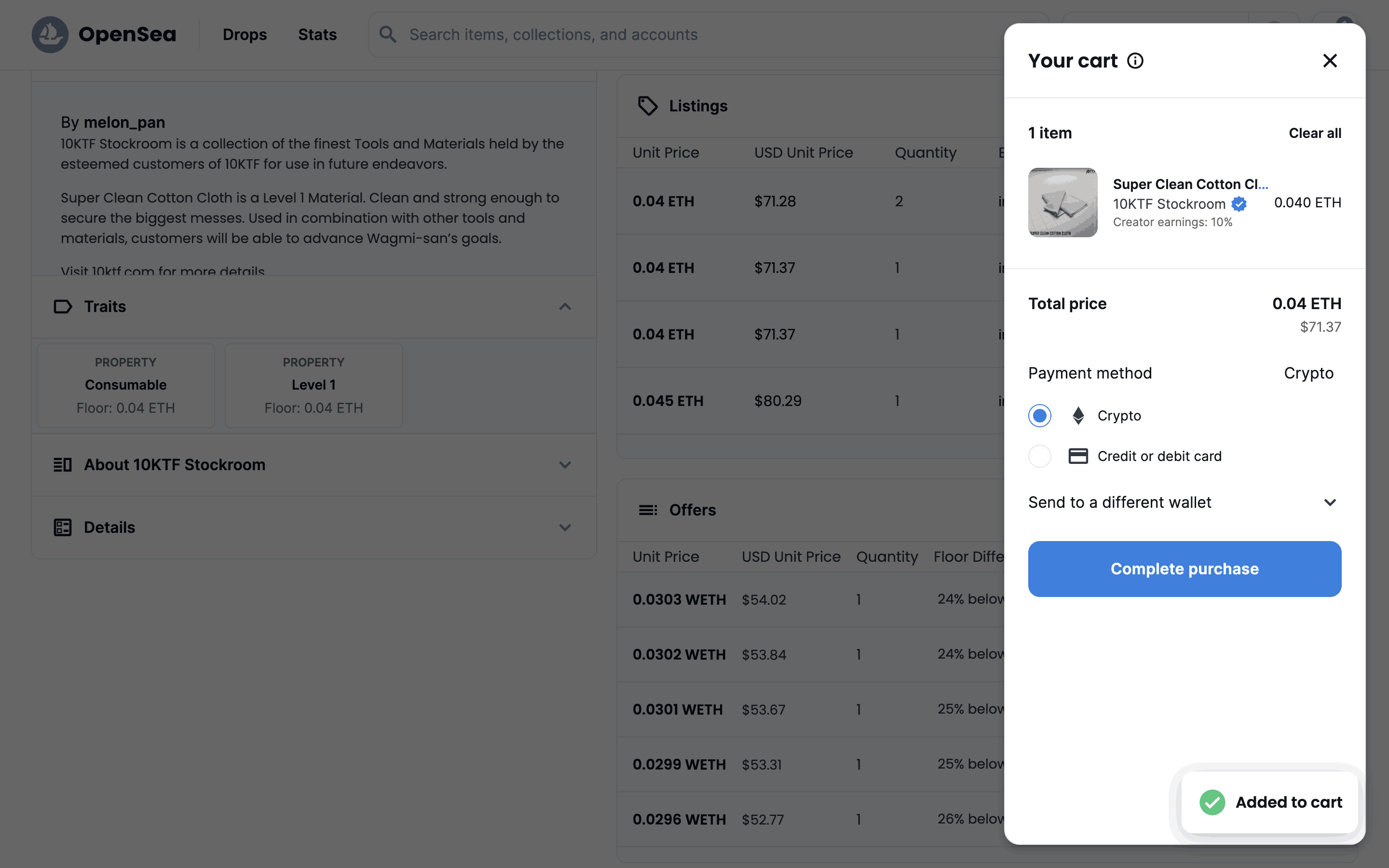 The user browses an item listing, adds an item to the cart, and then proceeds to the cart to select a payment method. The user can also choose to send the item to a different wallet.