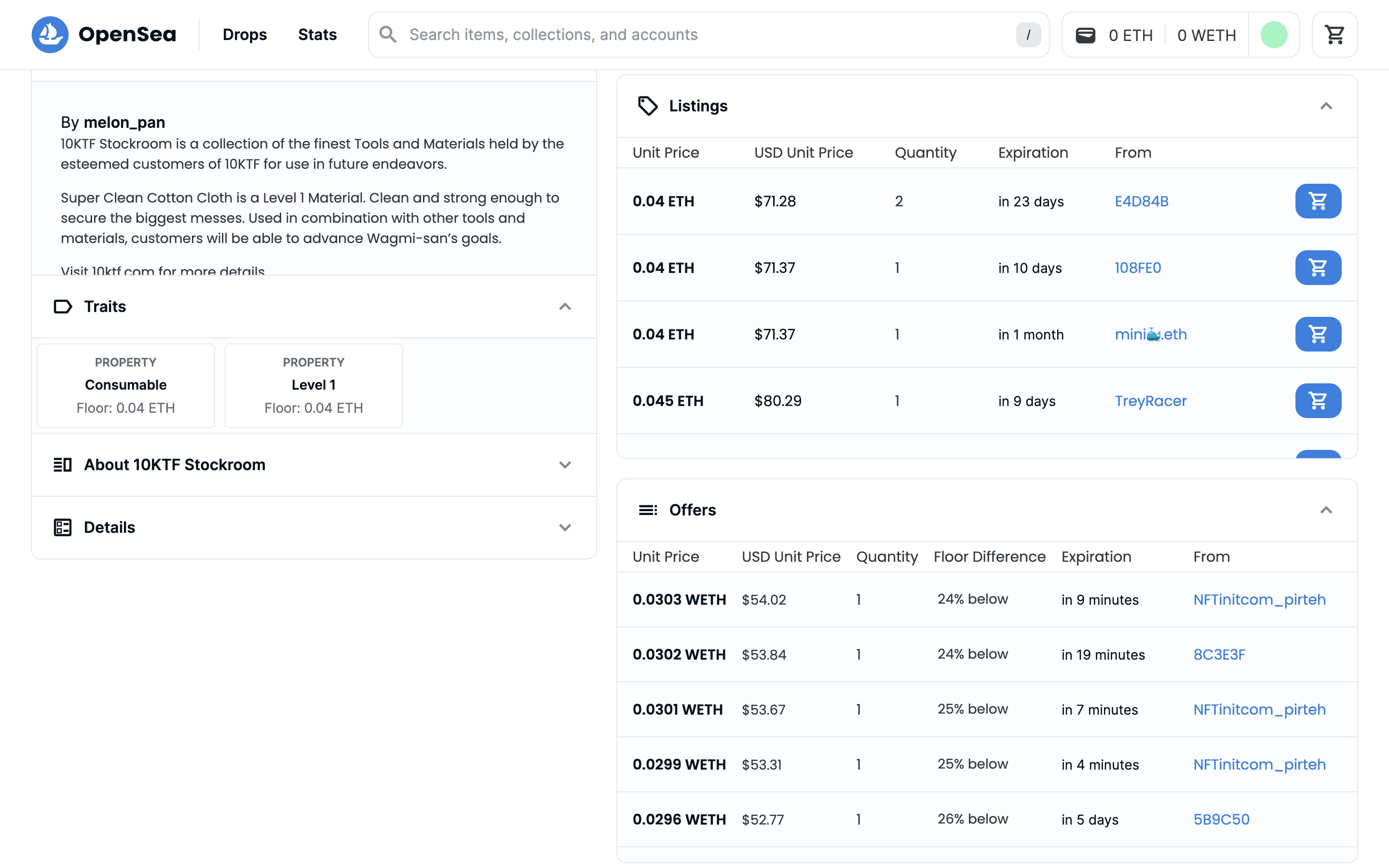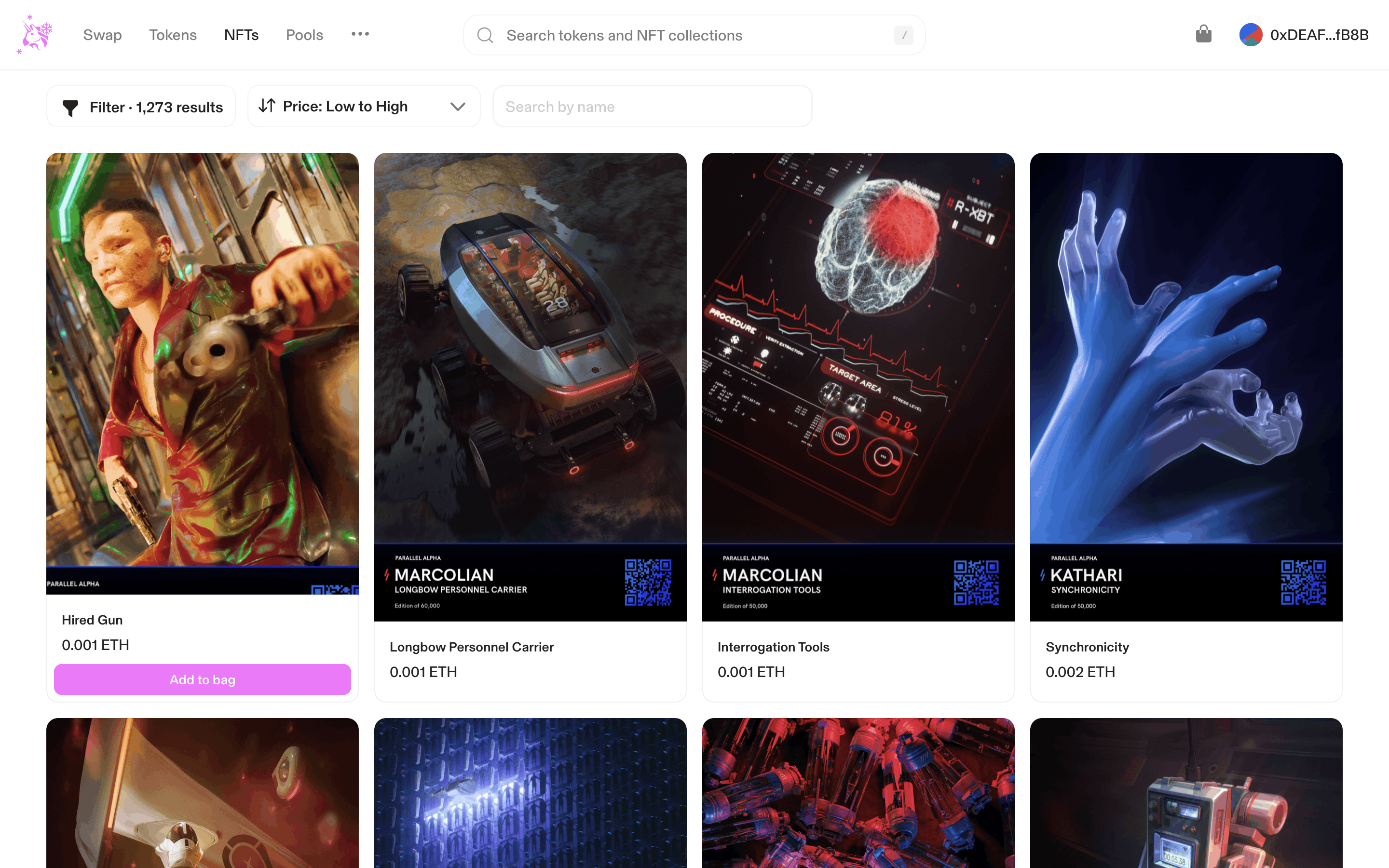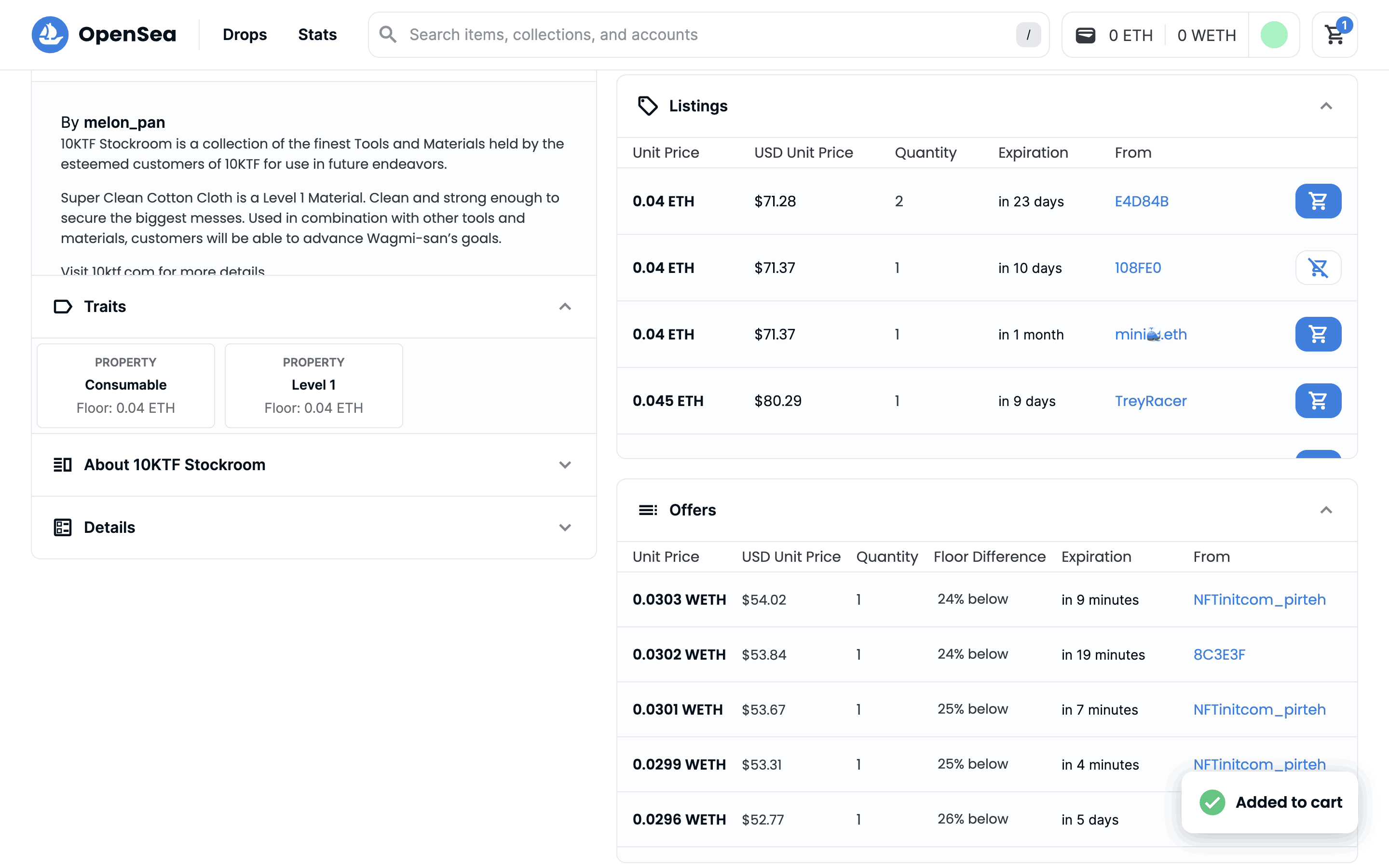The user browses an item listing, adds an item to the cart, and then proceeds to the cart to select a payment method. The user can also choose to send the item to a different wallet.