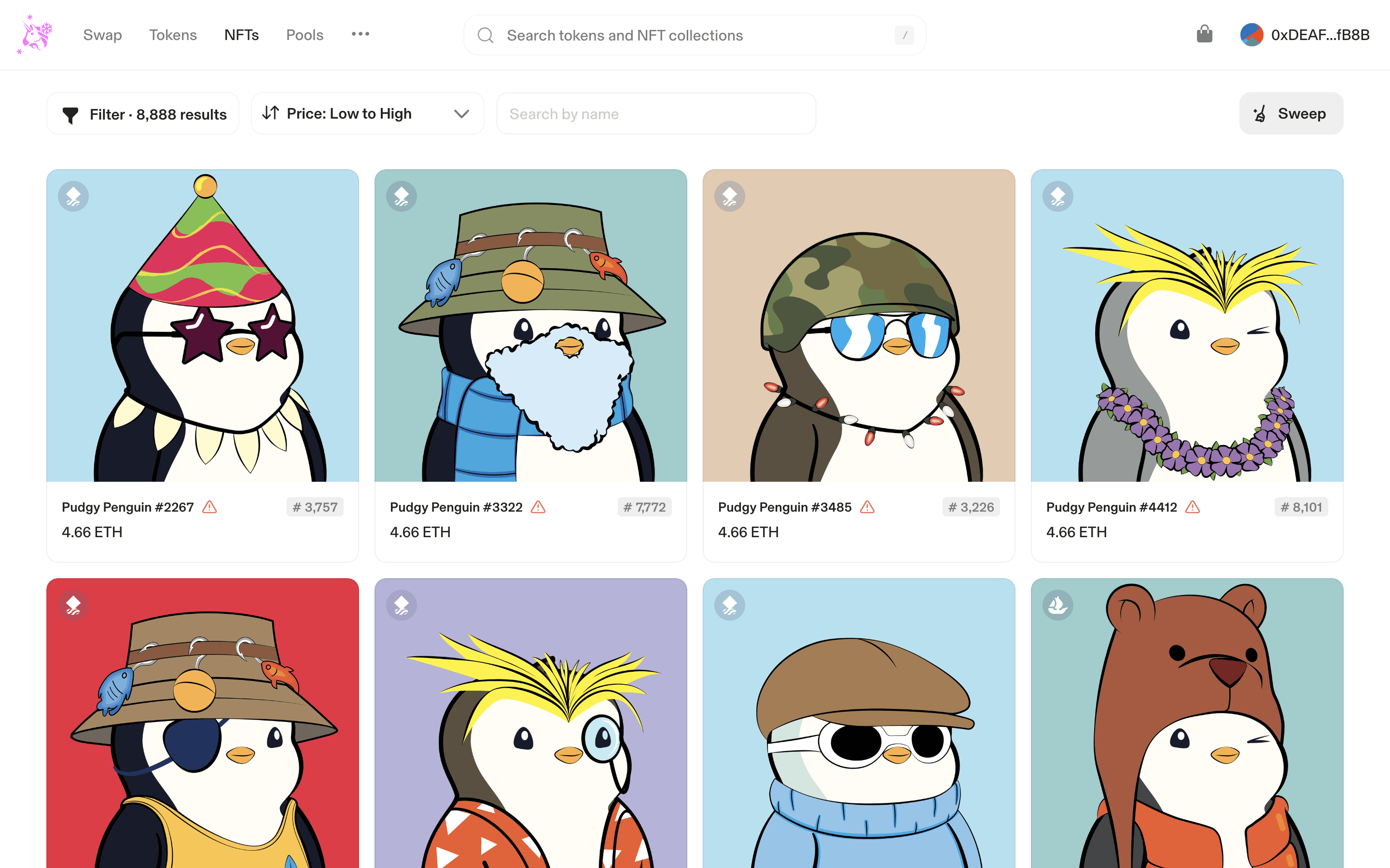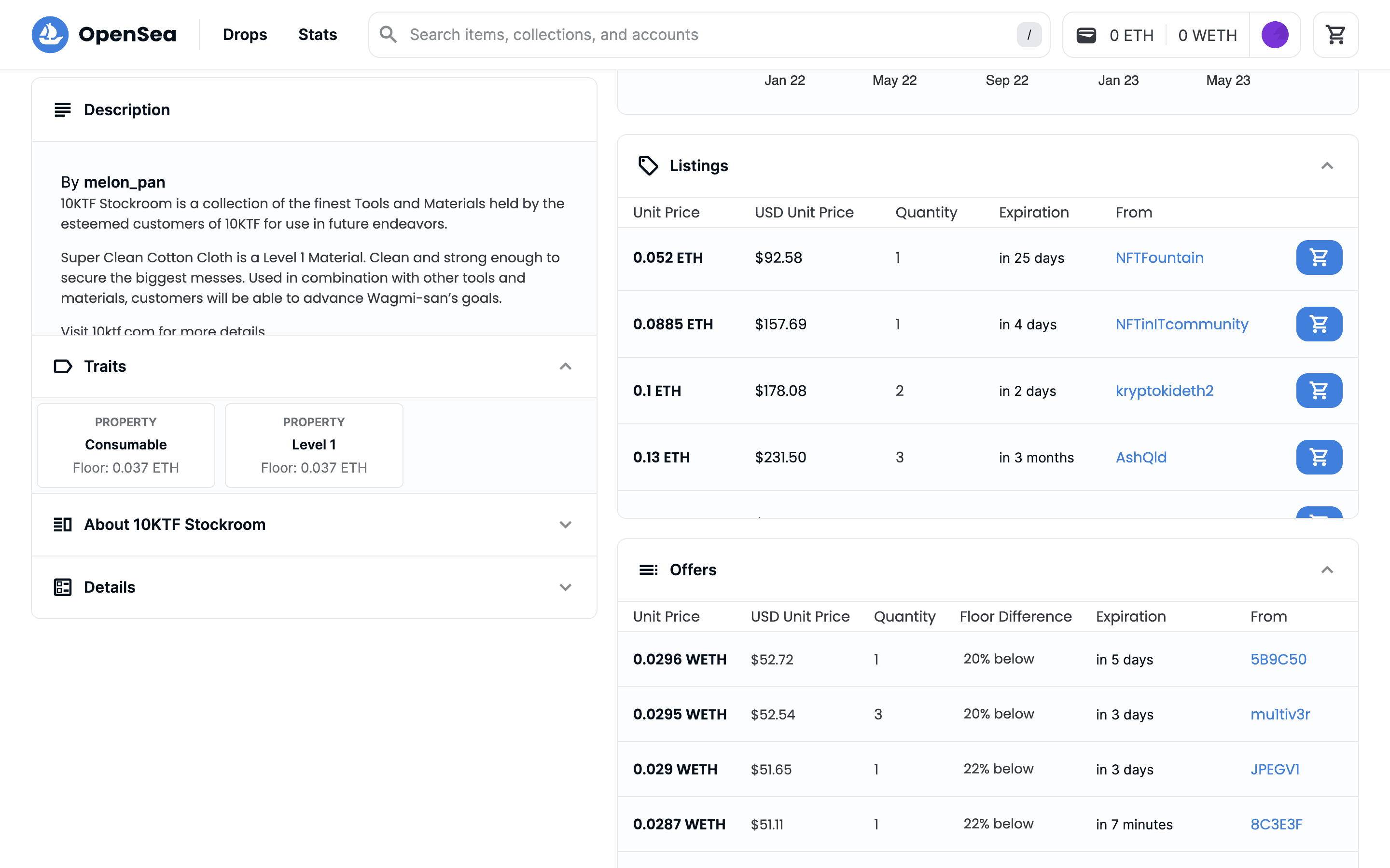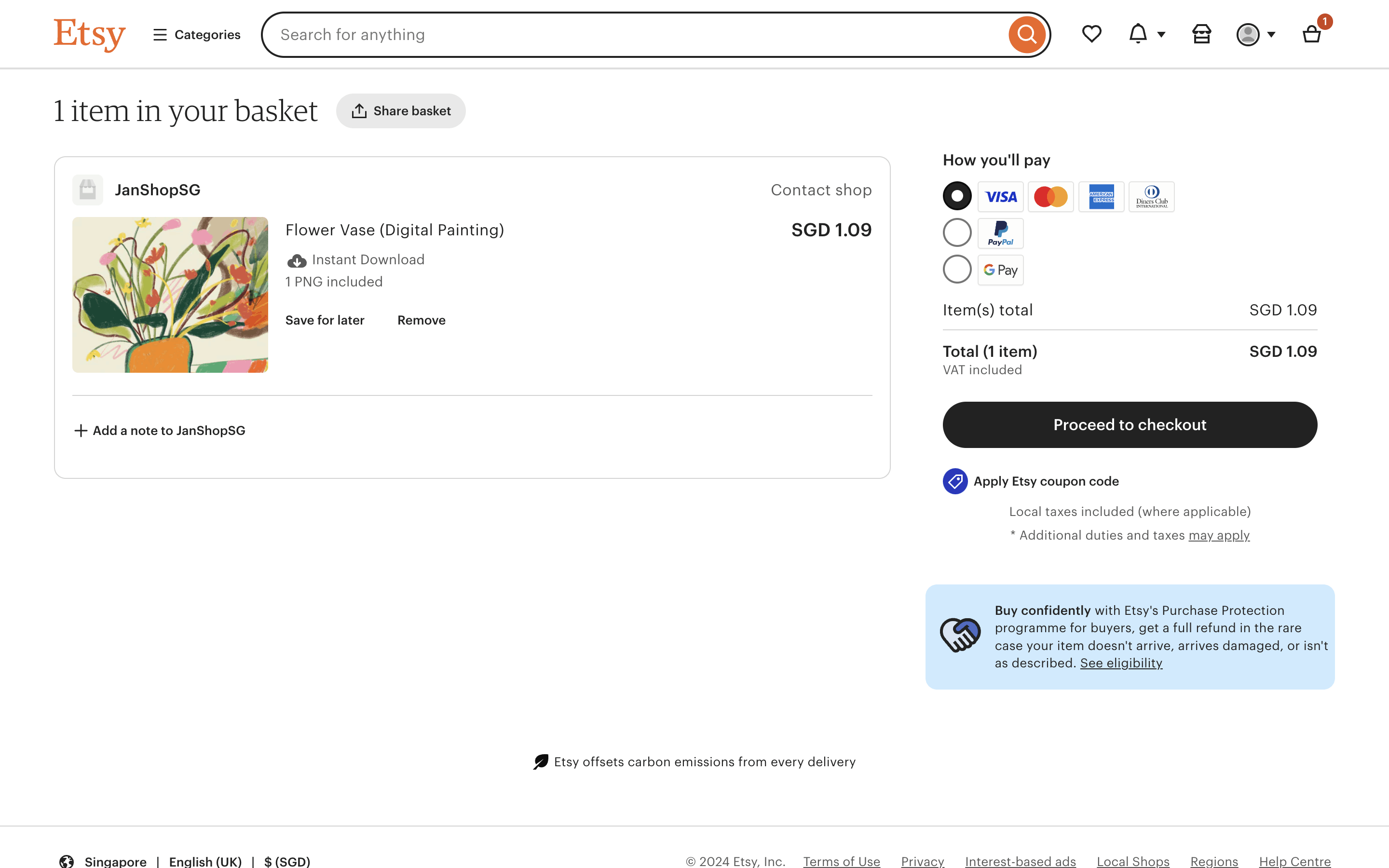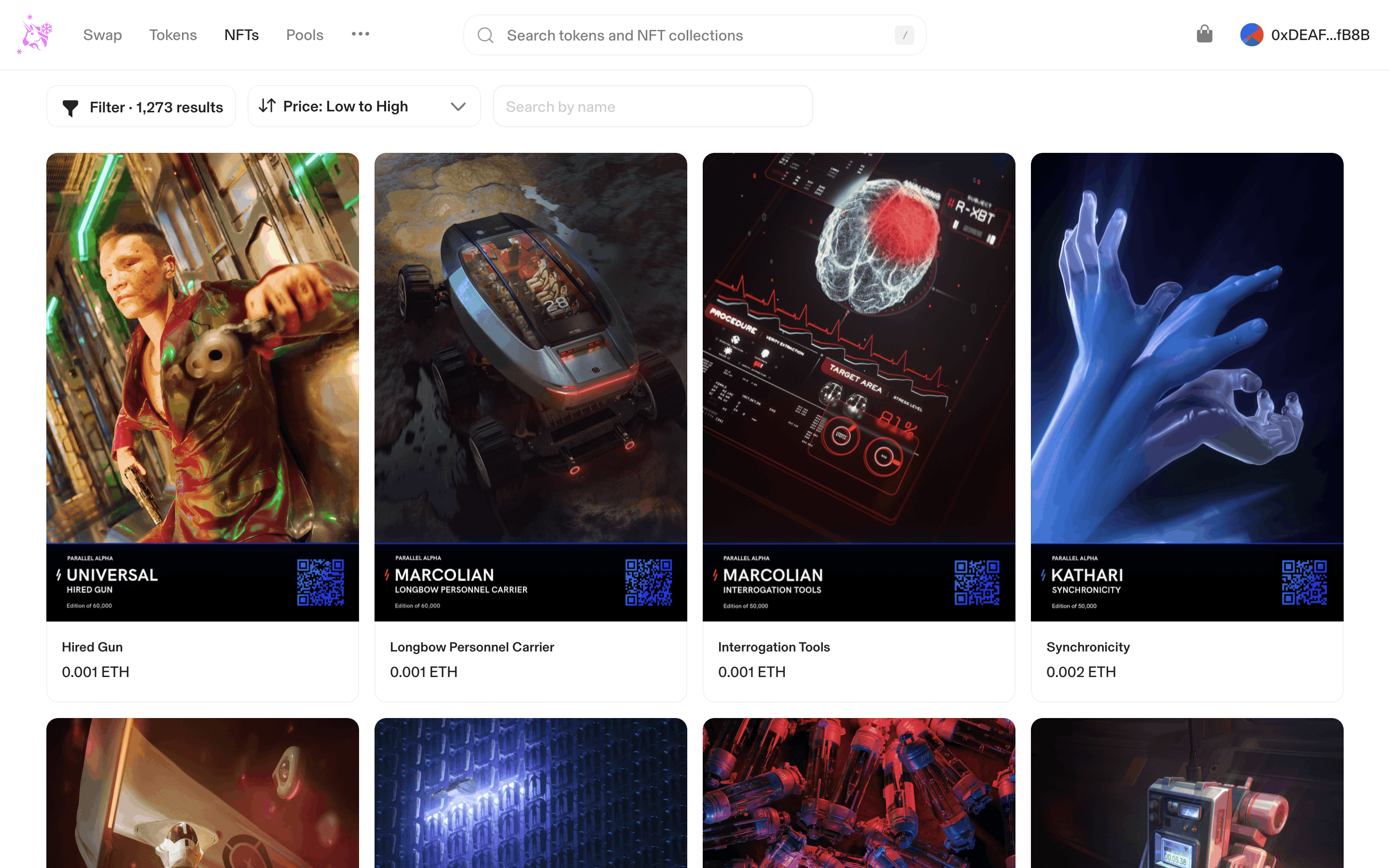 The user browses an item listing, adds an item to the cart, and then proceeds to the cart to select a payment method. The user can also choose to send the item to a different wallet.