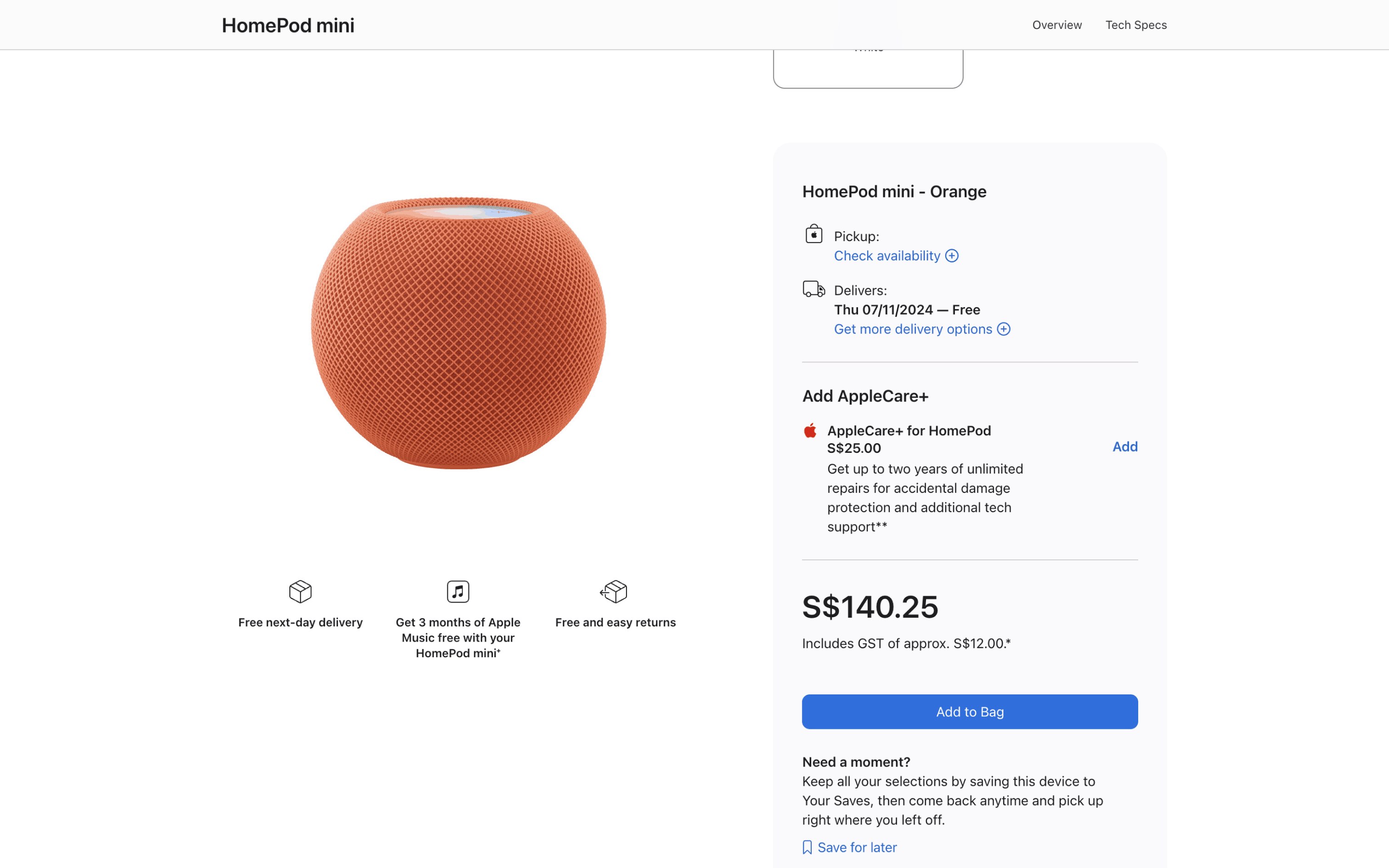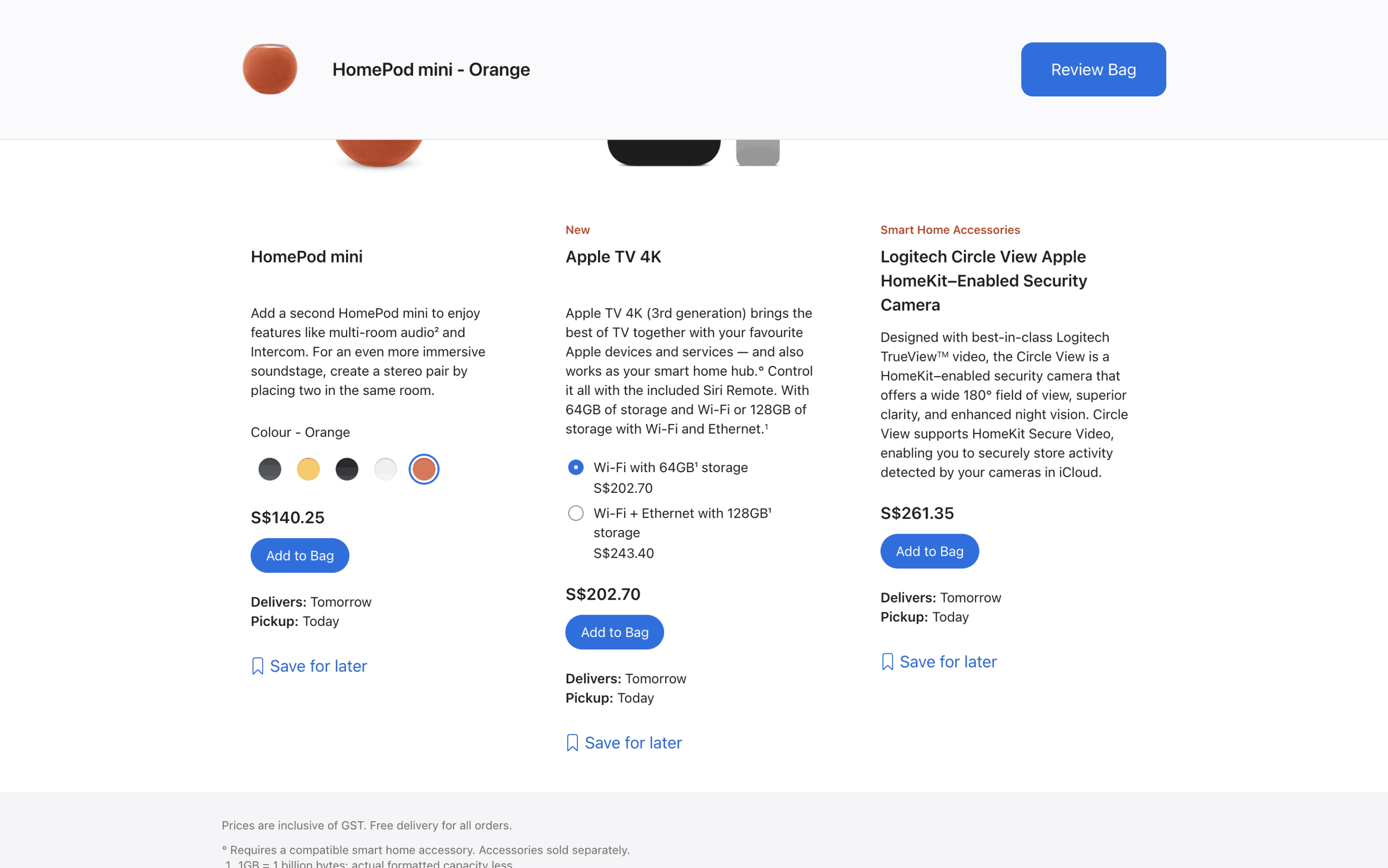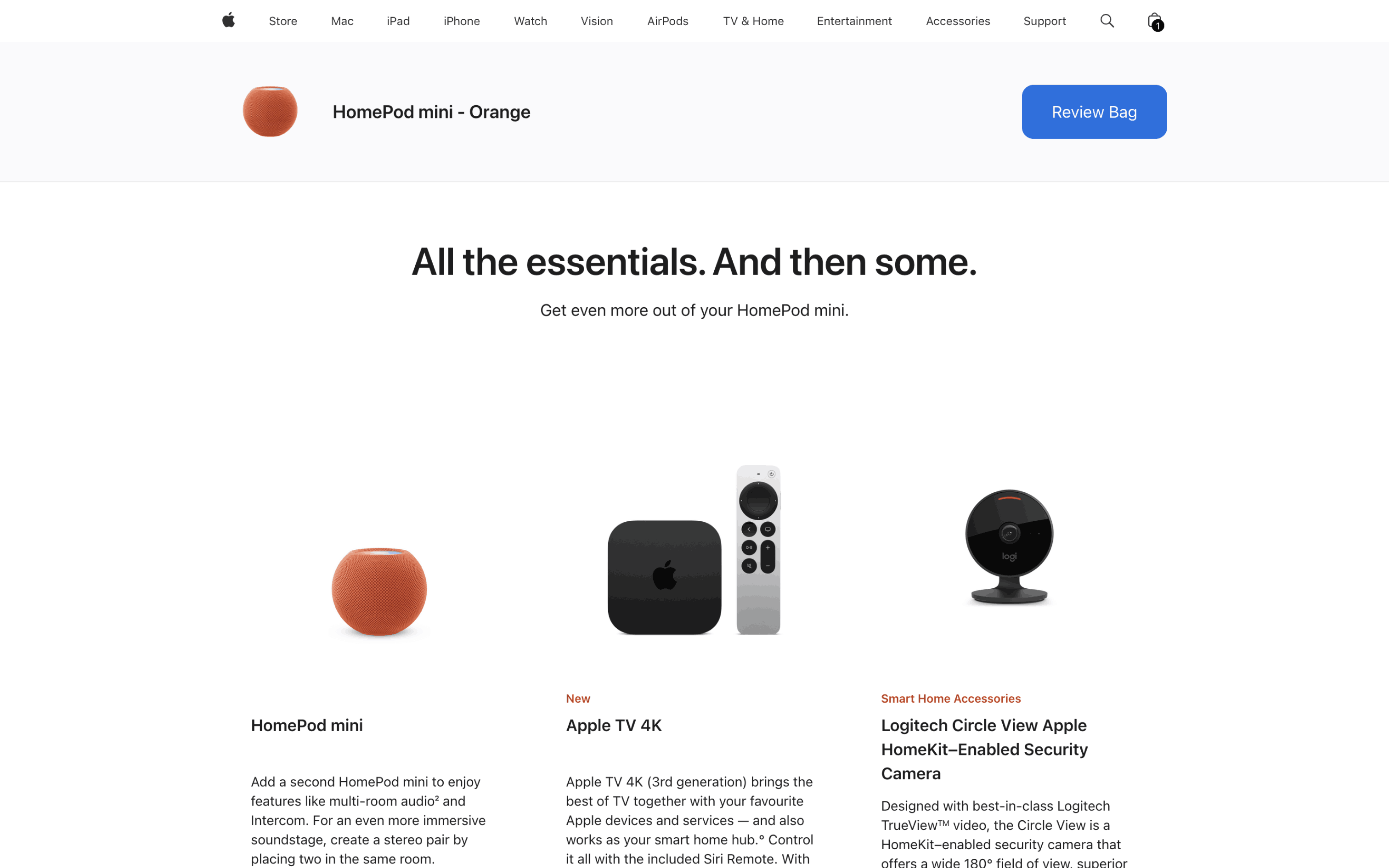 The user flow demonstrates adding a HomePod mini to the bag and viewing related product recommendations. The flow is initiated by the "Add to Bag" button.