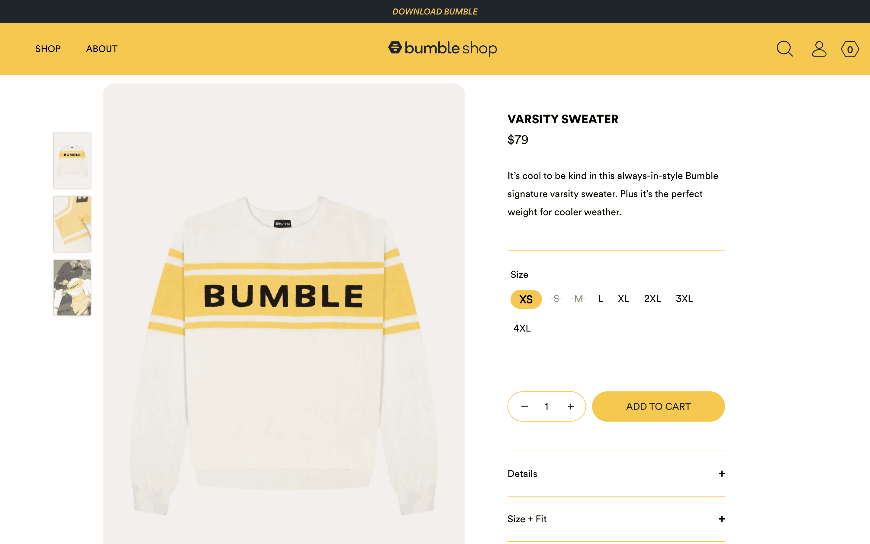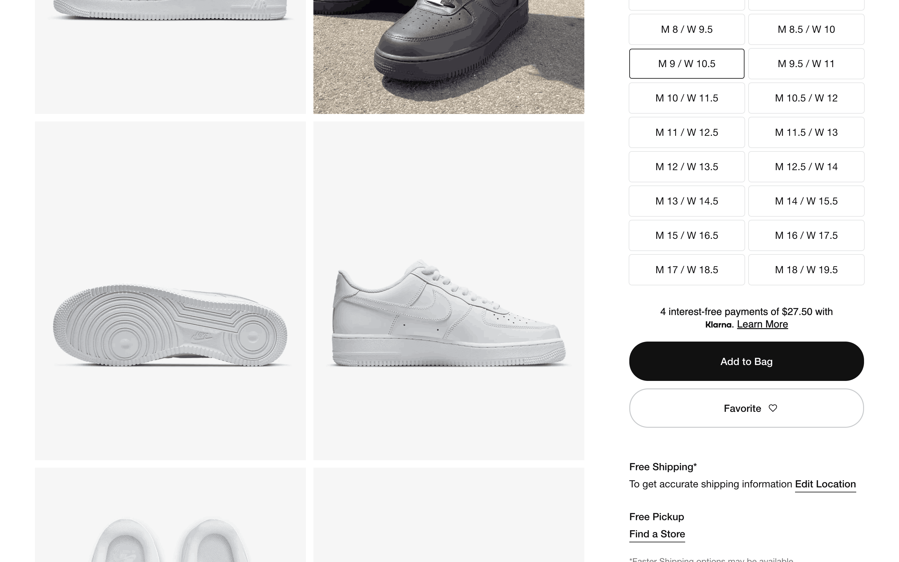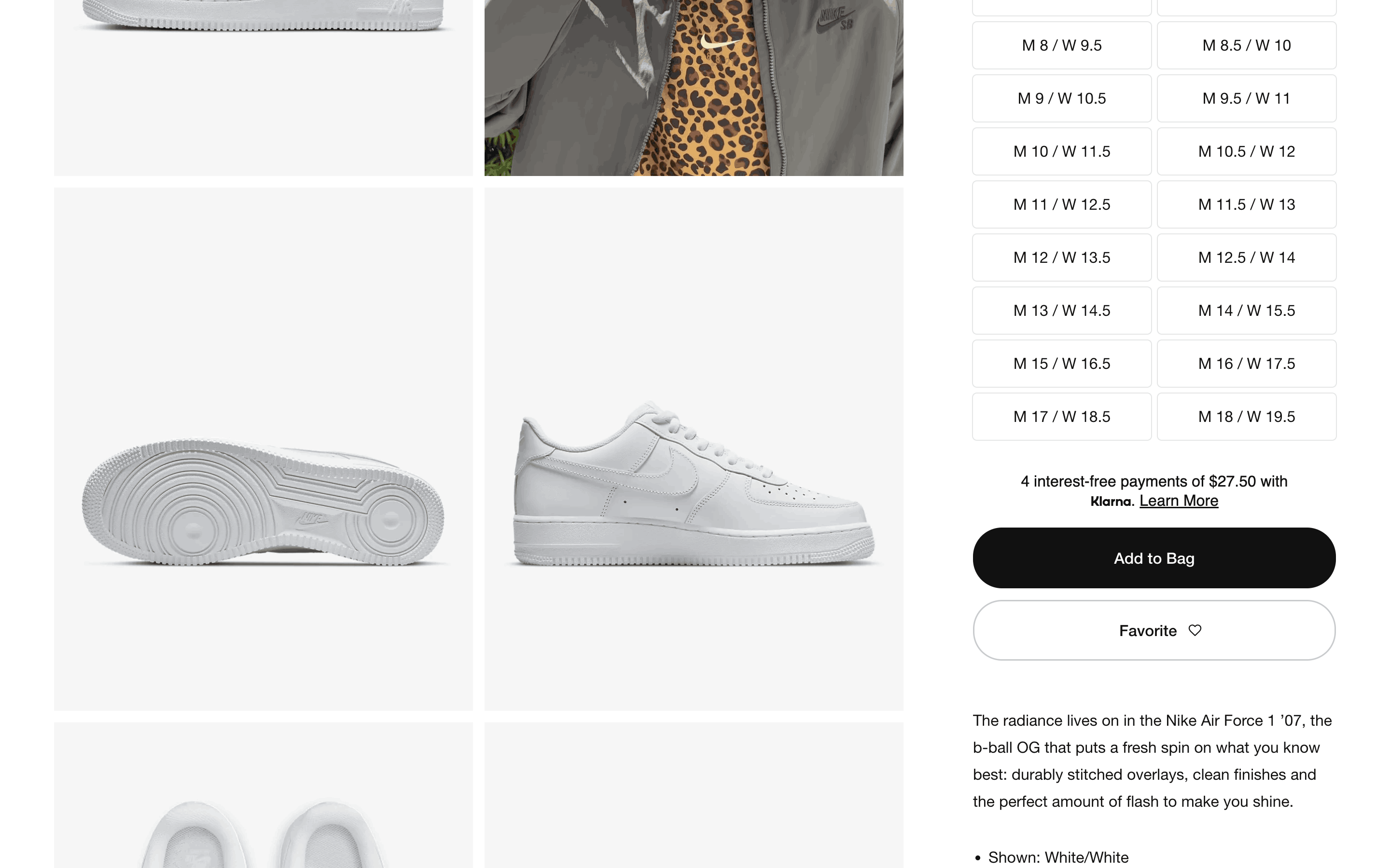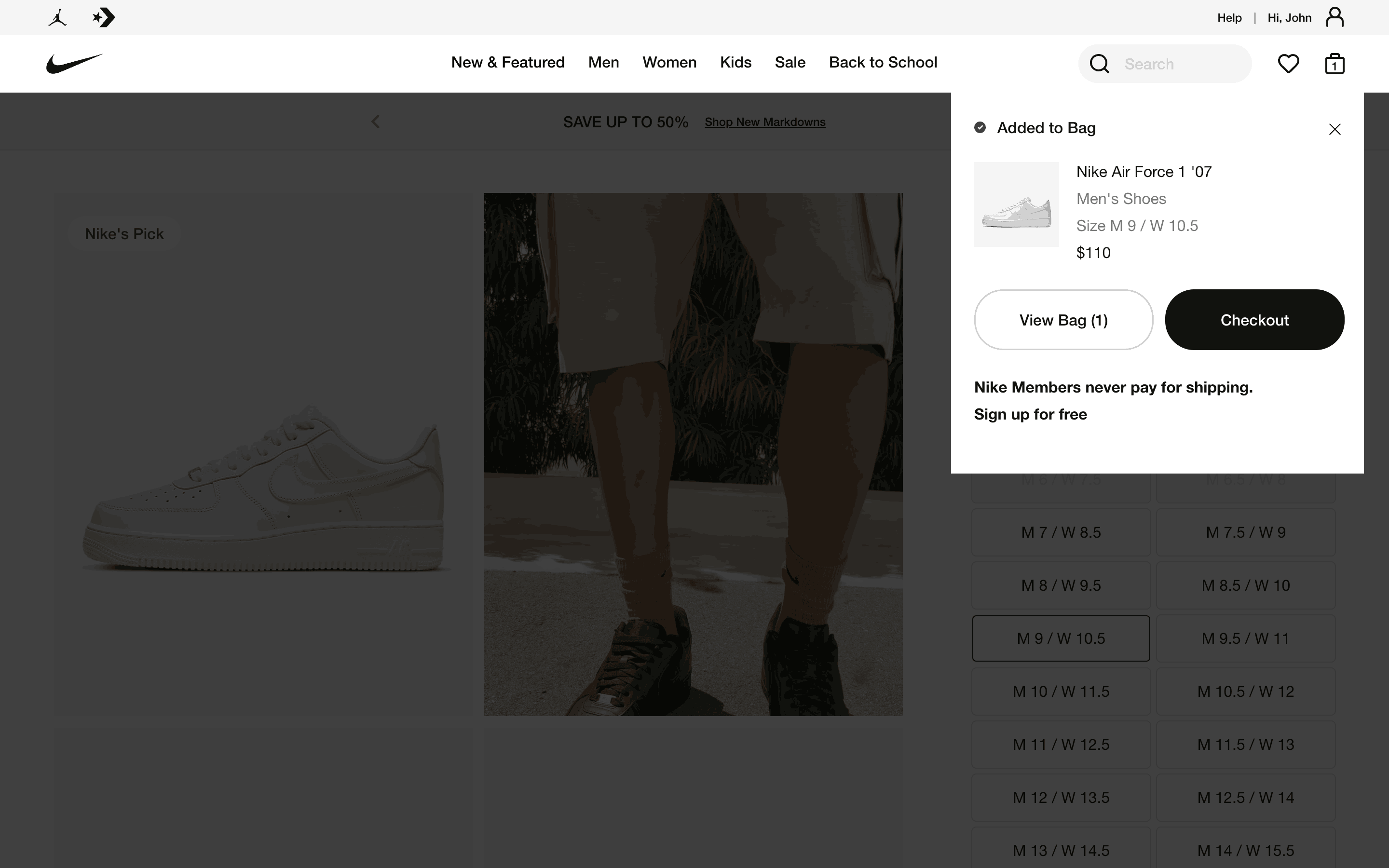 The user views a product, selects a size, and adds it to the bag. A confirmation message then appears with options to view the bag or checkout.