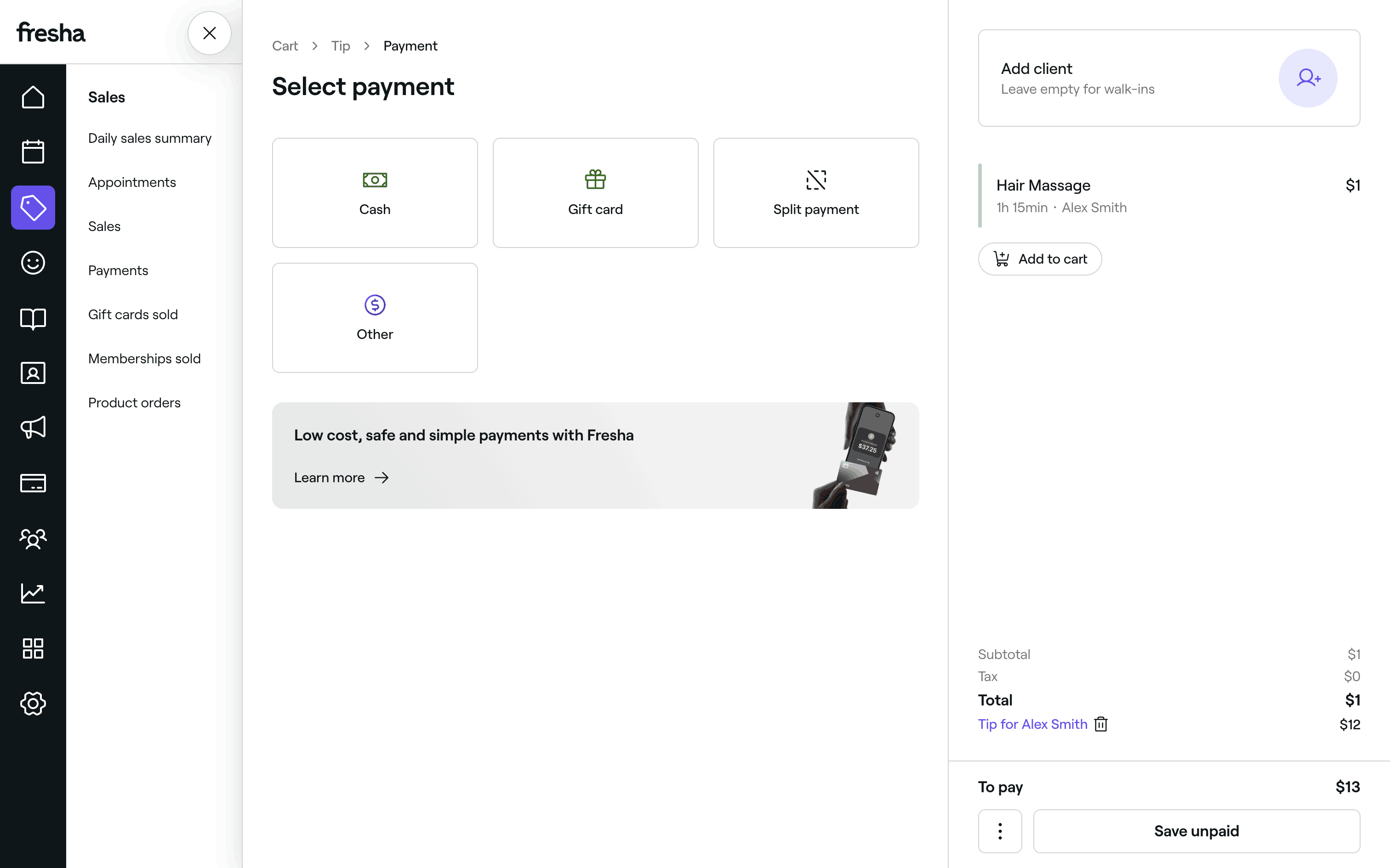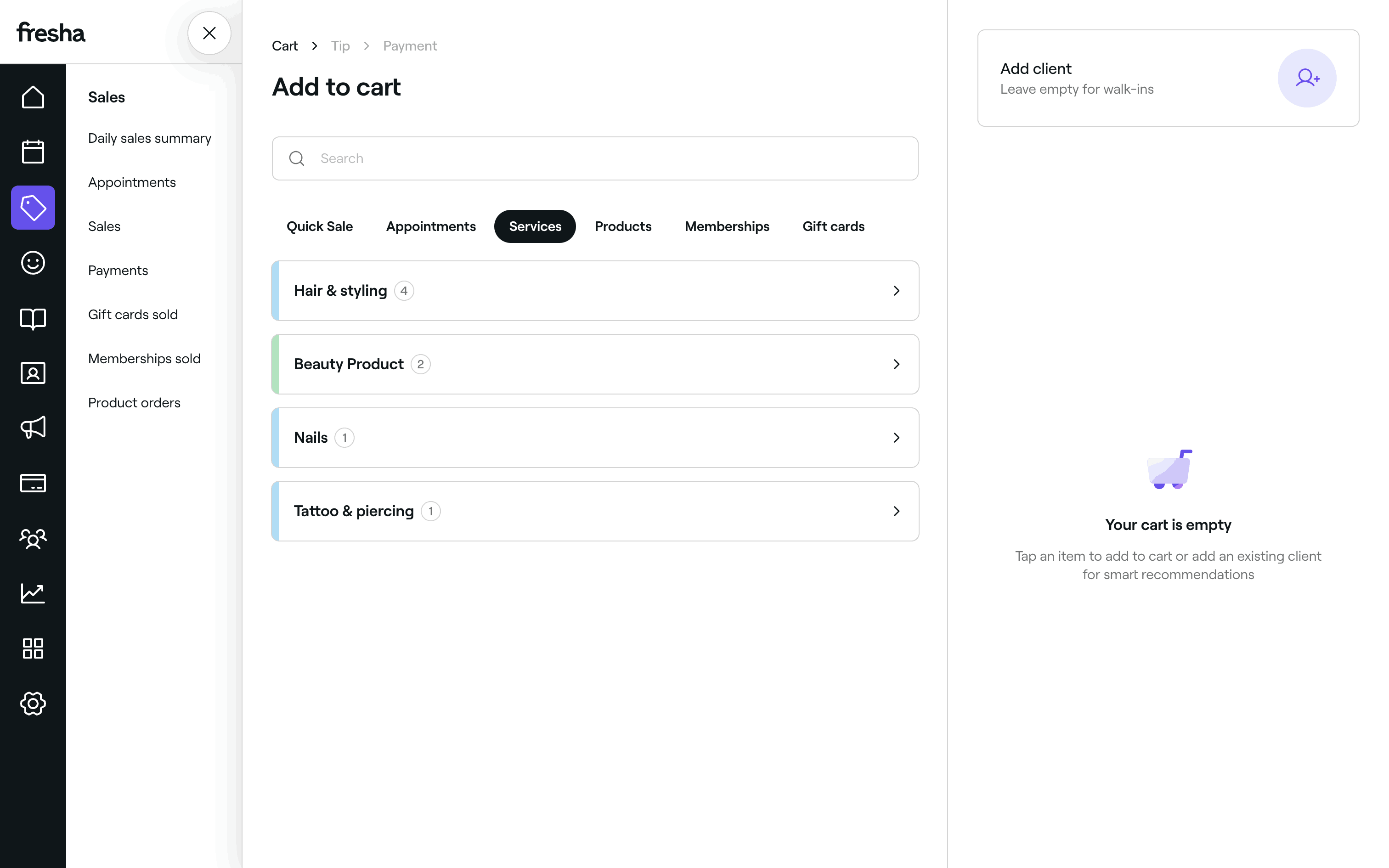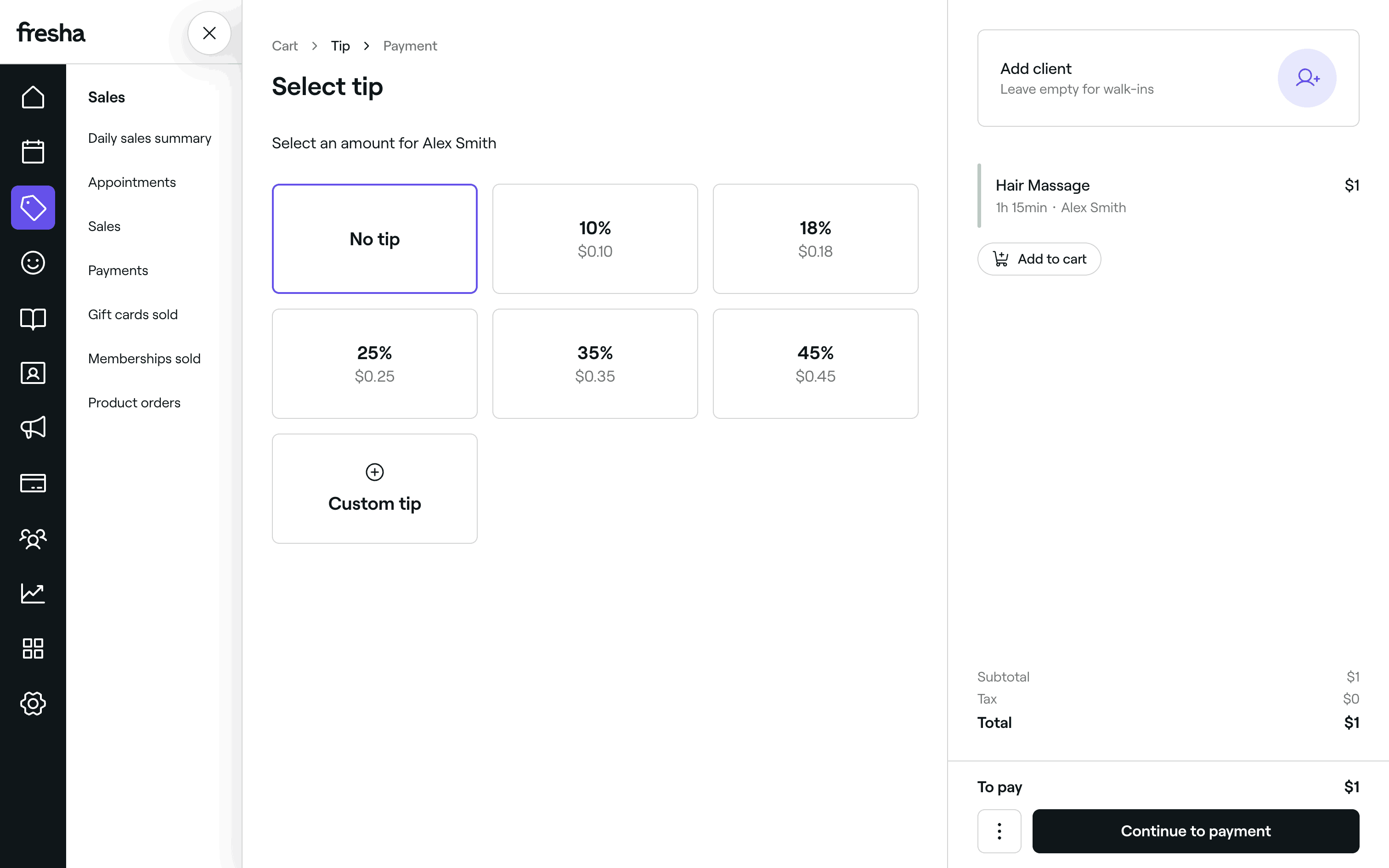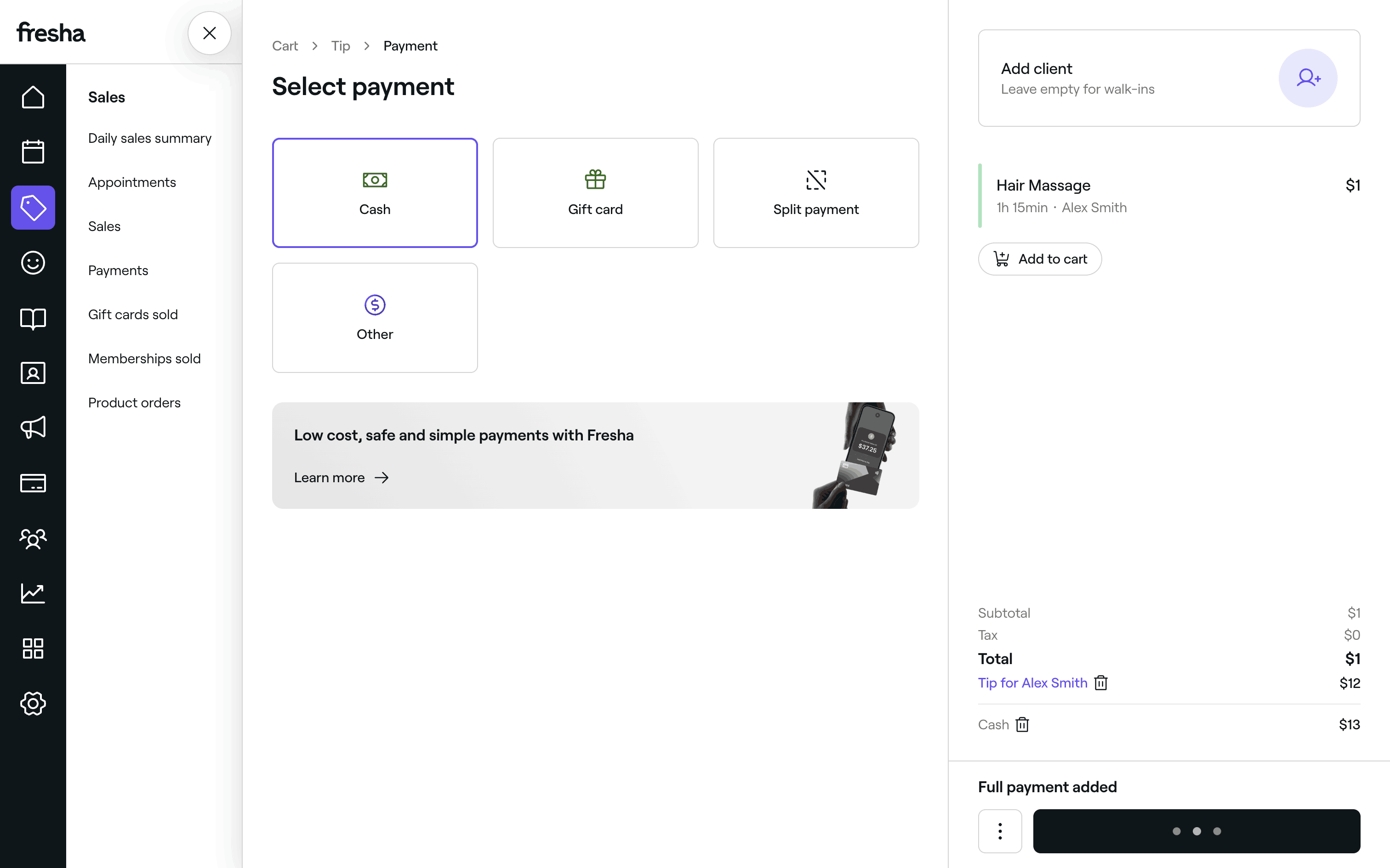The user flow demonstrates adding a sale by selecting a service, adding a tip, and selecting a payment method. The user then views the completed sale in the sales listing.