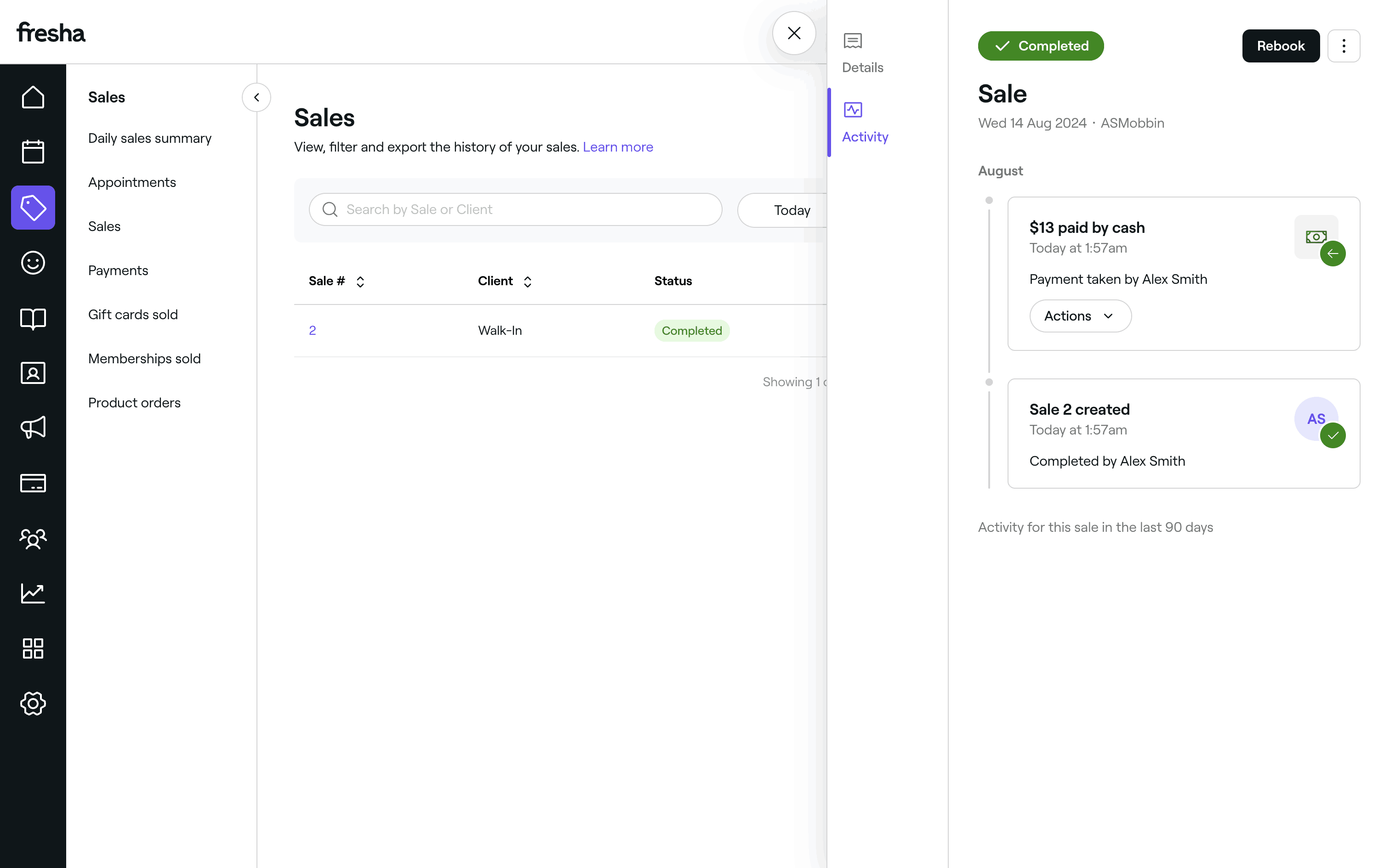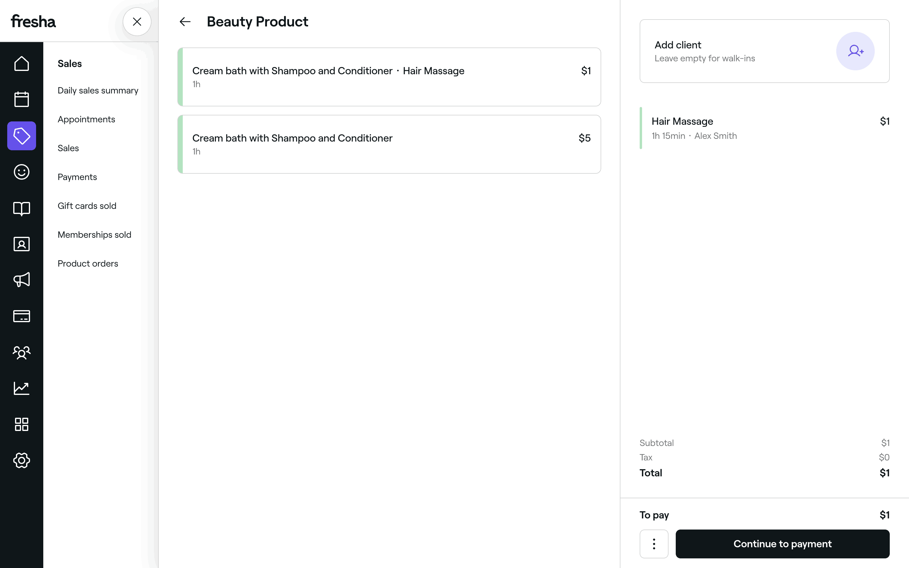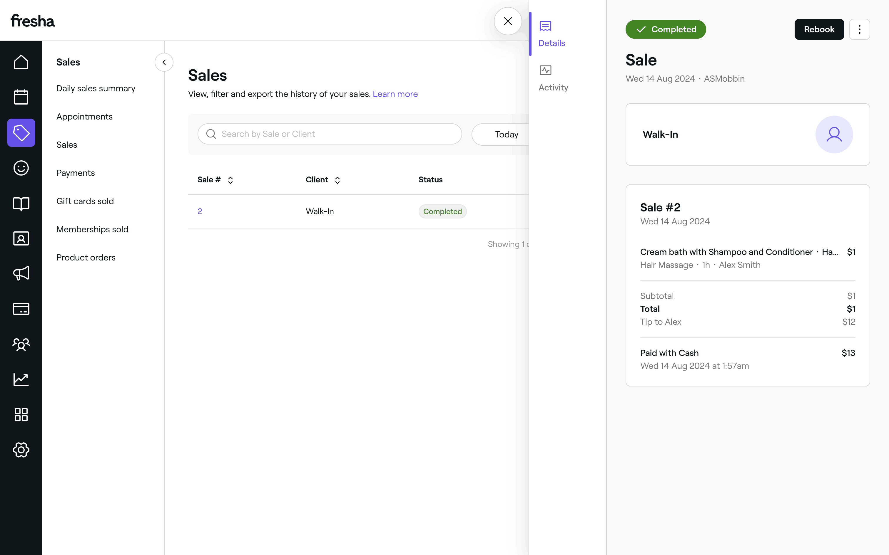 The user flow demonstrates adding a sale by selecting a service, adding a tip, and selecting a payment method. The user then views the completed sale in the sales listing.