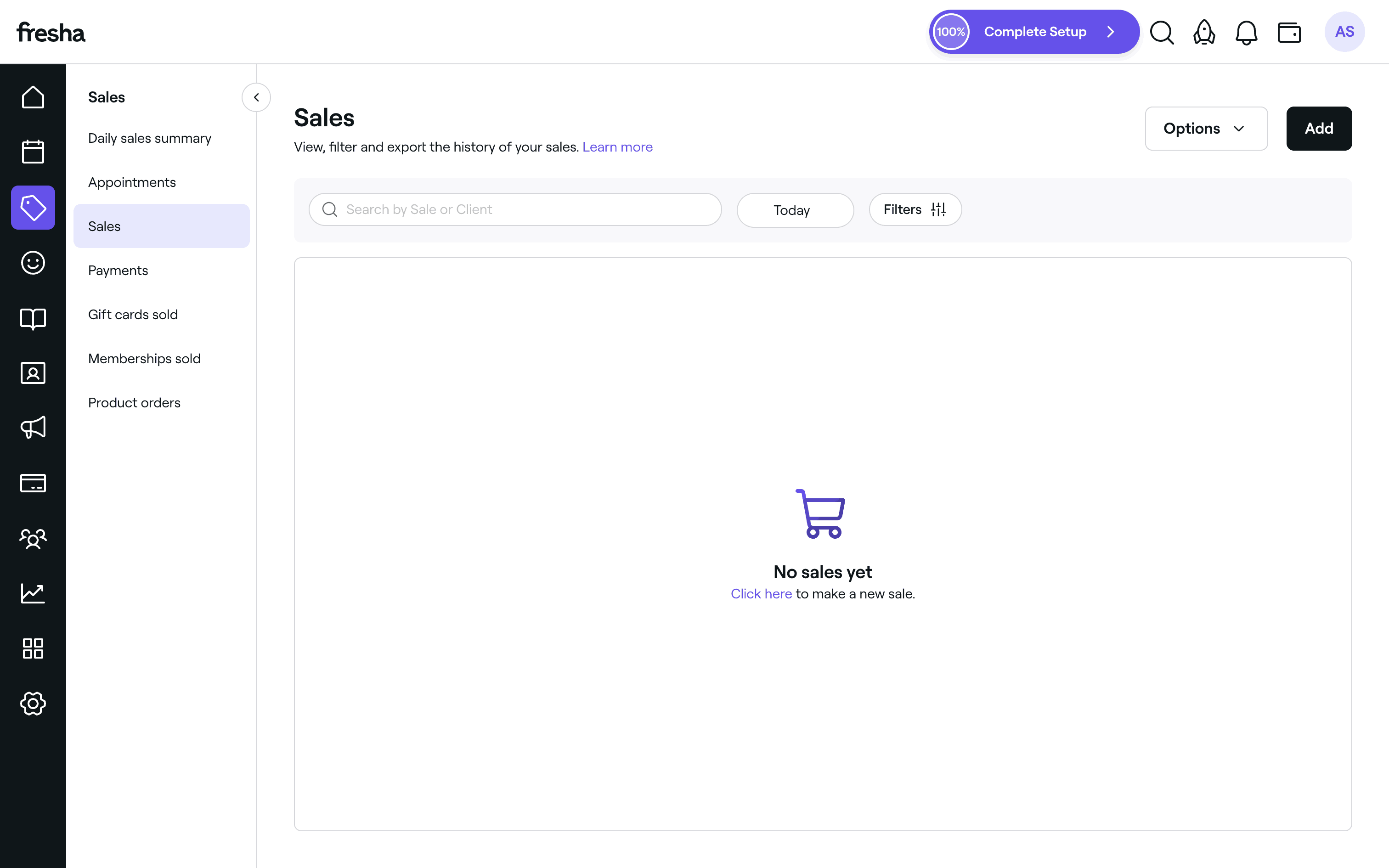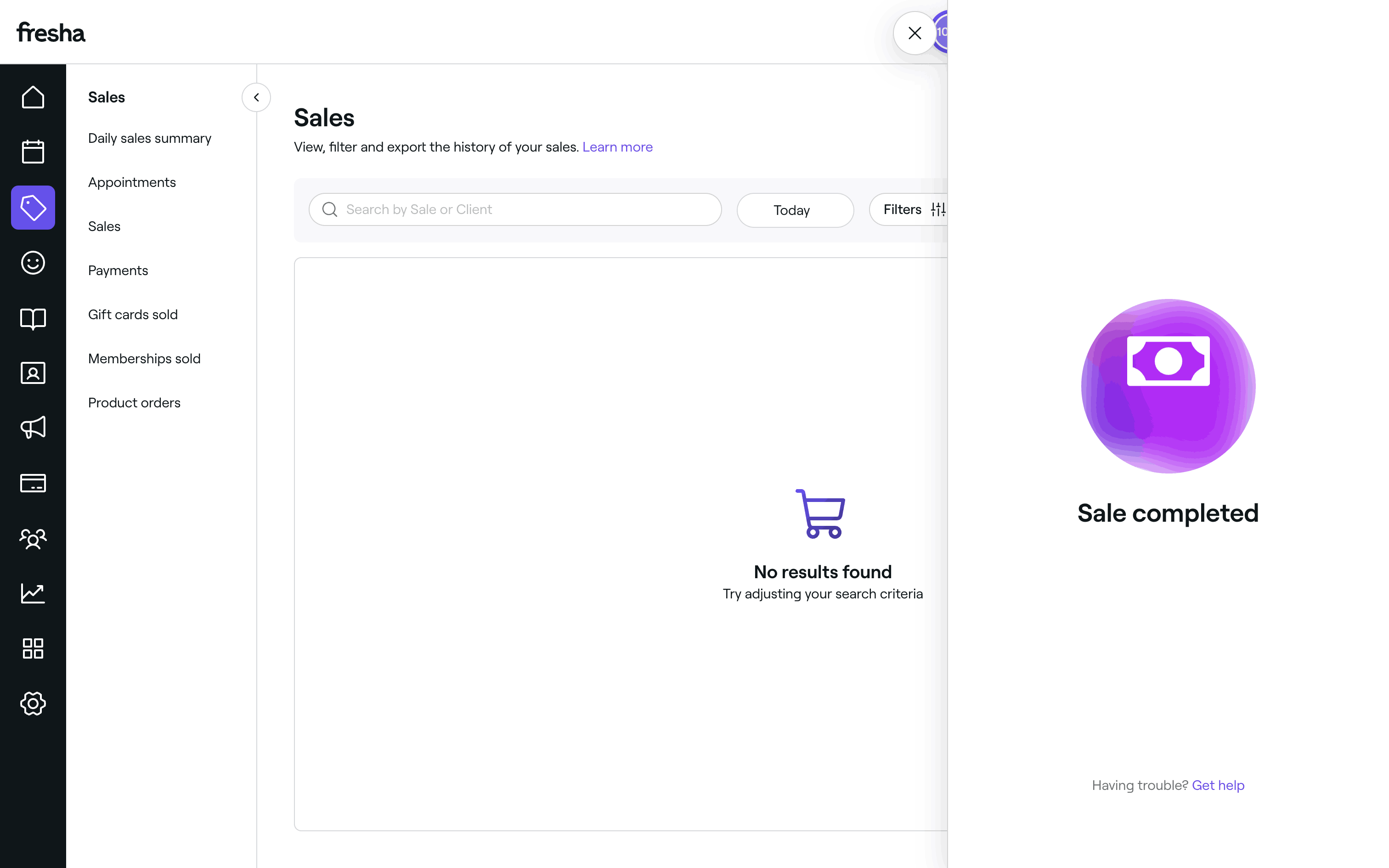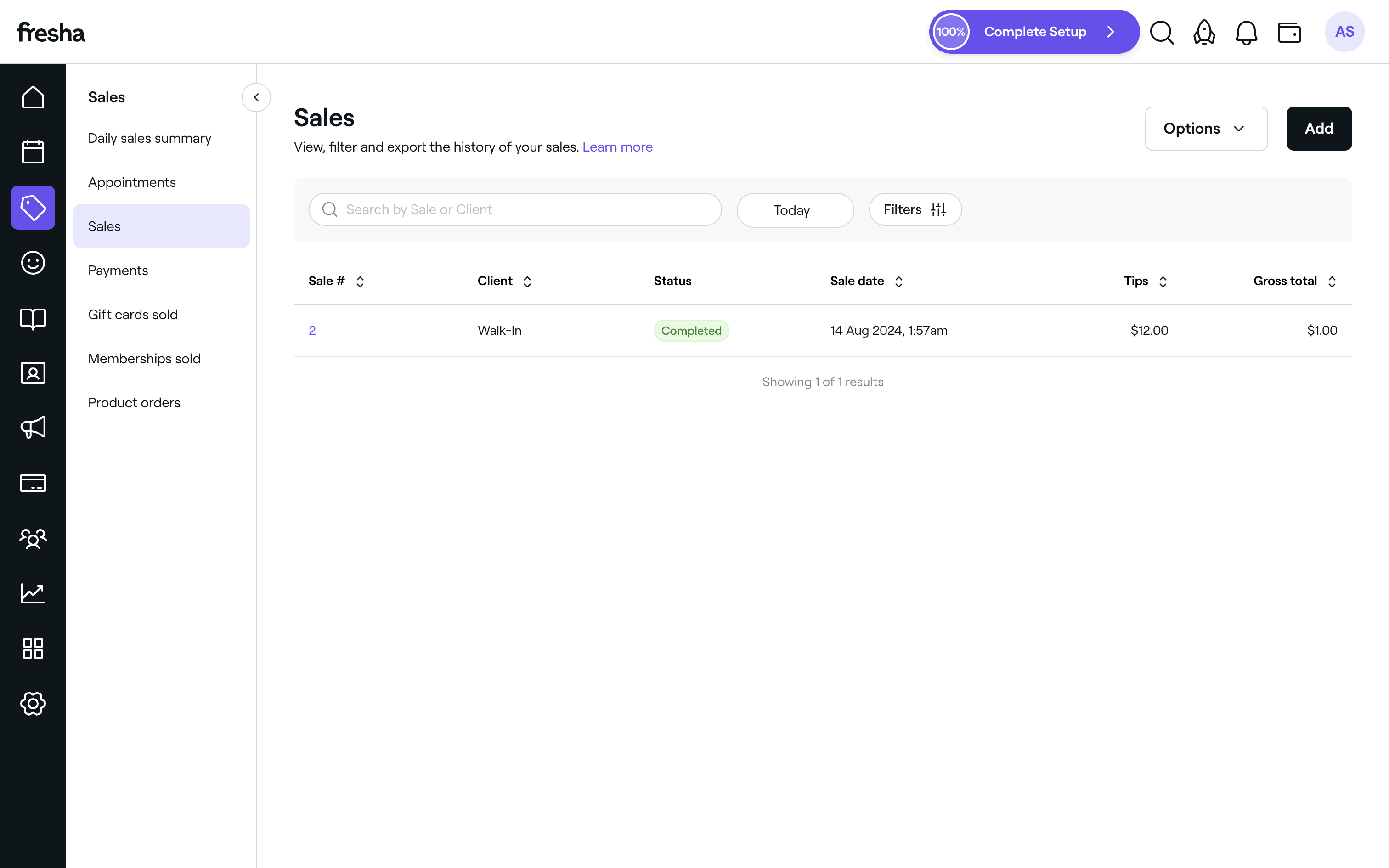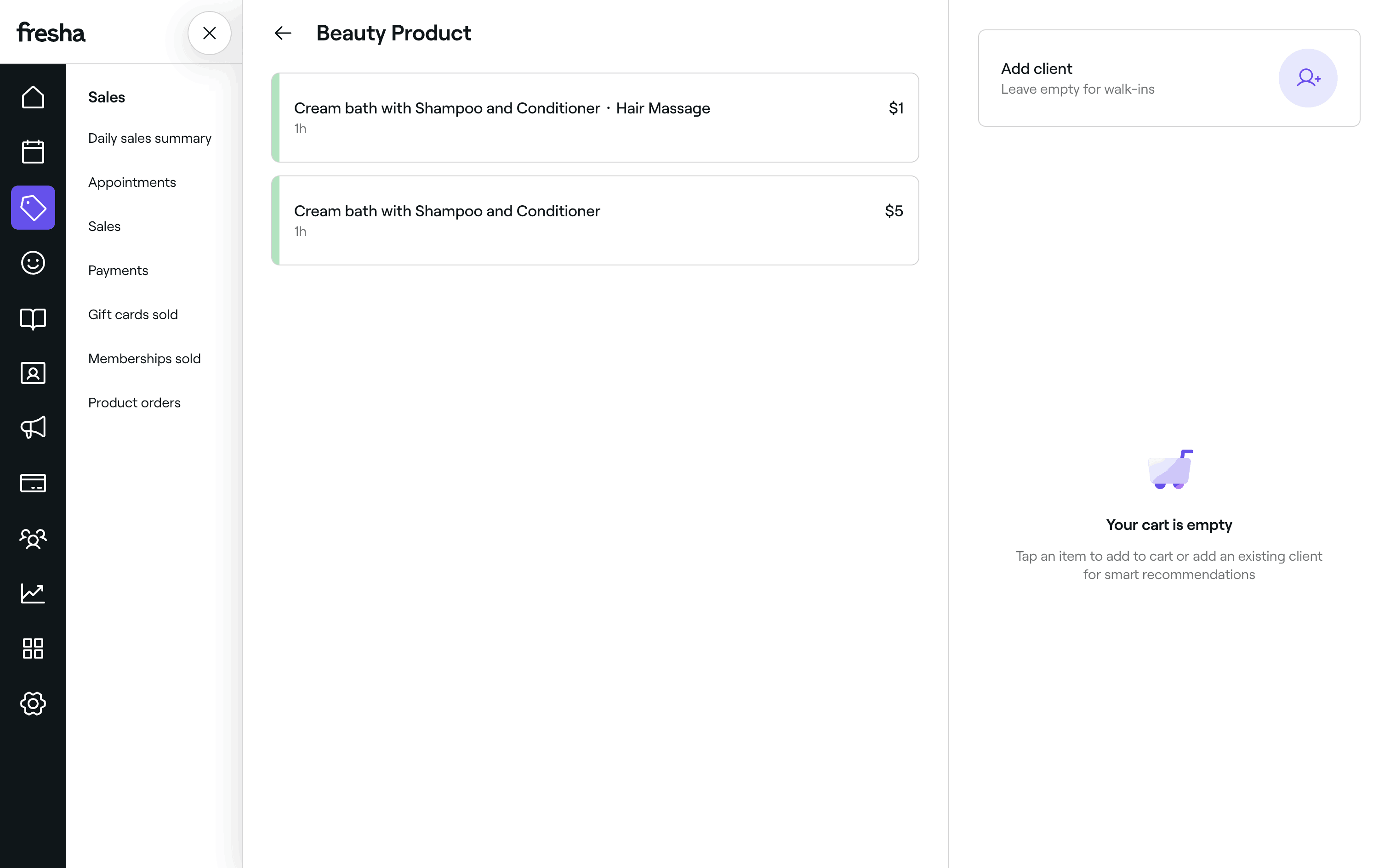 The user flow demonstrates adding a sale by selecting a service, adding a tip, and selecting a payment method. The user then views the completed sale in the sales listing.
