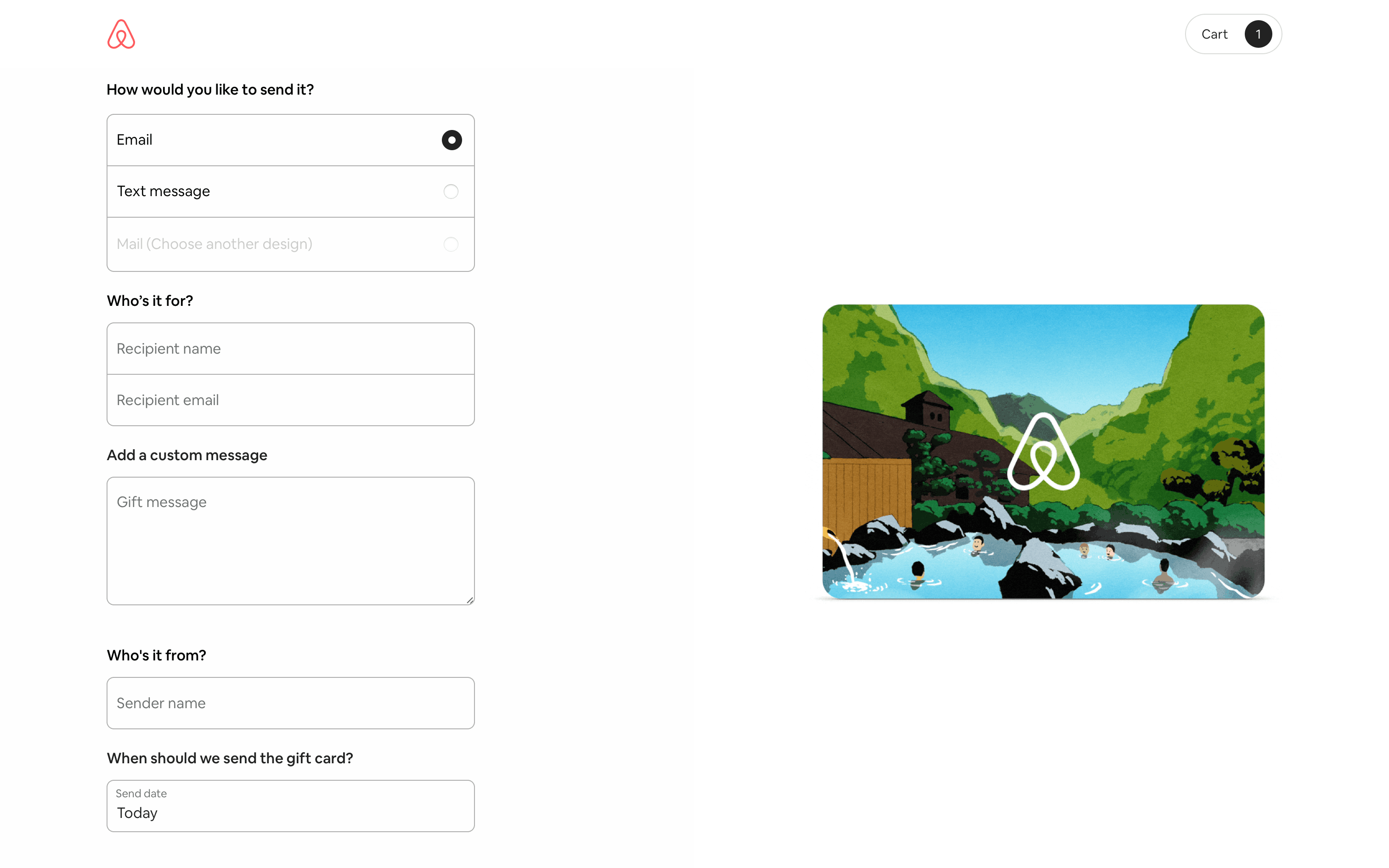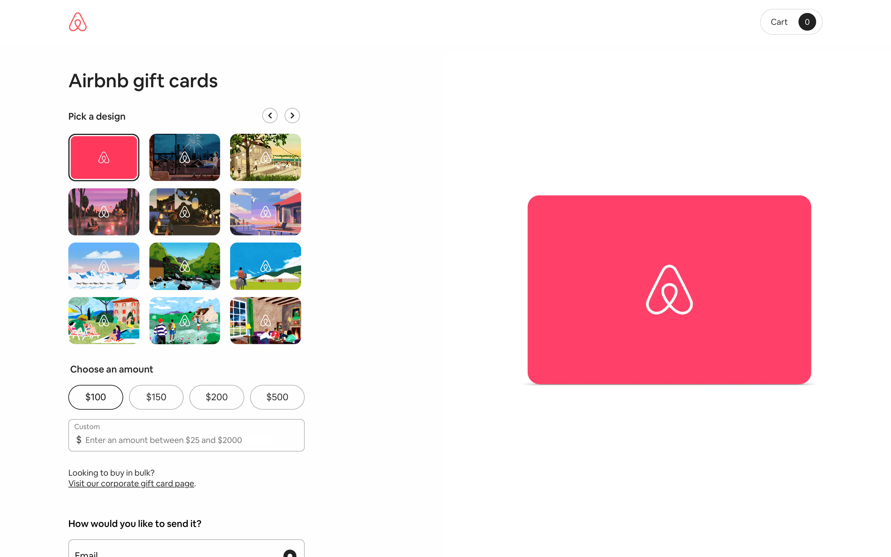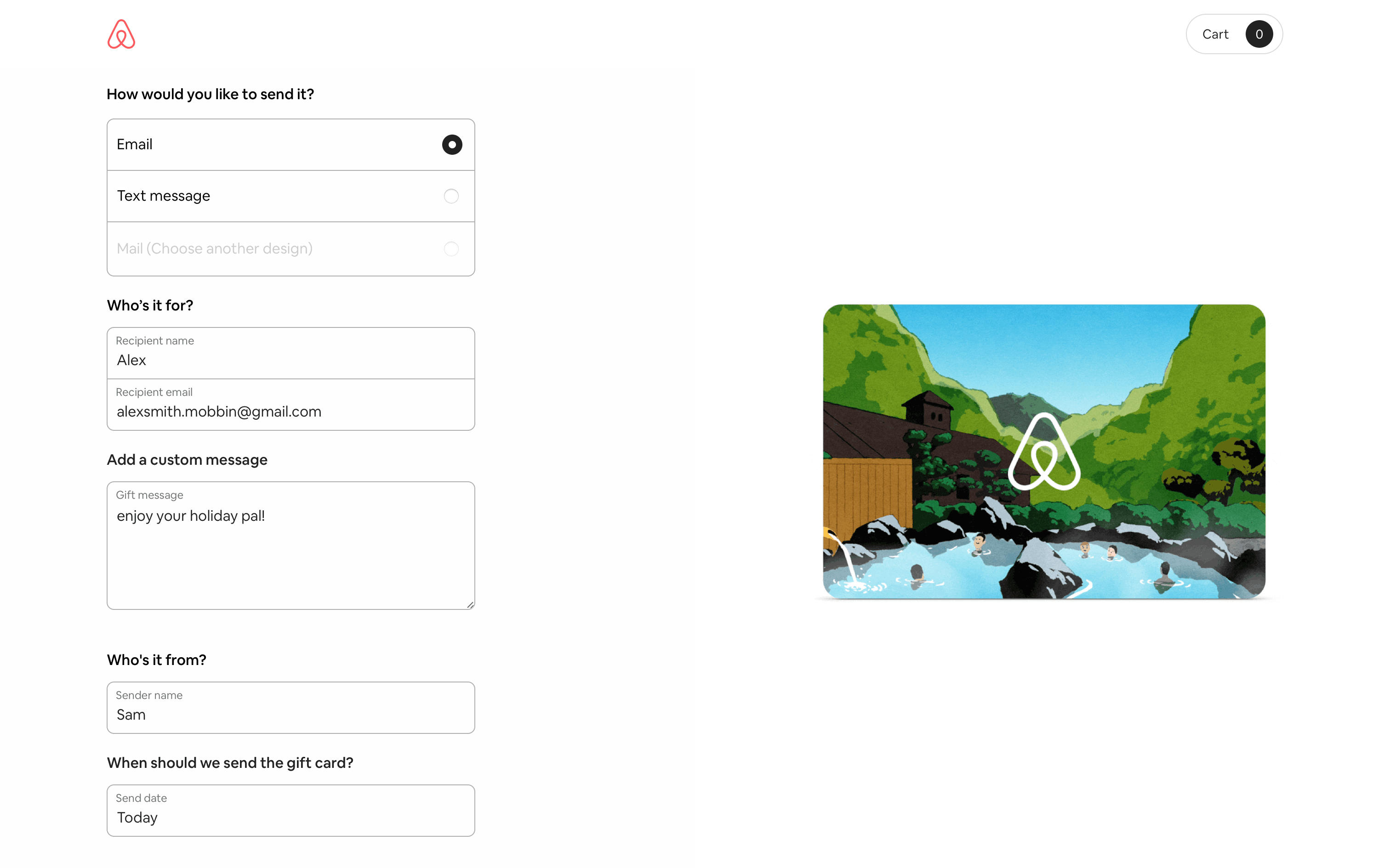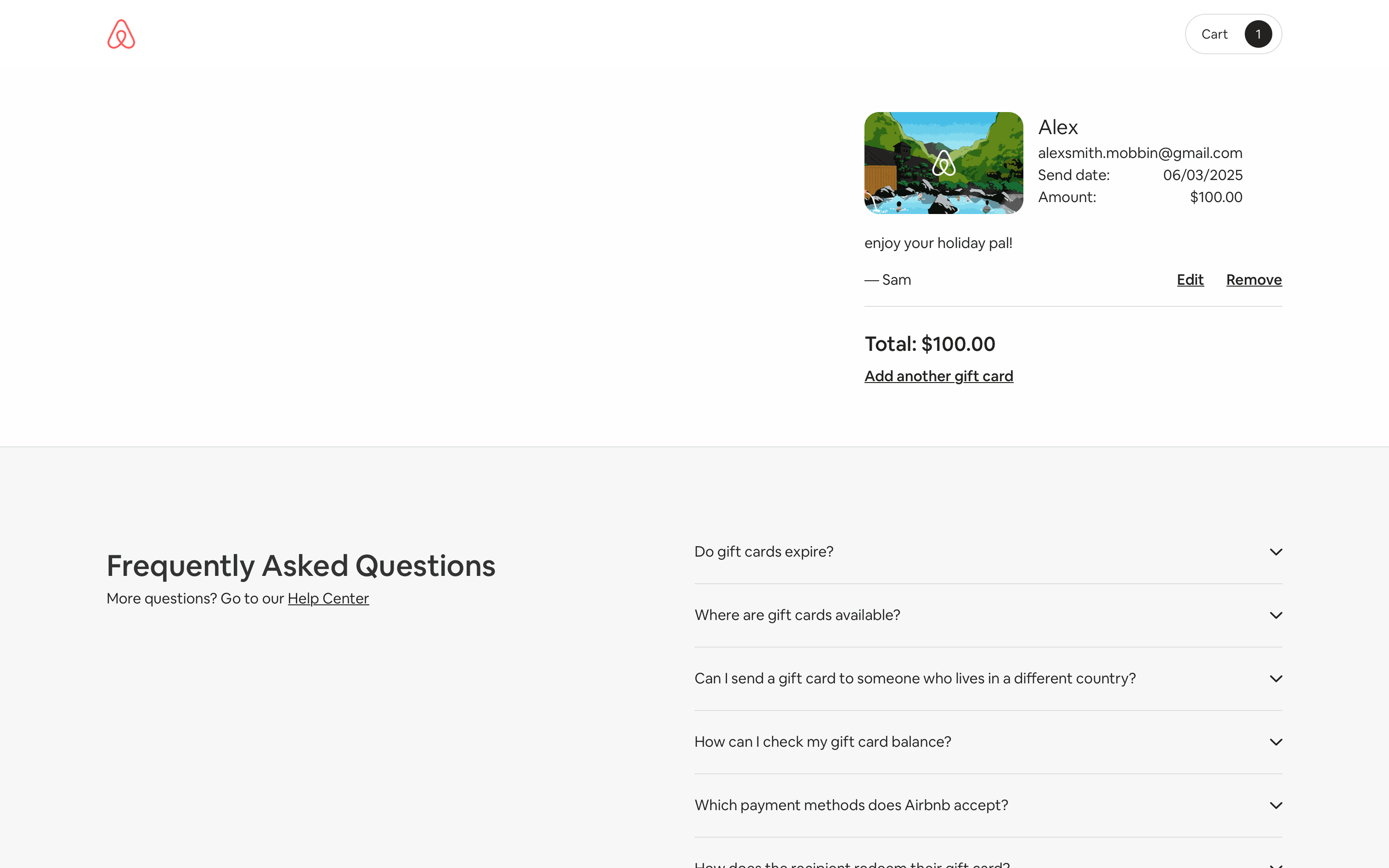 The user flow demonstrates adding an Airbnb gift card to the shopping cart. It involves customizing the design, amount, and recipient information before adding it to the cart.