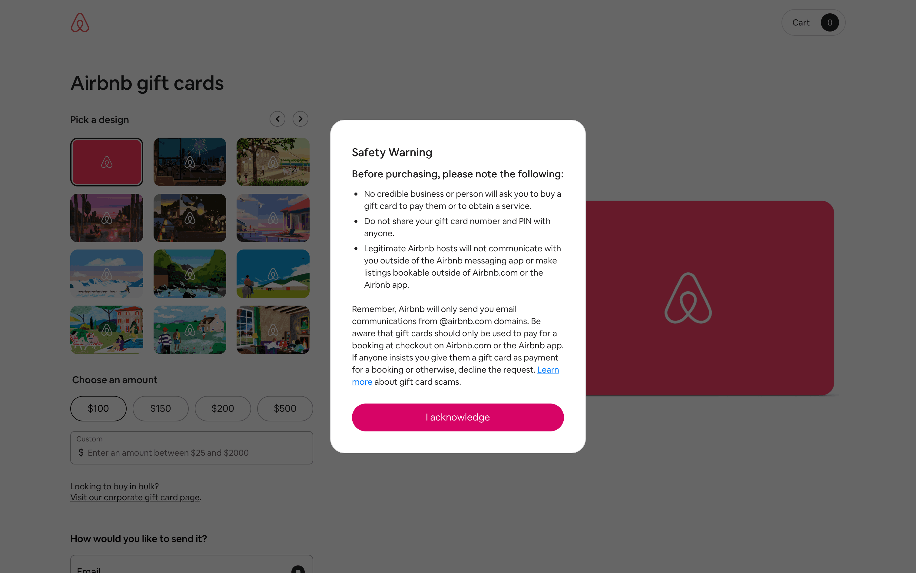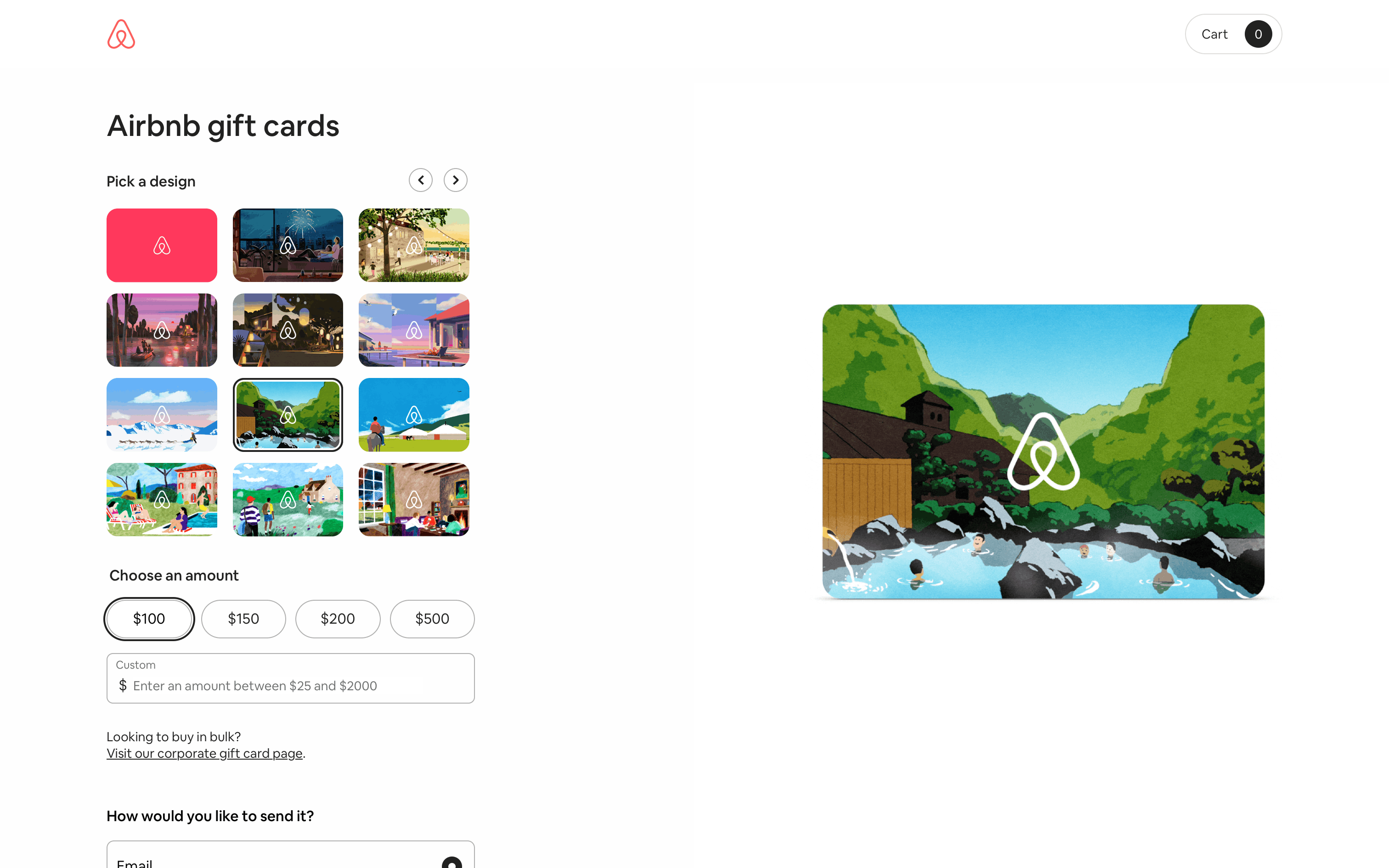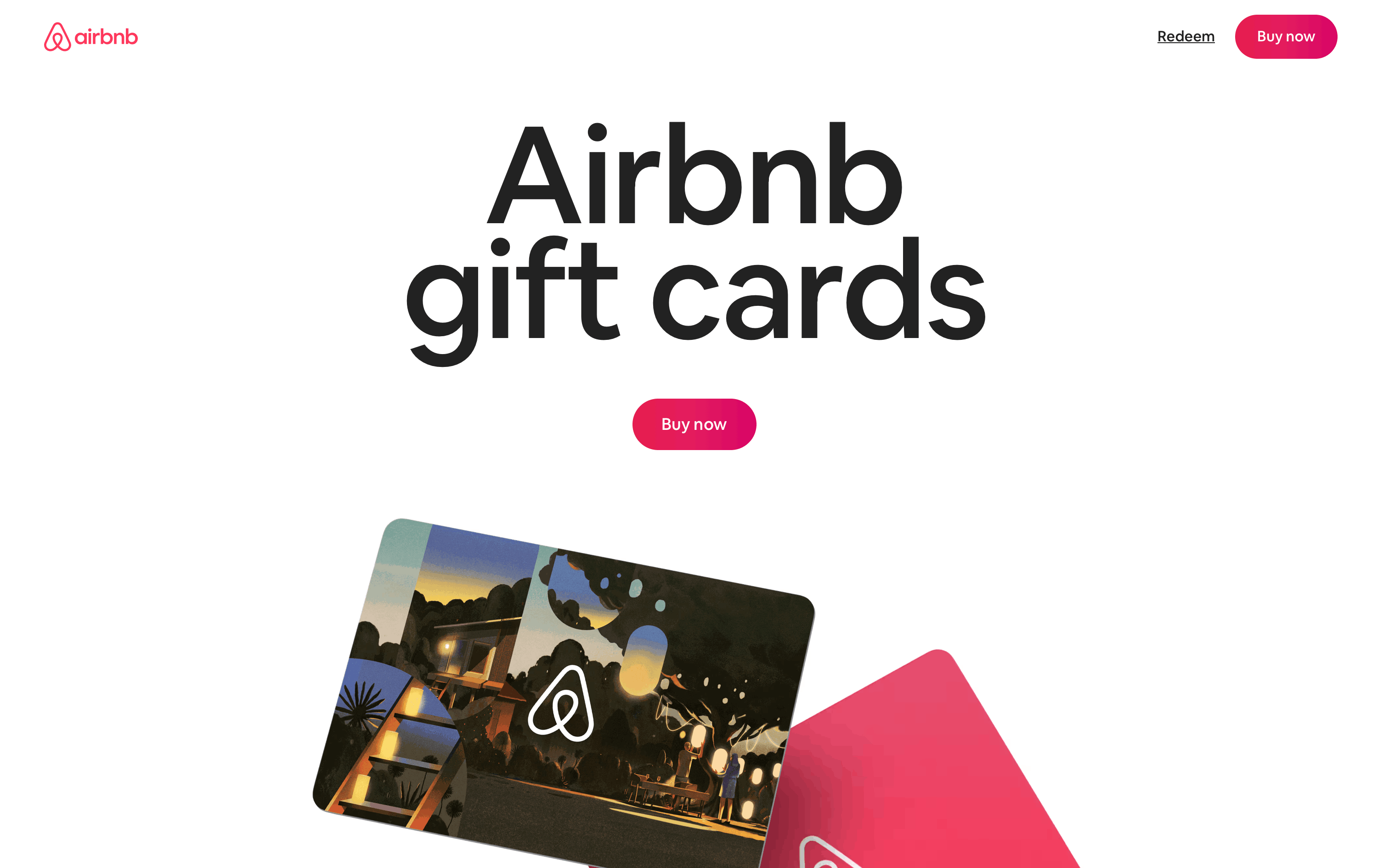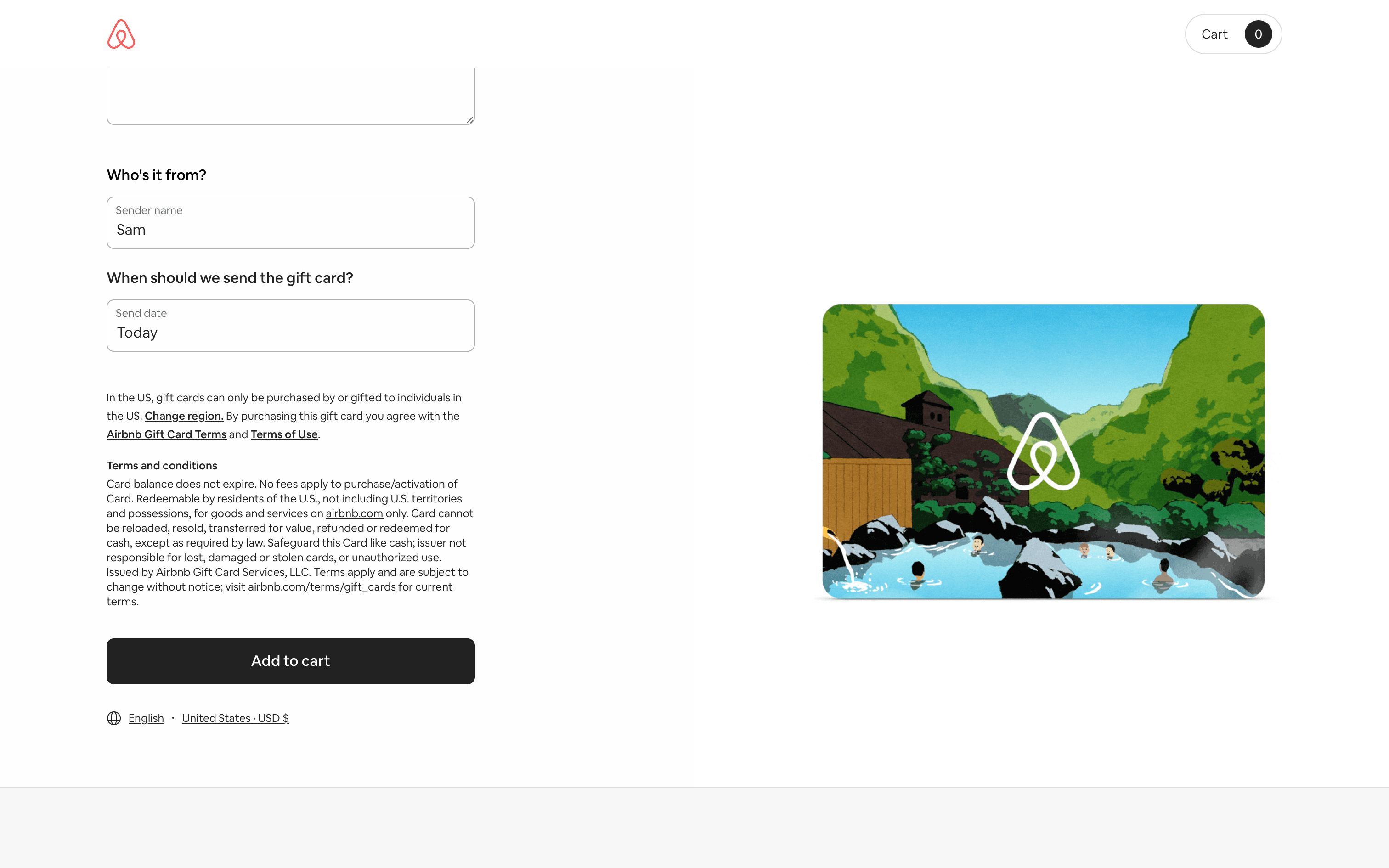 The user flow demonstrates adding an Airbnb gift card to the shopping cart. It involves customizing the design, amount, and recipient information before adding it to the cart.