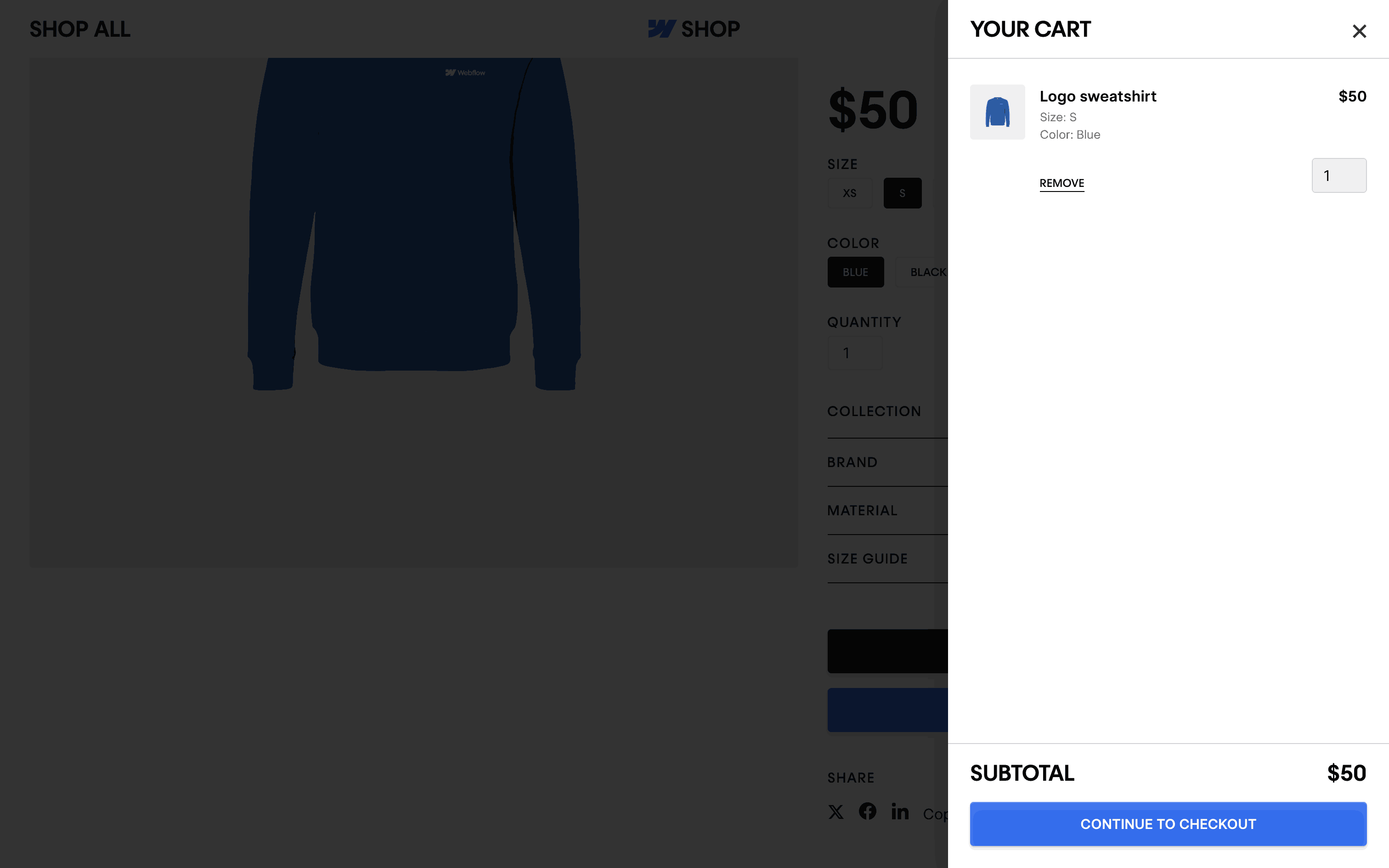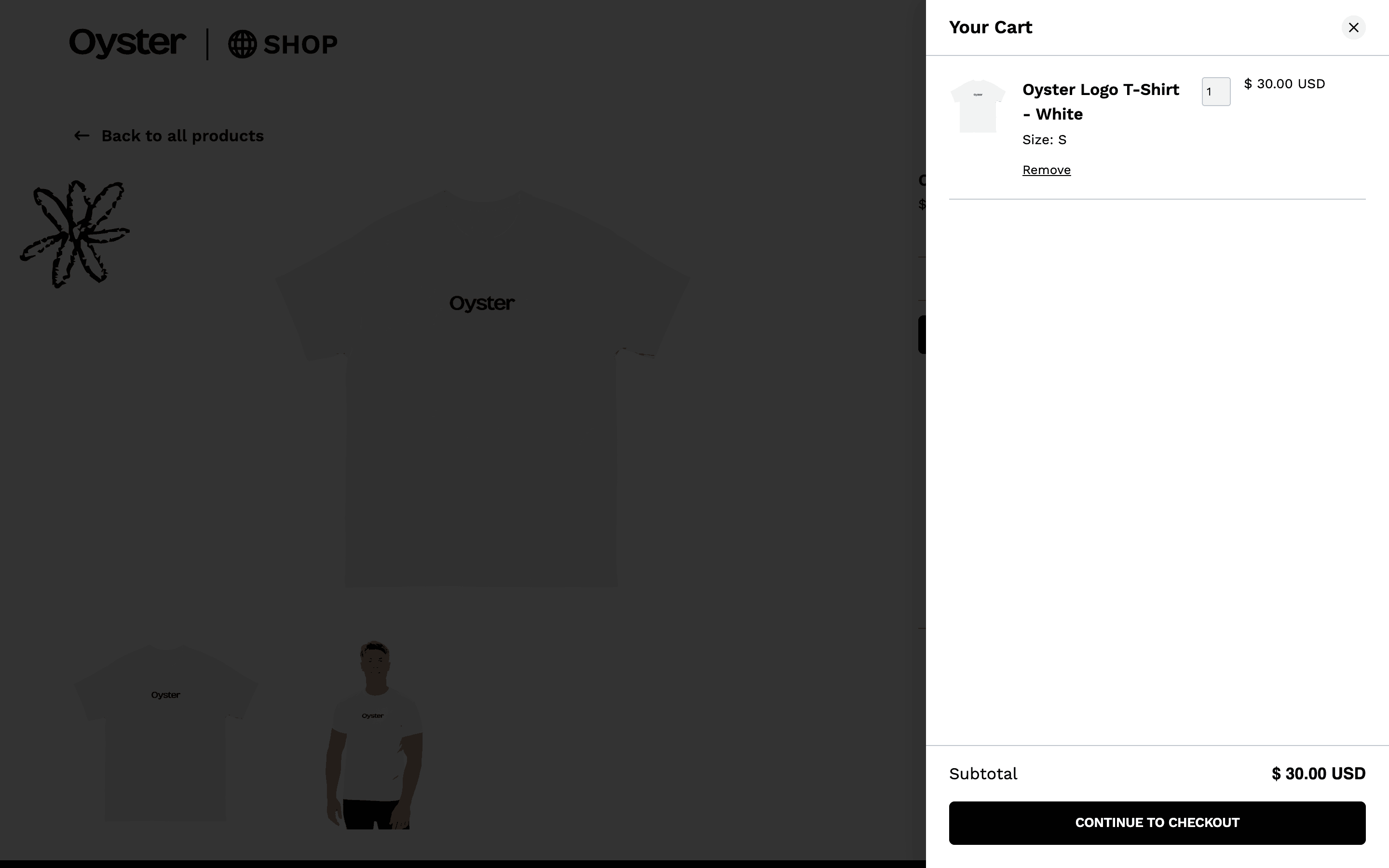 The user views a product and adds it to the cart. The cart modal then appears, allowing the user to proceed to checkout.