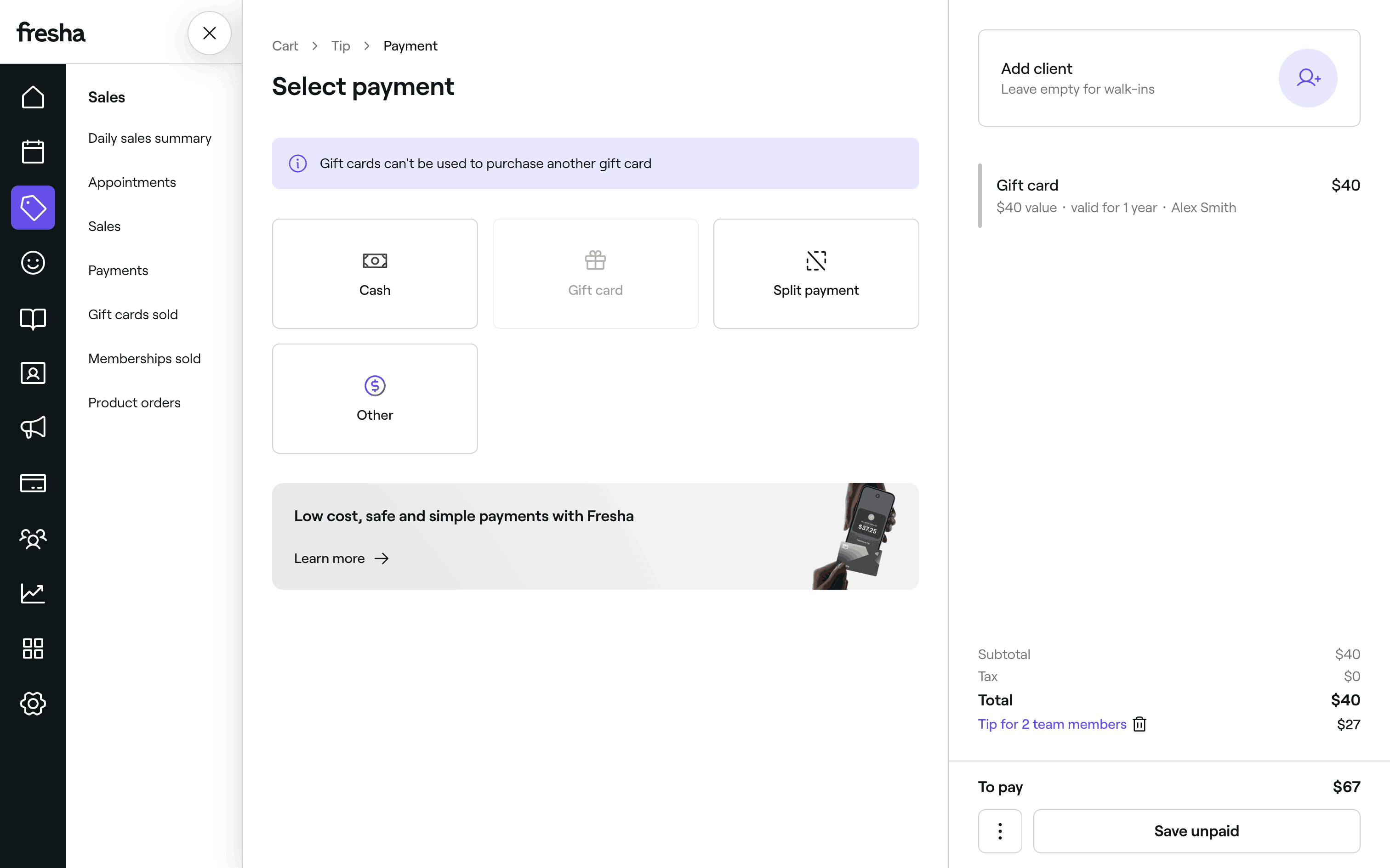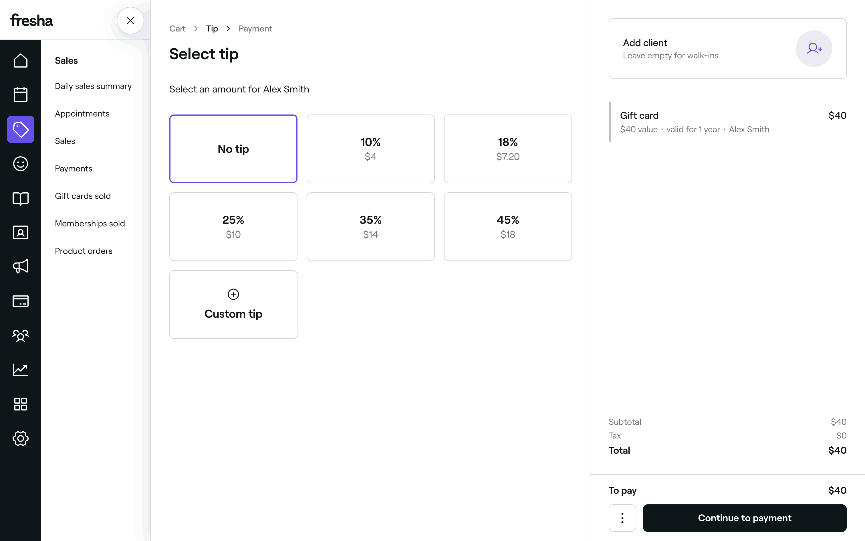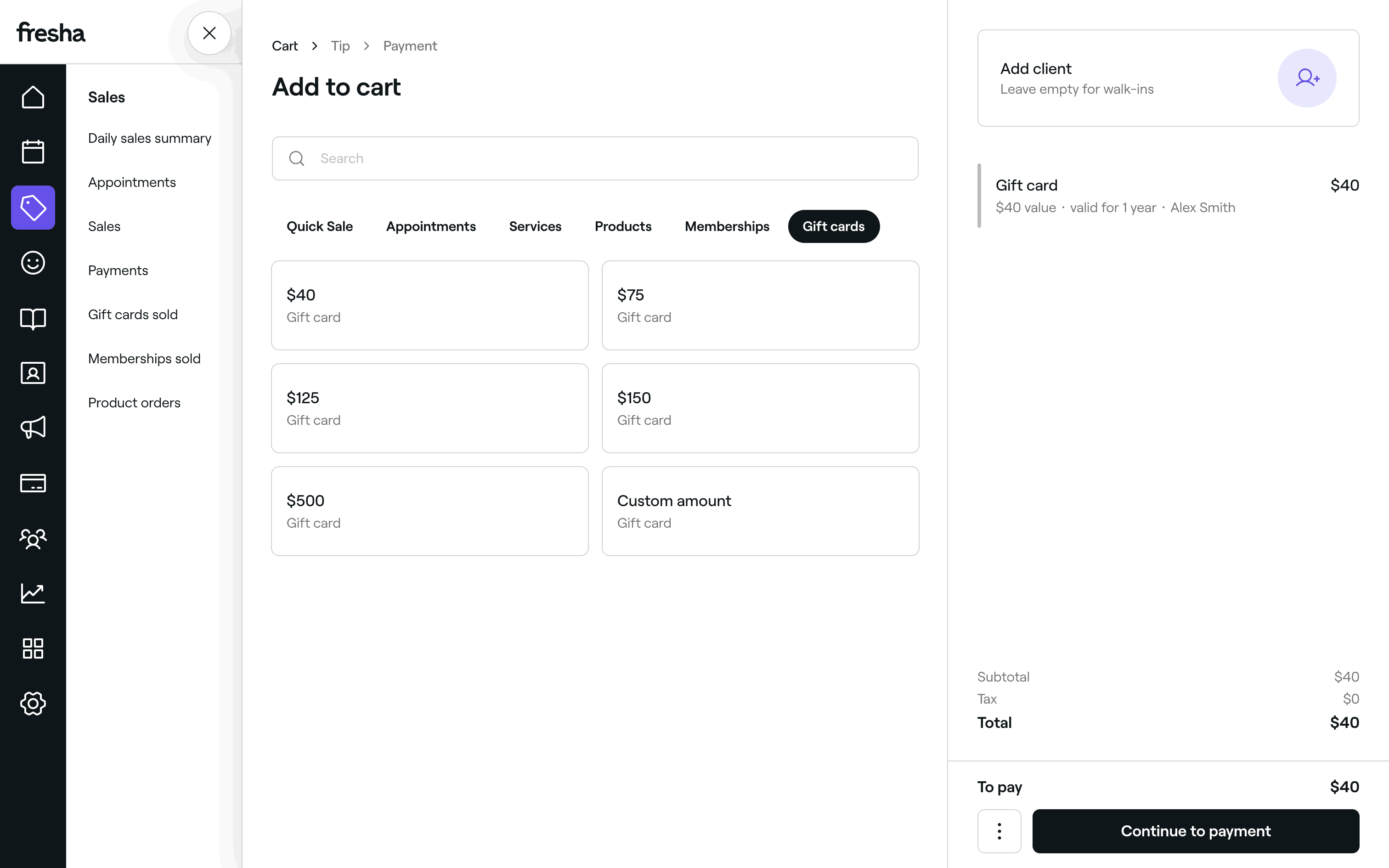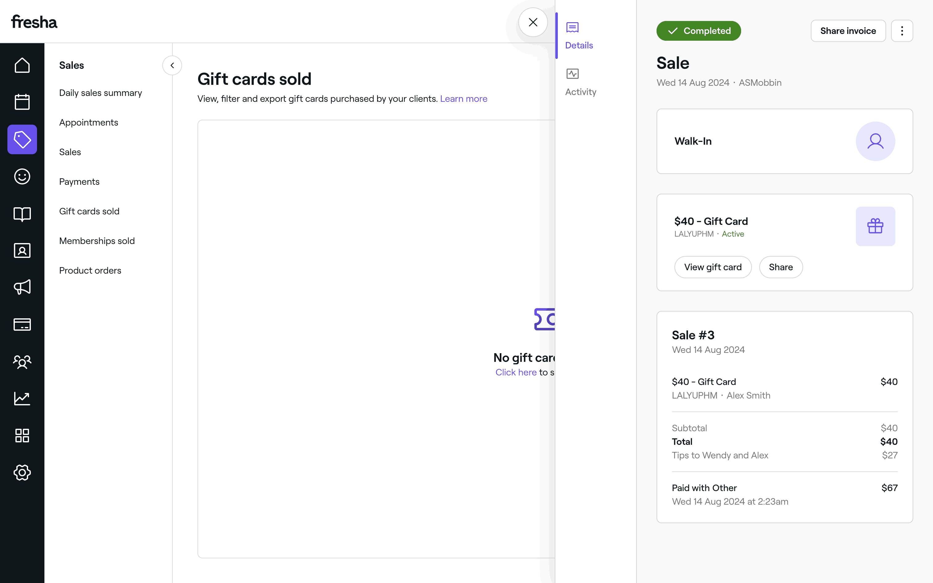 The user flow demonstrates selling a gift card, including adding it to the cart, selecting a tip, choosing a payment method, and viewing the sale details.