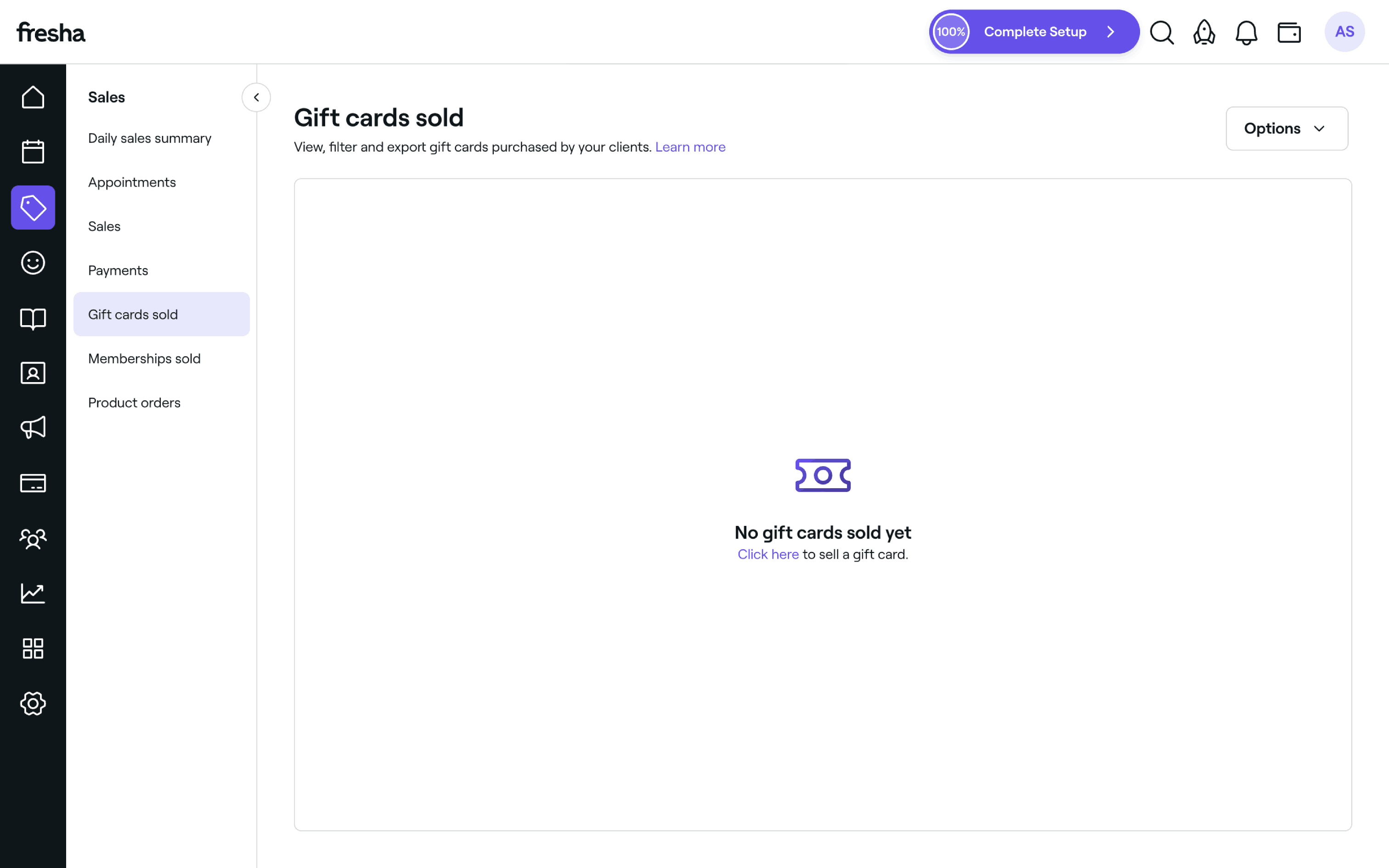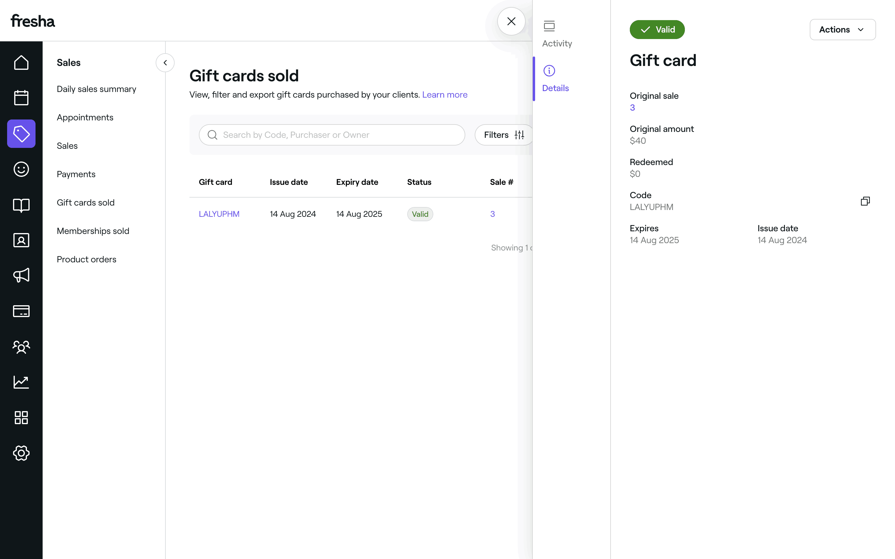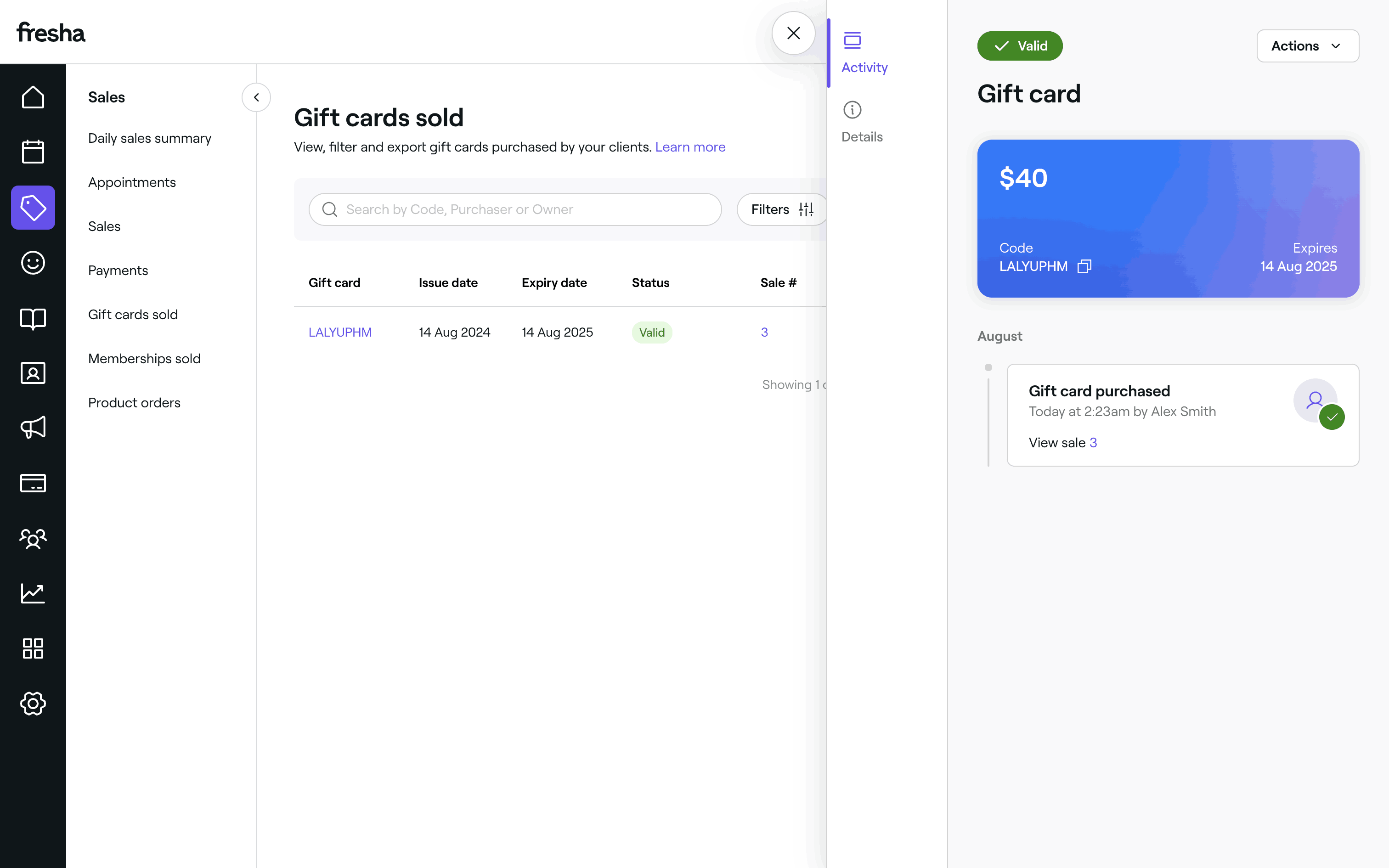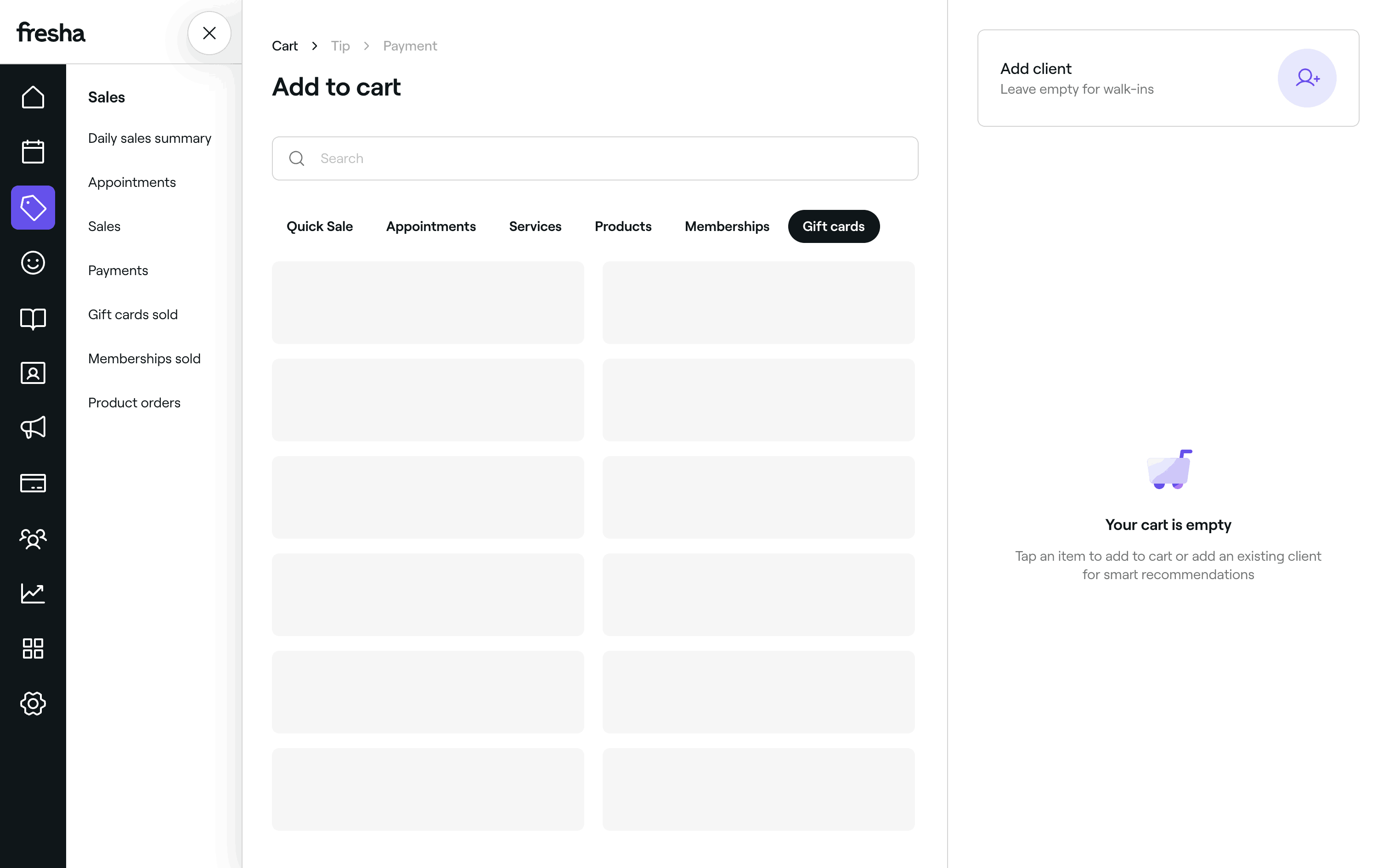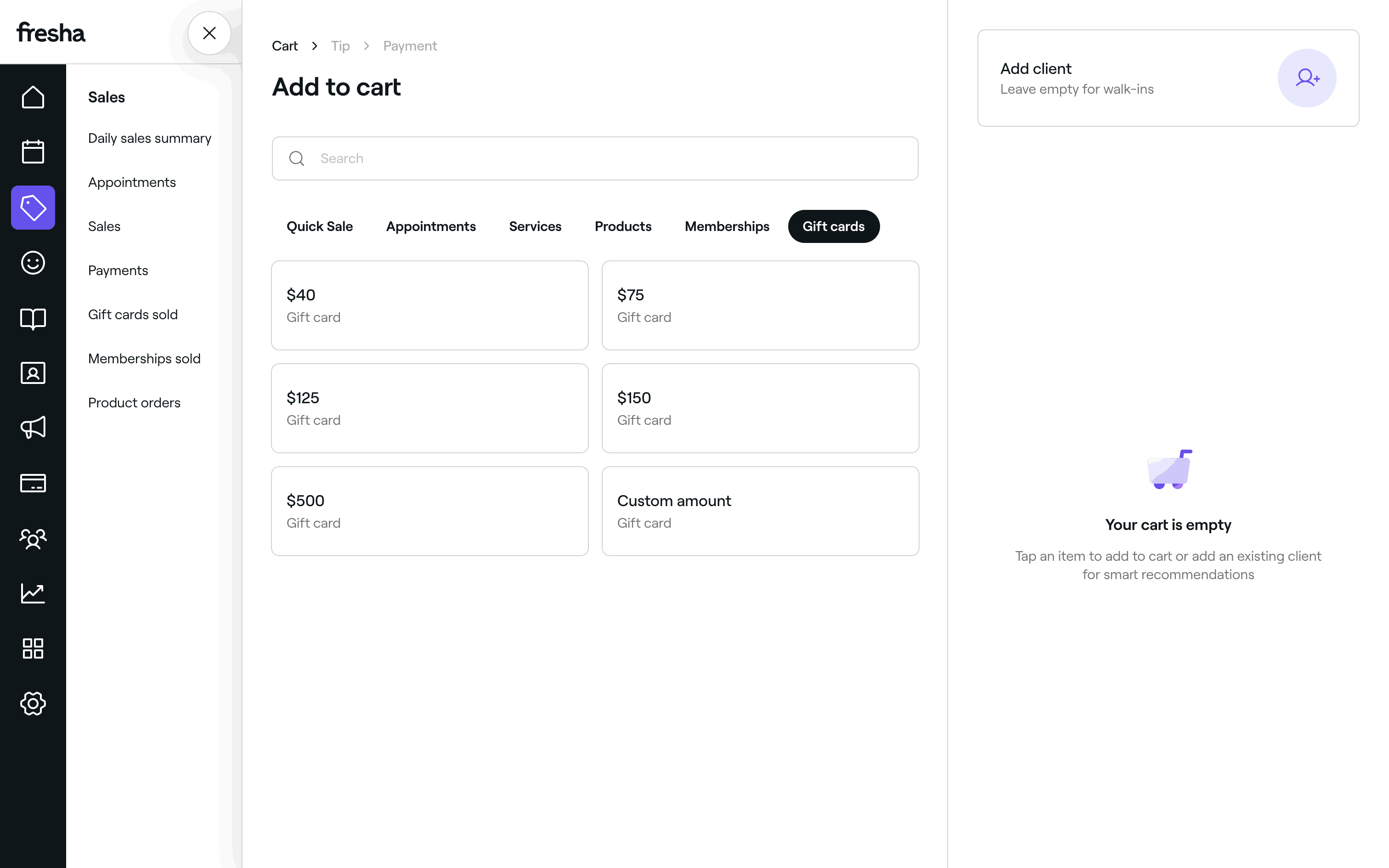 The user flow demonstrates selling a gift card, including adding it to the cart, selecting a tip, choosing a payment method, and viewing the sale details.