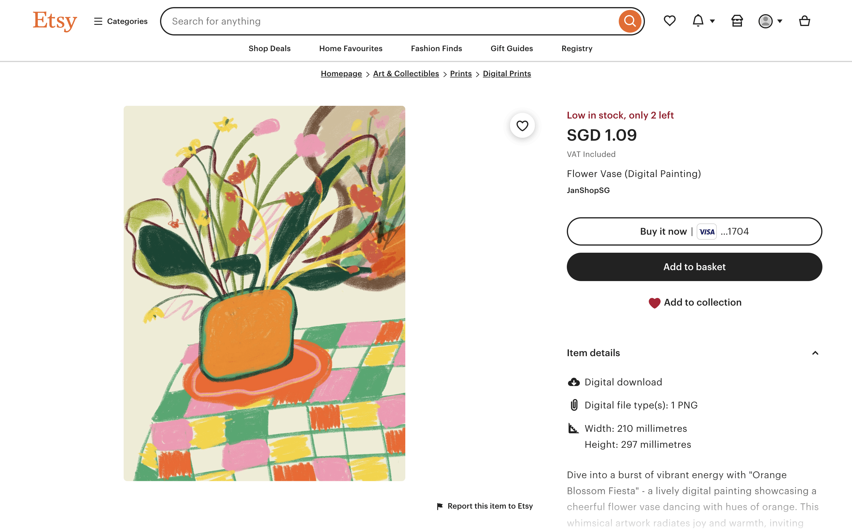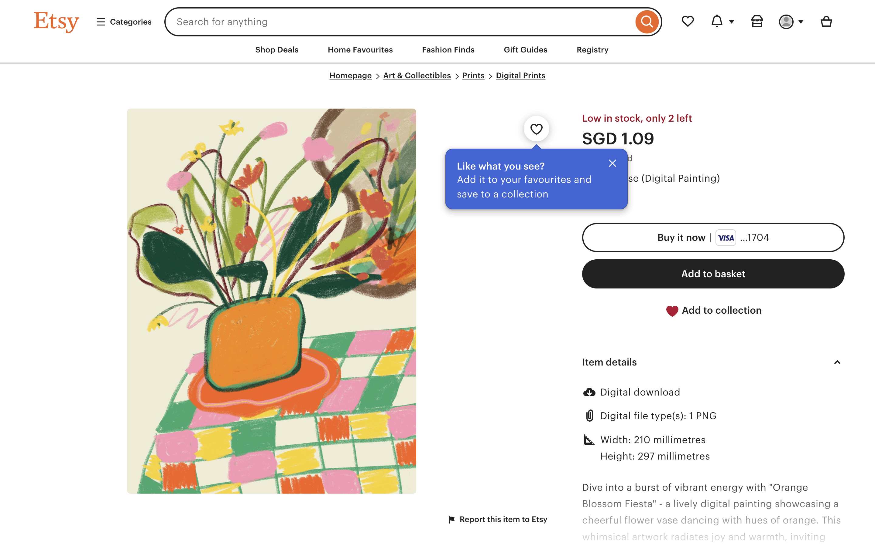 The user browses a shop, selects a digital painting, adds it to the basket, and proceeds to view the shopping basket. The flow showcases adding an item to the basket.
